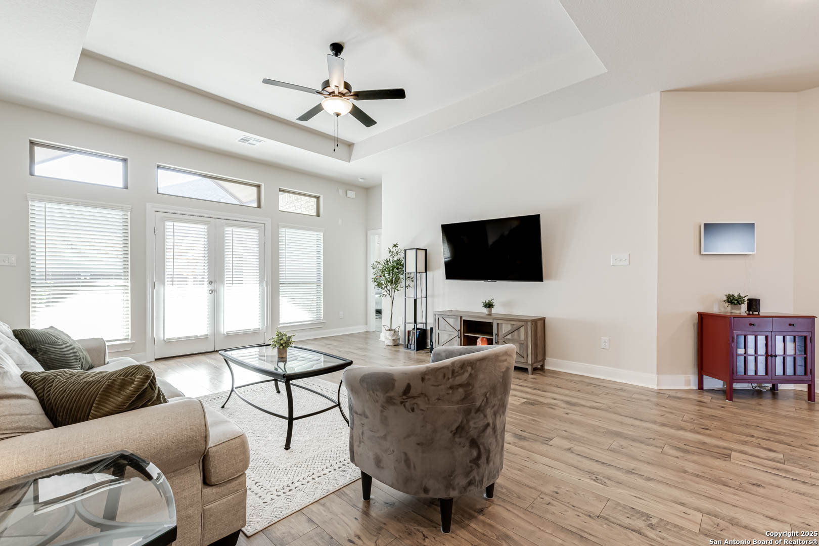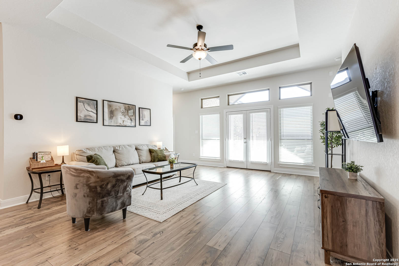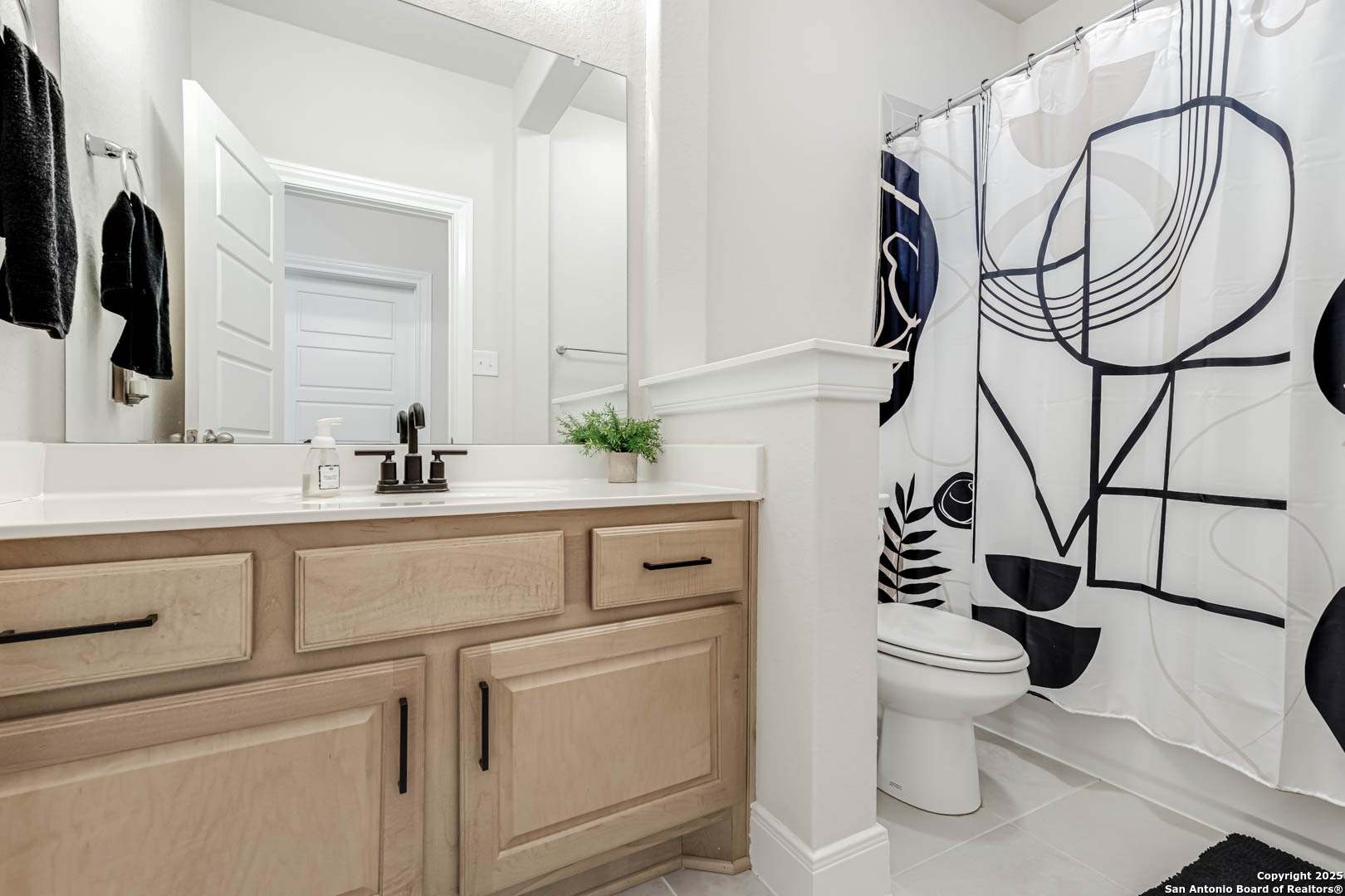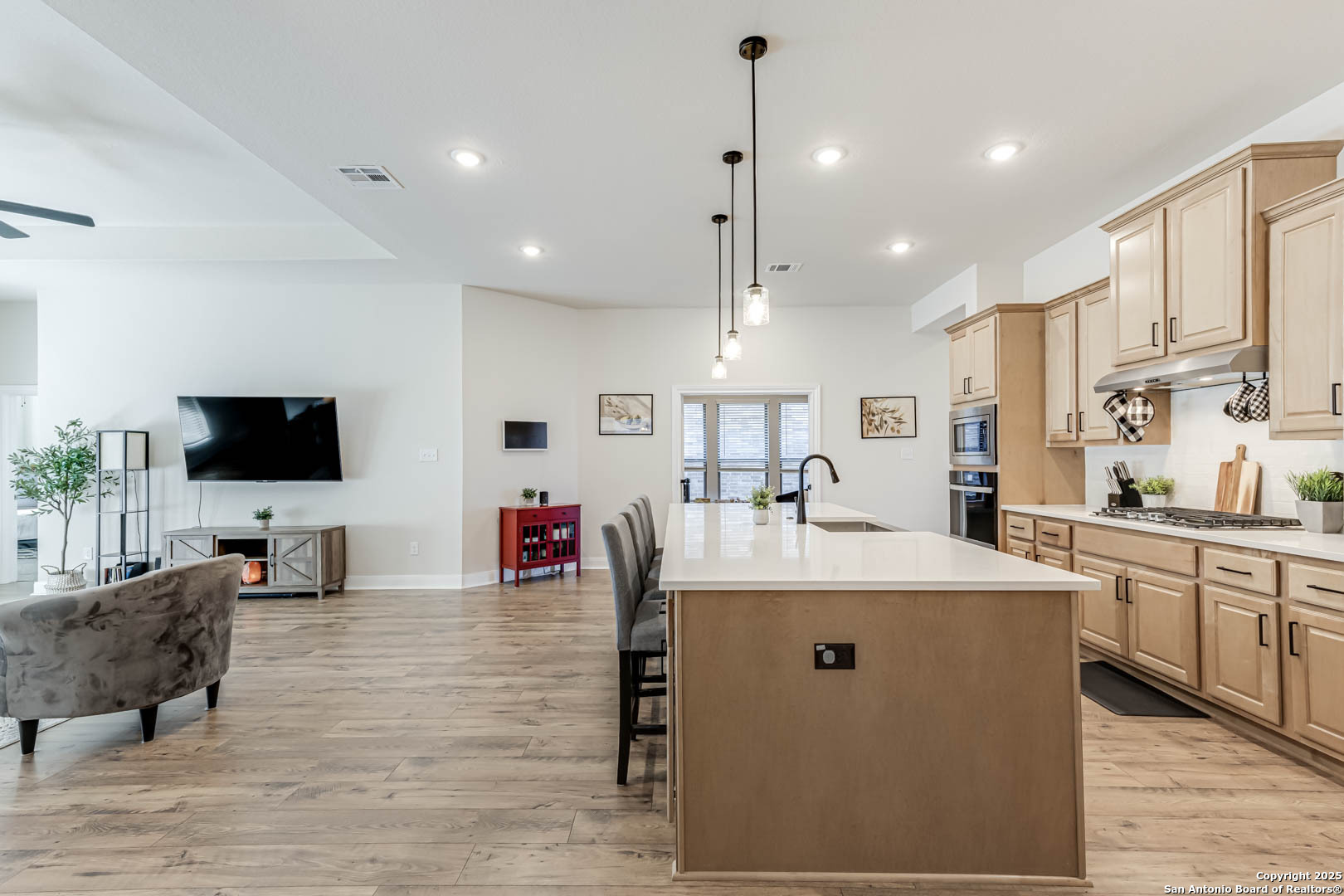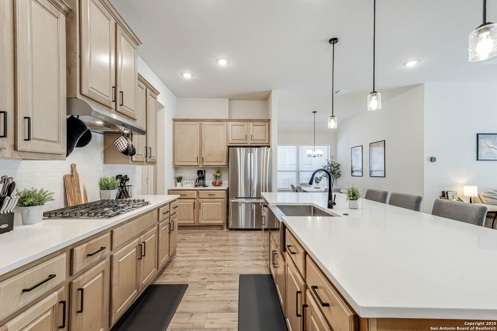This is the Stone Oak area gem you've been waiting for! A truly one-of-a-kind home in Coronado, this 4-bedroom, 3-bathroom residence was newly built in 2023. Designed with a modern, open-concept layout and thoughtfully chosen finishes, this home stands apart with its blend of contemporary style and warm, modern farmhouse character. The elevated front porch is spacious and perfect for morning coffee or evening sunsets with its peaceful horizon views. Inside, rustic chestnut-toned laminate floors flow through the kitchen and main living area, complementing the wheat-color cabinetry and white quartz countertops. The kitchen also features a stainless steel undermount apron sink and stainless steel appliances. The spacious primary suite offers bay windows perfect for use as a reading nook or decorative space, an extra-large walk-in shower lined with classic subway tile, and a spacious walk-in closet. For those seeking a little extra space, you'll find it here with an additional office and rec room that can be utilized as a second workspace, playroom, home library, or creative studio. Out back, enjoy a Texas-sized outdoor living space with an expansive covered patio and a charming pergola area, perfect for entertaining or cozy family evenings. Additional highlights include a large, three-car garage with abundant storage and zoning within the highly rated NEISD school district. Tucked right off 281, accessed through a tree-lined road that quiets the city noise, and minutes from Sam's, HEB Plus, and Stone Oak Village, the Coronado community offers both serenity and convenience. Come discover this home that combines modern living and peaceful comfort.