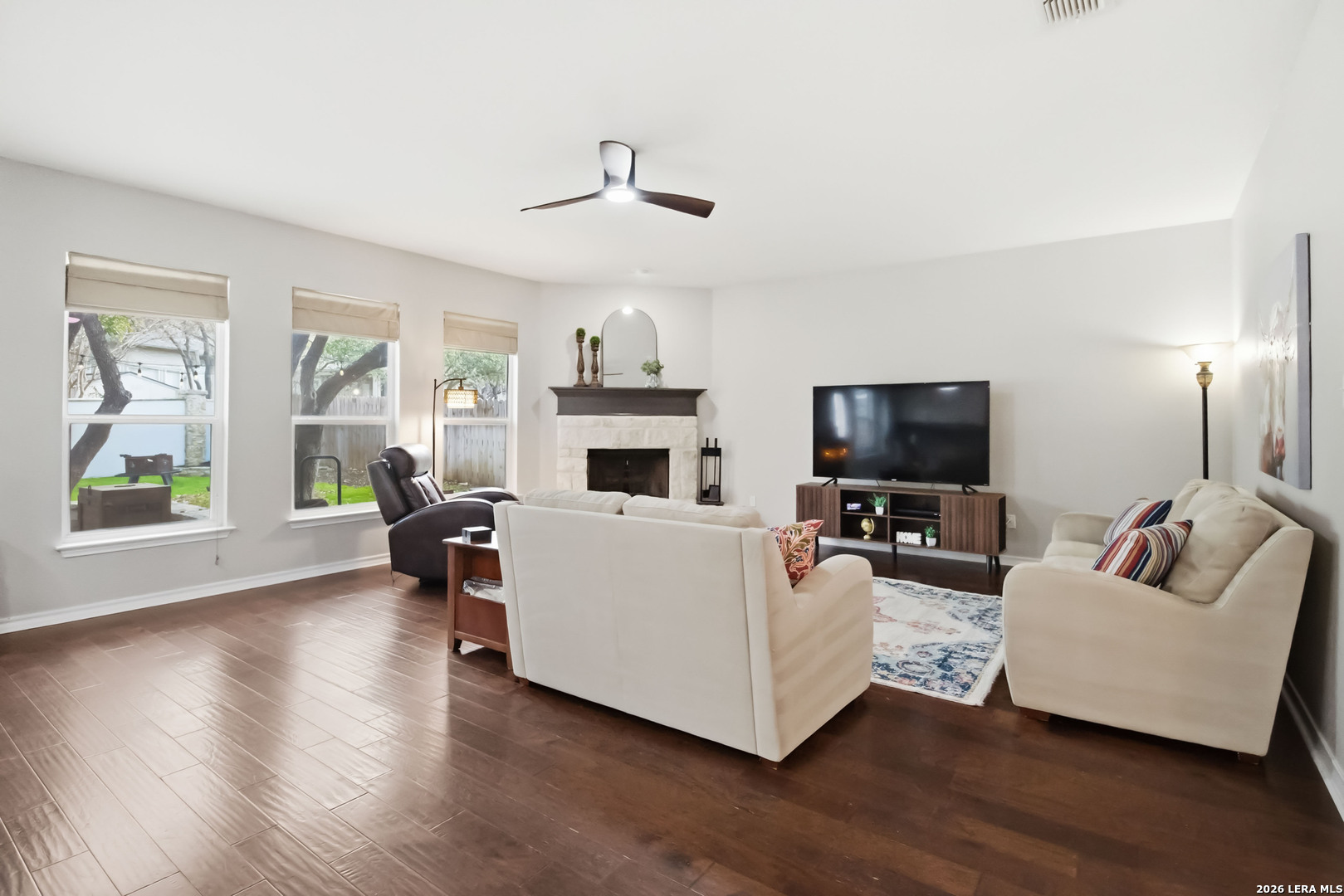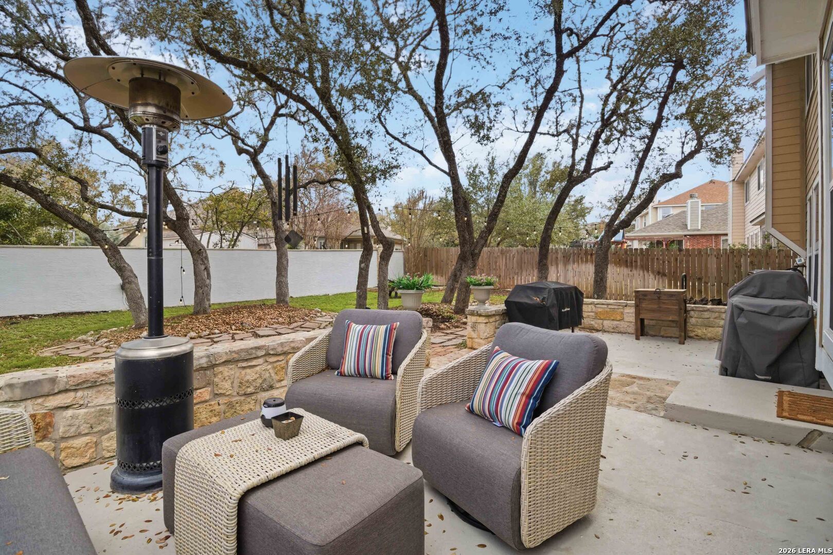 Welcome to this beautifully maintained home in the gated community of Panther Creek at Stone Oak, where an active neighborhood atmosphere meets exceptional convenience. Residents enjoy amenities including a community pool, park, playground, and basketball court, along with a variety of neighborhood gatherings and social groups that create a true sense of community. Inside, the home features an open-concept layout with spacious living areas, ideal for both everyday living and entertaining. Updated lighting throughout the home (2026) adds a fresh, modern touch. Step outside to an oversized patio enclosed by a half stone wall, overlooking a backyard shaded by a beautiful canopy of mature live oak trees. The natural shade creates a cool, park-like outdoor setting, perfect for relaxing evenings, grilling, and outdoor gatherings. The private primary suite offers a renovated spa-inspired bathroom (2022) with a luxurious walk-in shower, separate vanities, and two oversized walk-in closets. Each additional bedroom also features its own walk-in closet, providing generous storage throughout the home. Major system updates include a new HVAC system (2023) with EnviroPure Clean Home Power System and UV air purification, new water heater (2024), and Trimlight permanent exterior lighting (2024). Situated on a quiet interior street with refreshing breezes, this home offers easy access to nearby shopping, dining, and everyday conveniences and is zoned to highly sought-after Wilderness Oak Elementary, Lopez Middle School, and Reagan High School.