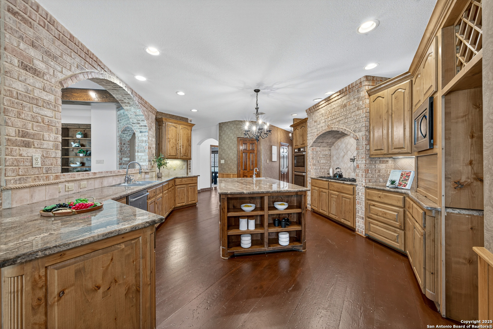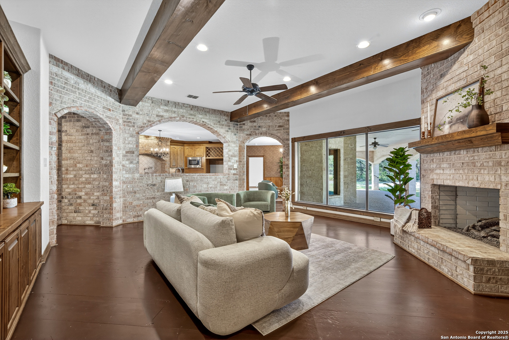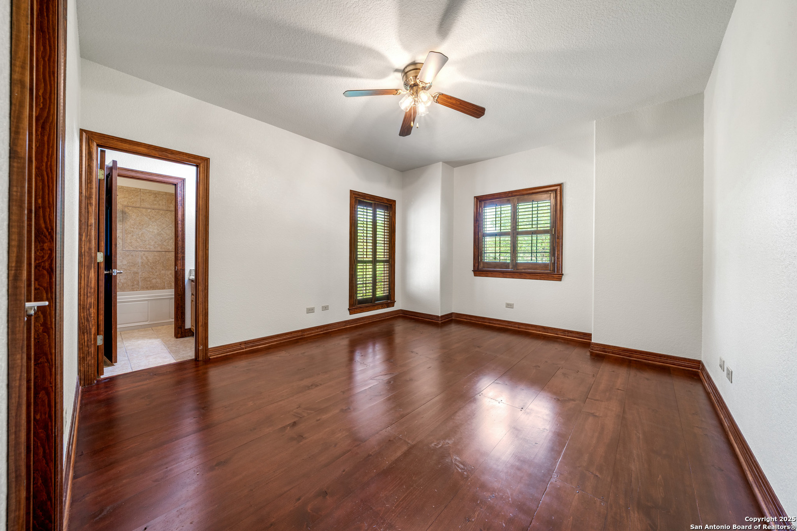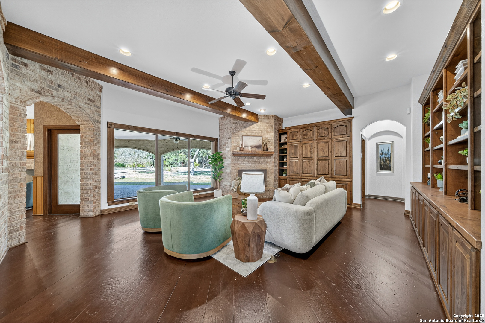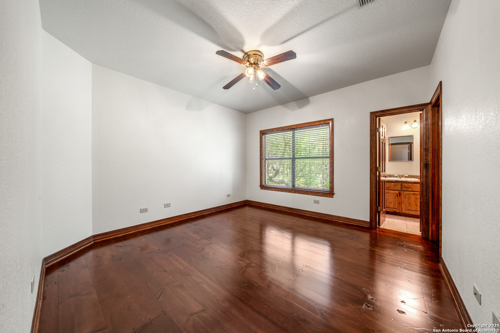 Welcome to your dream home in the heart of highly sought-after Fossil Ridge! Nestled on a picturesque 1.24-acre lot shaded by majestic oak trees, this meticulously maintained one-story custom residence blends timeless elegance with modern comforts. Step inside to find stunning wood floors, rich architectural details, and custom built-ins throughout. This thoughtfully designed home offers two spacious living areas and two dining spaces, ideal for both everyday living and grand entertaining. The gourmet island kitchen is a chef's dream-complete with gas cooking, stainless steel appliances, double ovens, custom cabinetry, and a butler's pantry-seamlessly flowing into the family room and kitchen dining area, both anchored by cozy fireplaces. The private primary suite is a true retreat, featuring its own fireplace, a sitting area, an expansive walk-in closet, and a luxurious spa-like bath with dual vanities, a jetted tub, and a walk-in shower. A versatile bonus room offers flexibility as a game room, home gym, or guest suite. Three generously sized secondary bedrooms include a Jack-and-Jill bath and an additional full bath for convenience. Enjoy peaceful Texas evenings or lively gatherings on the large covered back patio, overlooking a lush backyard with ample space for play, relaxation, or even a future pool. Located in the acclaimed NEISD school district with easy access to HWY 281, the JW Marriott, shopping, dining, and medical facilities-this home truly offers it all. This exquisite one-story custom home invites you to experience refined Hill Country living at its finest.