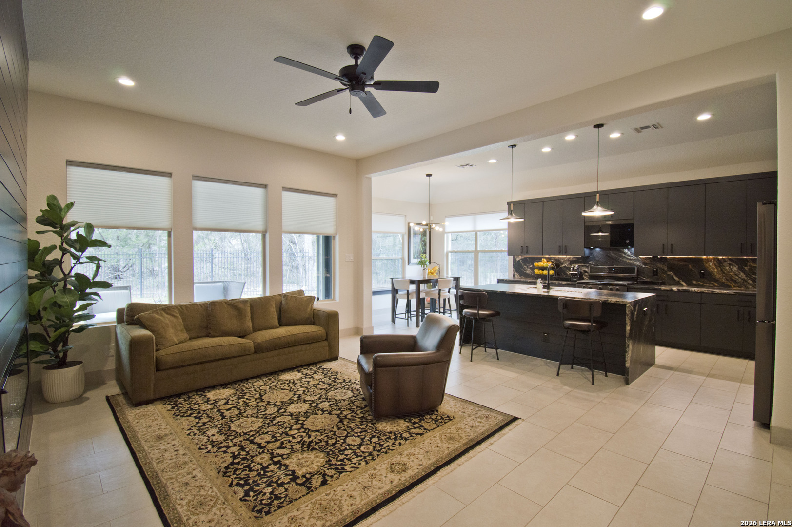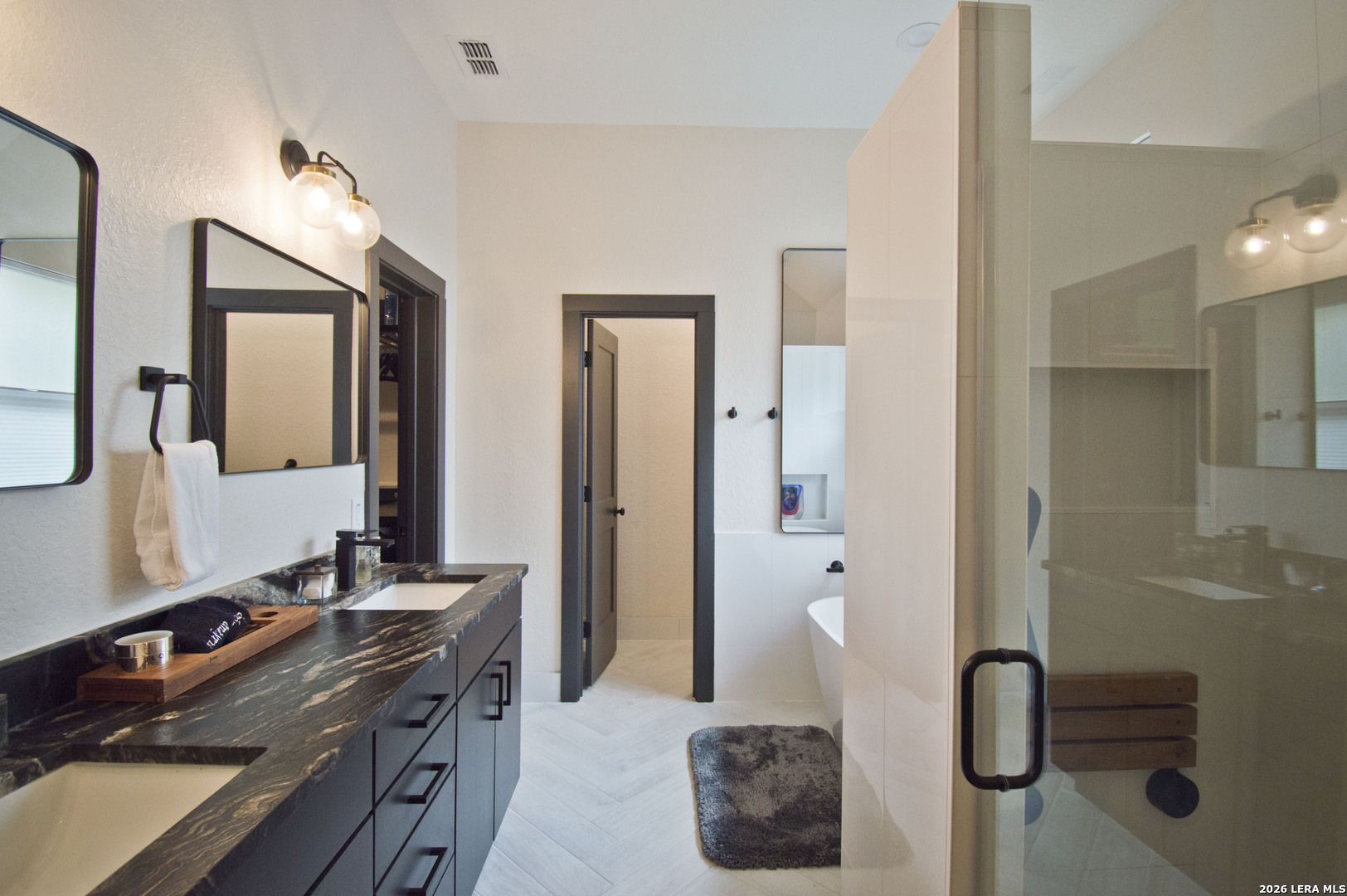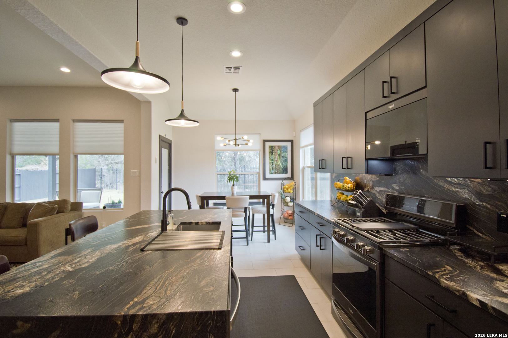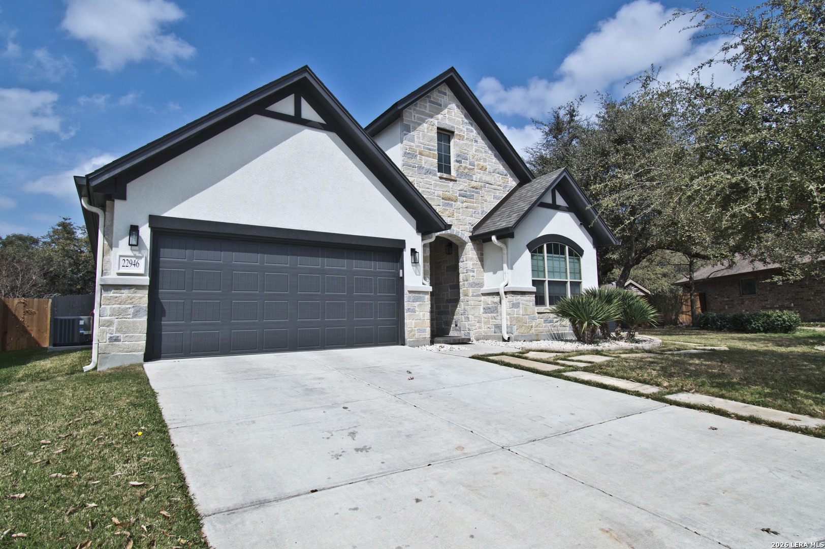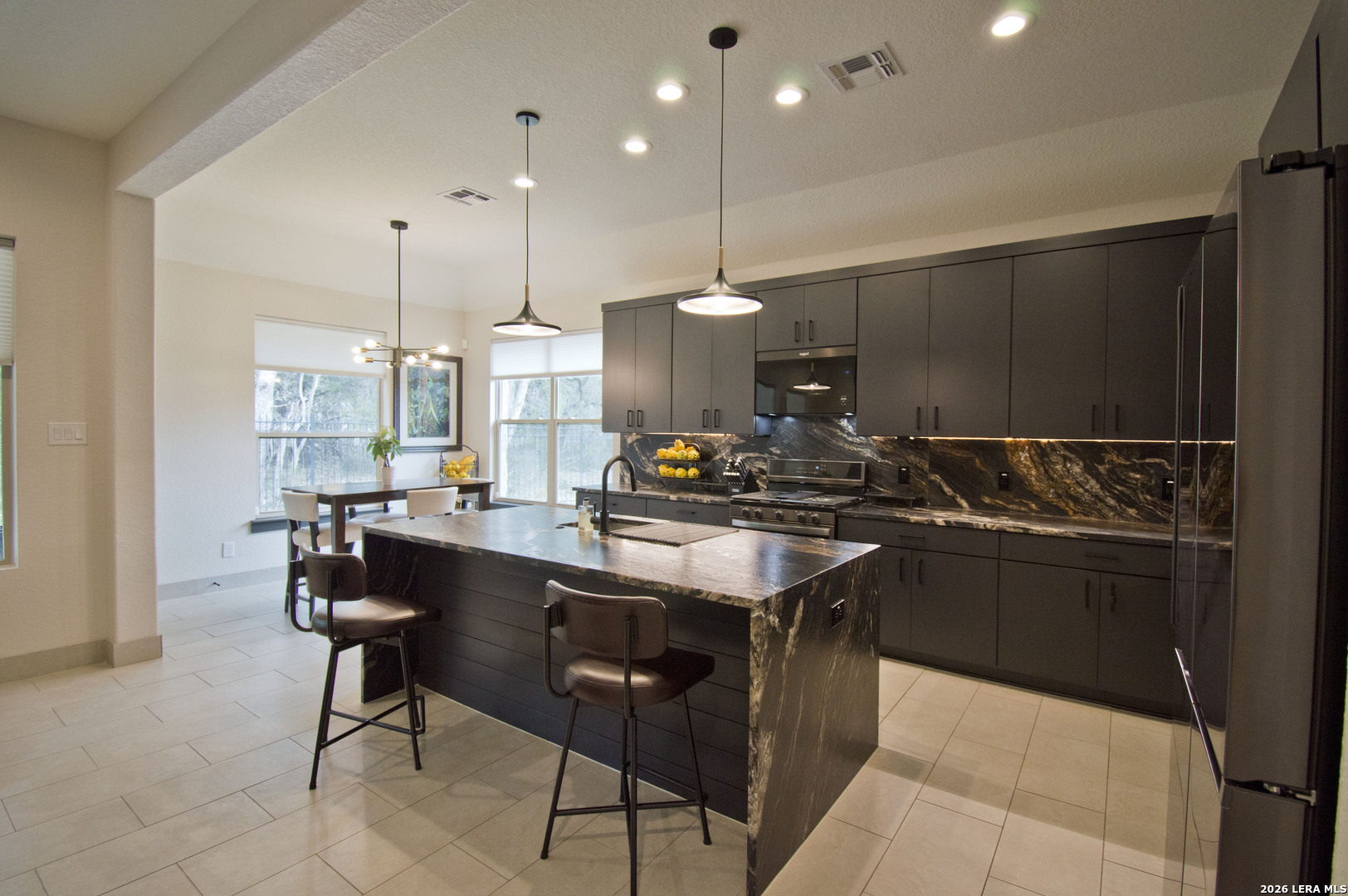 This thoughtfully and beautifully designed home is the perfect mix of Texas Hill Country and modern styles. Enjoy a gorgeous waterfall island kitchen with custom countertops. The open floor plan is perfect for entertaining. In the primary you will find double vanities, a soaker tub & separate shower. Upstairs there is an oversized loft perfect for a theater, playroom, or gaming area. Last but not least, enjoy the greenbelt behind your large backyard, giving you privacy and quiet.