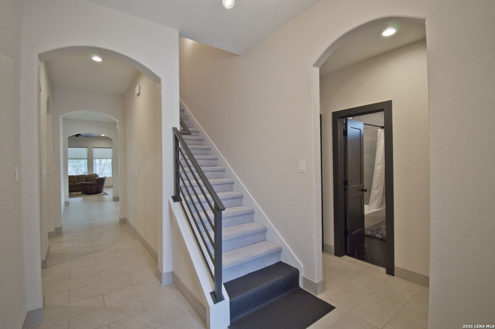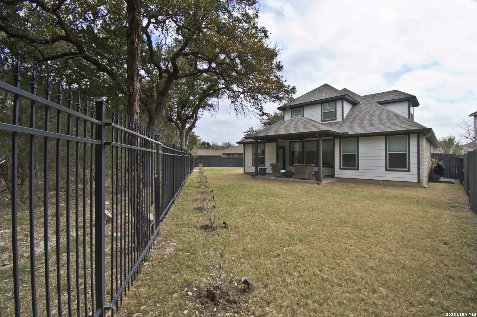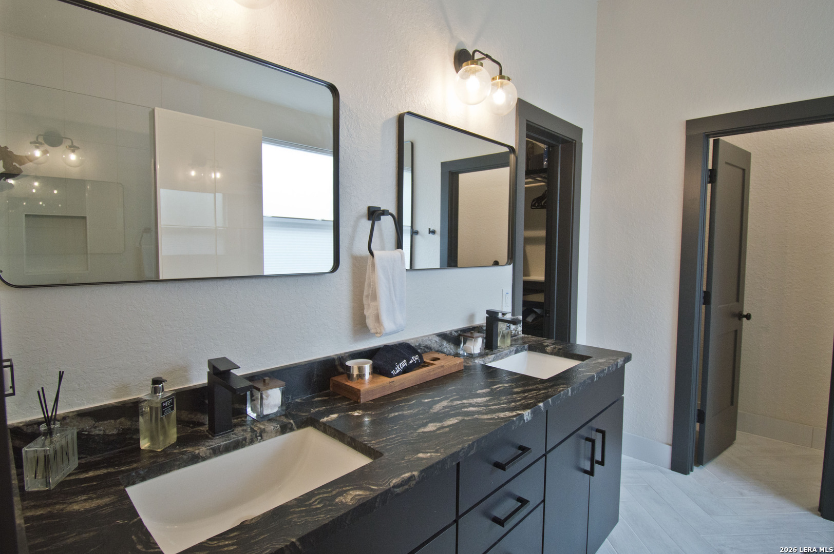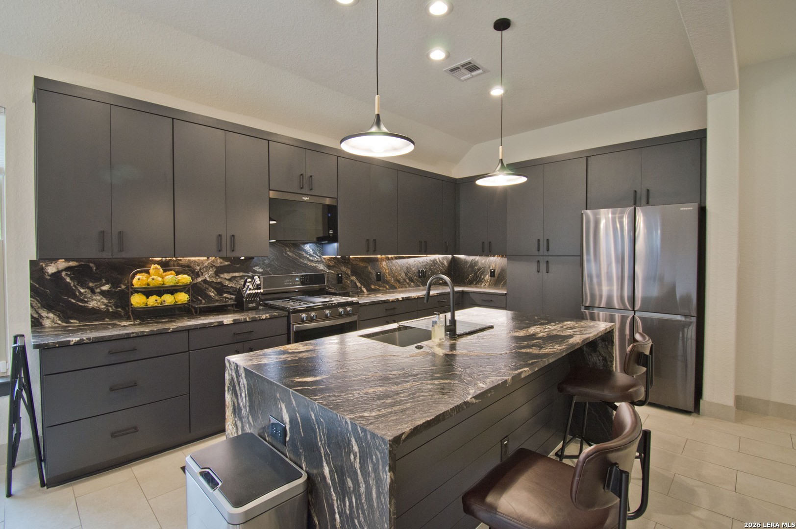 This thoughtfully and beautifully designed home is the perfect mix of Texas Hill Country and modern styles. Enjoy a gorgeous waterfall island kitchen with custom countertops. The open floor plan is perfect for entertaining. In the primary you will find double vanities, a soaker tub & separate shower. Upstairs there is an oversized loft perfect for a theater, playroom, or gaming area. Last but not least, enjoy the greenbelt behind your large backyard, giving you privacy and quiet.