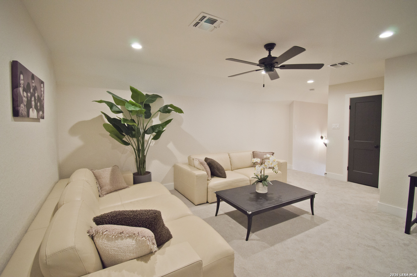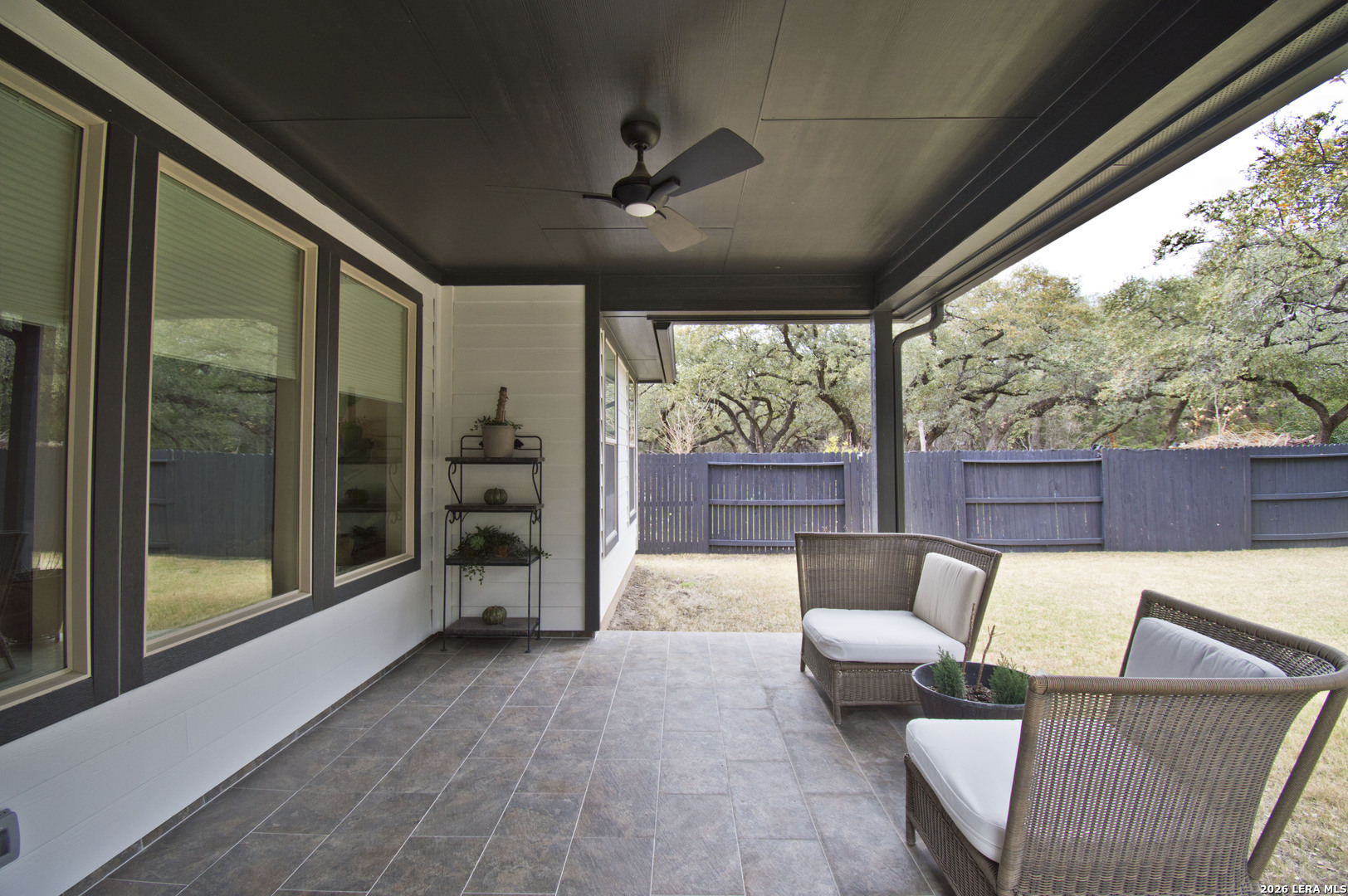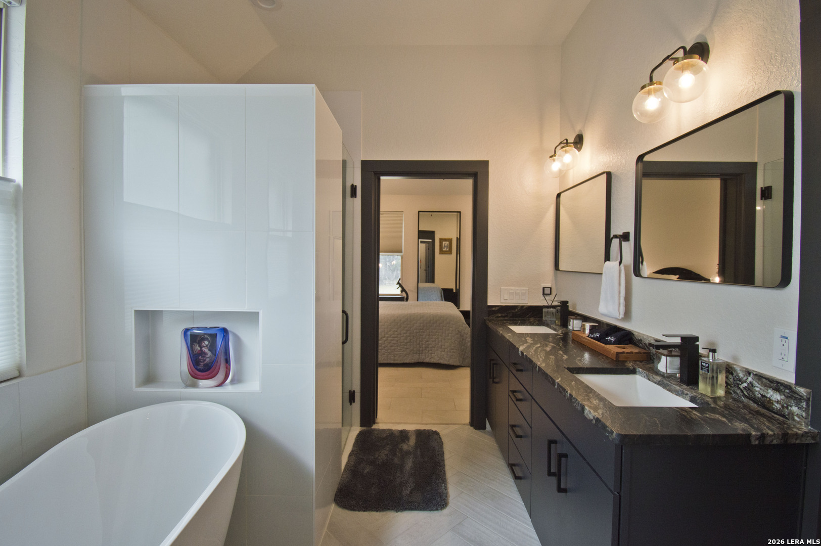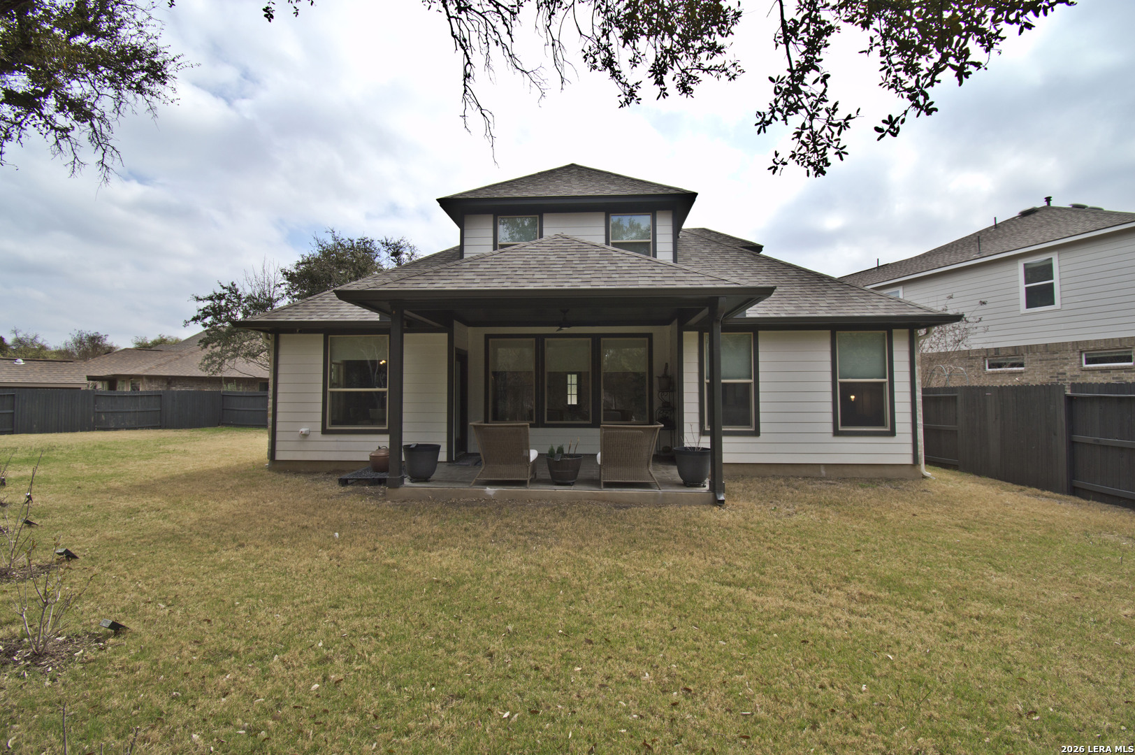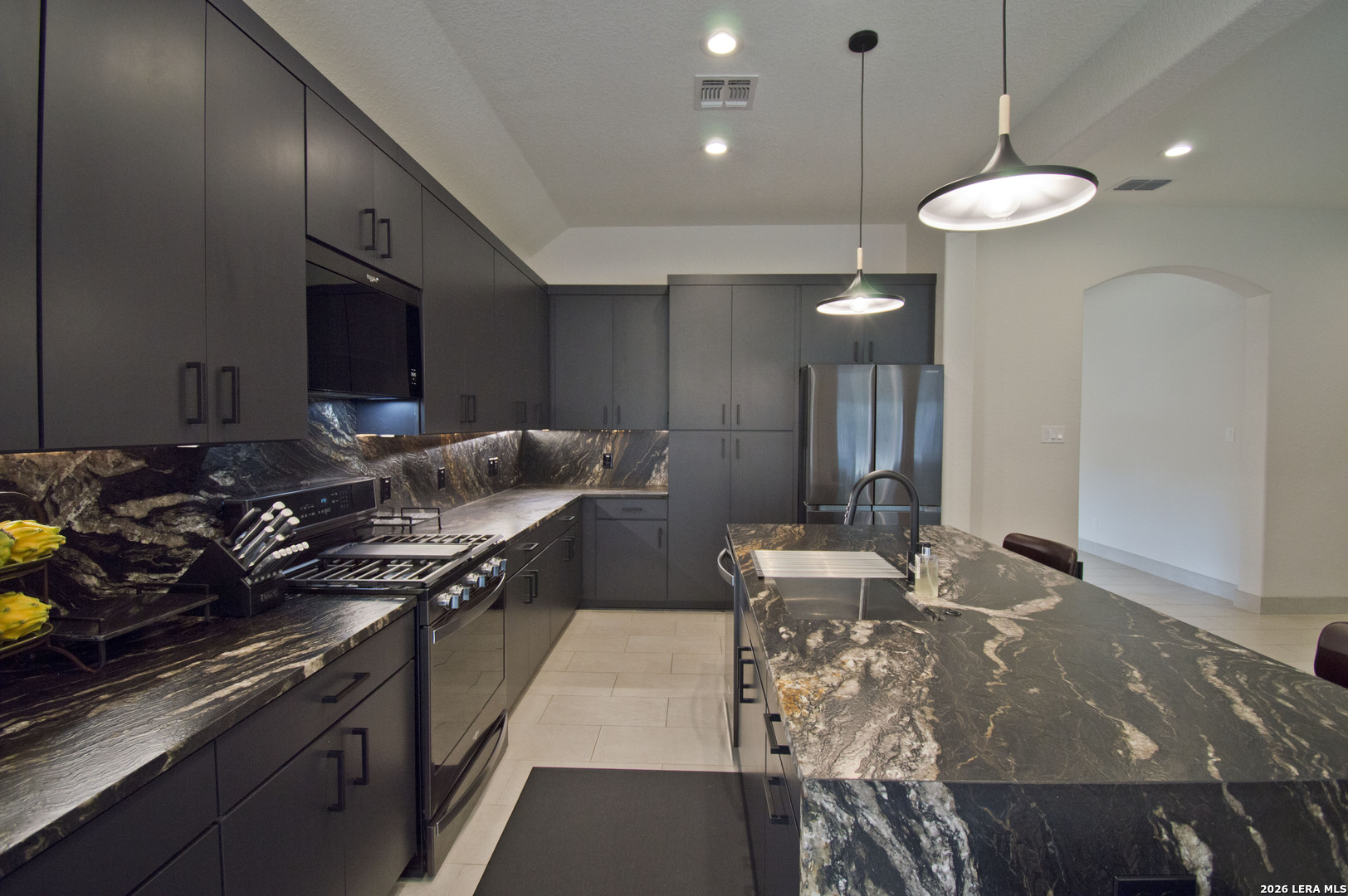 This thoughtfully and beautifully designed home is the perfect mix of Texas Hill Country and modern styles. Enjoy a gorgeous waterfall island kitchen with custom countertops. The open floor plan is perfect for entertaining. In the primary you will find double vanities, a soaker tub & separate shower. Upstairs there is an oversized loft perfect for a theater, playroom, or gaming area. Last but not least, enjoy the greenbelt behind your large backyard, giving you privacy and quiet.