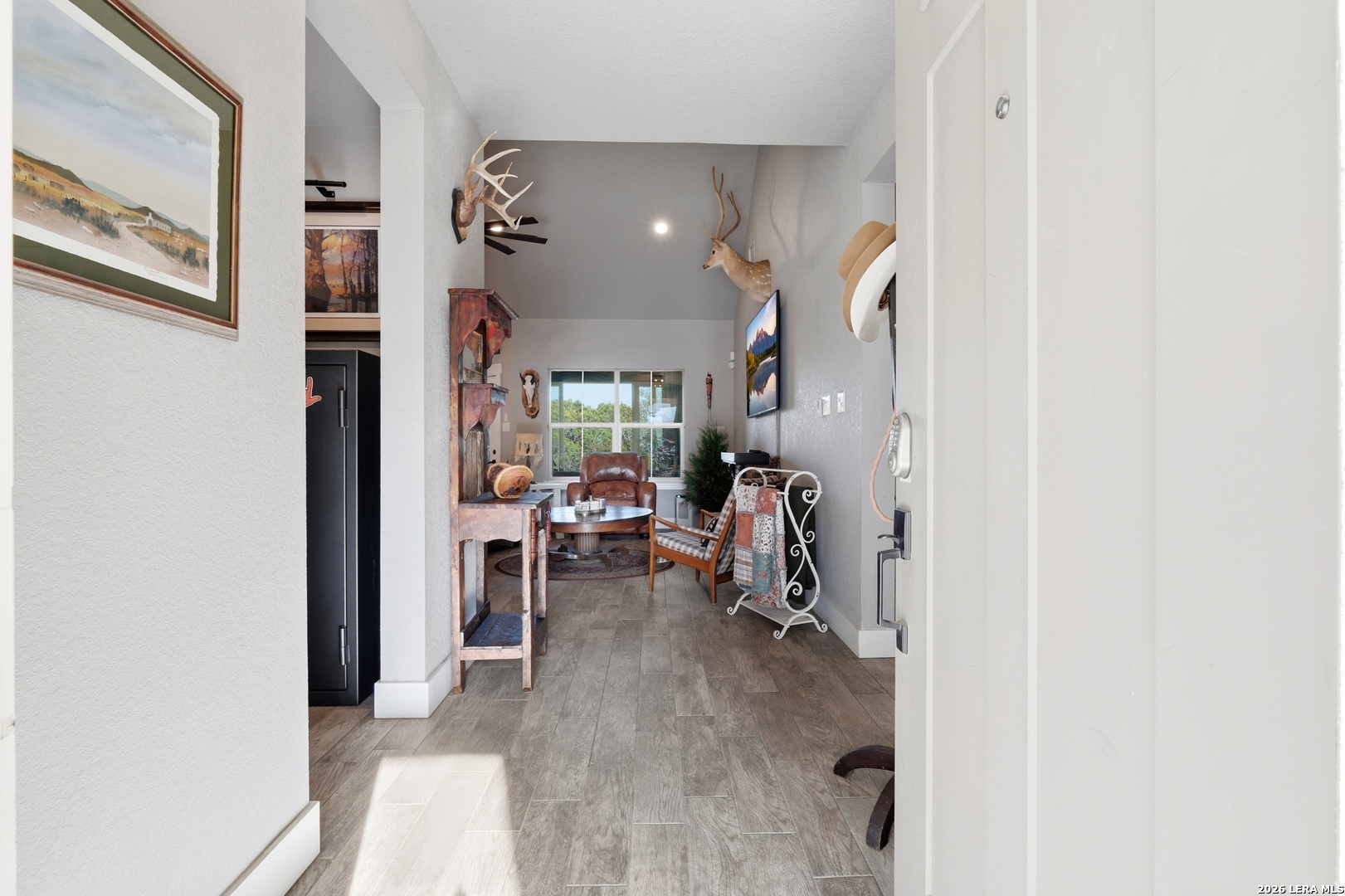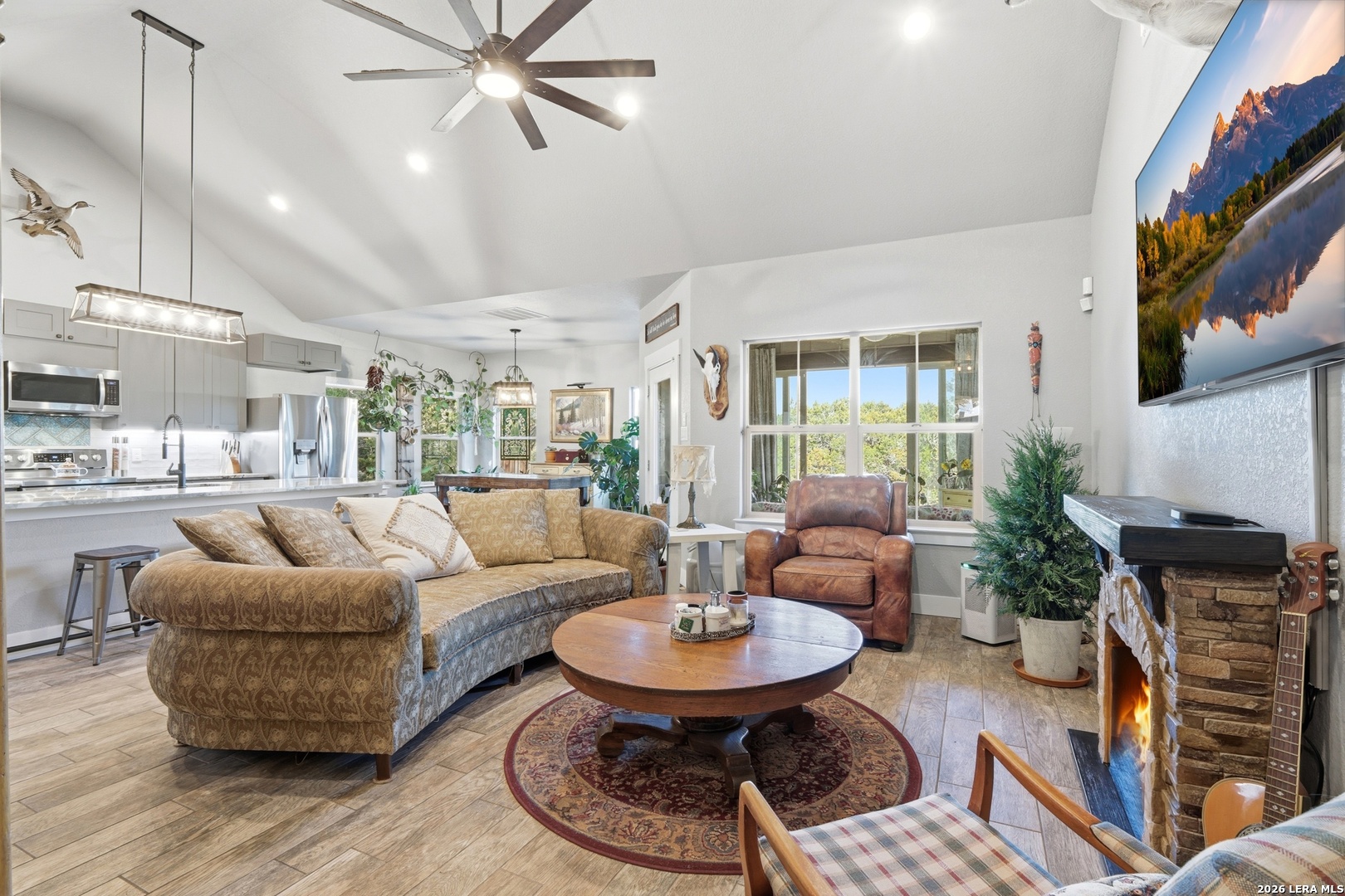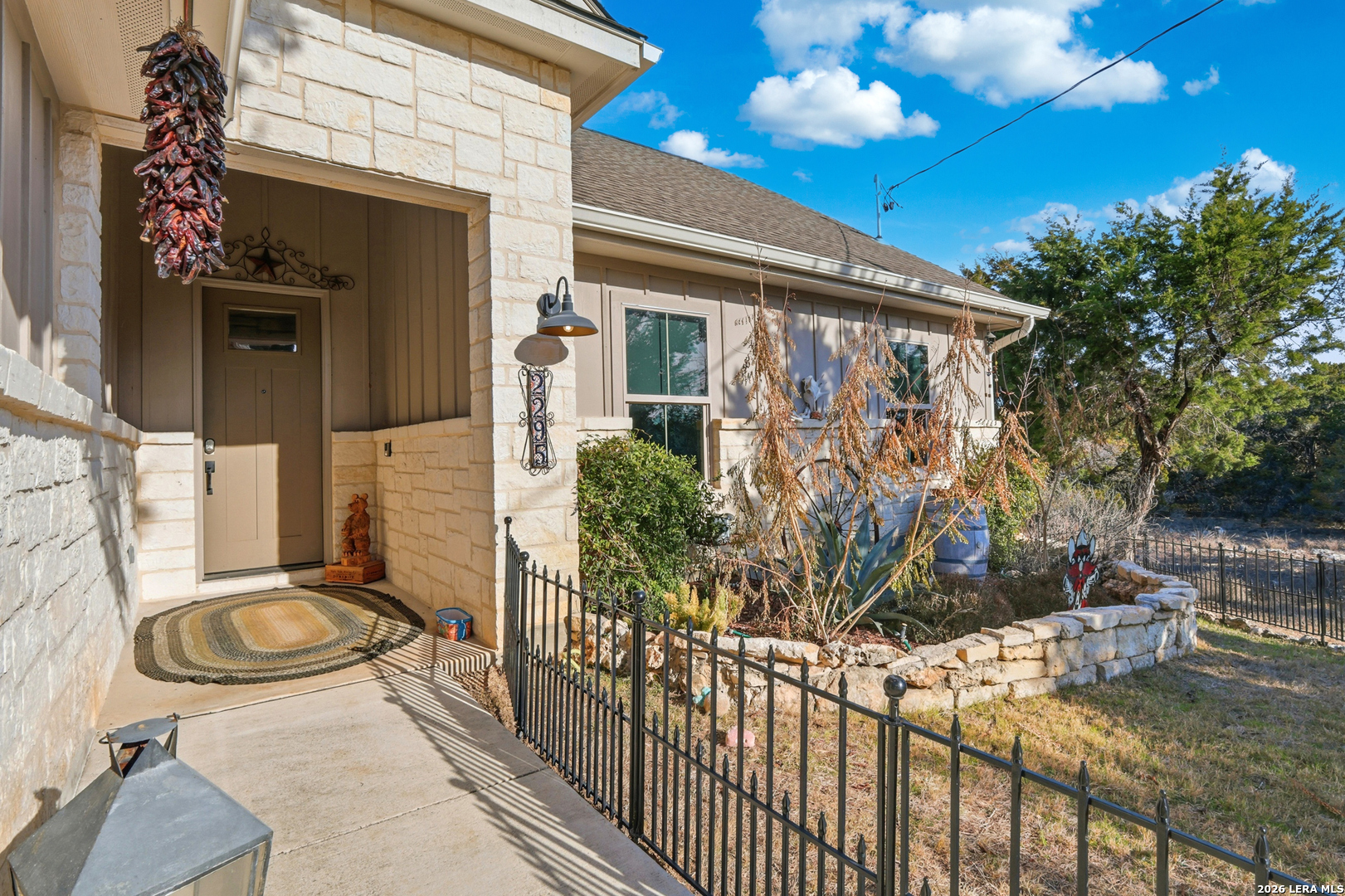 Experience serene country living in Spring Branch with this stunning home situated on a greenbelt, backing up to the community's 29.4-acre reserve with no neighbors on all 4 sides. A circular drive welcomes you to a home filled with natural light from abundant windows throughout. Inside, high vaulted ceilings with recessed lighting create an open, airy feel. The kitchen features a large island with marble countertops, a breakfast bar, stainless steel appliances, and plenty of cabinet space, perfect for culinary enthusiasts. Woodlike ceramic tile flows throughout the main living areas, seamlessly connecting spaces. A Florida room with wood ceilings provides a peaceful retreat and opens to the backyard, which offers a spacious patio, mature landscaping, and a dog run/kennel, ideal for outdoor entertaining or relaxing in privacy. The primary suite offers an ensuite with an oversized tiled shower, a bench, and dual vanities with marble countertops. Upstairs, a bonus room provides flexible space ideal for guests or an office. Located just a short drive from Canyon Lake and The Rebecca Creek Golf Course, this home blends comfortable living with access to outdoor recreation and community amenities.