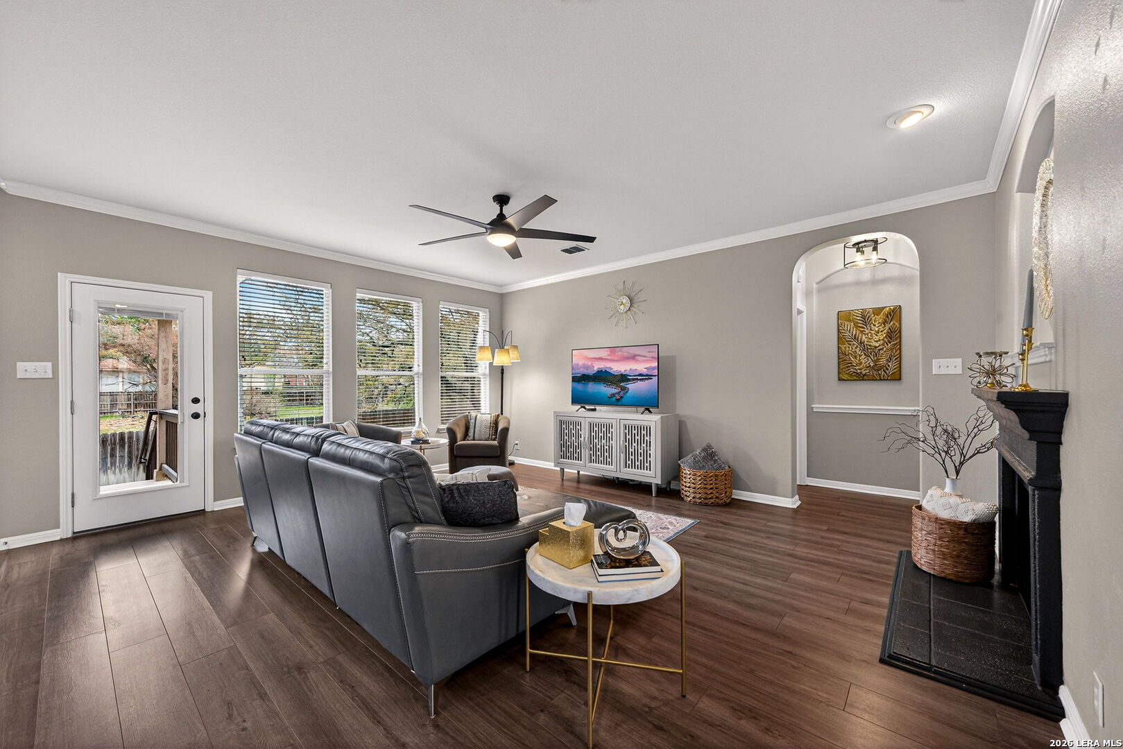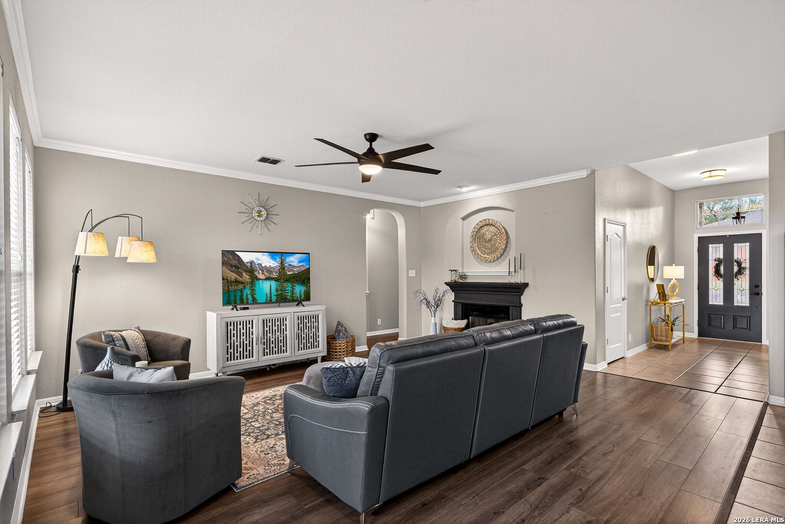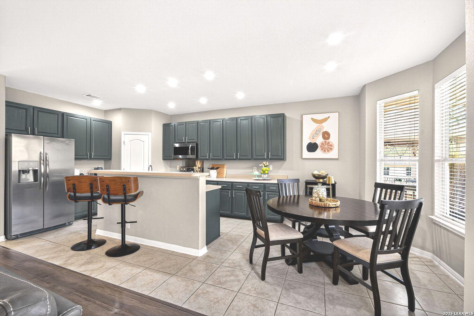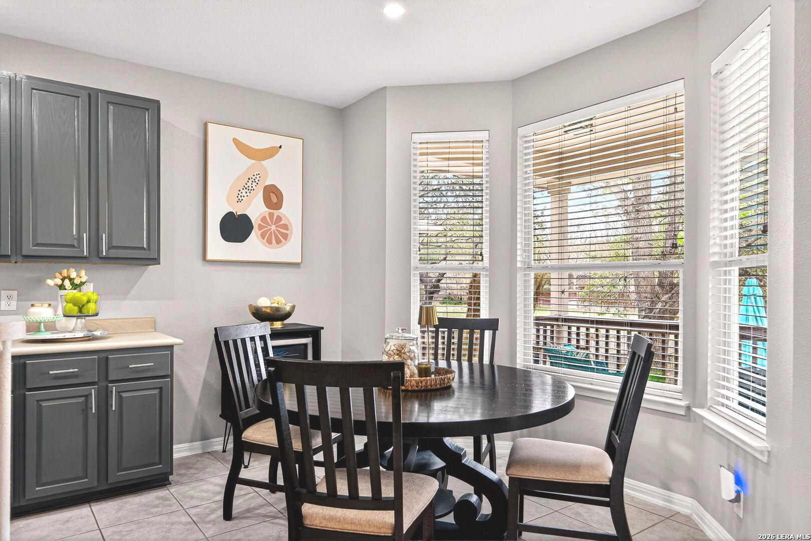 Upon entering this pristine home, you will discover neutral wall tones, complemented by modern tile and wide-plank laminate flooring. A designated home office offers an ideal environment with ample lighting for productivity, elegant glass doors, chair-arm molding, and a stylish light fixture. Instead of a home office, create a space that reflects your personality, such as a formal dining room, sitting room, or even a music room. The foyer leads to an open floor plan, where the kitchen seamlessly opens into the family room, creating an expansive living area. The eat-in kitchen serves as a focal point with beautiful cabinetry in a sophisticated color, complementary hardware, stainless steel appliances, and a spacious breakfast nook overlooking the covered patio. The breakfast bar is an ideal gathering space for family or guests to interact, or it functions as additional countertop space when entertaining. The large windows fill the family room with natural light, inviting you to gaze out at the backyard and greenbelt, while the fireplace adds a touch of comfort. Retreat to a spacious owner's suite with windows overlooking the backyard for added privacy, and enjoy your spa-like bath with separate sinks. Two additional bedrooms, a hall bathroom with beautifully decorated cabinets, complementary hardware, and upgraded lighting over dual sinks. Enjoy morning coffee on a covered patio for shaded comfort, or entertain guests with additional seating on the open-air terrace. The side-entry garage has a window bringing more light into the garage. This wonderful home is conveniently located near shopping, dining, and amenities such as a Library and Golf Course.