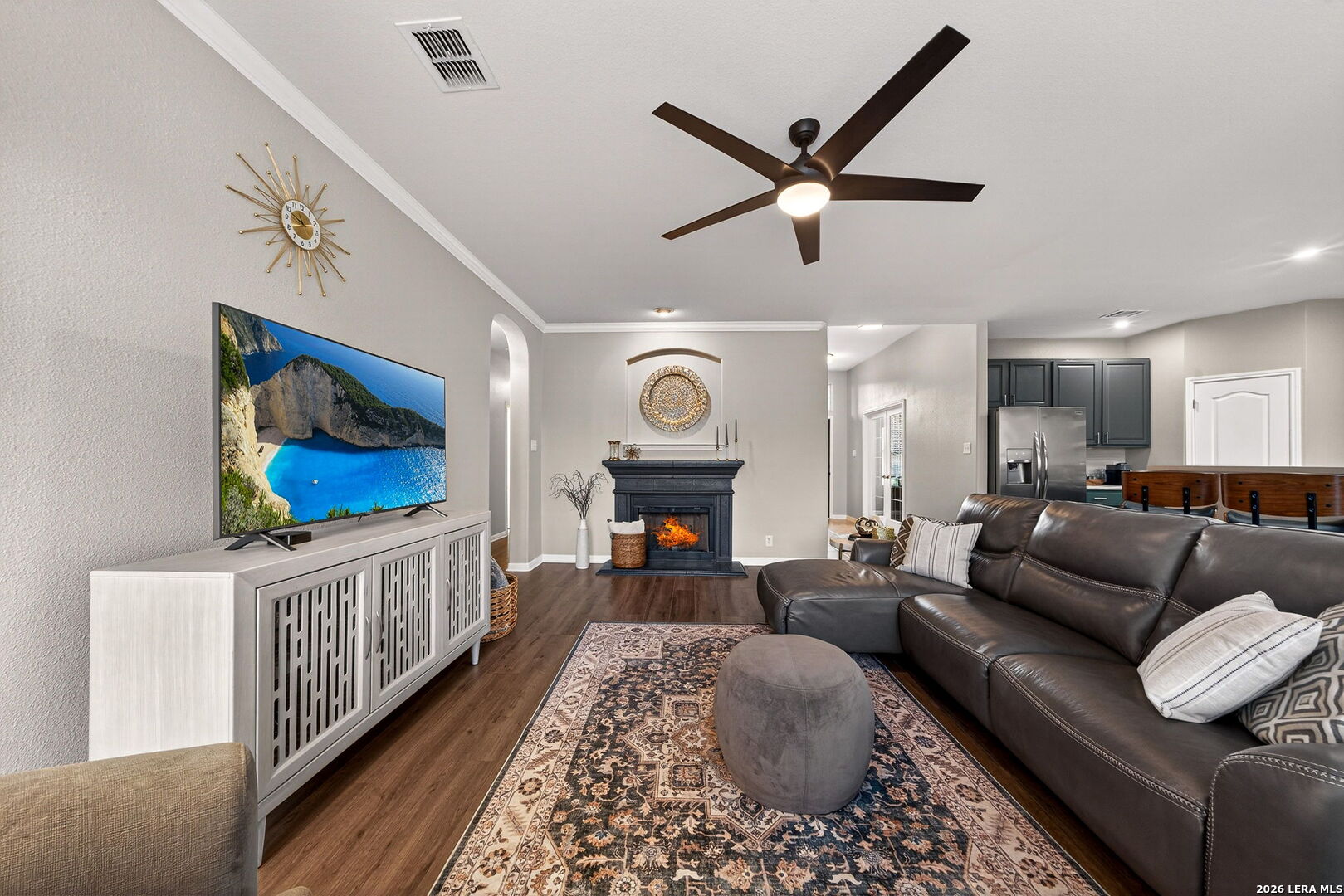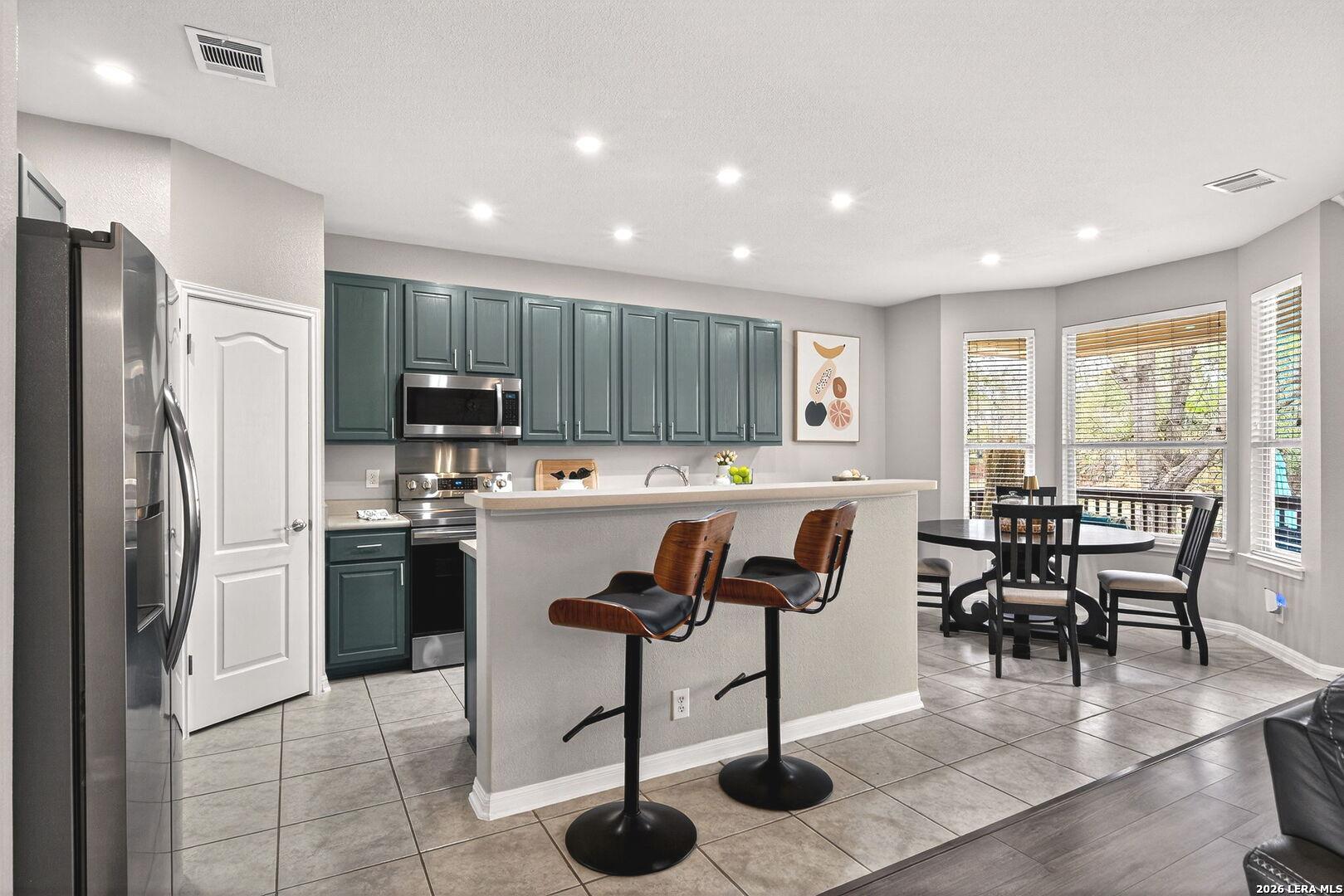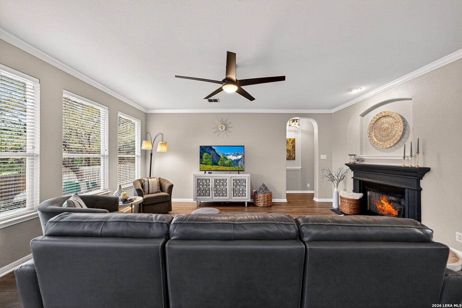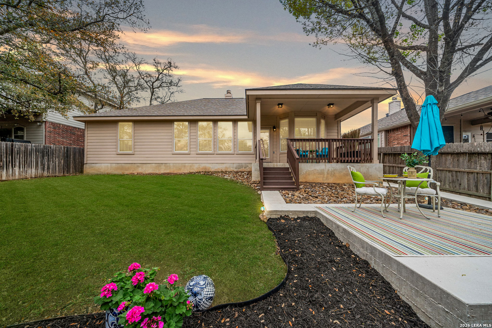 Upon entering this pristine home, you will discover neutral wall tones, complemented by modern tile and wide-plank laminate flooring. A designated home office offers an ideal environment with ample lighting for productivity, elegant glass doors, chair-arm molding, and a stylish light fixture. Instead of a home office, create a space that reflects your personality, such as a formal dining room, sitting room, or even a music room. The foyer leads to an open floor plan, where the kitchen seamlessly opens into the family room, creating an expansive living area. The eat-in kitchen serves as a focal point with beautiful cabinetry in a sophisticated color, complementary hardware, stainless steel appliances, and a spacious breakfast nook overlooking the covered patio. The breakfast bar is an ideal gathering space for family or guests to interact, or it functions as additional countertop space when entertaining. The large windows fill the family room with natural light, inviting you to gaze out at the backyard and greenbelt, while the fireplace adds a touch of comfort. Retreat to a spacious owner's suite with windows overlooking the backyard for added privacy, and enjoy your spa-like bath with separate sinks. Two additional bedrooms, a hall bathroom with beautifully decorated cabinets, complementary hardware, and upgraded lighting over dual sinks. Enjoy morning coffee on a covered patio for shaded comfort, or entertain guests with additional seating on the open-air terrace. The side-entry garage has a window bringing more light into the garage. This wonderful home is conveniently located near shopping, dining, and amenities such as a Library and Golf Course.