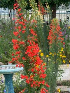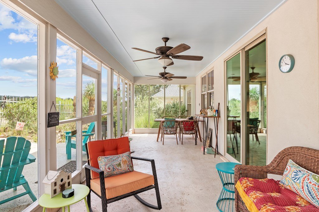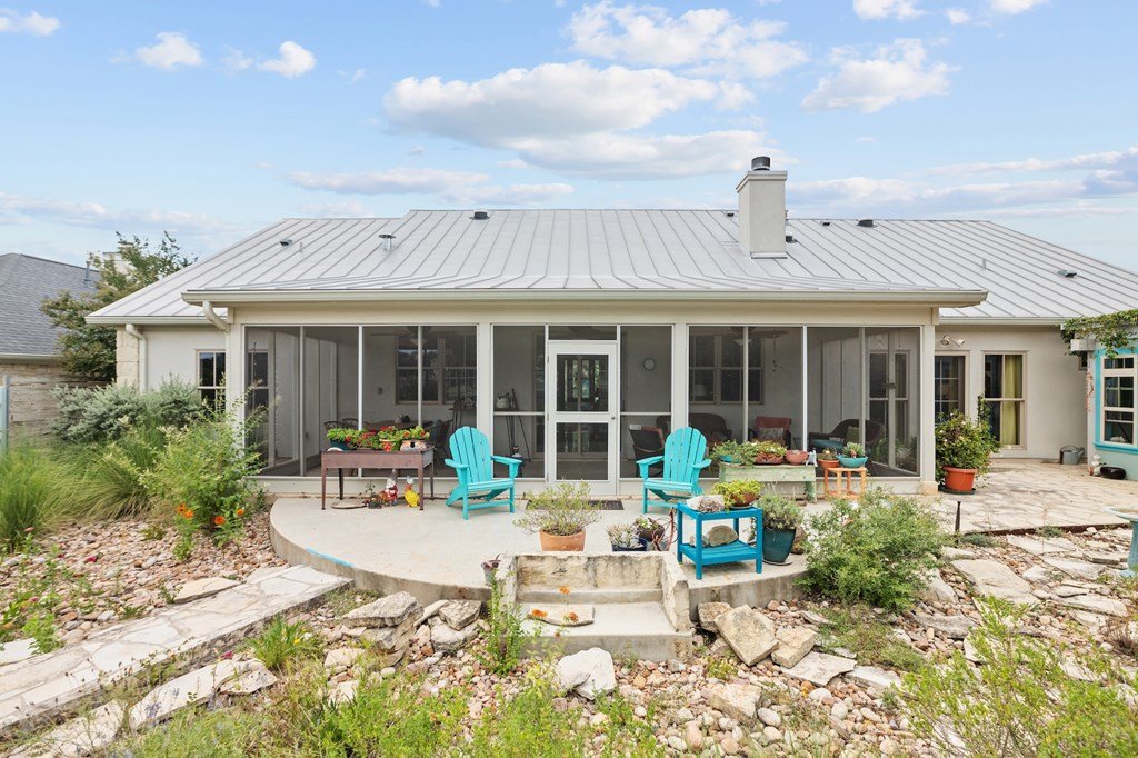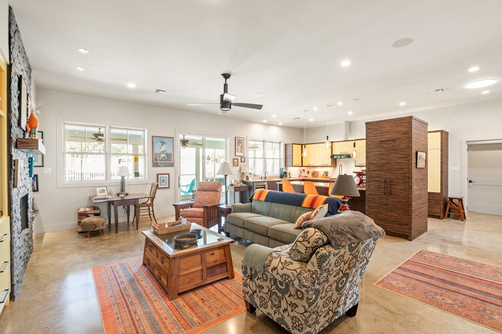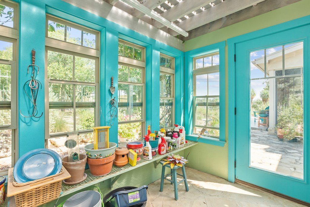 Experience refined living in this Durst-built custom home where craftsmanship meets fantastic views. This exceptional beautifully designed residence is a true retreat for master gardeners and entertainers alike. The split, open-concept floor plan features a spacious great room with a slate-faced gas fireplace, media wall, and specialty lighting—perfect for gatherings or cozy evenings at home. Joining is the chef's kitchen shining with Bosch appliances, custom Kingwood cabinetry, a granite eat-at island, and rich Texas pecan countertops. Seamlessly joining the kitchen is a dining room with large windows to capitalize on the views. A private primary suite offers a spa-like bath complete with a large walk-in shower and dual sinks set in granite and a huge walk-in closet. On the opposite side of the house are two bedrooms which share a hall bathroom offering an over-sized shower. The fourth bedroom, currently used as an office, adds flexibility for work or guests. Throughout the home, you'll find striking Element 7 concrete floors, high ceilings and abundant storage to keep everything organized and within reach. Conveniently located near the primary bedroom is a generous utility room with leather finished granite counters. The property boasts expansive garden beds, native landscaping, a water catchment system and thoughtfully designed xeriscaping, creating a low-maintenance yet lush outdoor environment. A charming greenhouse/ potting cottage complete with water and electricity, a spacious screened room across the back of the home overlooking the backyard, and the stone walkways and seating areas make this a haven for both gardeners and those who simply enjoy relaxing in nature. The back yard is enclosed with custom iron fencing and decorative gates. Don't let this one slip away.