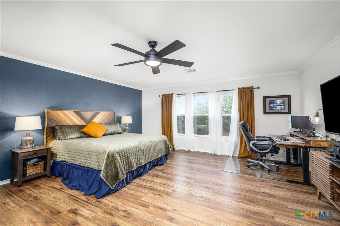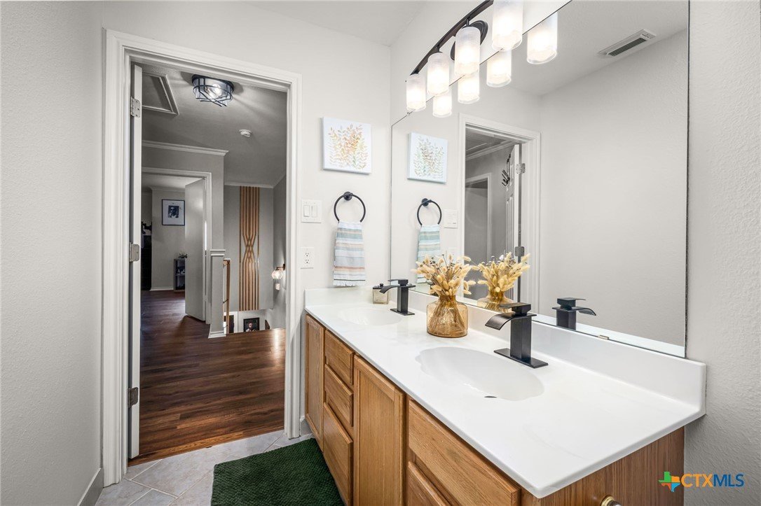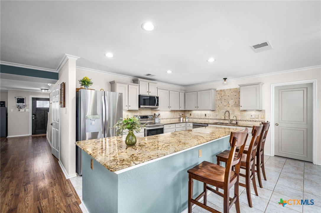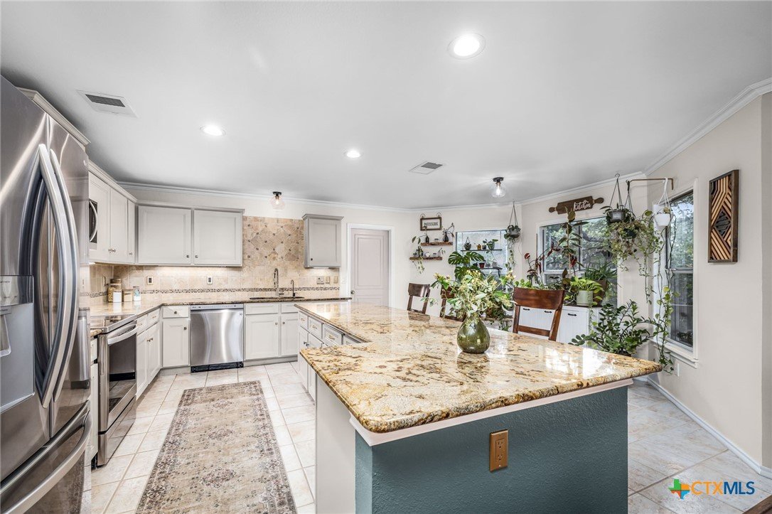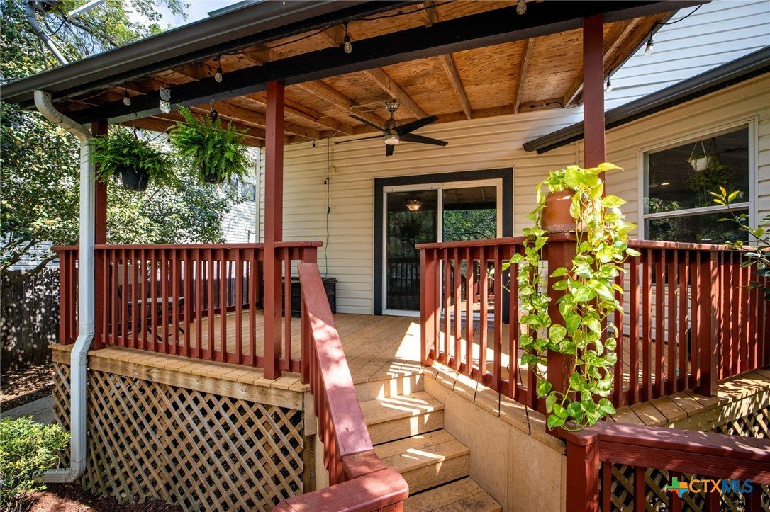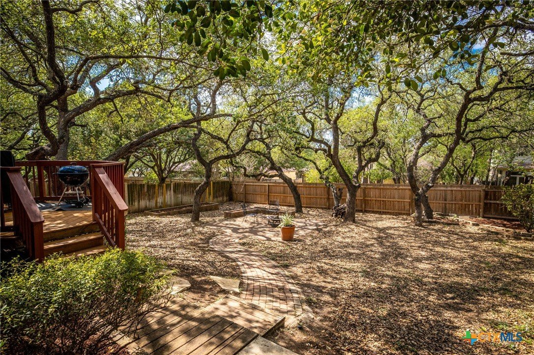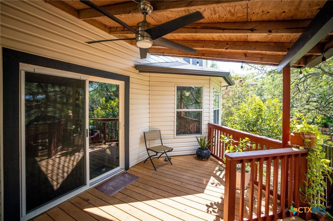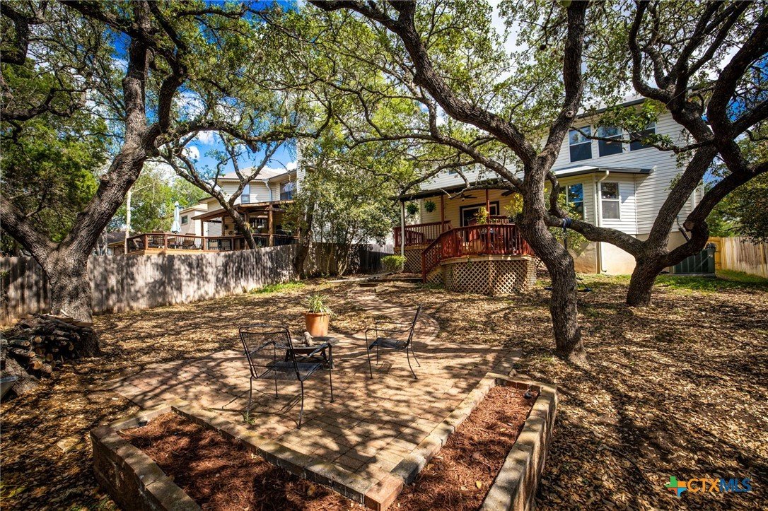 Beautifully maintained two story home nestled in a quiet, mature neighborhood in the highly desirable Ashley Place community. Situated on a generous 0.18 acre lot, this impressive home offers 2,537 sq ft of thoughtfully designed living space w/3 bedrooms, a large flex room, 2.1 bathrooms, and a 2 car garage. The inviting entry opens to a spacious flex room, perfect for formal dining, home office, or playroom, unlimited options! The open concept floor plan features a bright eat in kitchen w/granite countertops, reverse osmosis water filtration system, LG stainless steel appliances, custom upgraded cabinetry w/soft close doors, stylish pulls, under cabinet lighting, and an oversized walk in pantry. The expansive living area is designed for comfort and entertaining, showcasing a gorgeous accent wall, custom walnut mantel w/fireplace, plantation shutters, and elegant crown molding. The private primary suite offers a true retreat with a luxurious en suite bath featuring dual vanities, a garden tub, separate shower, and his and hers walk in closets. All secondary bedrooms are generously sized. Step outside to your own resort style backyard oasis, complete with a covered patio, two tiered deck, and mature trees that provide both beauty and privacy, perfect for relaxing evenings or hosting gatherings. Conveniently located near highly acclaimed SCUISD, JBSA-Randolph, dining, entertainment, and exceptional shopping. Loaded with upgrades; this home is a must see to truly appreciate!