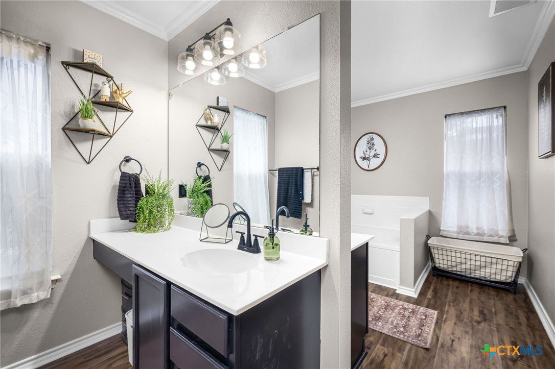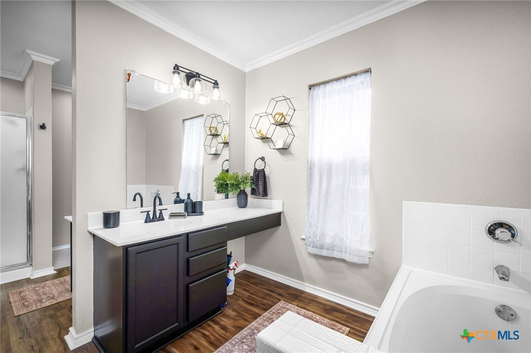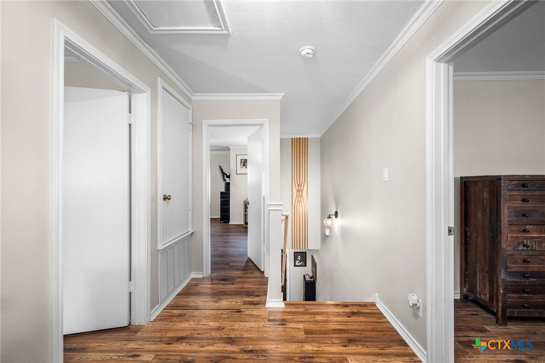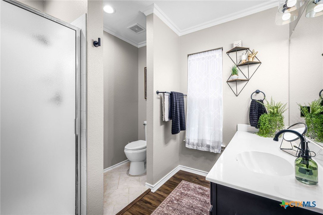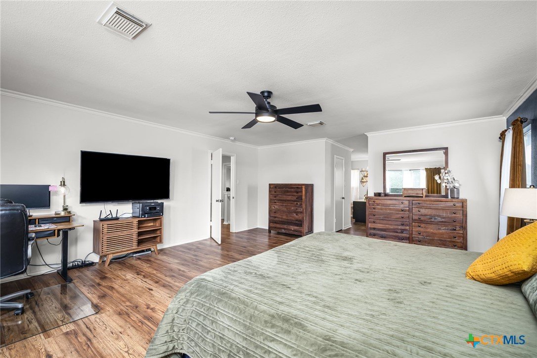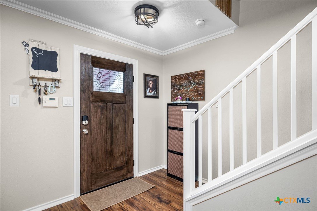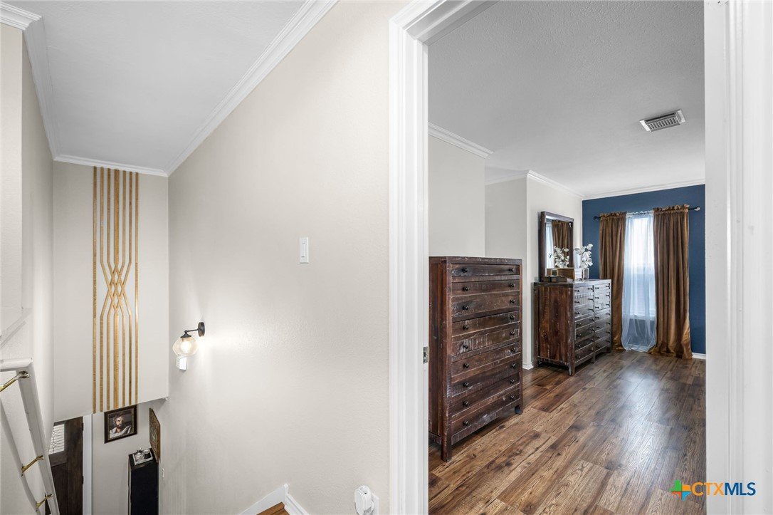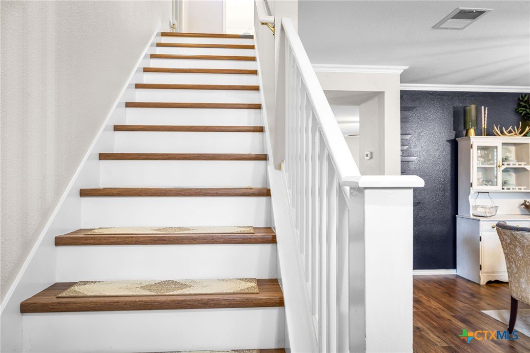 Beautifully maintained two story home nestled in a quiet, mature neighborhood in the highly desirable Ashley Place community. Situated on a generous 0.18 acre lot, this impressive home offers 2,537 sq ft of thoughtfully designed living space w/3 bedrooms, a large flex room, 2.1 bathrooms, and a 2 car garage. The inviting entry opens to a spacious flex room, perfect for formal dining, home office, or playroom, unlimited options! The open concept floor plan features a bright eat in kitchen w/granite countertops, reverse osmosis water filtration system, LG stainless steel appliances, custom upgraded cabinetry w/soft close doors, stylish pulls, under cabinet lighting, and an oversized walk in pantry. The expansive living area is designed for comfort and entertaining, showcasing a gorgeous accent wall, custom walnut mantel w/fireplace, plantation shutters, and elegant crown molding. The private primary suite offers a true retreat with a luxurious en suite bath featuring dual vanities, a garden tub, separate shower, and his and hers walk in closets. All secondary bedrooms are generously sized. Step outside to your own resort style backyard oasis, complete with a covered patio, two tiered deck, and mature trees that provide both beauty and privacy, perfect for relaxing evenings or hosting gatherings. Conveniently located near highly acclaimed SCUISD, JBSA-Randolph, dining, entertainment, and exceptional shopping. Loaded with upgrades; this home is a must see to truly appreciate!