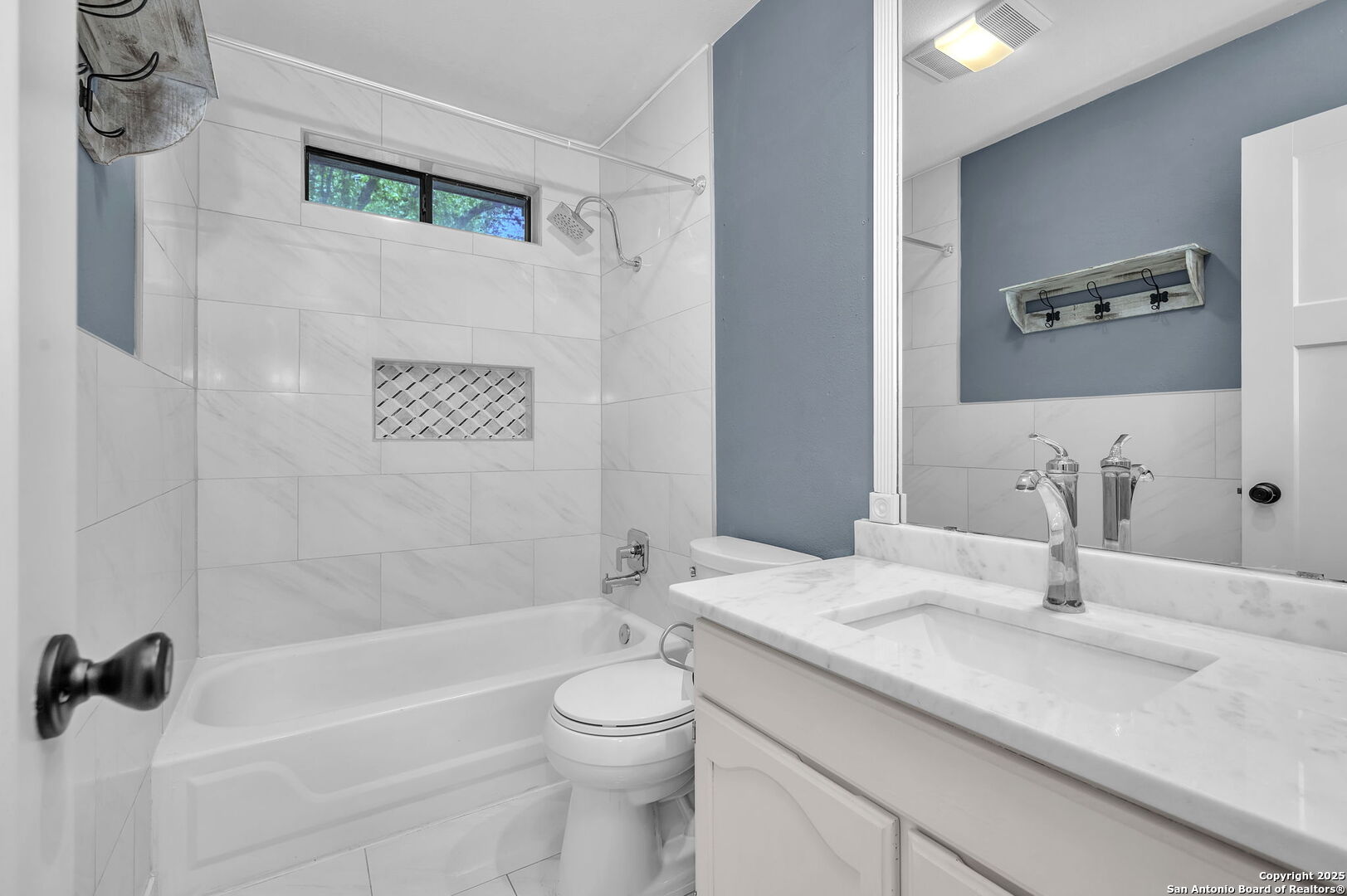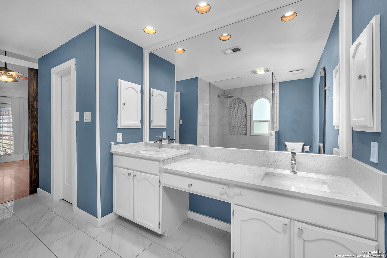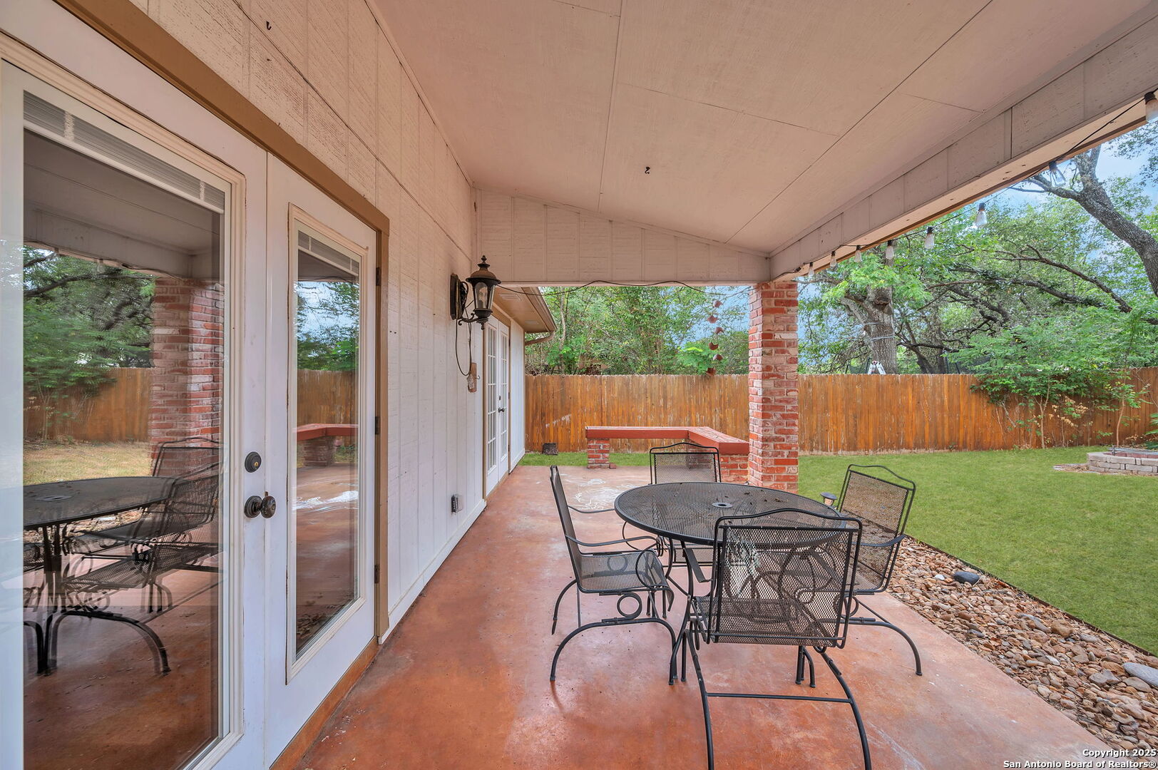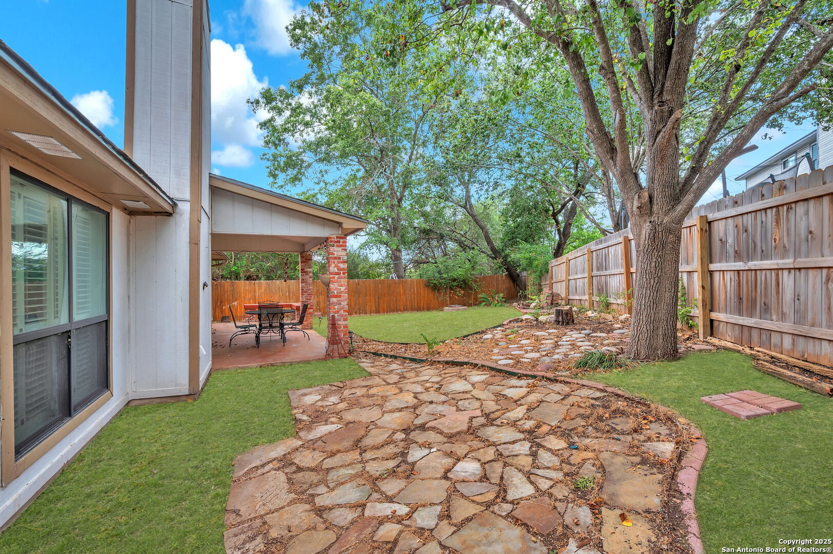 Move-in ready and full of character, this beautifully updated 3-bedroom, 2-bath home is nestled in the sought-after Encino Park community. Step inside to discover soaring 16-foot vaulted ceilings in both the living room and the primary suite, creating an open and inviting atmosphere ideal for entertaining or unwinding. The spacious primary suite offers dual walk-in closets and a luxurious, newly renovated bathroom featuring an Italian marble double vanity and an oversized walk-in shower that evokes a spa-like retreat. The guest bath has also been stylishly updated, enhancing the home's modern appeal and move-in-ready condition. Enjoy the charm and convenience of Encino Park's established community, known for its mature trees, neighborhood amenities, and friendly atmosphere. Outside, you'll appreciate easy access to Hwy 1604, Hwy 281, TPC Parkway, and a variety of nearby shops, restaurants, and entertainment options. Beautifully maintained and thoughtfully upgraded, this home blends modern comfort with timeless appeal-an excellent choice for those seeking a ready-to-enjoy property in one of North San Antonio's most desirable areas.