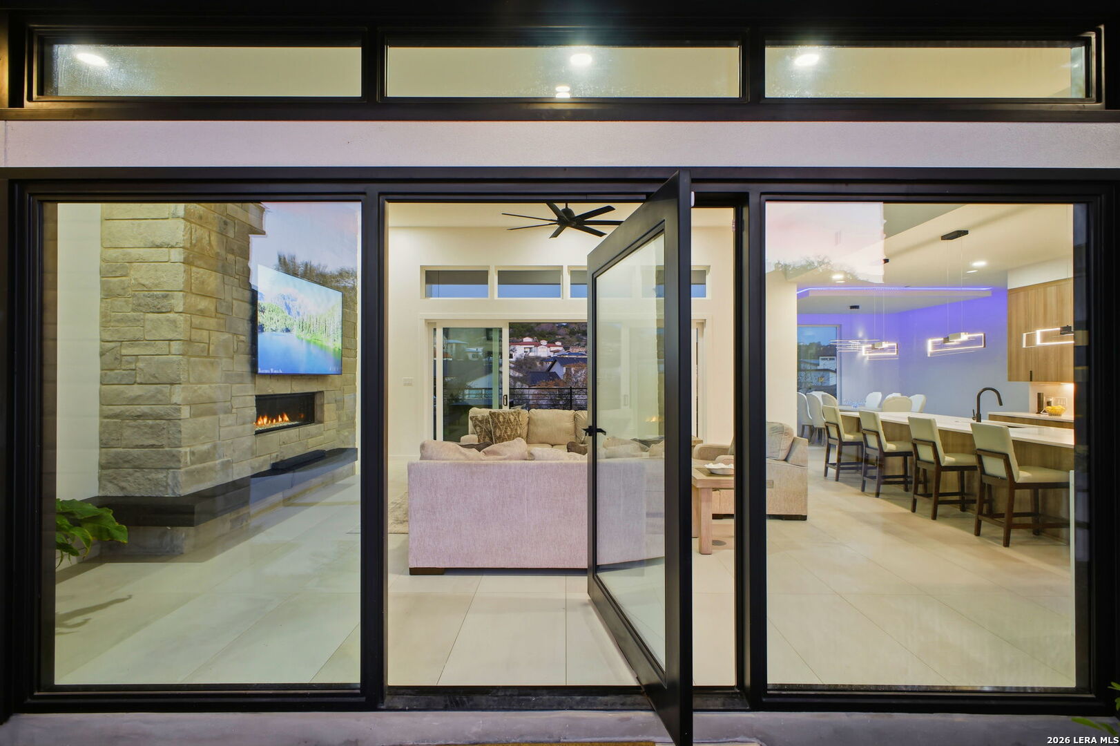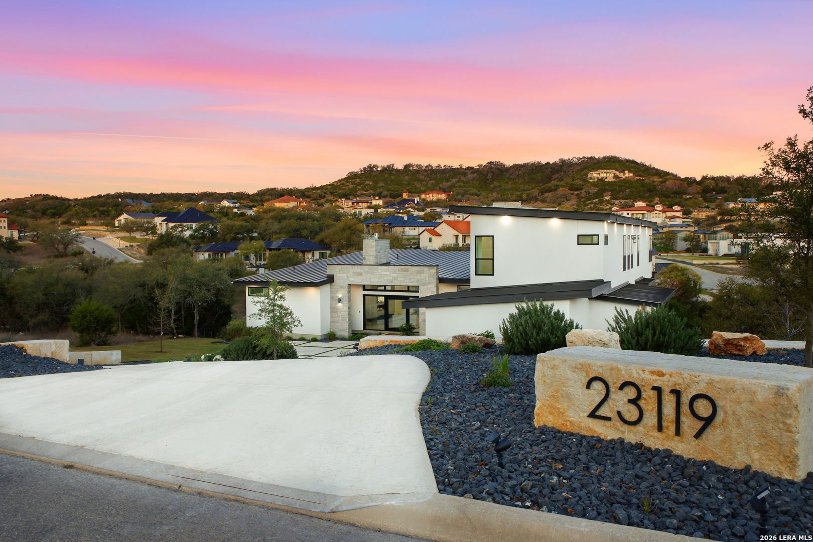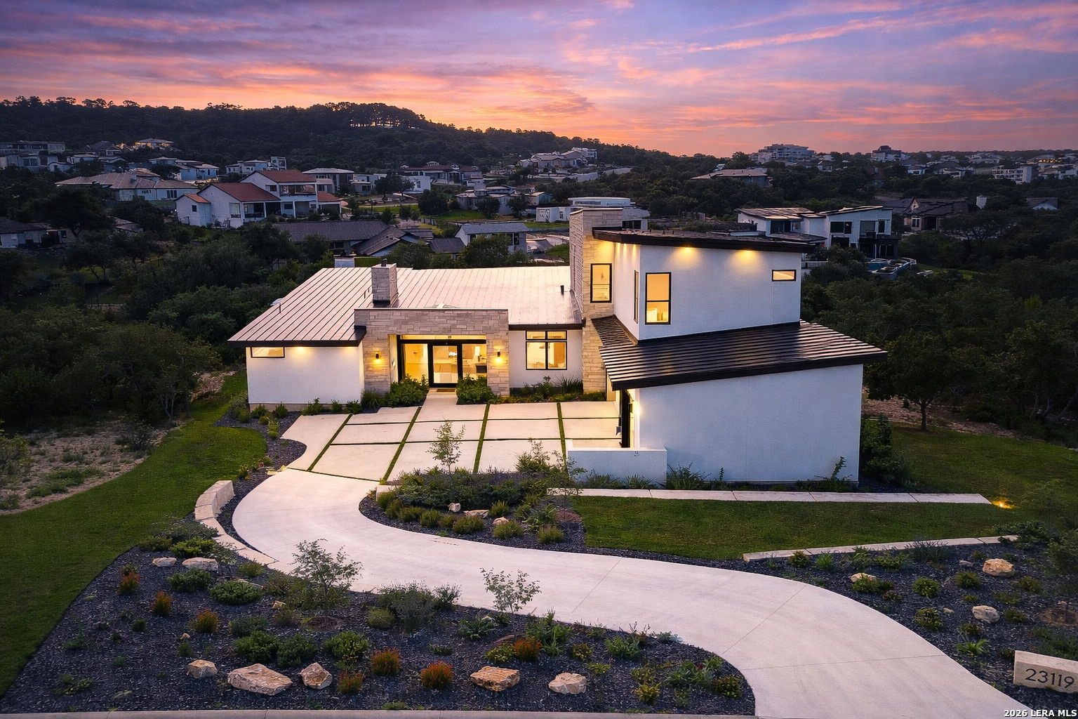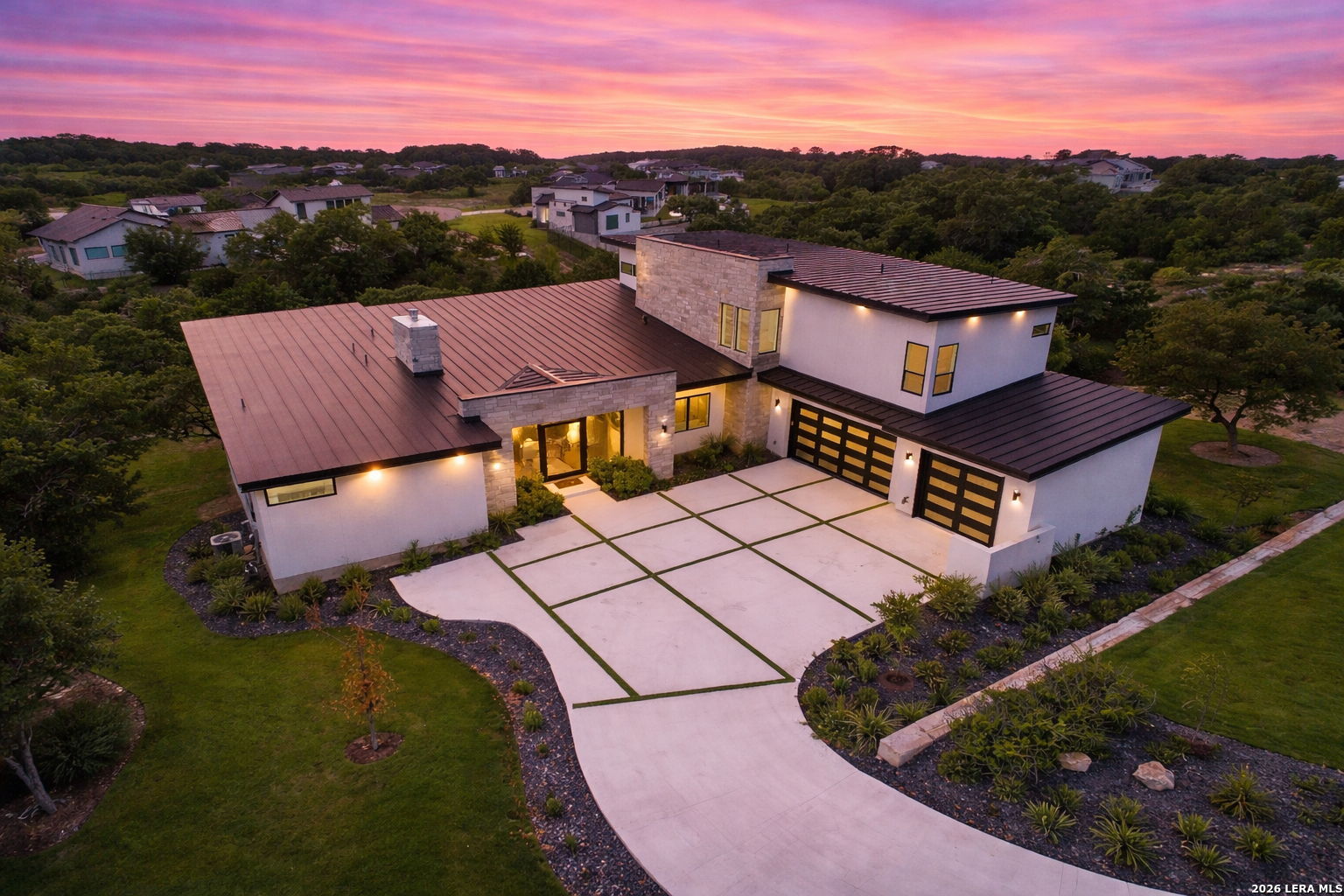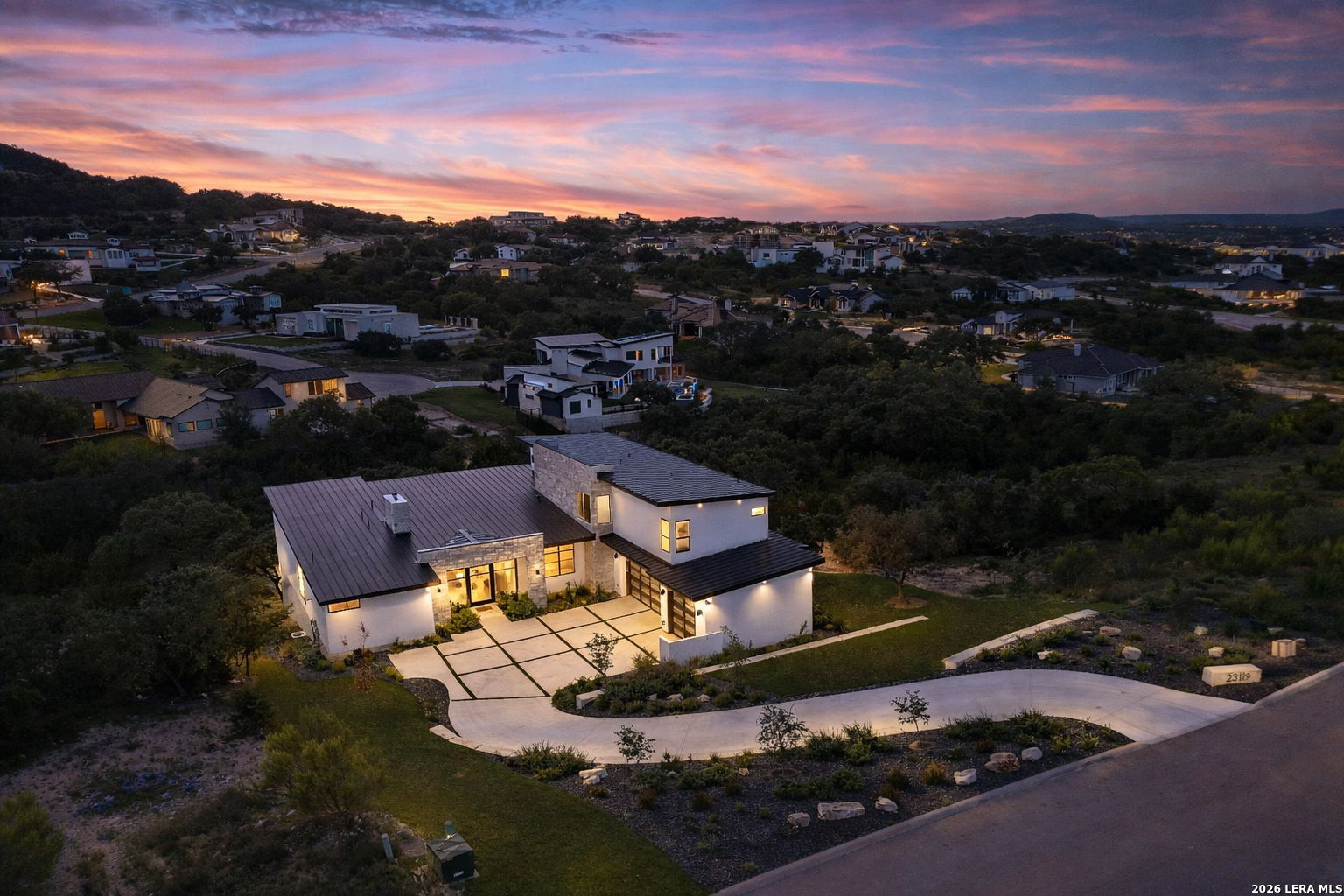 Welcome to the lap of luxury, a contemporary custom masterpiece nestled within the prestigious Canyons at Scenic Loop. Designed for those seeking elevated Hill Country living, this home blends architectural sophistication with breathtaking views of the natural surroundings. A striking 5-foot pivoting iron-and-glass door makes an unforgettable impression, opening into an expansive living space that seamlessly unites modern elegance with warm Hill Country textures. The open-concept design flows effortlessly between the living room, dining area, and state-of-the-art kitchen-offering the ideal setting for both everyday living and upscale entertaining. The modern living room serves as the home's centerpiece, showcasing a dramatic 12-foot-wide floor-to-ceiling stone fireplace framed by panoramic canyon and sunset views. Adjacent, the chef's kitchen features a stunning 14-foot waterfall quartz island, premium ZLINE appliances, and a specialty gas range-bringing culinary excellence to your fingertips. This thoughtfully designed floor plan features both the primary suite and a secondary bedroom with full bath on the main level-perfect for multigenerational living or hosting extended guests. Each bedroom offers resort-style comfort, while the spa-inspired bathrooms elevate relaxation with luxury finishes. Upstairs, the entertainment level awaits. A dedicated media room offers an immersive cinematic experience, while the spacious game room includes a stylish bar area-ideal for gatherings, celebrations, and game-day hosting. This home truly shines as both a retreat and an entertainer's dream. Custom touches are found throughout, including a rich walnut wine cellar that stands as a functional work of art, and a charming private study that provides the perfect space for reading, creativity, or remote work. The three-car garage boasts epoxy flooring and an electric vehicle charging connection, ensuring convenience with contemporary style. Step outside to discover your personal Hill Country sanctuary. The expansive covered patio features plush turf, a fully-equipped outdoor kitchen with leathered granite countertops, and a cozy fireplace-ideal for year-round alfresco living. Beyond, the backyard welcomes you with an inviting fire pit and lush foliage, creating a peaceful escape under the Texas sky. Hill Country living at its finest-where every detail inspires, and every moment feels like home.