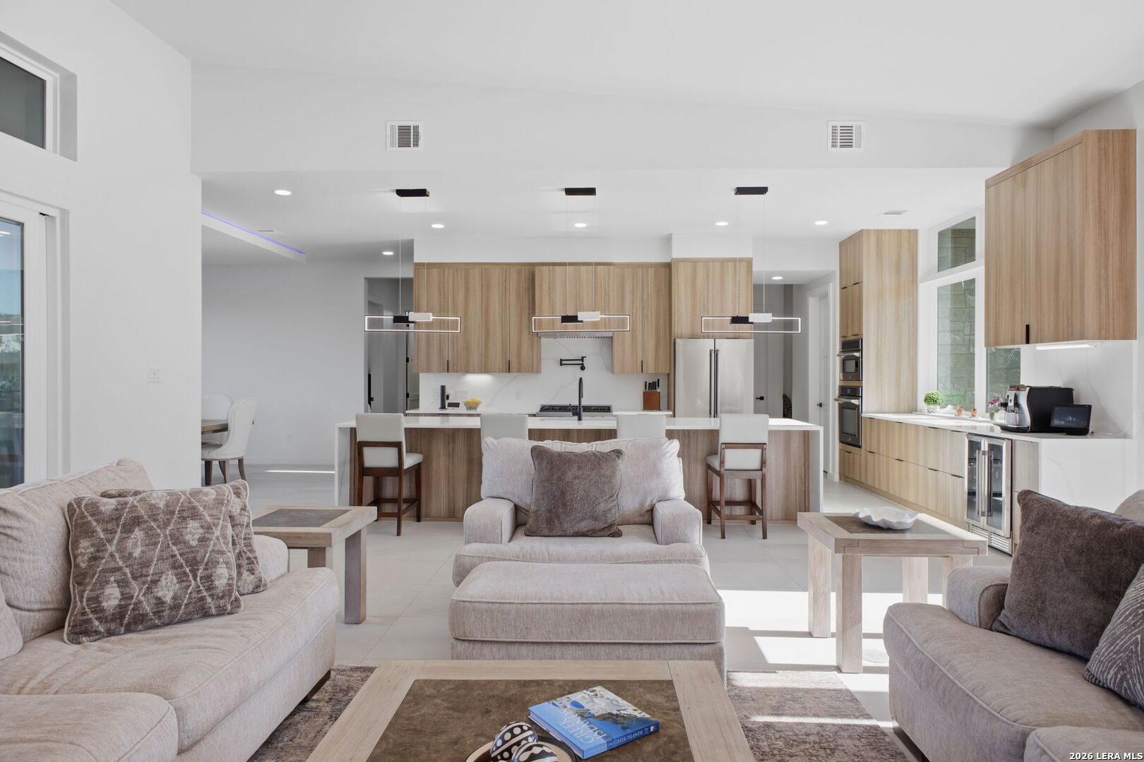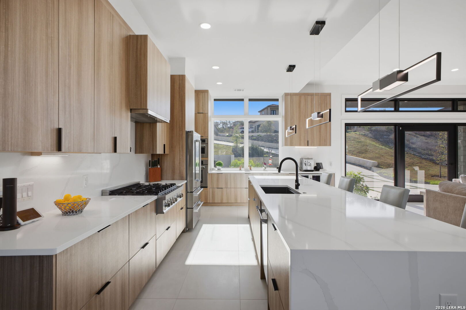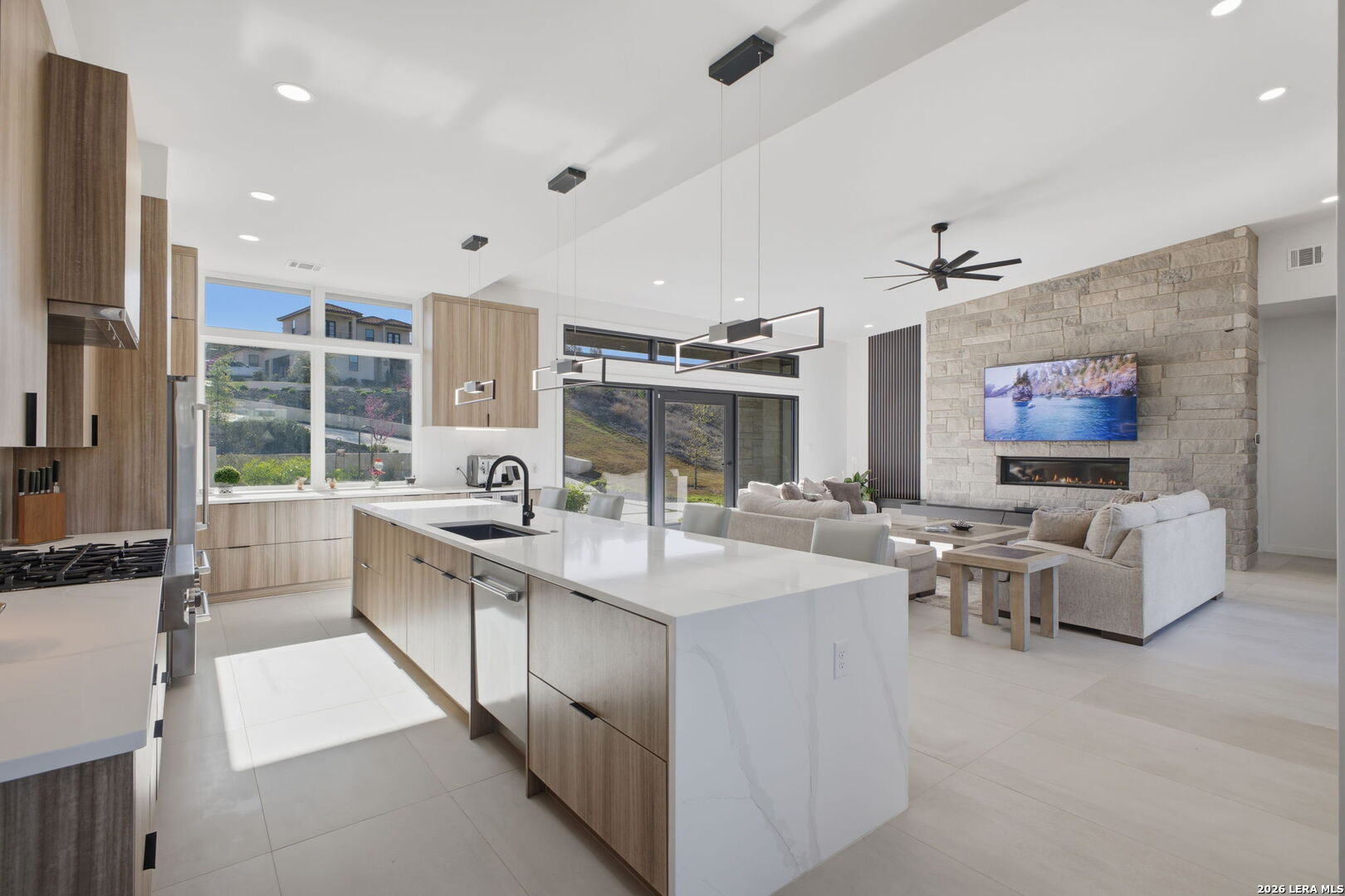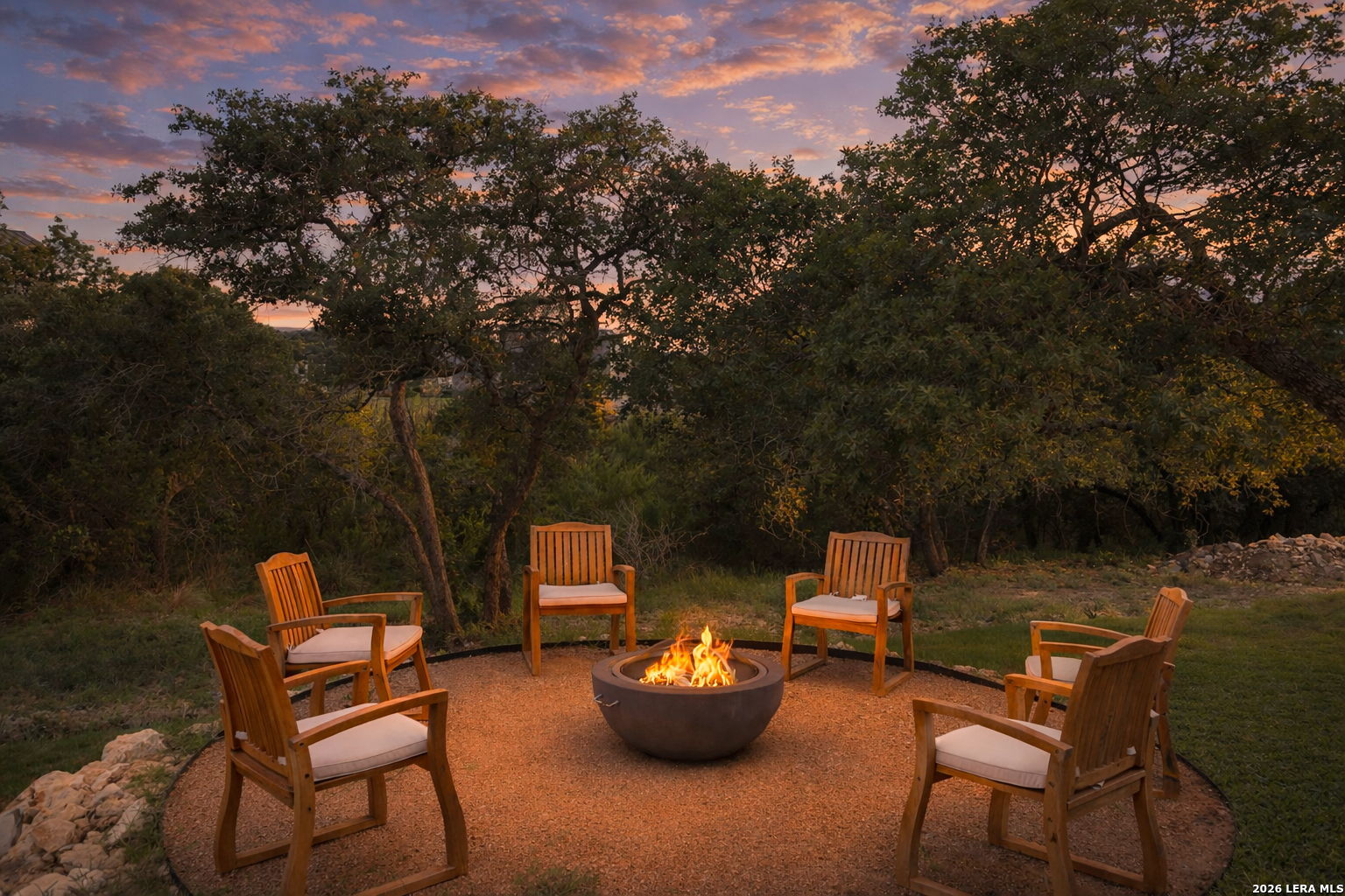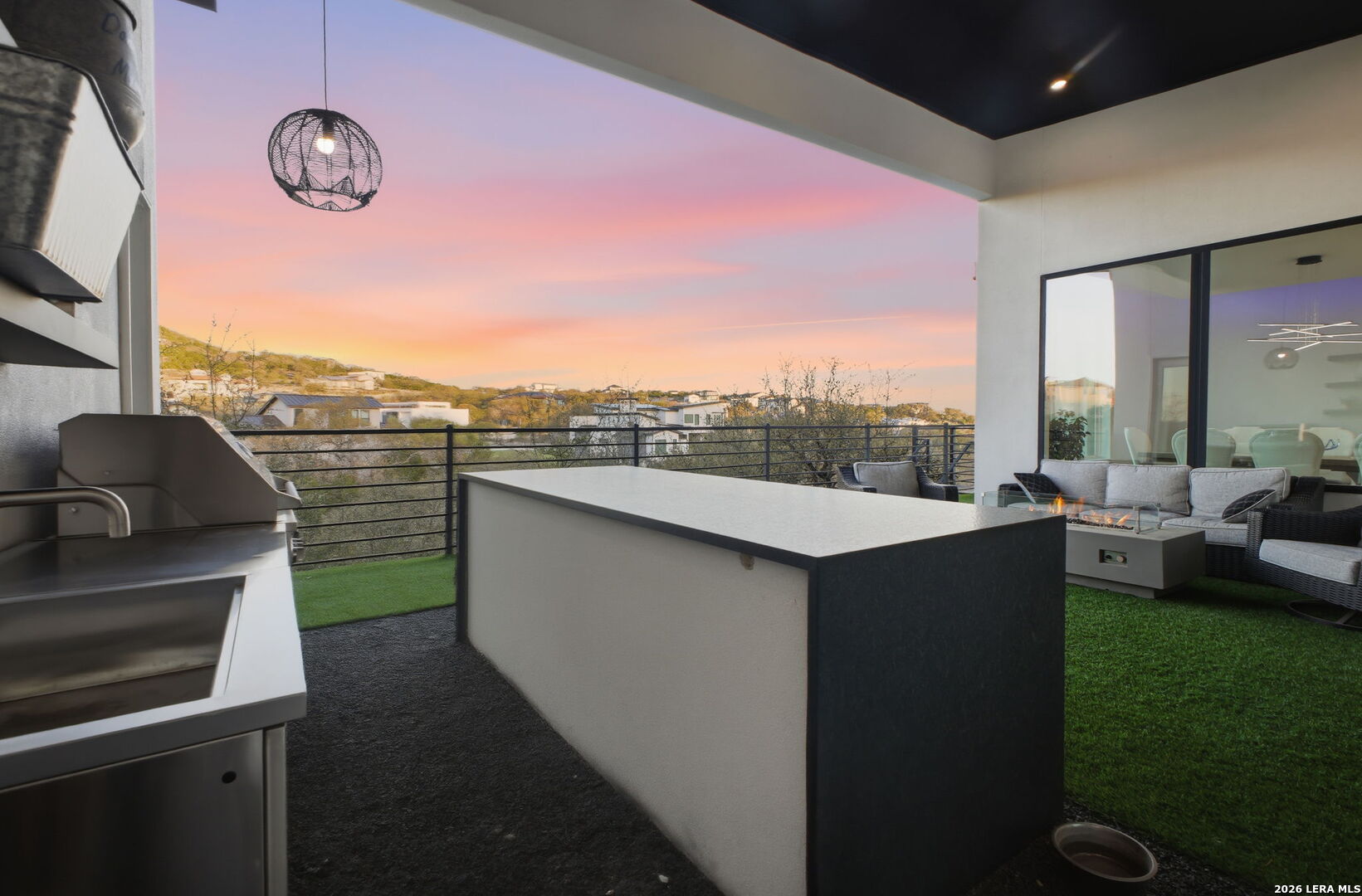 Welcome to the lap of luxury, a contemporary custom masterpiece nestled within the prestigious Canyons at Scenic Loop. Designed for those seeking elevated Hill Country living, this home blends architectural sophistication with breathtaking views of the natural surroundings. A striking 5-foot pivoting iron-and-glass door makes an unforgettable impression, opening into an expansive living space that seamlessly unites modern elegance with warm Hill Country textures. The open-concept design flows effortlessly between the living room, dining area, and state-of-the-art kitchen-offering the ideal setting for both everyday living and upscale entertaining. The modern living room serves as the home's centerpiece, showcasing a dramatic 12-foot-wide floor-to-ceiling stone fireplace framed by panoramic canyon and sunset views. Adjacent, the chef's kitchen features a stunning 14-foot waterfall quartz island, premium ZLINE appliances, and a specialty gas range-bringing culinary excellence to your fingertips. This thoughtfully designed floor plan features both the primary suite and a secondary bedroom with full bath on the main level-perfect for multigenerational living or hosting extended guests. Each bedroom offers resort-style comfort, while the spa-inspired bathrooms elevate relaxation with luxury finishes. Upstairs, the entertainment level awaits. A dedicated media room offers an immersive cinematic experience, while the spacious game room includes a stylish bar area-ideal for gatherings, celebrations, and game-day hosting. This home truly shines as both a retreat and an entertainer's dream. Custom touches are found throughout, including a rich walnut wine cellar that stands as a functional work of art, and a charming private study that provides the perfect space for reading, creativity, or remote work. The three-car garage boasts epoxy flooring and an electric vehicle charging connection, ensuring convenience with contemporary style. Step outside to discover your personal Hill Country sanctuary. The expansive covered patio features plush turf, a fully-equipped outdoor kitchen with leathered granite countertops, and a cozy fireplace-ideal for year-round alfresco living. Beyond, the backyard welcomes you with an inviting fire pit and lush foliage, creating a peaceful escape under the Texas sky. Hill Country living at its finest-where every detail inspires, and every moment feels like home.