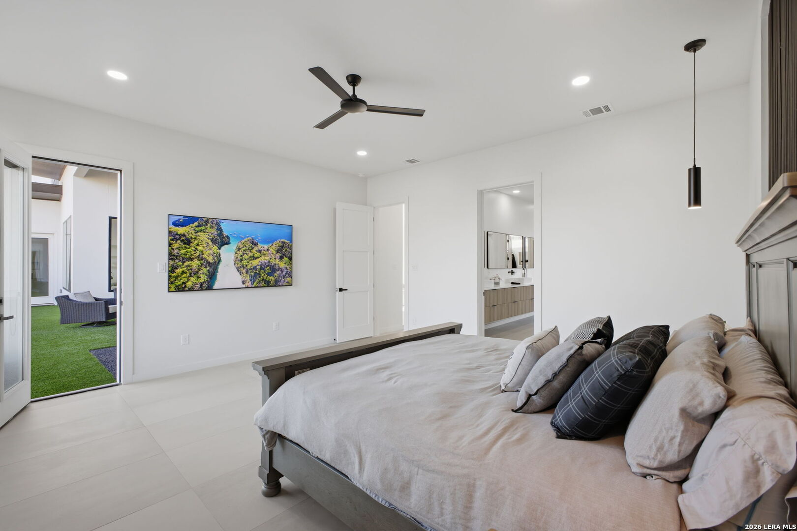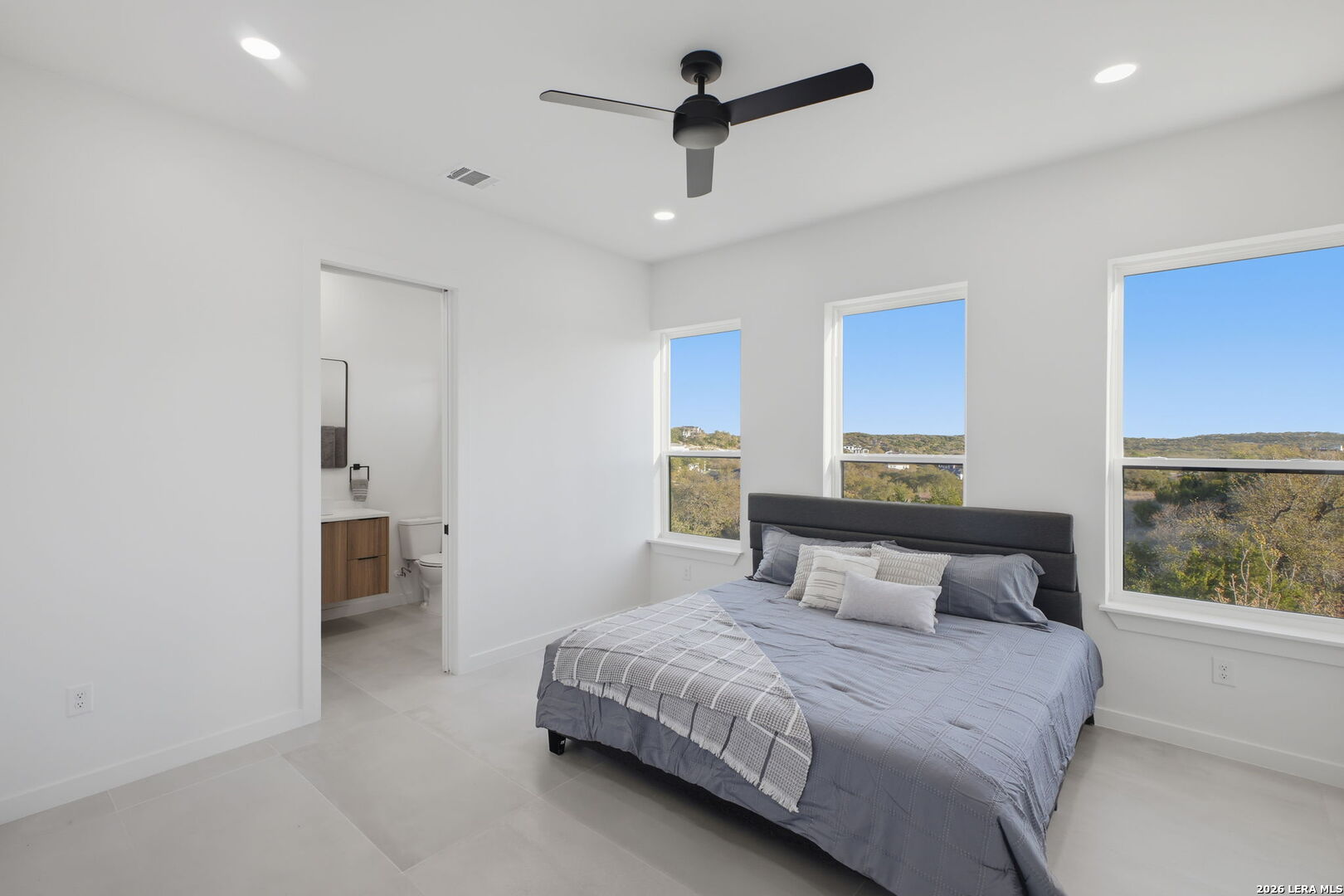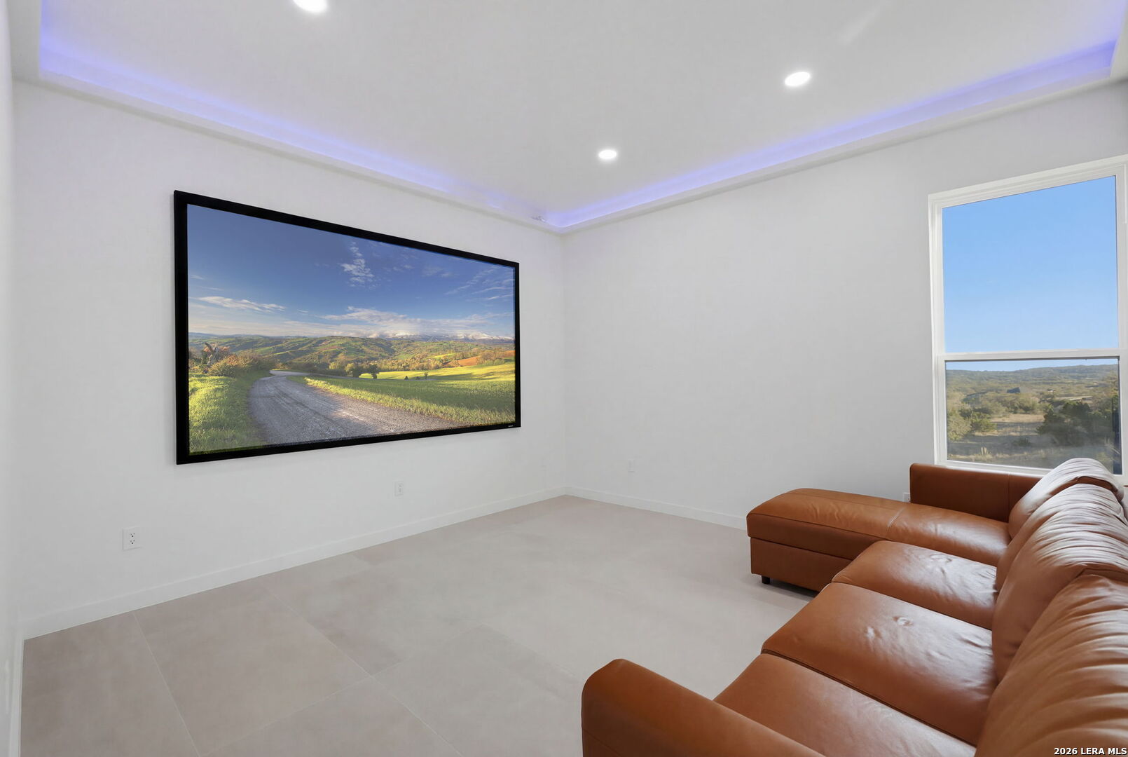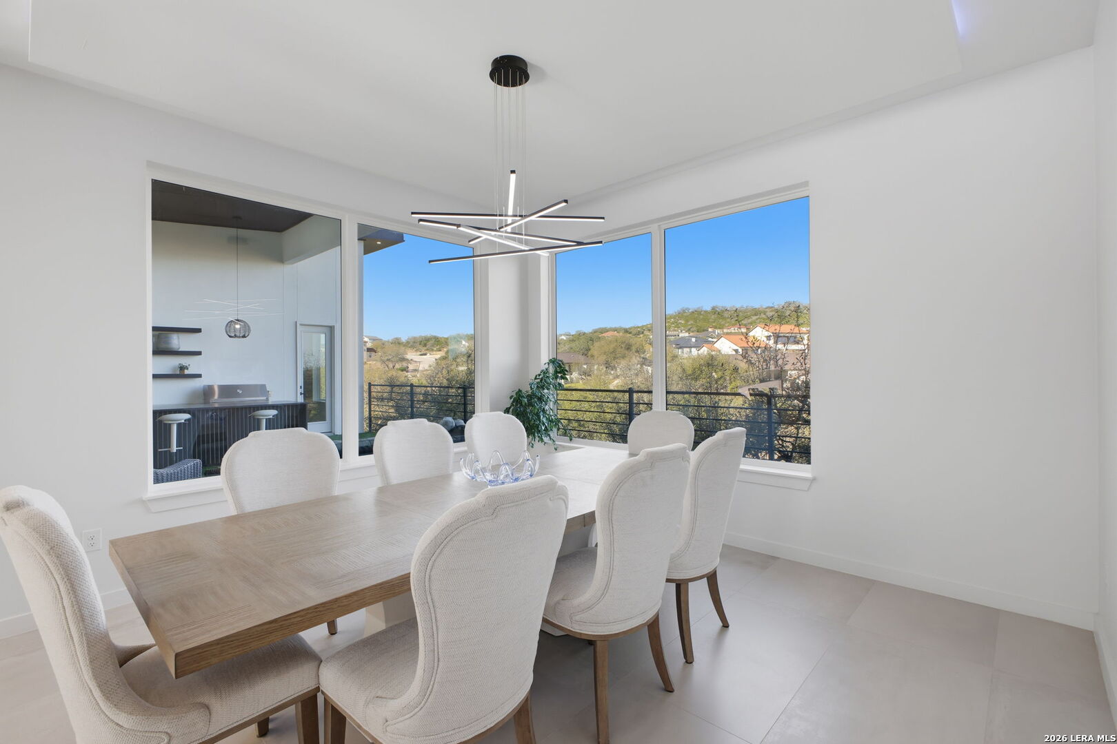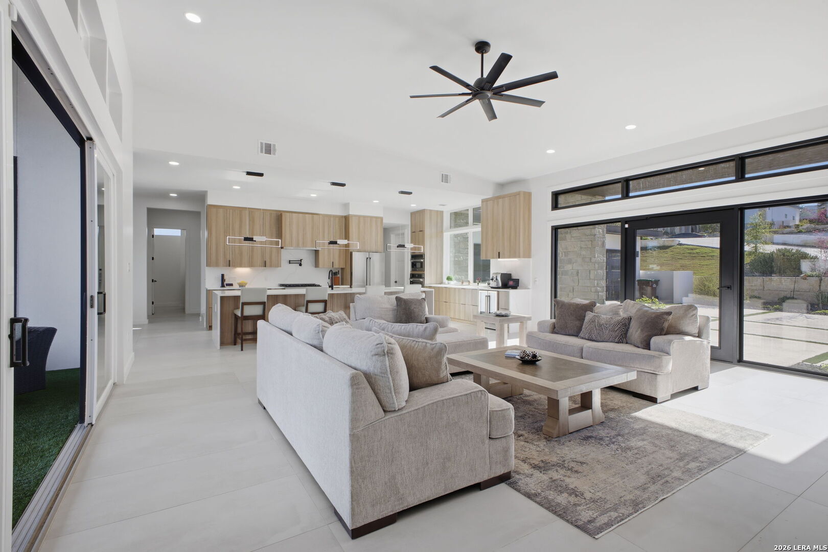 Welcome to the lap of luxury, a contemporary custom masterpiece nestled within the prestigious Canyons at Scenic Loop. Designed for those seeking elevated Hill Country living, this home blends architectural sophistication with breathtaking views of the natural surroundings. A striking 5-foot pivoting iron-and-glass door makes an unforgettable impression, opening into an expansive living space that seamlessly unites modern elegance with warm Hill Country textures. The open-concept design flows effortlessly between the living room, dining area, and state-of-the-art kitchen-offering the ideal setting for both everyday living and upscale entertaining. The modern living room serves as the home's centerpiece, showcasing a dramatic 12-foot-wide floor-to-ceiling stone fireplace framed by panoramic canyon and sunset views. Adjacent, the chef's kitchen features a stunning 14-foot waterfall quartz island, premium ZLINE appliances, and a specialty gas range-bringing culinary excellence to your fingertips. This thoughtfully designed floor plan features both the primary suite and a secondary bedroom with full bath on the main level-perfect for multigenerational living or hosting extended guests. Each bedroom offers resort-style comfort, while the spa-inspired bathrooms elevate relaxation with luxury finishes. Upstairs, the entertainment level awaits. A dedicated media room offers an immersive cinematic experience, while the spacious game room includes a stylish bar area-ideal for gatherings, celebrations, and game-day hosting. This home truly shines as both a retreat and an entertainer's dream. Custom touches are found throughout, including a rich walnut wine cellar that stands as a functional work of art, and a charming private study that provides the perfect space for reading, creativity, or remote work. The three-car garage boasts epoxy flooring and an electric vehicle charging connection, ensuring convenience with contemporary style. Step outside to discover your personal Hill Country sanctuary. The expansive covered patio features plush turf, a fully-equipped outdoor kitchen with leathered granite countertops, and a cozy fireplace-ideal for year-round alfresco living. Beyond, the backyard welcomes you with an inviting fire pit and lush foliage, creating a peaceful escape under the Texas sky. Hill Country living at its finest-where every detail inspires, and every moment feels like home.