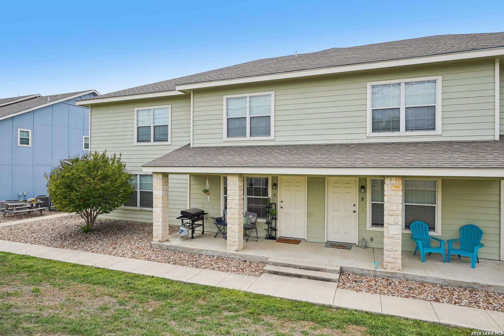 Well-maintained two-story attached townhome offering approximately 1,088 SF with two bedrooms and two bathrooms in a desirable Kerrville location. The open-concept main level features comfortable living, kitchen, and dining spaces with tile flooring, granite countertops, and neutral finishes. A full appliance package conveys including refrigerator, range, built-in microwave, dishwasher, washer, and dryer. The primary suite includes a private bath with dual vanity sinks, while the second bedroom also features its own full bathroom. Exterior features include a covered front porch, rock-veneered columns, HardiBoard siding, composite roof, xeriscaped landscaping, and a one-car attached garage. HOA covers trash, water, sewer, and lawn maintenance for easy living. Conveniently located near parks, walking trails, and the Olympic pool and just minutes from Tom Daniels Elementary School, Hal Peterson Middle School, and Tivy High School. Currently tenant occupied, offering flexibility for investors or future owner-occupants.