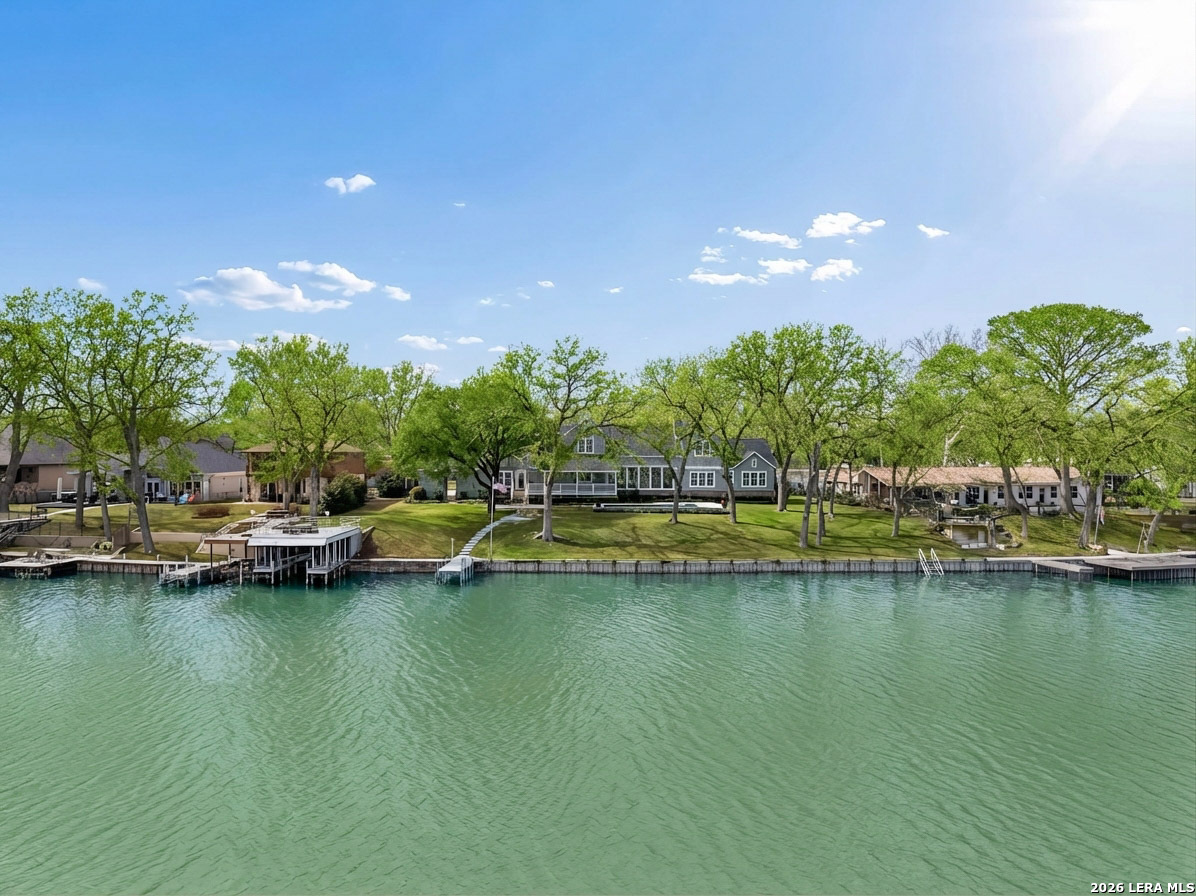 The wait is over-Lake McQueeney's new dam is complete, the lake is rising, and families are preparing to enjoy a full season of boating, swimming, and waterfront living once again. With six private suites, this waterfront property delivers the space, shoreline, and setup for unforgettable lake weekends from day one. The waterfront steals the show. 202 feet of east facing Lake McQueeney shoreline stretch across 1.23 beautifully maintained acres, creating wide, uninterrupted water views and room to truly spread out. The concrete dock with boat lift and upper deck is built for full lake days. Concrete steps lead straight to the shoreline, while an additional dock and expansive outdoor areas keep the action moving from swimming and fishing to tying up after a cruise. The backyard was designed for full-blown lake days. A private in-ground pool, sprawling decks, and multiple outdoor hangout zones create the perfect hang out spot. Inside, the home keeps the water in view. The main living area features vaulted ceilings with exposed beams, oversized windows, and a dramatic reclaimed-stone fireplace, filling the space with natural light and lake scenery. A built-in wet bar makes hosting effortless when everyone rolls in from the dock. The chef's kitchen rises to the occasion with marble countertops, oversized island with prep sink, custom cabinetry, double dishwashers, and a five-burner gas cooktop-ready for everything from quick lake breakfasts to big gathering dinners. Lake McQueeney is making its comeback. This property is ready to make the most of it.