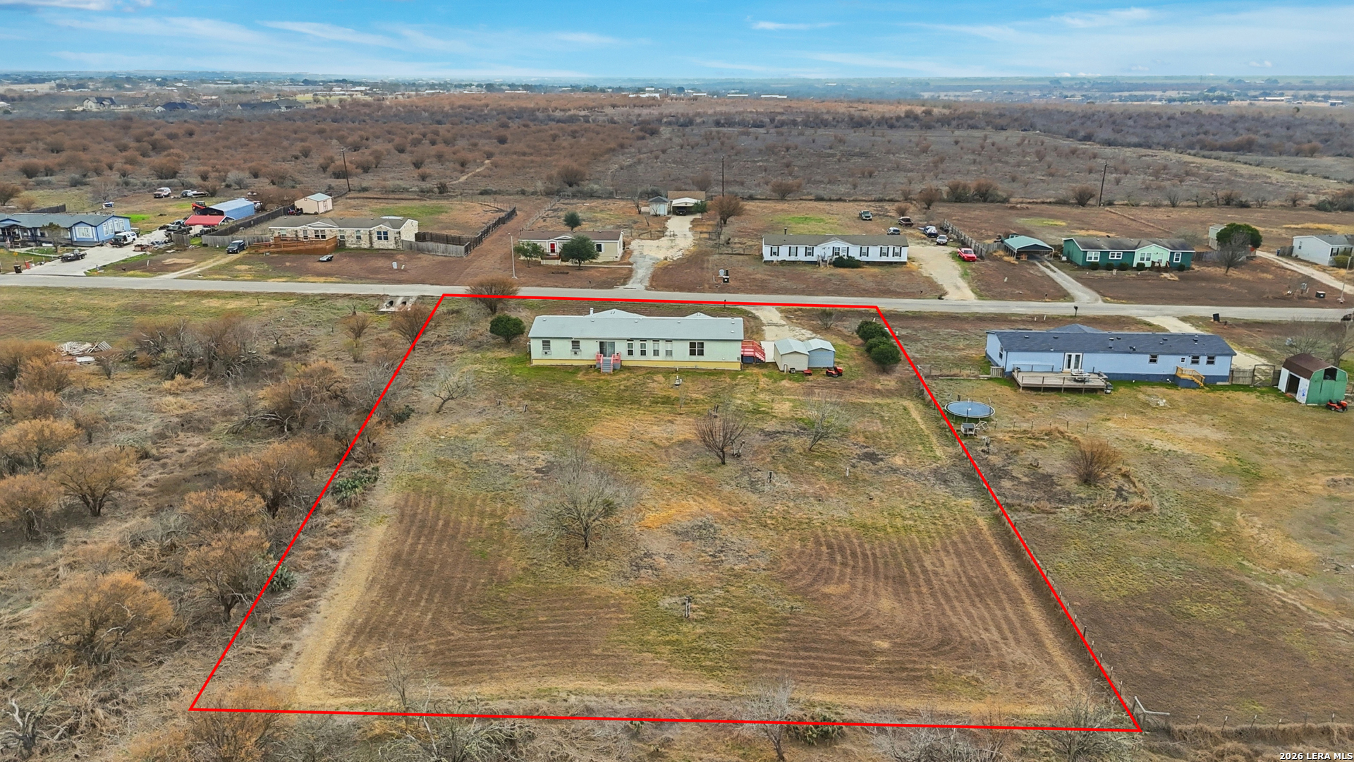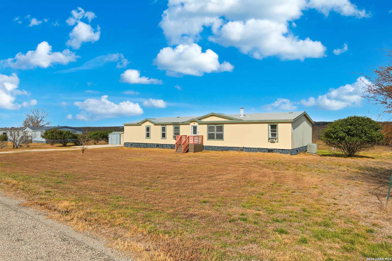 Discover a peaceful Texas country living in Marion TX with this double wide manufactured home set on a spacious one acre lot and surrounded by scenic views. With no back neighbors, the property offers privacy, open skies, and a true rural retreat atmosphere while remaining conveniently located. Inside, you will find two generous living areas designed for flexibility and comfort. The main living space features a cozy wood burning fireplace, creating a warm focal point for gatherings or quiet evenings at home. The layout flows easily into the kitchen, which includes a center kitchen island and breakfast bar, providing ample prep space and casual dining options. Plenty of cabinetry enhances both function and storage. The primary suite offers a relaxing escape with multiple closets for excellent storage. The en suite bath is designed for comfort with double vanities, a jetted bathtub, and a separate shower. Outdoors, the expansive acre lot provides room to spread out, garden, entertain, or simply enjoy the peaceful surroundings. Two storage sheds add practical space for tools, hobbies, or equipment. The country setting delivers beautiful views and added privacy while still offering a short commute to Randolph Air Force Base and convenient access to nearby Live Oak TX and New Braunfels TX for shopping, dining, and entertainment.