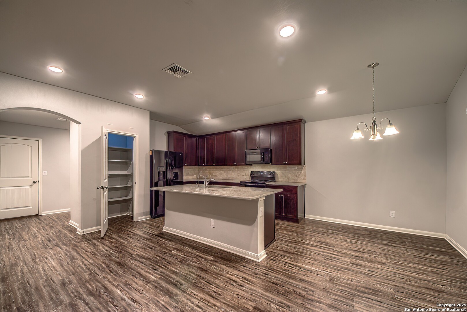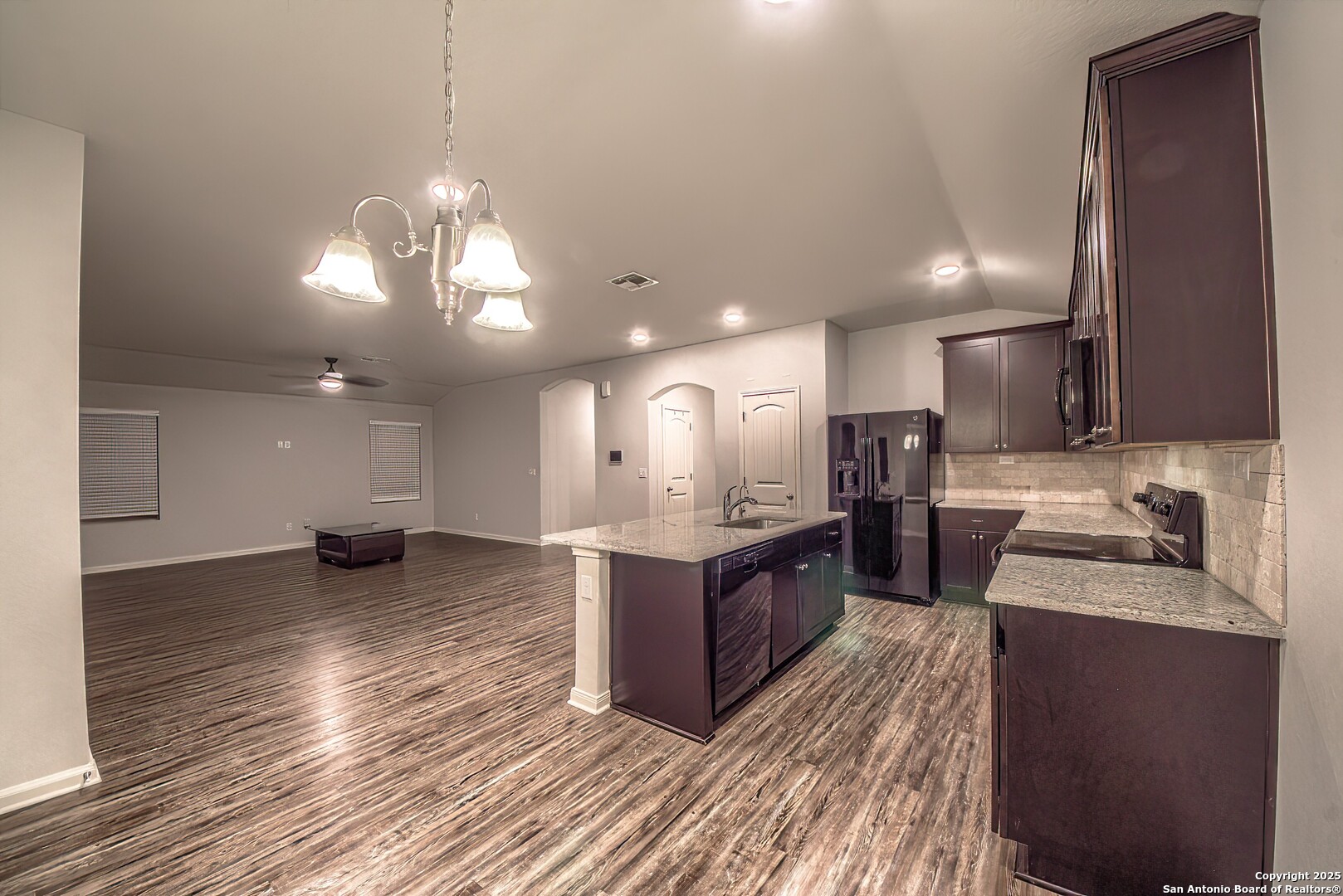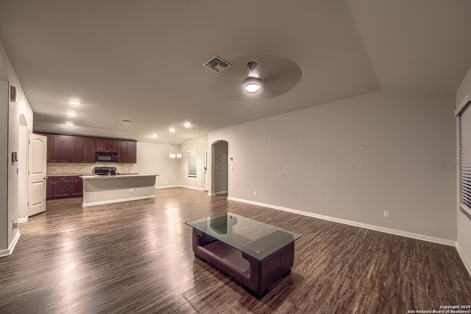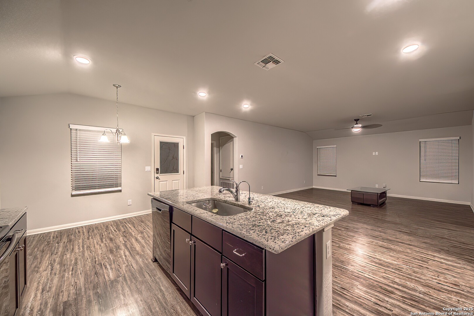 Welcome to this charming 3 bedroom, 2 bath single-story home built in 2019, offering a clean modern interior and excellent curb appeal. The exterior features a beautiful combination of stone and board-and-batten siding, a welcoming front porch, and an extended driveway leading to a spacious two-car garage. Inside, you'll find a long, elegant entry hallway with arched openings, upgraded wood-look flooring, and a bright open layout. The large living area flows seamlessly into the dining space and kitchen, complete with rich wood cabinetry, granite countertops, tile backsplash, and a generously sized island-perfect for everyday living and entertaining. All three bedrooms offer comfortable space and modern ceiling fans, while the primary suite (not pictured but assumed) provides privacy in this smart split-bedroom floor-plan. Secondary bath is well-kept and move-in ready. Situated in a newer community, this home delivers the benefits of modern construction, energy-efficient features, and a layout designed for today's lifestyle. Move-in ready and easy to love!
