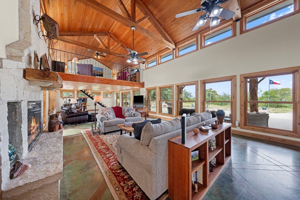 Discover a unique and private retreat nestled on 27.11 acres of pristine, unrestricted, and ag-exempt land. This stunning property offers a rare combination of luxurious living and the untamed beauty of the Texas Hill Country. The residence, set down a winding driveway, allows the surrounding grounds to provide a secluded sanctuary for those seeking tranquility, space, and a connection to nature. Step through the one-of-a-kind custom double front doors into this custom-designed home and be captivated by its bespoke features. The meticulously designed residence includes a great room with a 22-foot ceiling with exposed beams, creating a subtle lodge atmosphere. The open-concept living area is anchored by a magnificent floor-to-ceiling stone fireplace, complete with a custom spalted pecan mantel. A ceramic gas log set adds to the warm and inviting ambiance for gatherings. The heart of the home is a chef's dream, boasting a gourmet kitchen equipped with commercial-grade appliances, ensuring every culinary endeavor is a delight. The home is designed so that you have stunning long-range views from every single window. Wake up to panoramic vistas of rolling hills and watch the vibrant sunrises and sunsets that paint the sky. The seamless integration of the home with its natural surroundings provides a constant sense of peace and wonder. The 27.11 acres are completely fenced and cross fenced with multiple gates offering a secure and private environment. A new, custom main entry gate provides both convenience and peace of mind. The entire property is usable land, making it perfect for a variety of uses, from recreational activities to agricultural pursuits. Nature enthusiasts will be thrilled to know that the land is a haven for exotics, including Axis and white-tail deer, as well as an abundance of turkey and dove and many beautiful songbirds. This creates a unique opportunity for wildlife observation and hunting. The property also includes a 250-gallon propane tank plus a 500-gallon propane tank for added convenience. Beyond the main residence, the property offers exceptional outbuilding(s) designed to accommodate every need. A 31' x 26' detached two-car garage with additional 19'x7' work space provides secure parking, while a spacious 30'x50' insulated metal building with a 25'x50' side awning offers endless possibilities for workshops, storage, or housing a collection of vehicles and equipment. This property is more than a home; it's a lifestyle. With its unparalleled features, stunning views, abundant wildlife, and unrestricted land, this is a rare opportunity to own a true piece of the Texas Hill Country. Don't miss your chance to experience this one-of-a-kind estate.
