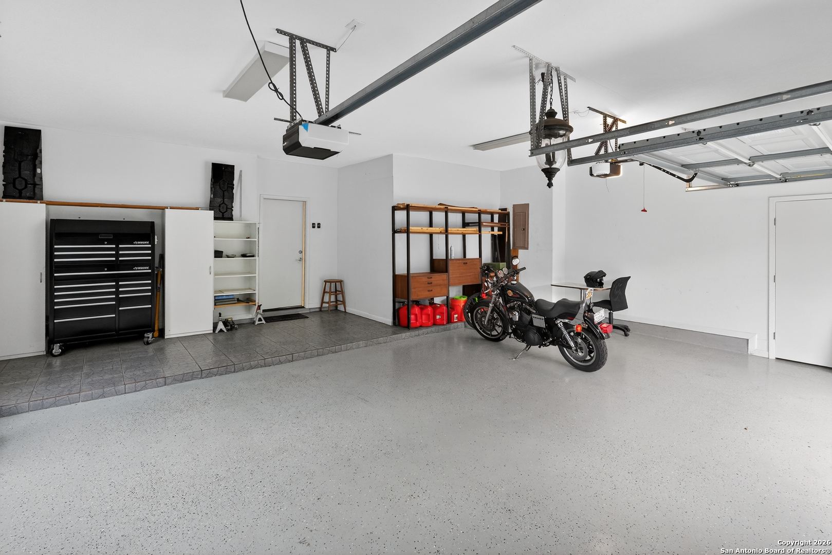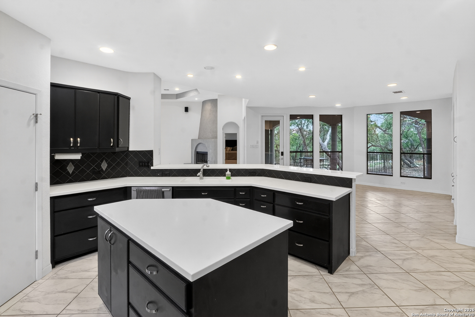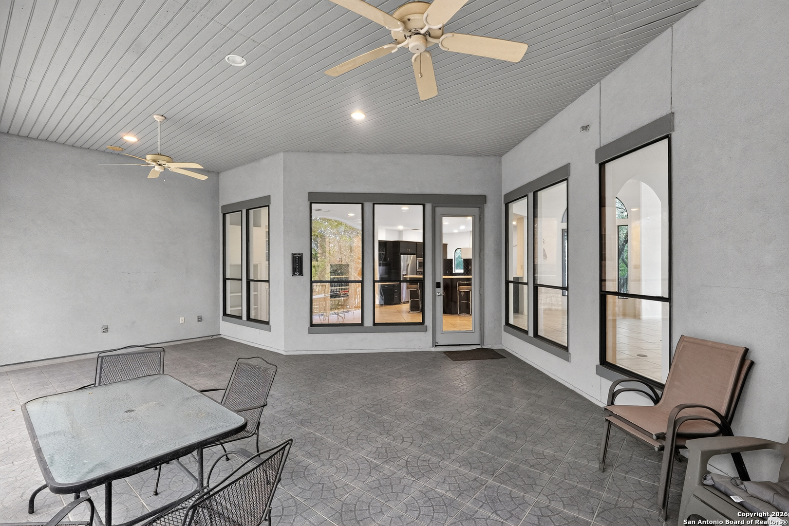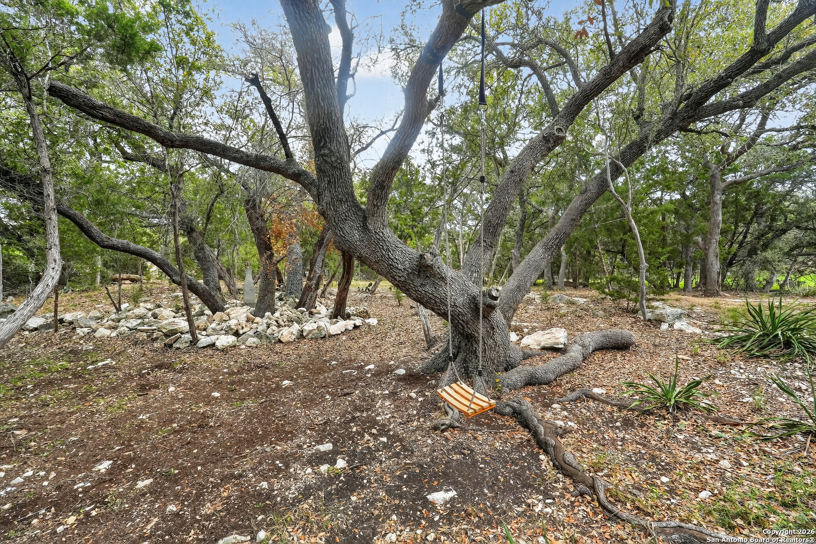 A beautiful one story home nestled in the exclusive gated community of Fossil Ridge in Cibolo Canyons. Conveniently located off 281 and TPC, a short drive from shopping and dining, and just down the street from Johnson High School. This beautiful custom home sits on a 1.29 acre lot surrounded by mature trees and natural landscaping, offering privacy and shade. Private entryway patio offers a built in gas grill, wet bar, and kitchen space. High ceilings are featured throughout the home. The living room features surround sound speaker hookups, views of the covered outdoor patio, and a gas fireplace. The modern kitchen features plenty of storage and cabinet space, dry bar area, an island with built in storage, stacked oven and microwave appliances, custom designed vent hood over the gas range, and spacious bar seating. Luxurious counter tops throughout the kitchen. The dining area features custom built in storage/buffet and views of the gorgeous back yard and covered patio. The Primary Bedroom features views of the backyard with a very spacious Primary bathroom, complete with his and hers vanities, soaker tub, walk-in steamer shower, and balcony access. The newly updated walk-in shower is generously sized and offers built in storage. The walk in closets features plenty of custom modern built in storage to effortlessly organize and store items. The large laundry area hosts storage and a utility sink easily making this a utility or storage area. The second bedroom is not only spacious and welcoming of natural light, it boasts custom built in storage and entertainment center. This room is joined with a Jack & Jill restroom to the third bedroom. The third bedroom is very spacious and has a large closet. The Jack and Jill is a full bath with tub and shower combo, toilet room separate, complete with plenty of storage within the vanity and a separate linen storage. Bath has updated removable shower head. This home features a port for pest control injection treatment, outdoor speakers, and boasts a roomy outdoor covered patio with fans. The backyard highlights the natural landscape with a fire pit area and endless possibilities for entertaining or enjoying quiet time secluded in the scenery. The two-car garage hosts plenty of workshop space with an accent flooring. On the private driveway there is space to park multiple vehicles. Make this exclusive and luxurious home yours today!