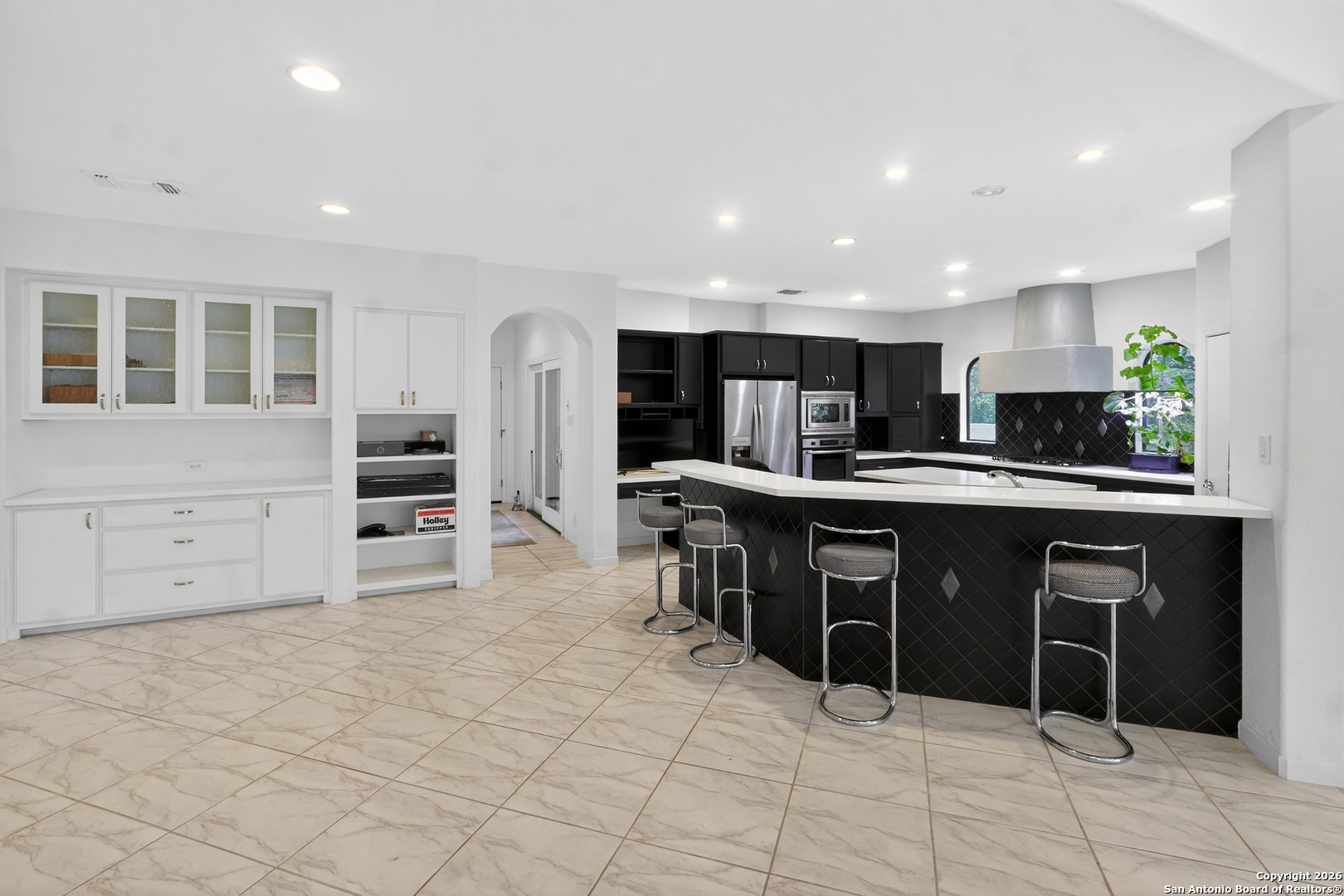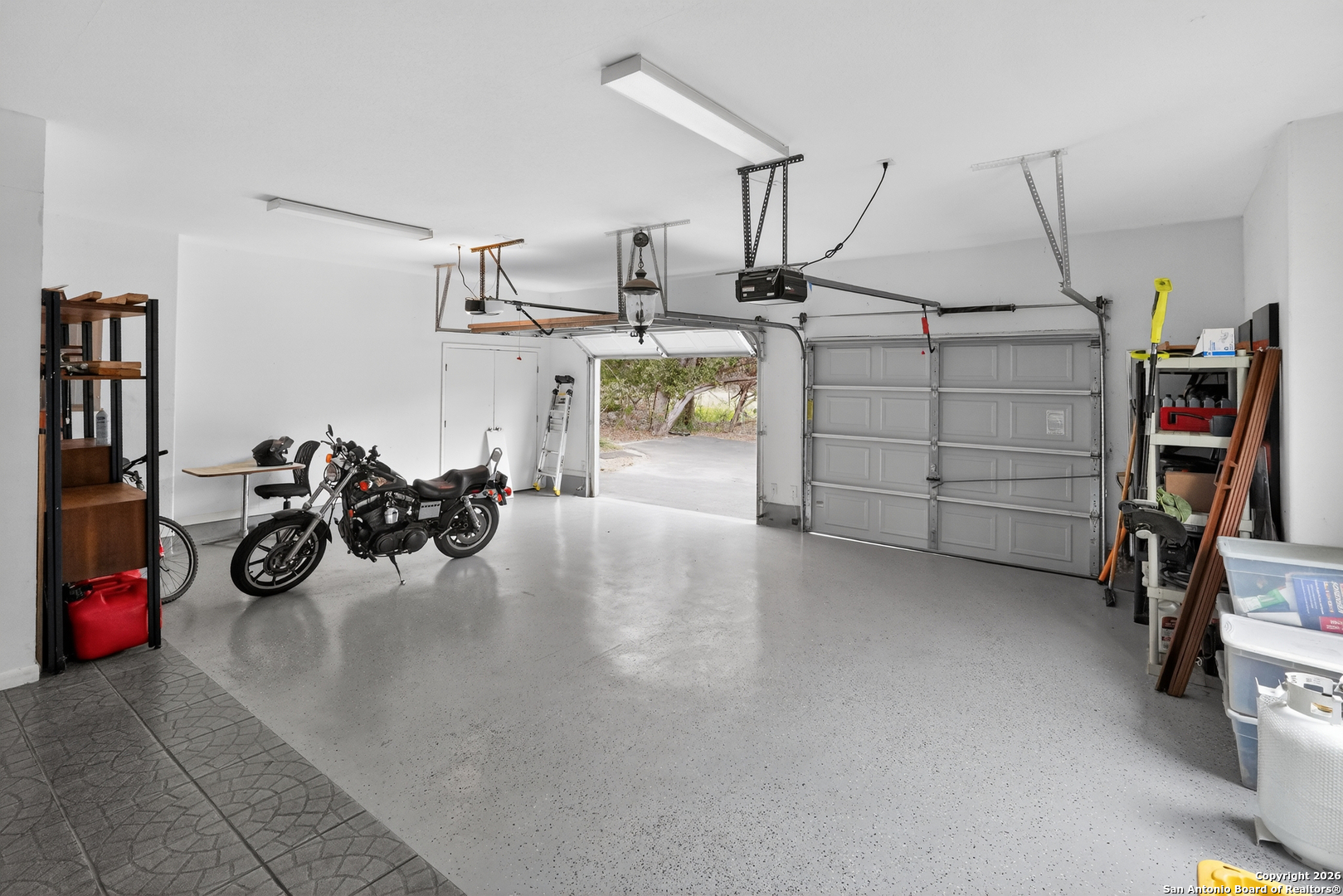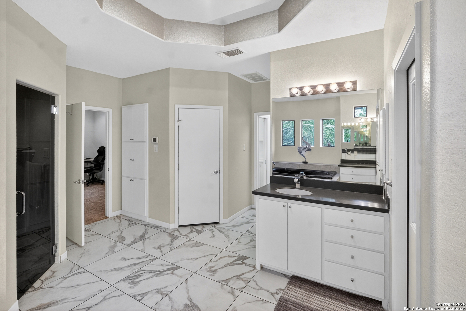 A beautiful one story home nestled in the exclusive gated community of Fossil Ridge in Cibolo Canyons. Conveniently located off 281 and TPC, a short drive from shopping and dining, and just down the street from Johnson High School. This beautiful custom home sits on a 1.29 acre lot surrounded by mature trees and natural landscaping, offering privacy and shade. Private entryway patio offers a built in gas grill, wet bar, and kitchen space. High ceilings are featured throughout the home. The living room features surround sound speaker hookups, views of the covered outdoor patio, and a gas fireplace. The modern kitchen features plenty of storage and cabinet space, dry bar area, an island with built in storage, stacked oven and microwave appliances, custom designed vent hood over the gas range, and spacious bar seating. Luxurious counter tops throughout the kitchen. The dining area features custom built in storage/buffet and views of the gorgeous back yard and covered patio. The Primary Bedroom features views of the backyard with a very spacious Primary bathroom, complete with his and hers vanities, soaker tub, walk-in steamer shower, and balcony access. The newly updated walk-in shower is generously sized and offers built in storage. The walk in closets features plenty of custom modern built in storage to effortlessly organize and store items. The large laundry area hosts storage and a utility sink easily making this a utility or storage area. The second bedroom is not only spacious and welcoming of natural light, it boasts custom built in storage and entertainment center. This room is joined with a Jack & Jill restroom to the third bedroom. The third bedroom is very spacious and has a large closet. The Jack and Jill is a full bath with tub and shower combo, toilet room separate, complete with plenty of storage within the vanity and a separate linen storage. Bath has updated removable shower head. This home features a port for pest control injection treatment, outdoor speakers, and boasts a roomy outdoor covered patio with fans. The backyard highlights the natural landscape with a fire pit area and endless possibilities for entertaining or enjoying quiet time secluded in the scenery. The two-car garage hosts plenty of workshop space with an accent flooring. On the private driveway there is space to park multiple vehicles. Make this exclusive and luxurious home yours today!