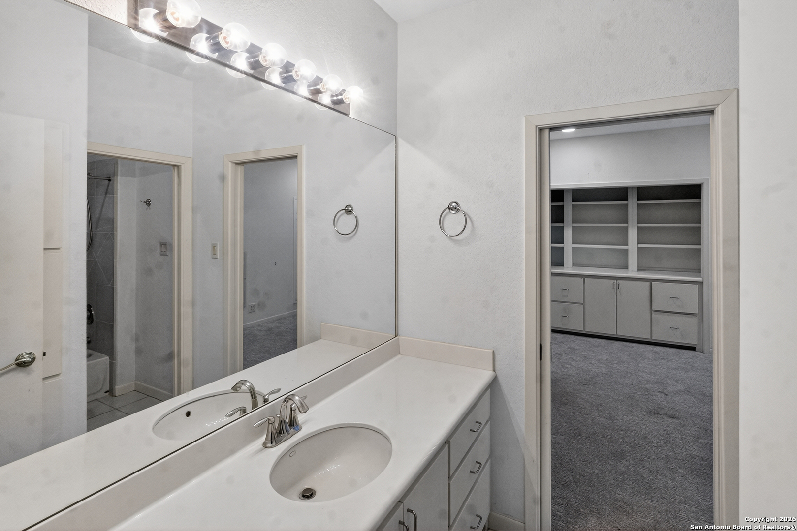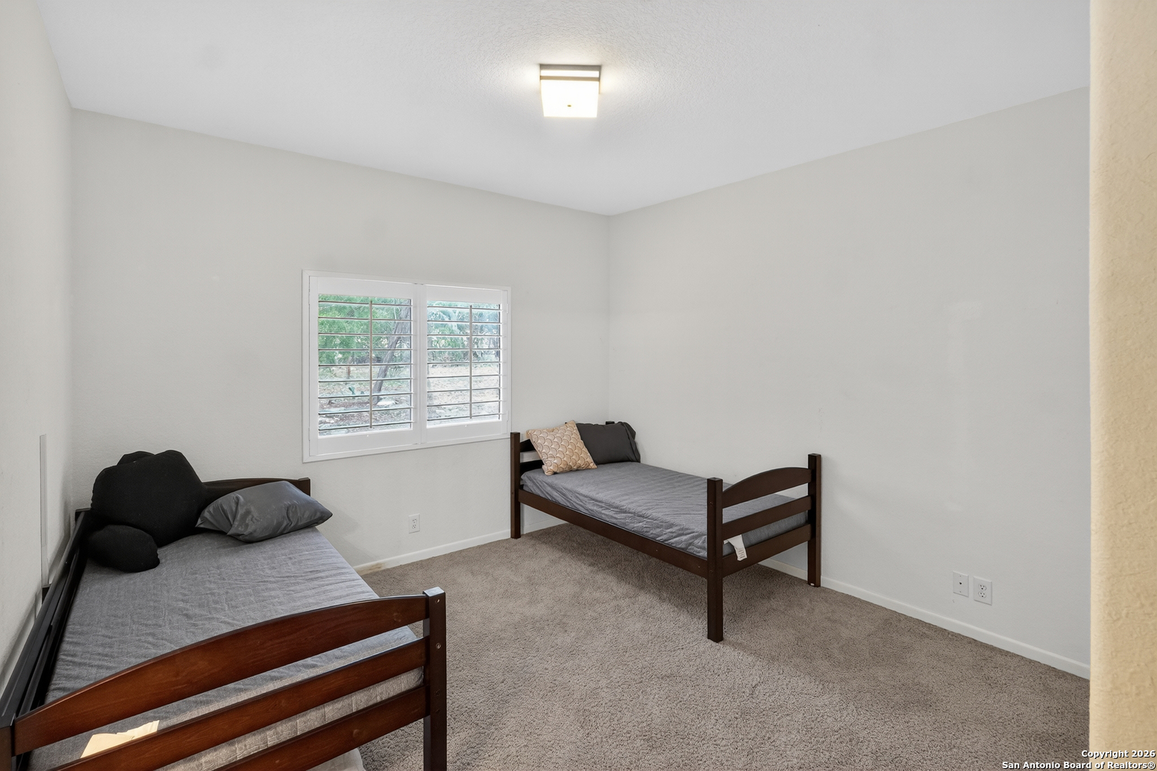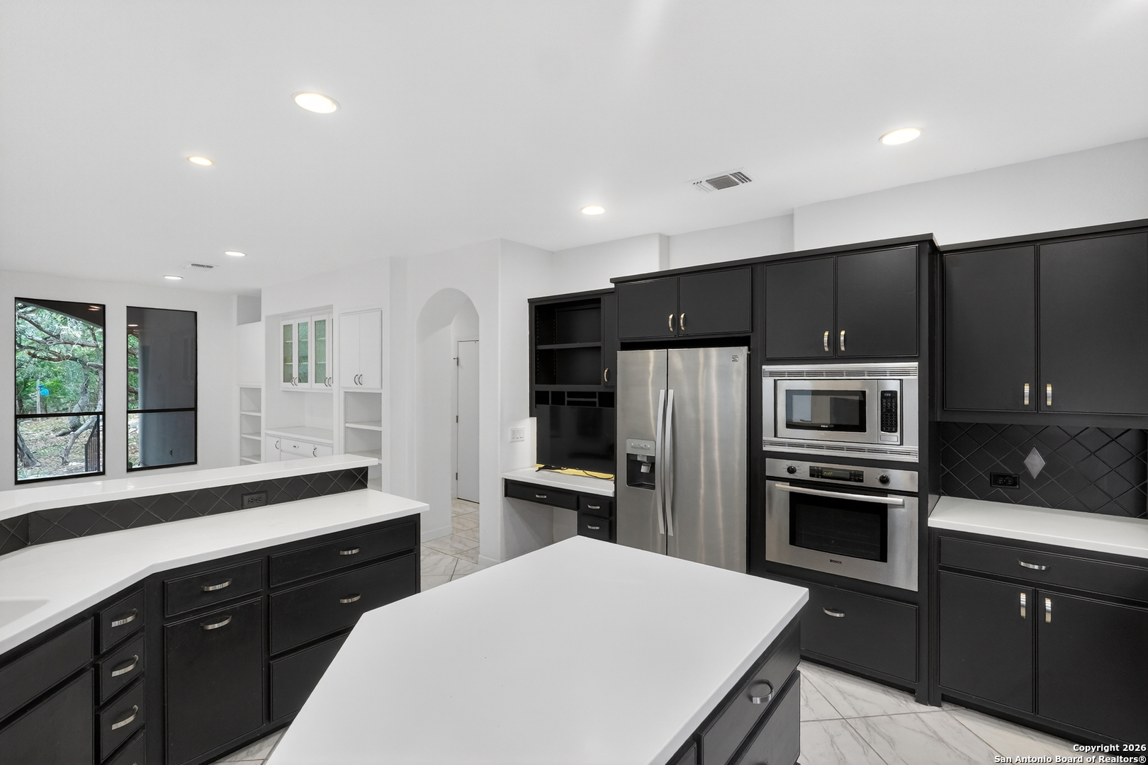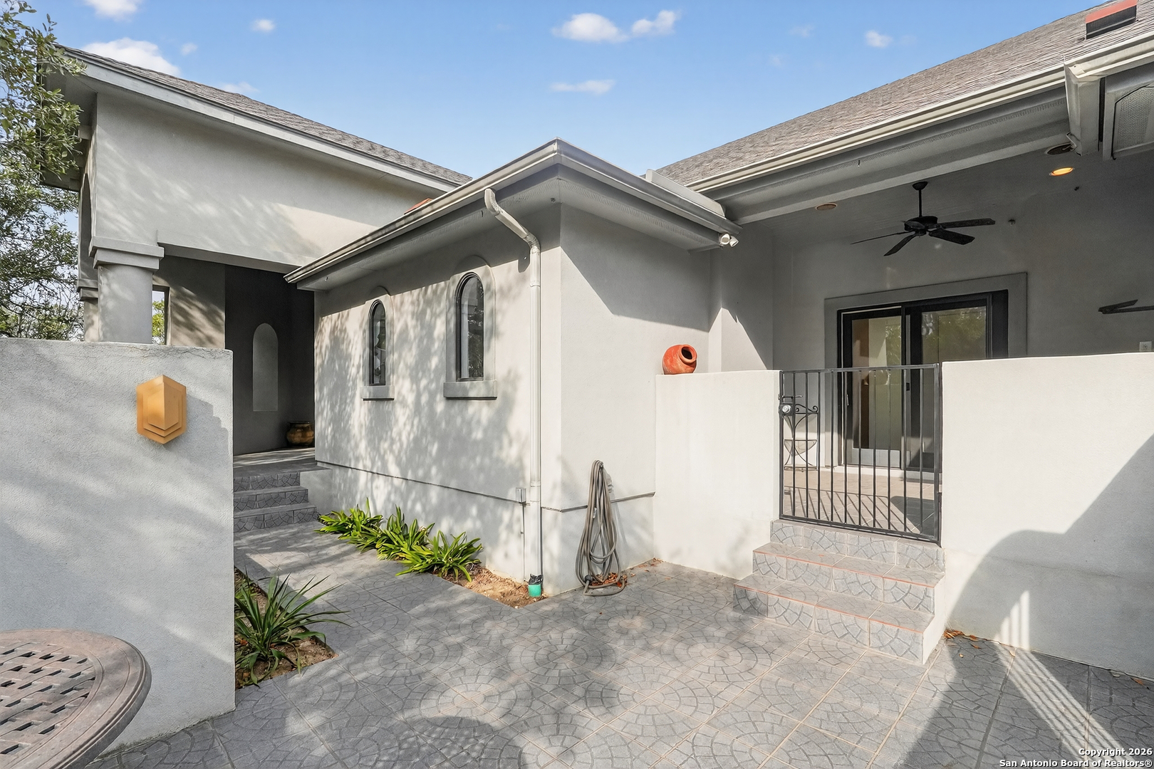 A beautiful one story home nestled in the exclusive gated community of Fossil Ridge in Cibolo Canyons. Conveniently located off 281 and TPC, a short drive from shopping and dining, and just down the street from Johnson High School. This beautiful custom home sits on a 1.29 acre lot surrounded by mature trees and natural landscaping, offering privacy and shade. Private entryway patio offers a built in gas grill, wet bar, and kitchen space. High ceilings are featured throughout the home. The living room features surround sound speaker hookups, views of the covered outdoor patio, and a gas fireplace. The modern kitchen features plenty of storage and cabinet space, dry bar area, an island with built in storage, stacked oven and microwave appliances, custom designed vent hood over the gas range, and spacious bar seating. Luxurious counter tops throughout the kitchen. The dining area features custom built in storage/buffet and views of the gorgeous back yard and covered patio. The Primary Bedroom features views of the backyard with a very spacious Primary bathroom, complete with his and hers vanities, soaker tub, walk-in steamer shower, and balcony access. The newly updated walk-in shower is generously sized and offers built in storage. The walk in closets features plenty of custom modern built in storage to effortlessly organize and store items. The large laundry area hosts storage and a utility sink easily making this a utility or storage area. The second bedroom is not only spacious and welcoming of natural light, it boasts custom built in storage and entertainment center. This room is joined with a Jack & Jill restroom to the third bedroom. The third bedroom is very spacious and has a large closet. The Jack and Jill is a full bath with tub and shower combo, toilet room separate, complete with plenty of storage within the vanity and a separate linen storage. Bath has updated removable shower head. This home features a port for pest control injection treatment, outdoor speakers, and boasts a roomy outdoor covered patio with fans. The backyard highlights the natural landscape with a fire pit area and endless possibilities for entertaining or enjoying quiet time secluded in the scenery. The two-car garage hosts plenty of workshop space with an accent flooring. On the private driveway there is space to park multiple vehicles. Make this exclusive and luxurious home yours today!