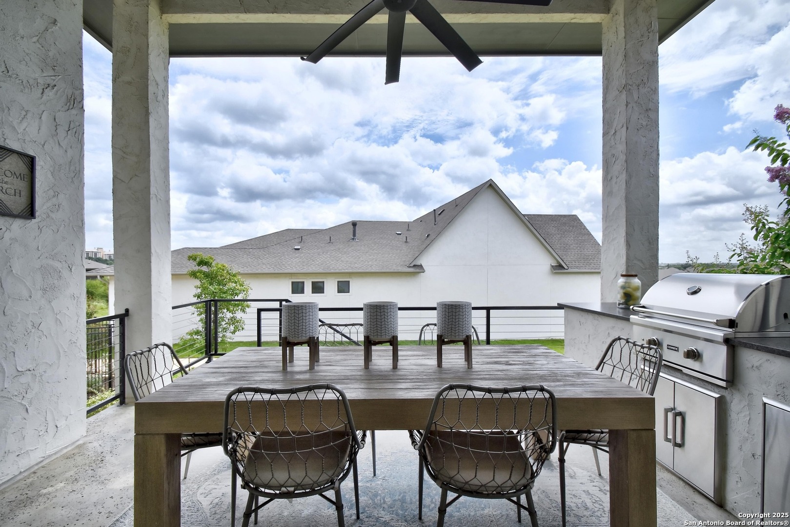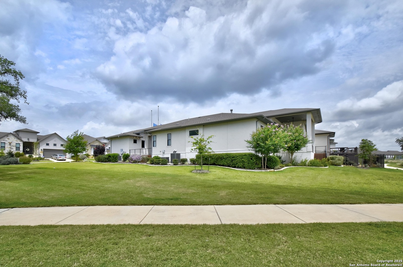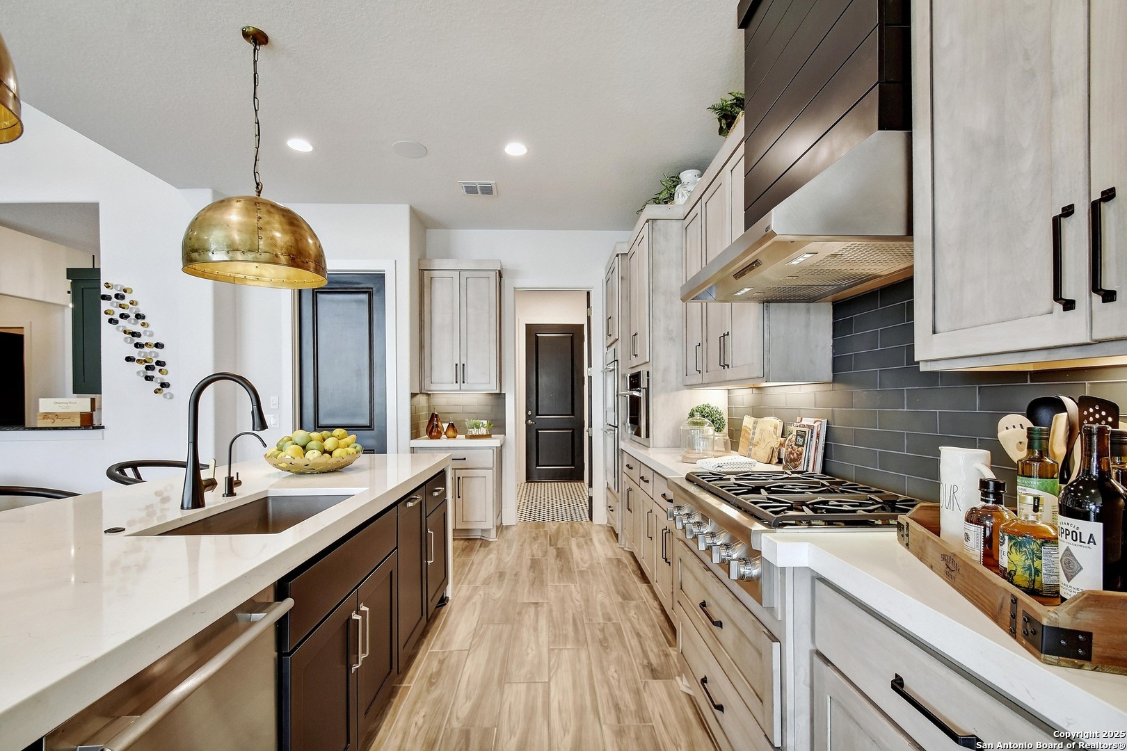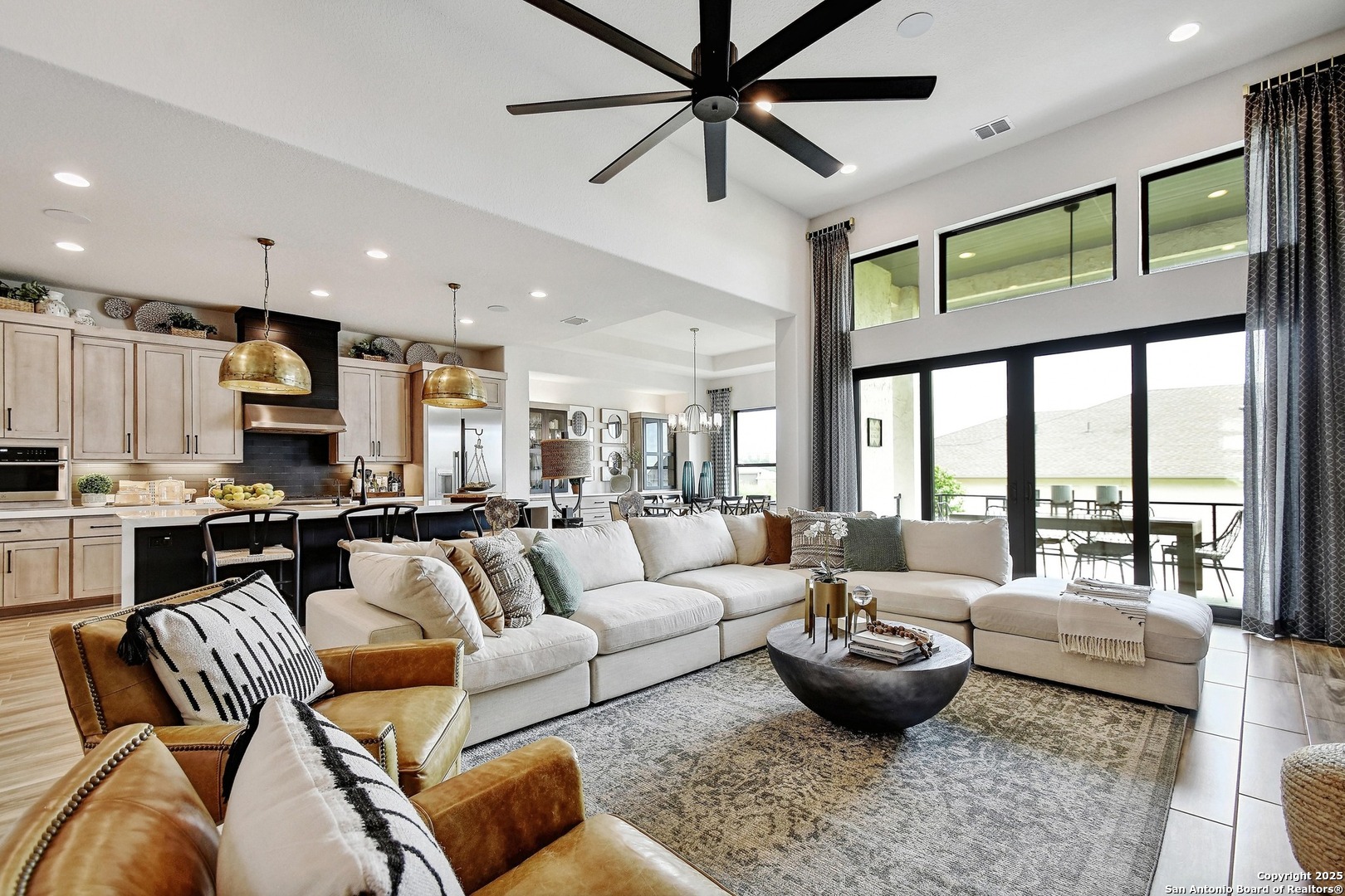 Luxury Meets Lifestyle, an exquisite home by Sitterle, nestled in the prestigious gated Enclave of Campanas at Cibolo Canyons- A premier luxury community. This exceptional one-story residence, previusly a model home, features over $200,000 in designer upgrades and offers 3 spacious bedrooms, 2.5 bathrooms, plus a detached private CASITA complete with its own full bath-ideal for guests or multi-generational living. Elegant design elements include a generously sized primary suite with a spa-inspired bathroom, custom walk-in closet with built-in shelving, and a stunning floor-to-ceiling tiled shower. Premium Moen fixtures and hardware add a sophisticated touch throughout. Entertain effortlessly with extended covered patios in both the front and back, complemented by a fully equipped outdoor kitchen and outdoor fireplace. The front entry is enclosed with a gated iron fence. The expansive living room is anchored by a striking oversized fireplace, while the custom wet bar elevates your hosting game. The chef's kitchen boasts high-end appliances, a gas range, and ample space for culinary creations-all framed by Benedettini Fine Custom Cabinetry, luxury quartz countertops, soaring ceilings ideal for displaying fine art, built-in china cabinet, and customized lighting. Added favorites include a walk-in laundry/mud room with sink & cabinetry, bold accent walls and ceilings, custom tile flooring from Stone Solutions, Thermador kitchen appliances, walk-in kitchen pantry, natural lighting, corner-lot, and storage space. Residents of Campanas enjoy exclusive access to a 10,000+ square foot private clubhouse featuring a 24-hour fitness center, game room, library, ballroom, professional catering kitchen, multiple swimming pools with outdoor kitchen, tennis courts, and more. HOA services include front and backyard landscaping & sprinkler system, gated security, and home security system monitoring. Community amenities extend to a lazy river, soccer field, walking trails and unparalleled recreational options. This home has never been owner occupied and remains under the builder's one-year warranty (valid through 2026), in addition to coverage under the original 10-year structural warranty. Ideally situated near the TPC San Antonio Golf Resort, JW Marriott Hill Country Resort, Stone Oak Medical Center, and major thoroughfares.