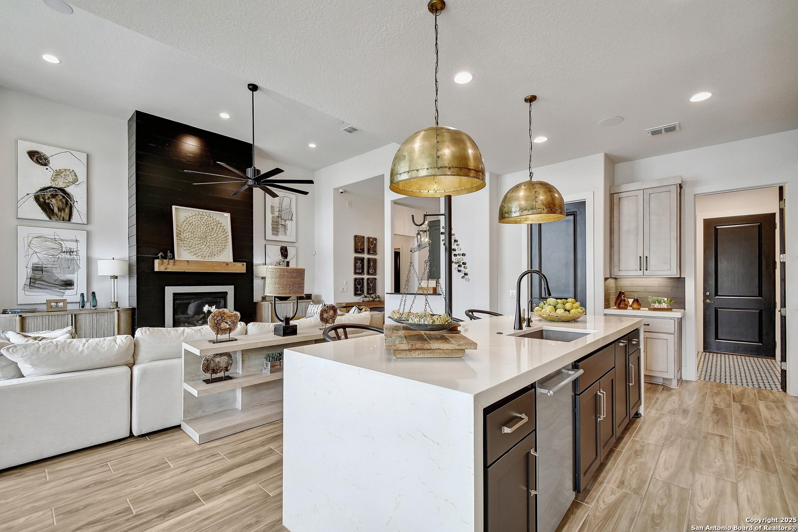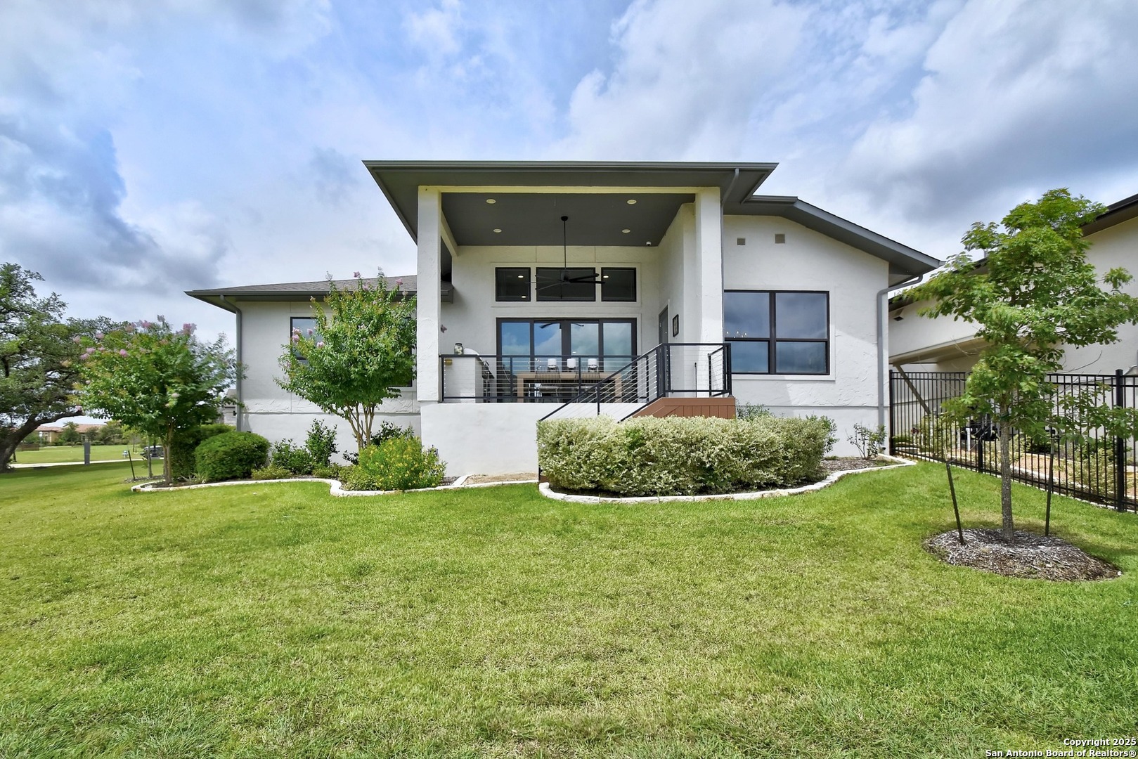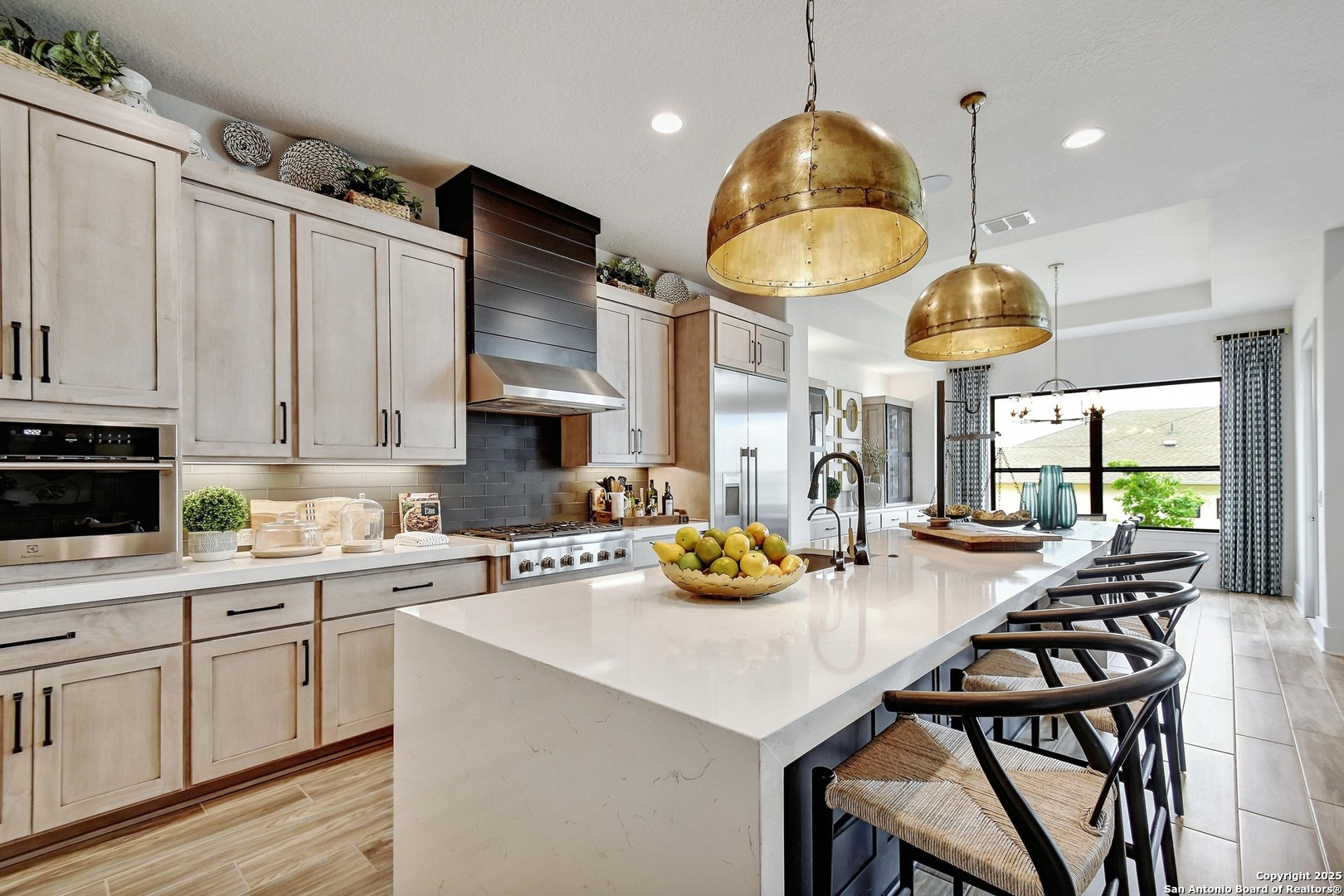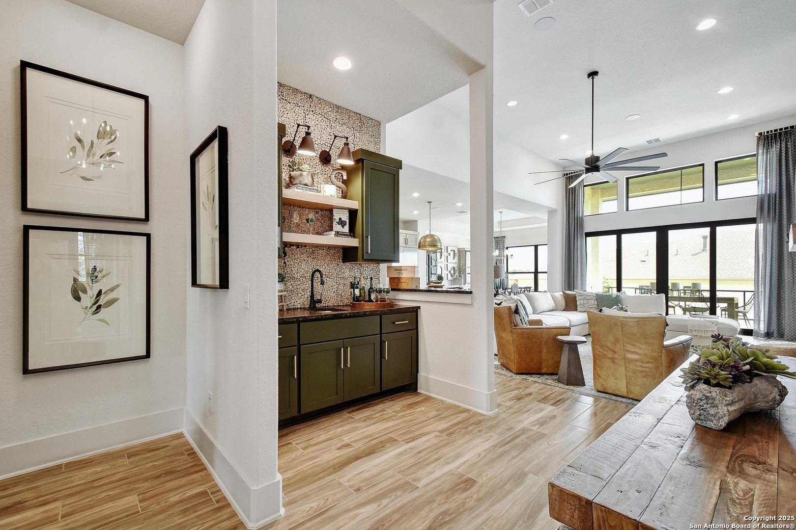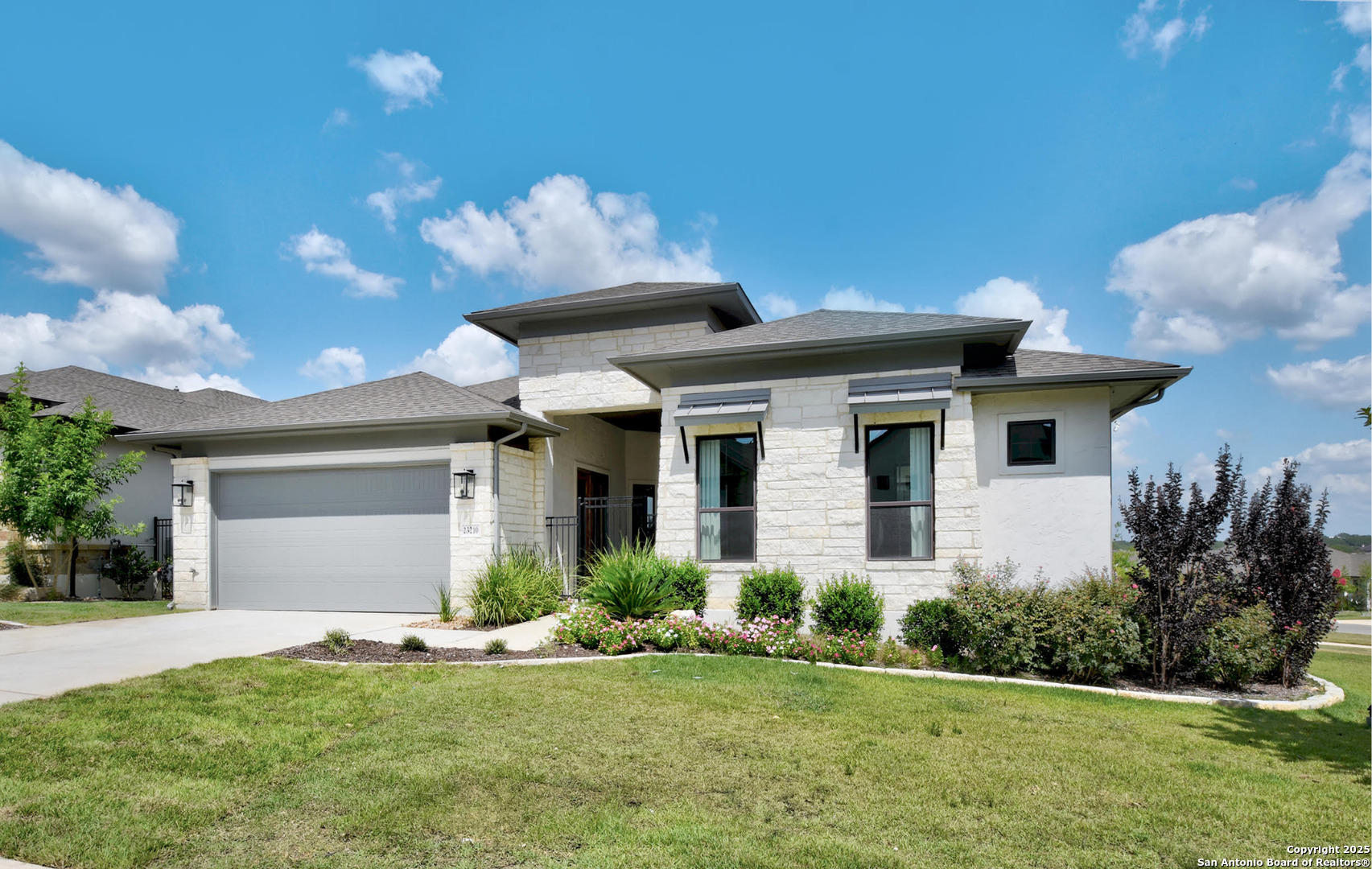 Luxury Meets Lifestyle, an exquisite home by Sitterle, nestled in the prestigious gated Enclave of Campanas at Cibolo Canyons- A premier luxury community. This exceptional one-story residence, previusly a model home, features over $200,000 in designer upgrades and offers 3 spacious bedrooms, 2.5 bathrooms, plus a detached private CASITA complete with its own full bath-ideal for guests or multi-generational living. Elegant design elements include a generously sized primary suite with a spa-inspired bathroom, custom walk-in closet with built-in shelving, and a stunning floor-to-ceiling tiled shower. Premium Moen fixtures and hardware add a sophisticated touch throughout. Entertain effortlessly with extended covered patios in both the front and back, complemented by a fully equipped outdoor kitchen and outdoor fireplace. The front entry is enclosed with a gated iron fence. The expansive living room is anchored by a striking oversized fireplace, while the custom wet bar elevates your hosting game. The chef's kitchen boasts high-end appliances, a gas range, and ample space for culinary creations-all framed by Benedettini Fine Custom Cabinetry, luxury quartz countertops, soaring ceilings ideal for displaying fine art, built-in china cabinet, and customized lighting. Added favorites include a walk-in laundry/mud room with sink & cabinetry, bold accent walls and ceilings, custom tile flooring from Stone Solutions, Thermador kitchen appliances, walk-in kitchen pantry, natural lighting, corner-lot, and storage space. Residents of Campanas enjoy exclusive access to a 10,000+ square foot private clubhouse featuring a 24-hour fitness center, game room, library, ballroom, professional catering kitchen, multiple swimming pools with outdoor kitchen, tennis courts, and more. HOA services include front and backyard landscaping & sprinkler system, gated security, and home security system monitoring. Community amenities extend to a lazy river, soccer field, walking trails and unparalleled recreational options. This home has never been owner occupied and remains under the builder's one-year warranty (valid through 2026), in addition to coverage under the original 10-year structural warranty. Ideally situated near the TPC San Antonio Golf Resort, JW Marriott Hill Country Resort, Stone Oak Medical Center, and major thoroughfares.