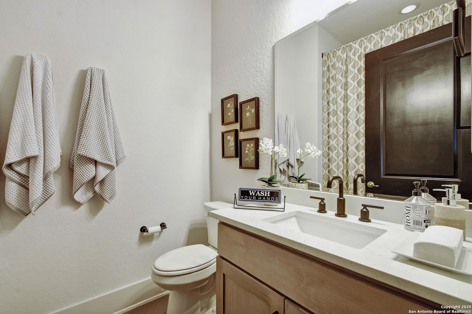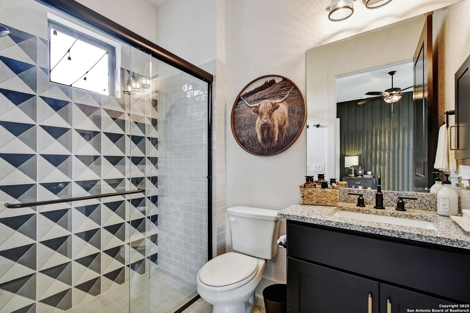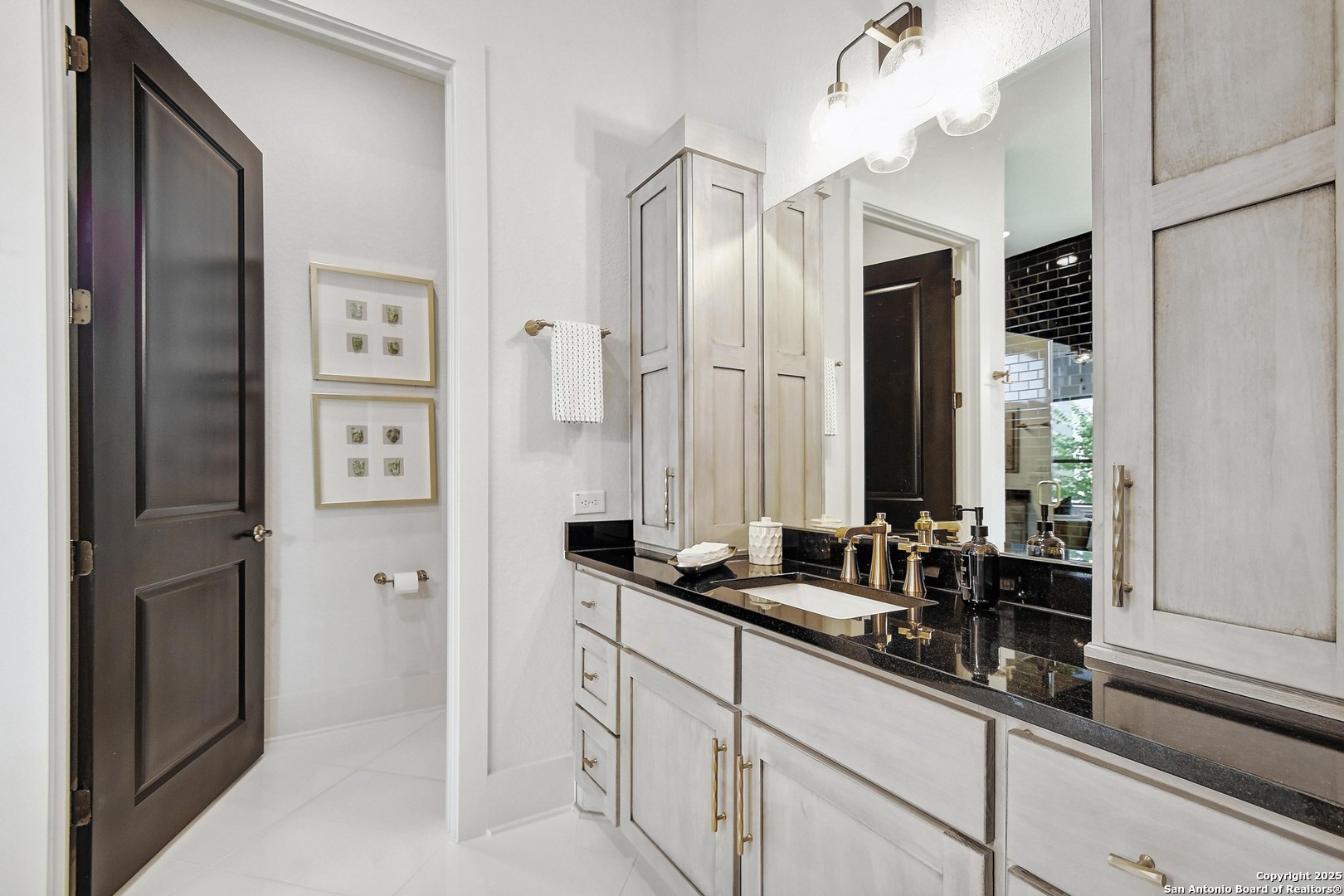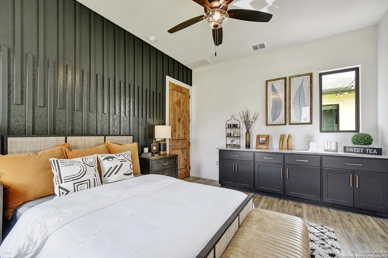 Luxury Meets Lifestyle, an exquisite home by Sitterle, nestled in the prestigious gated Enclave of Campanas at Cibolo Canyons- A premier luxury community. This exceptional one-story residence, previusly a model home, features over $200,000 in designer upgrades and offers 3 spacious bedrooms, 2.5 bathrooms, plus a detached private CASITA complete with its own full bath-ideal for guests or multi-generational living. Elegant design elements include a generously sized primary suite with a spa-inspired bathroom, custom walk-in closet with built-in shelving, and a stunning floor-to-ceiling tiled shower. Premium Moen fixtures and hardware add a sophisticated touch throughout. Entertain effortlessly with extended covered patios in both the front and back, complemented by a fully equipped outdoor kitchen and outdoor fireplace. The front entry is enclosed with a gated iron fence. The expansive living room is anchored by a striking oversized fireplace, while the custom wet bar elevates your hosting game. The chef's kitchen boasts high-end appliances, a gas range, and ample space for culinary creations-all framed by Benedettini Fine Custom Cabinetry, luxury quartz countertops, soaring ceilings ideal for displaying fine art, built-in china cabinet, and customized lighting. Added favorites include a walk-in laundry/mud room with sink & cabinetry, bold accent walls and ceilings, custom tile flooring from Stone Solutions, Thermador kitchen appliances, walk-in kitchen pantry, natural lighting, corner-lot, and storage space. Residents of Campanas enjoy exclusive access to a 10,000+ square foot private clubhouse featuring a 24-hour fitness center, game room, library, ballroom, professional catering kitchen, multiple swimming pools with outdoor kitchen, tennis courts, and more. HOA services include front and backyard landscaping & sprinkler system, gated security, and home security system monitoring. Community amenities extend to a lazy river, soccer field, walking trails and unparalleled recreational options. This home has never been owner occupied and remains under the builder's one-year warranty (valid through 2026), in addition to coverage under the original 10-year structural warranty. Ideally situated near the TPC San Antonio Golf Resort, JW Marriott Hill Country Resort, Stone Oak Medical Center, and major thoroughfares.