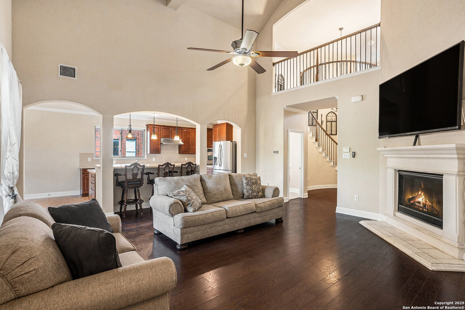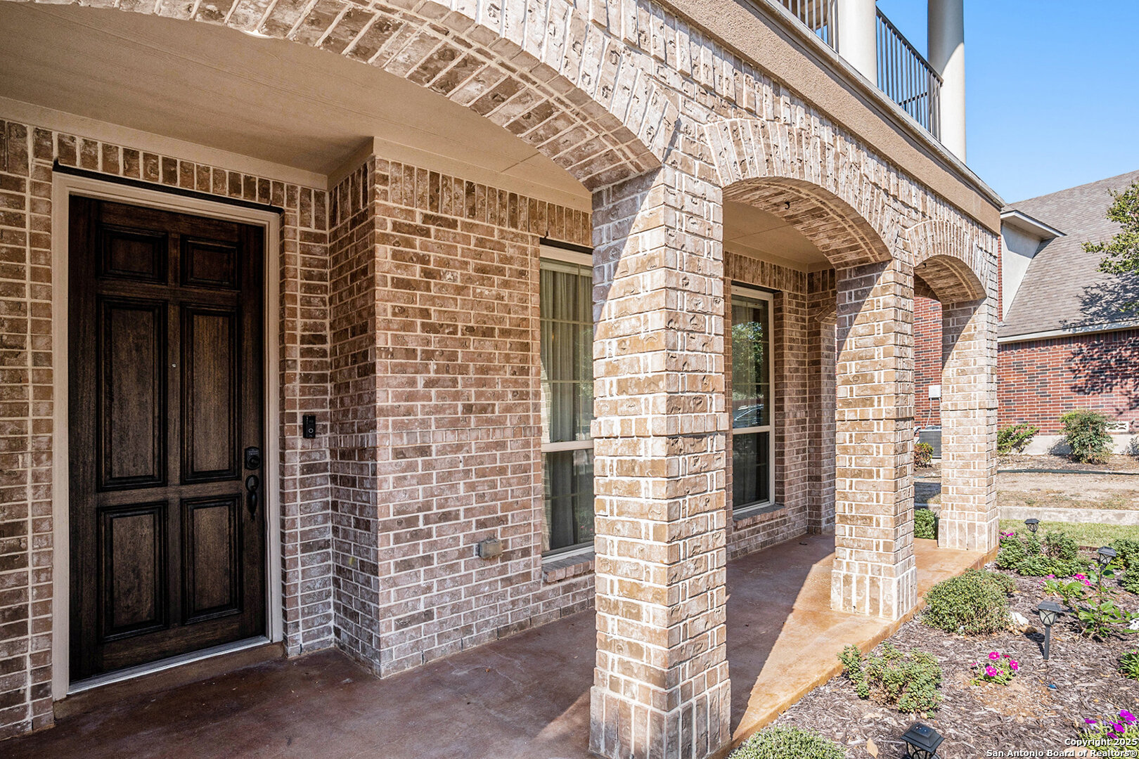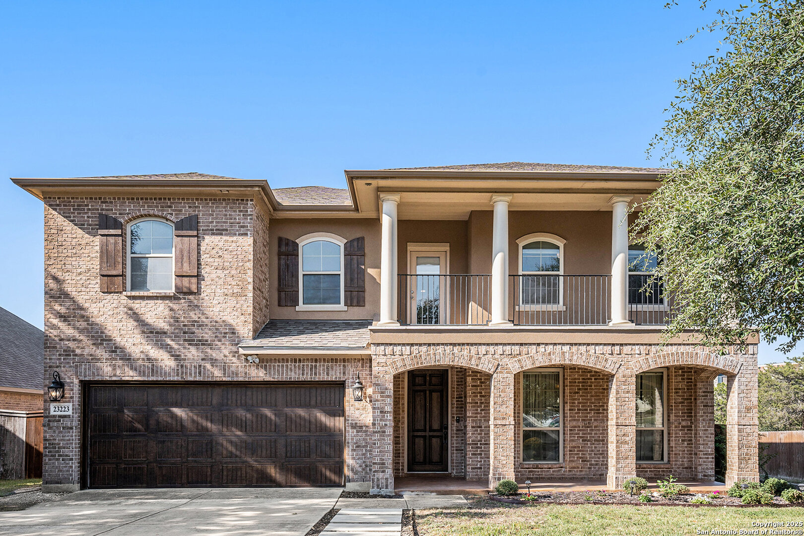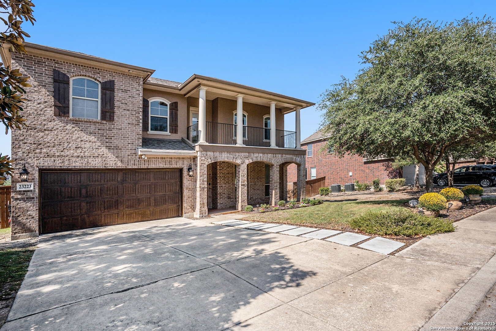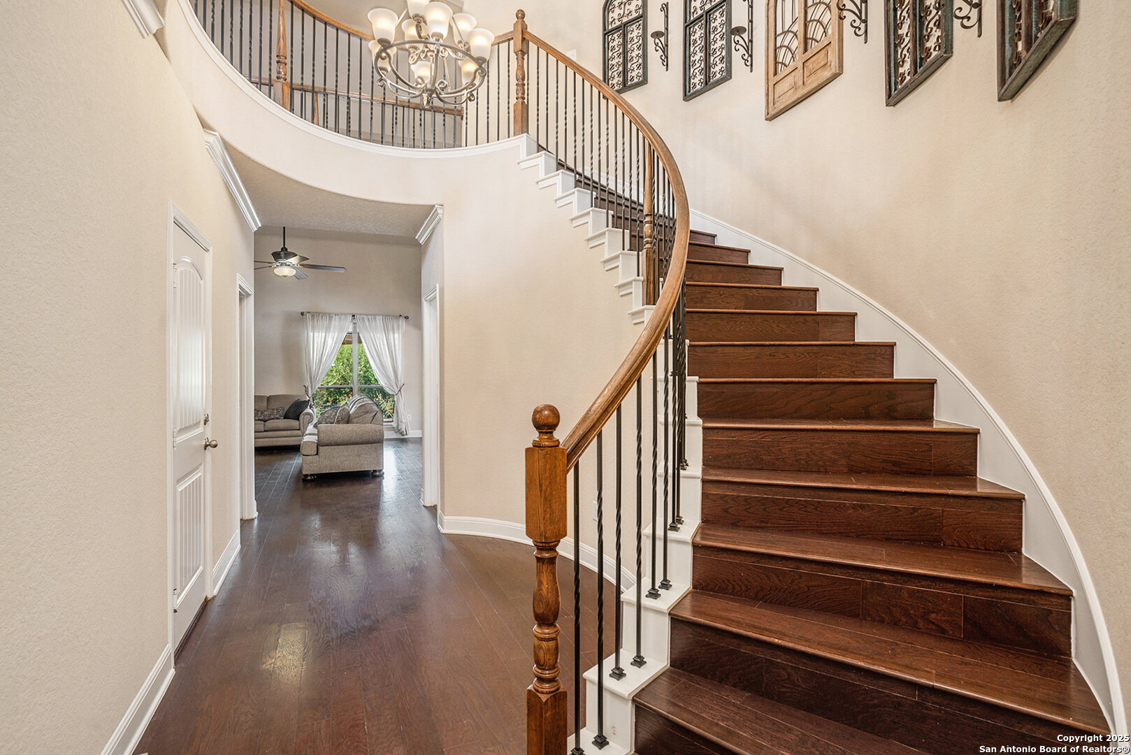 Stop looking any further! You just found it. And it's VA Substitutable at 2.75 for the current loan balance. (Ask your lender for details) Situated on a quiet back street along a beautiful nature filled greenbelt. This fairy-tale like two-story home offers space and style in a master-planned, resort-style community. Come inside and you're greeted by a vast foyer with a breath-taking curling staircase that feels bright and open, leading up to a recently renovated upstairs recreation area. The upstairs which has a bathroom and walk-in closet for each of the bedrooms and an open area which provides all sorts of possibilities is beyond comparison. There is a kitchen and butler's pantry which provides comfort and efficiency to the heart of the home - a kitchen made for cooking and gathering, with an island the size of Oahu. Complete with built-in stainless appliances, gas cooking, reverse osmosis water, and tons of cabinet space. The kitchen then opens into the fireplace equipped living room, where the current owner is leaving a fantastic TV for your family's and guests' entertainment. The formal Dinning area is now being used as an office but can be used as you desire. The primary suite is privately situated downstairs and feels like a vacation get-away; featuring a large walk-in closet and a spa-inspired bath with separate vanities, a garden tub, and an oversized walk-in shower that you'll fall in love with. Outside, the beautifully maintained, oversized yard and deck offer so much potential - install an outdoor kitchen, put in a pool, design the outdoor space of your dreams, or do all of the above. Quick access to Hwy 281 and close to the many amenities in North Central San Antonio area.