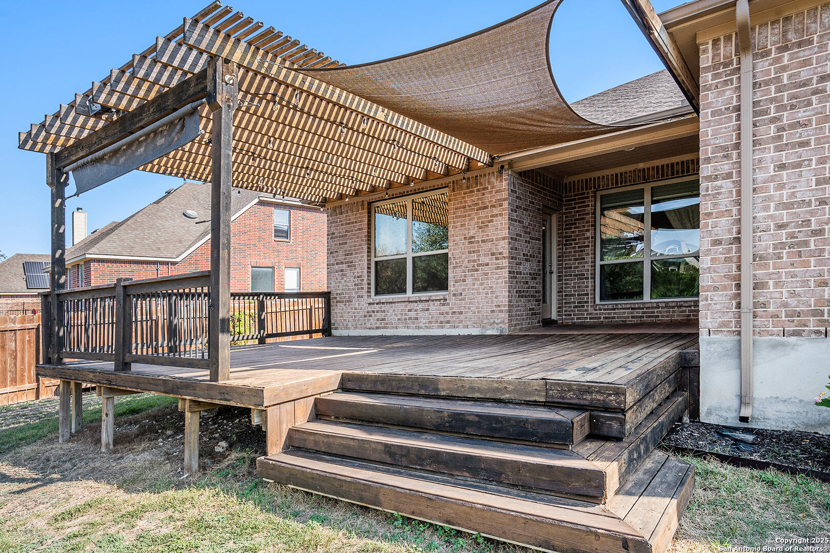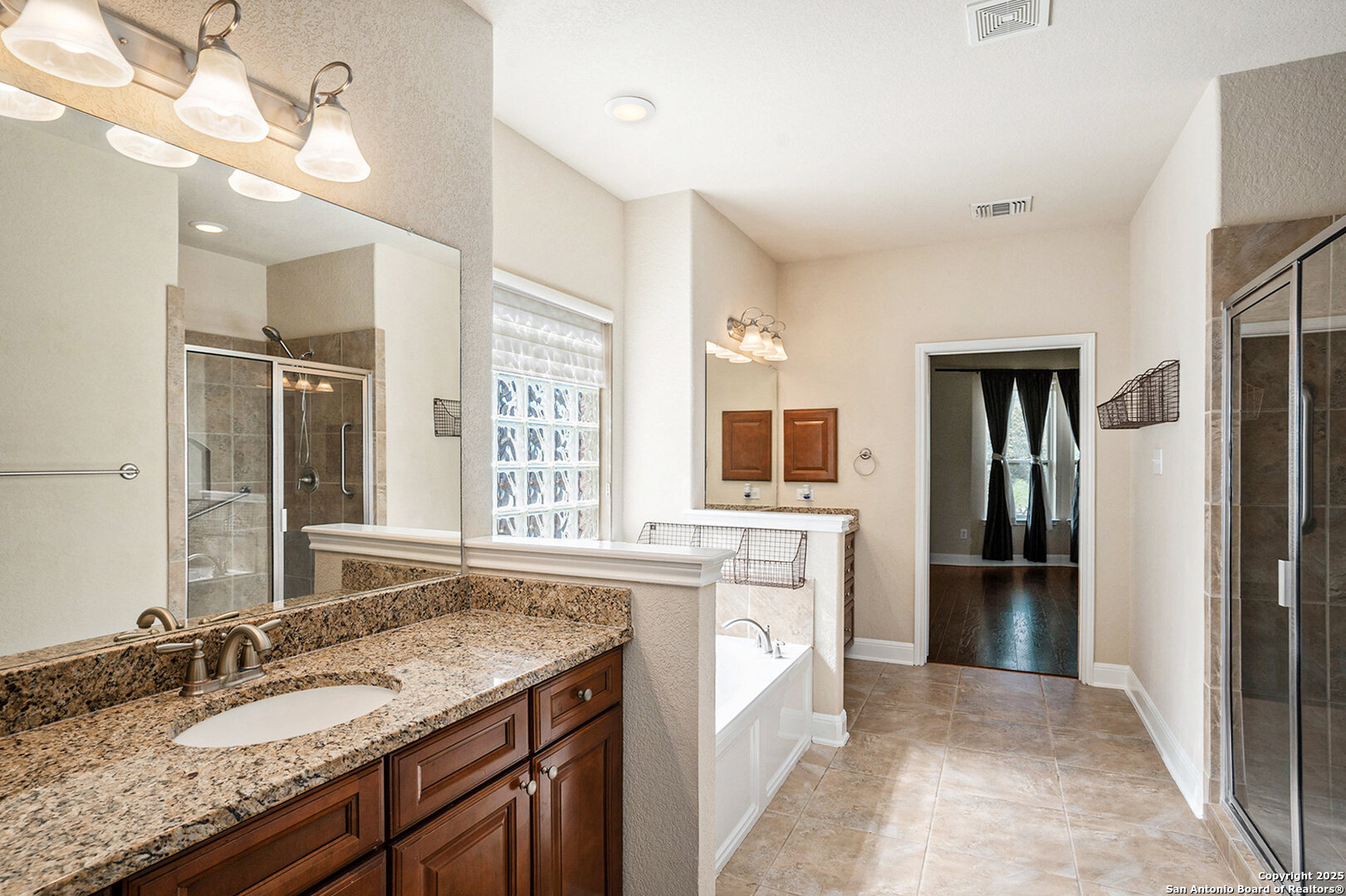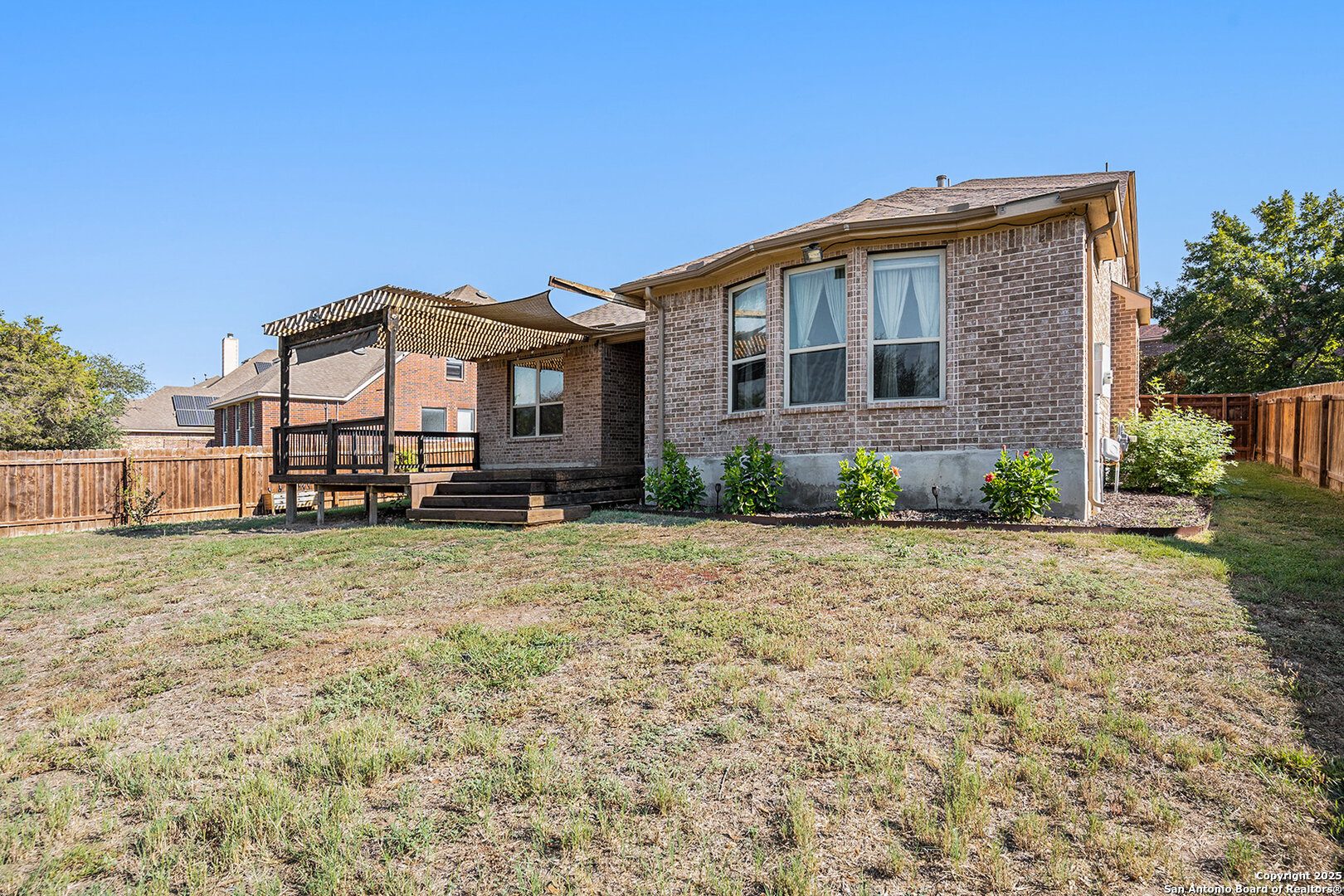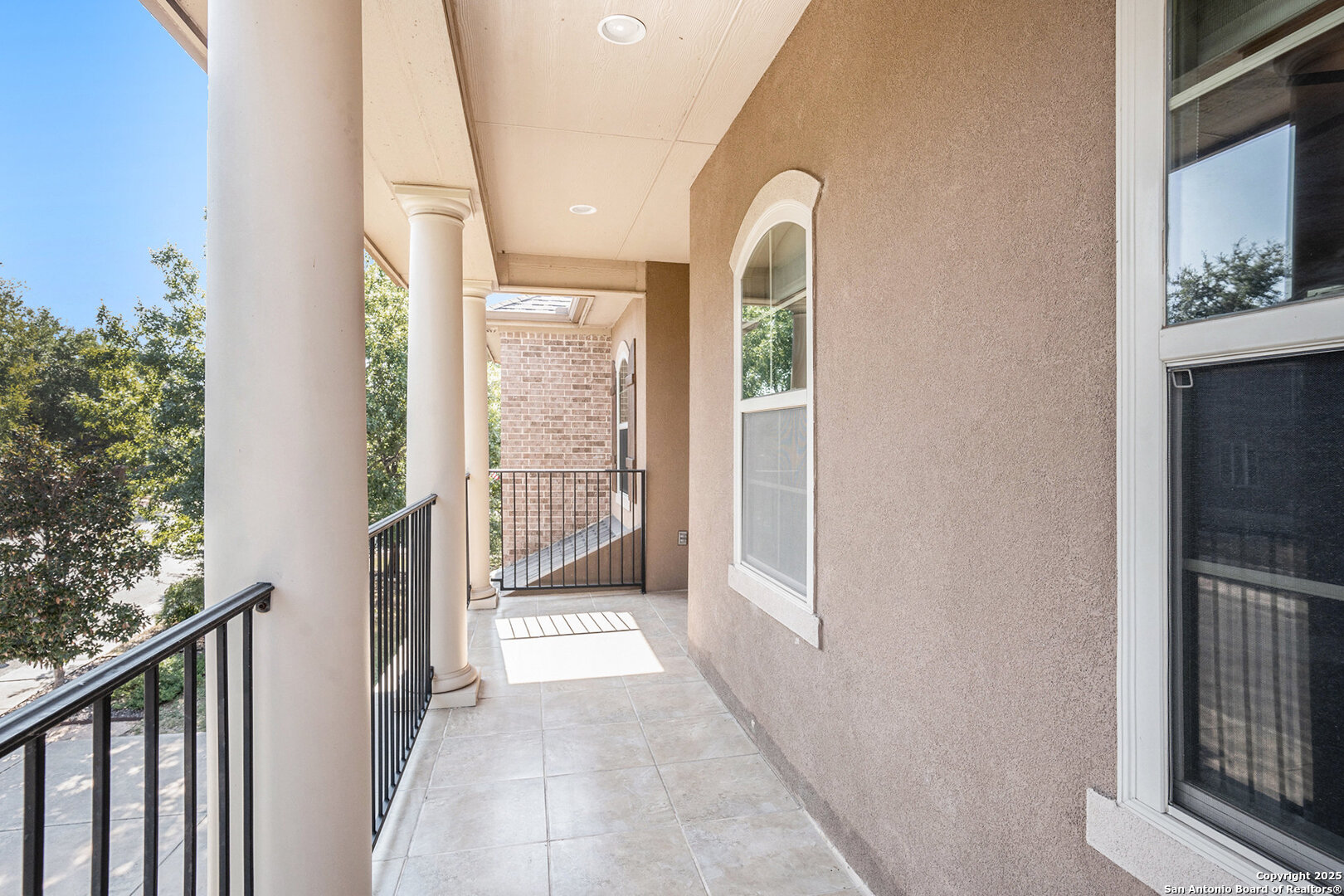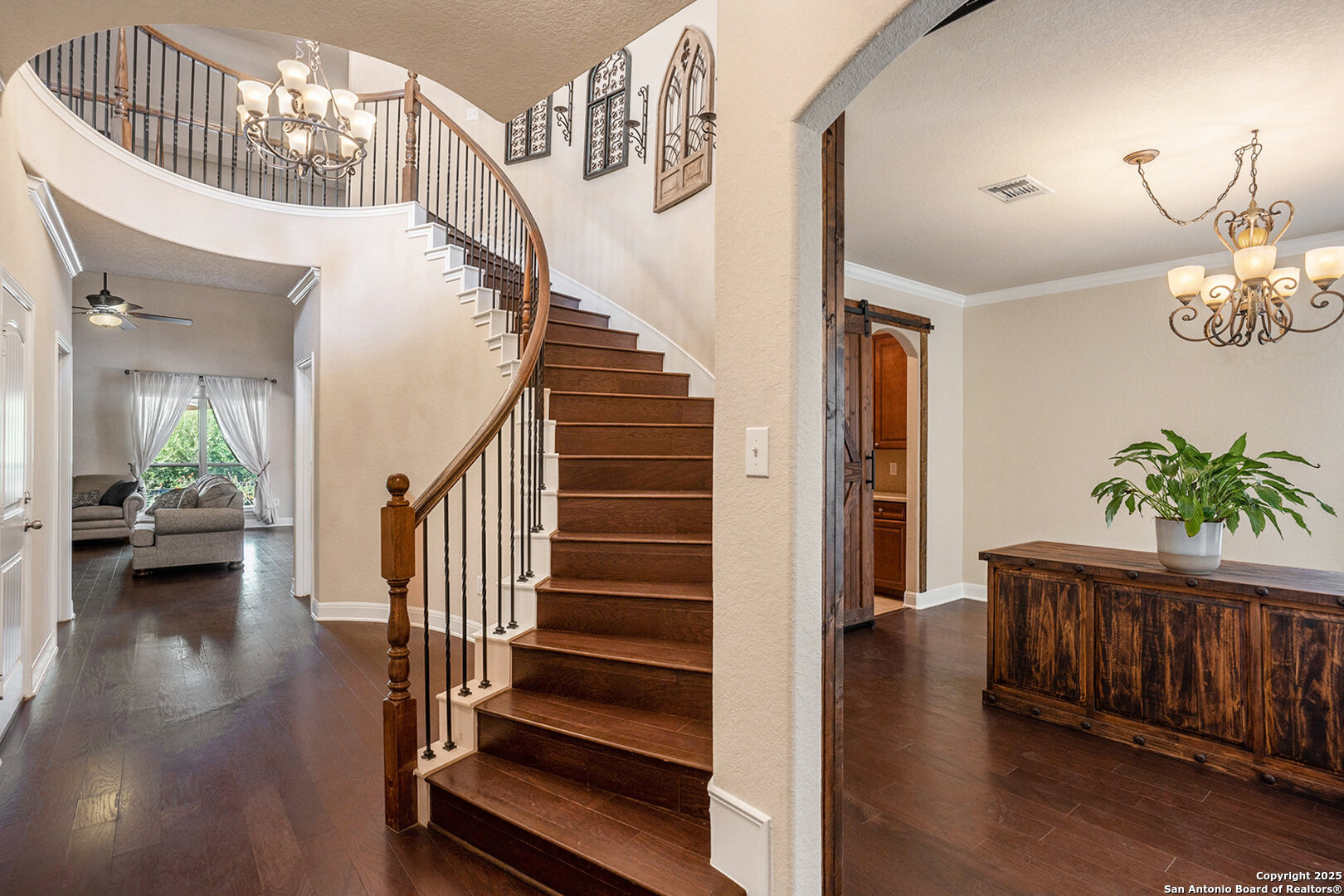 Stop looking any further! You just found it. And it's VA Substitutable at 2.75 for the current loan balance. (Ask your lender for details) Situated on a quiet back street along a beautiful nature filled greenbelt. This fairy-tale like two-story home offers space and style in a master-planned, resort-style community. Come inside and you're greeted by a vast foyer with a breath-taking curling staircase that feels bright and open, leading up to a recently renovated upstairs recreation area. The upstairs which has a bathroom and walk-in closet for each of the bedrooms and an open area which provides all sorts of possibilities is beyond comparison. There is a kitchen and butler's pantry which provides comfort and efficiency to the heart of the home - a kitchen made for cooking and gathering, with an island the size of Oahu. Complete with built-in stainless appliances, gas cooking, reverse osmosis water, and tons of cabinet space. The kitchen then opens into the fireplace equipped living room, where the current owner is leaving a fantastic TV for your family's and guests' entertainment. The formal Dinning area is now being used as an office but can be used as you desire. The primary suite is privately situated downstairs and feels like a vacation get-away; featuring a large walk-in closet and a spa-inspired bath with separate vanities, a garden tub, and an oversized walk-in shower that you'll fall in love with. Outside, the beautifully maintained, oversized yard and deck offer so much potential - install an outdoor kitchen, put in a pool, design the outdoor space of your dreams, or do all of the above. Quick access to Hwy 281 and close to the many amenities in North Central San Antonio area.