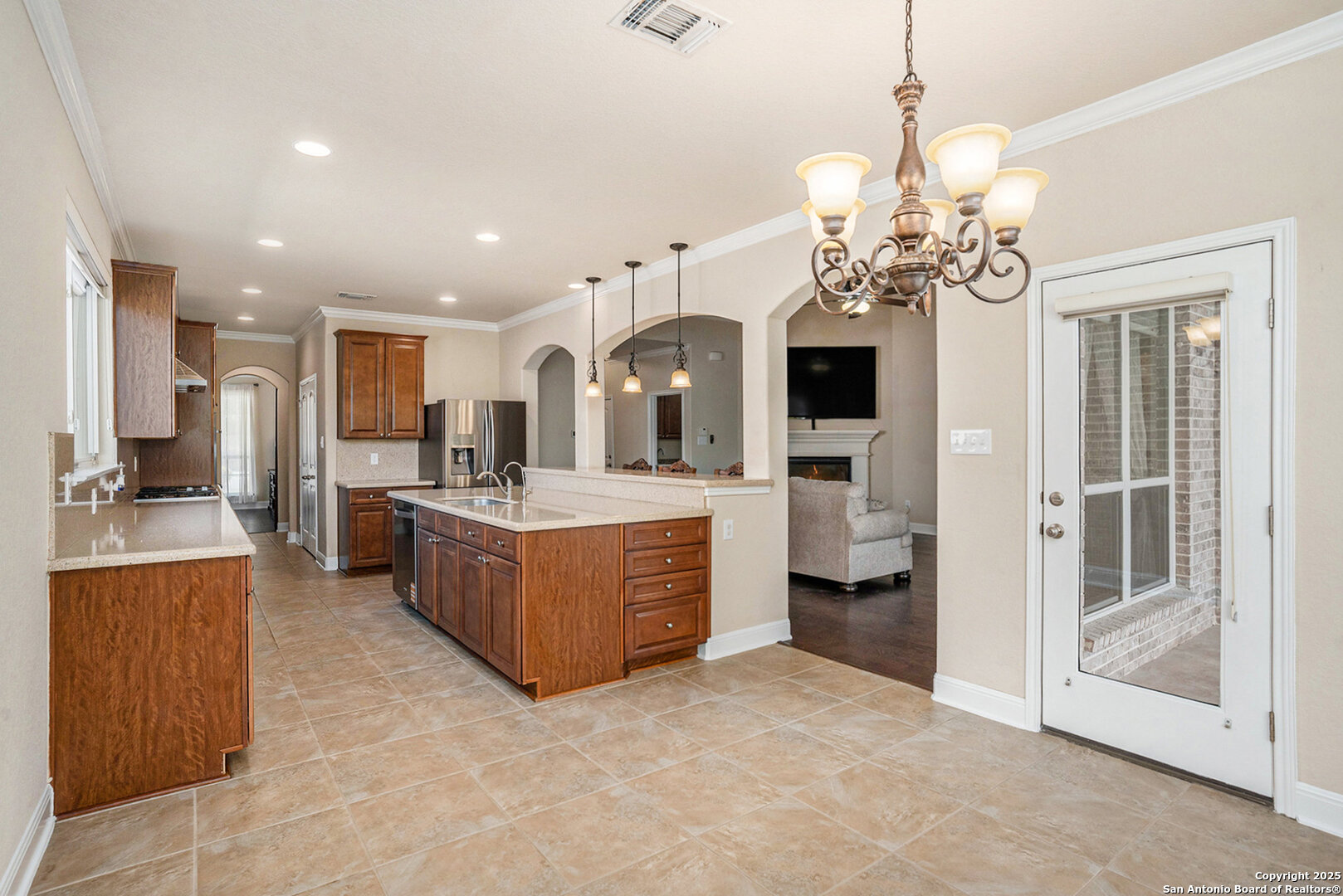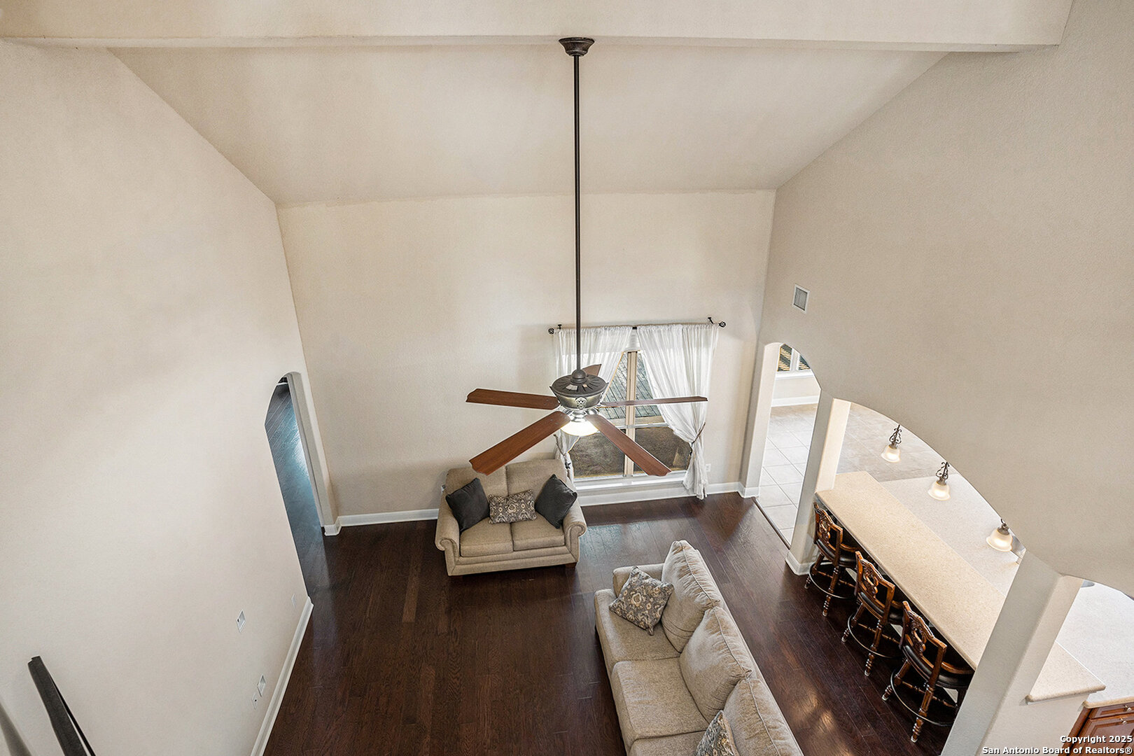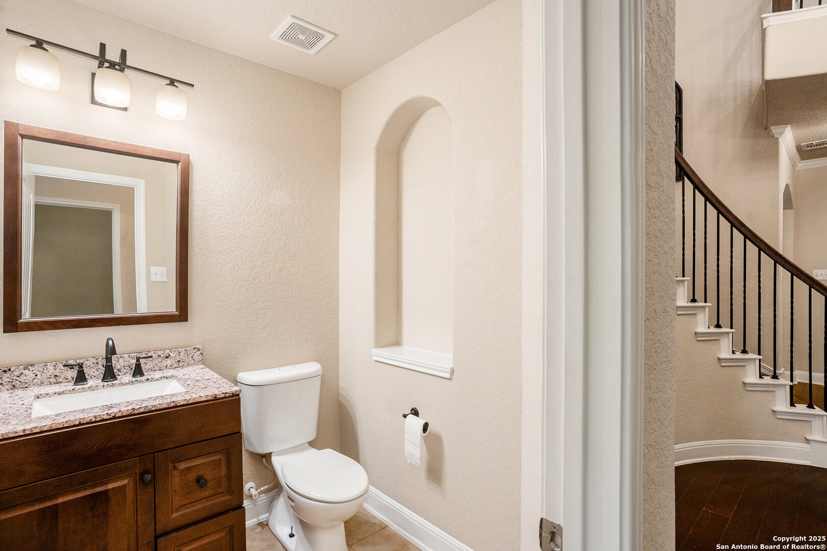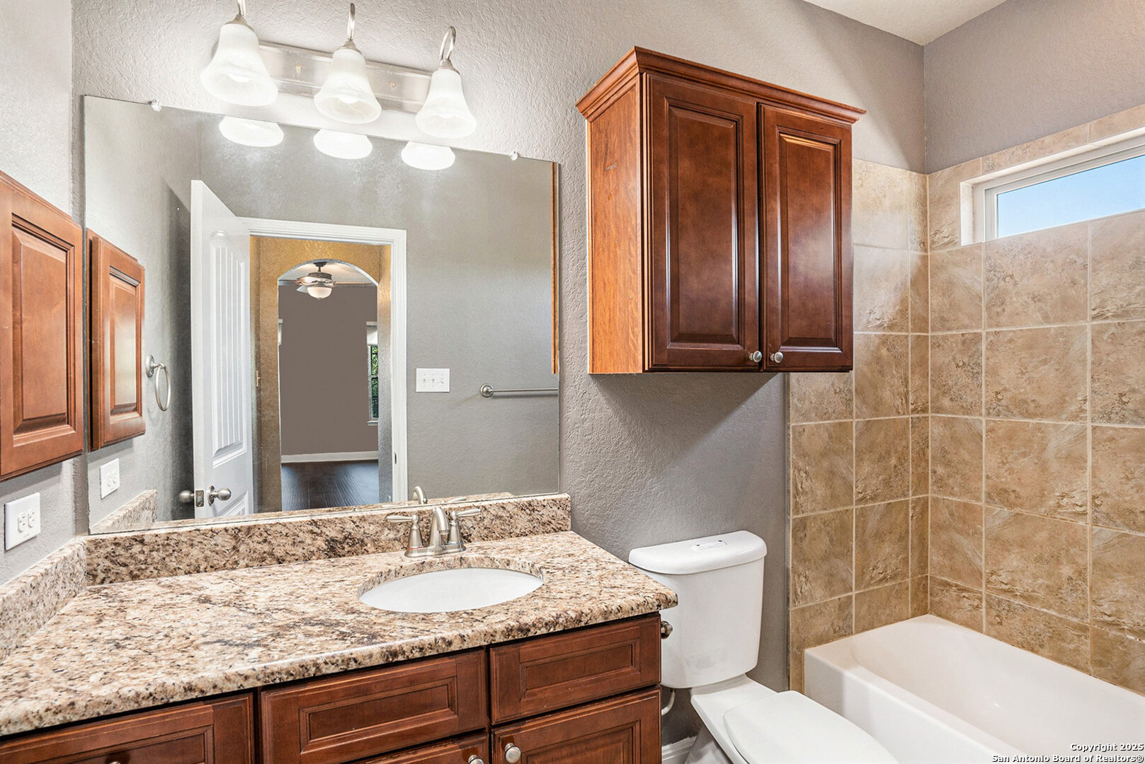 Stop looking any further! You just found it. And it's VA Substitutable at 2.75 for the current loan balance. (Ask your lender for details) Situated on a quiet back street along a beautiful nature filled greenbelt. This fairy-tale like two-story home offers space and style in a master-planned, resort-style community. Come inside and you're greeted by a vast foyer with a breath-taking curling staircase that feels bright and open, leading up to a recently renovated upstairs recreation area. The upstairs which has a bathroom and walk-in closet for each of the bedrooms and an open area which provides all sorts of possibilities is beyond comparison. There is a kitchen and butler's pantry which provides comfort and efficiency to the heart of the home - a kitchen made for cooking and gathering, with an island the size of Oahu. Complete with built-in stainless appliances, gas cooking, reverse osmosis water, and tons of cabinet space. The kitchen then opens into the fireplace equipped living room, where the current owner is leaving a fantastic TV for your family's and guests' entertainment. The formal Dinning area is now being used as an office but can be used as you desire. The primary suite is privately situated downstairs and feels like a vacation get-away; featuring a large walk-in closet and a spa-inspired bath with separate vanities, a garden tub, and an oversized walk-in shower that you'll fall in love with. Outside, the beautifully maintained, oversized yard and deck offer so much potential - install an outdoor kitchen, put in a pool, design the outdoor space of your dreams, or do all of the above. Quick access to Hwy 281 and close to the many amenities in North Central San Antonio area.