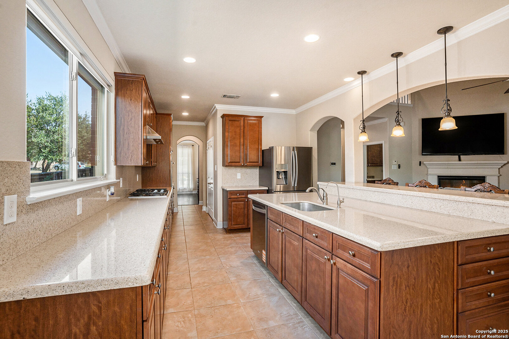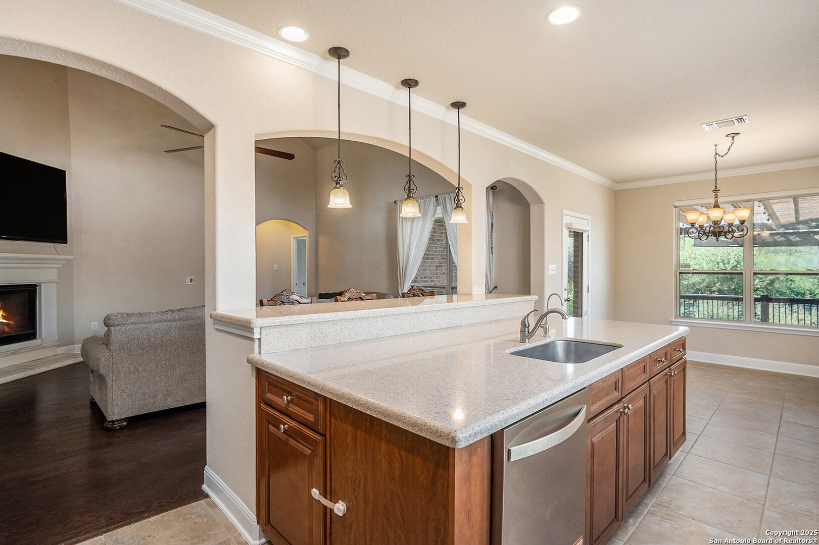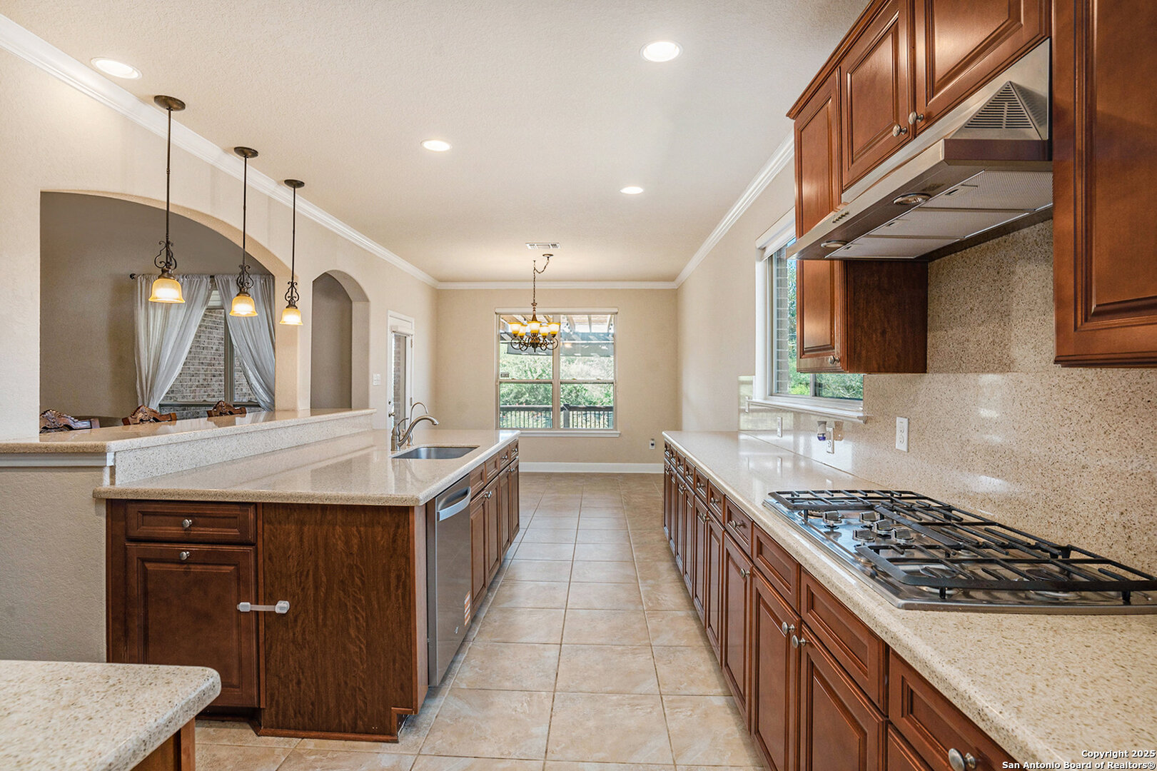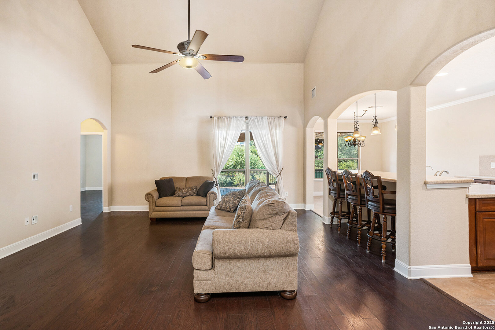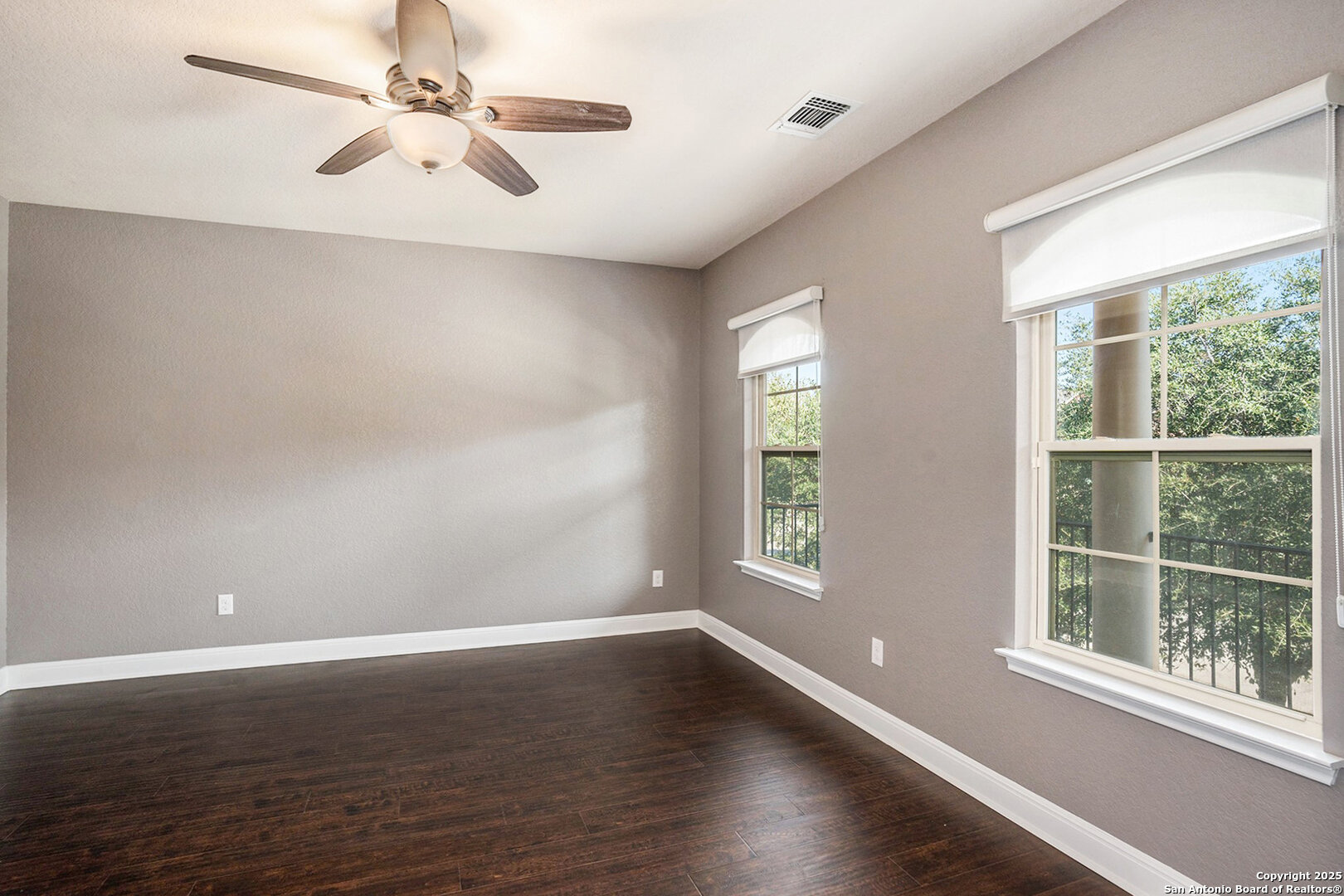 Stop looking any further! You just found it. And it's VA Substitutable at 2.75 for the current loan balance. (Ask your lender for details) Situated on a quiet back street along a beautiful nature filled greenbelt. This fairy-tale like two-story home offers space and style in a master-planned, resort-style community. Come inside and you're greeted by a vast foyer with a breath-taking curling staircase that feels bright and open, leading up to a recently renovated upstairs recreation area. The upstairs which has a bathroom and walk-in closet for each of the bedrooms and an open area which provides all sorts of possibilities is beyond comparison. There is a kitchen and butler's pantry which provides comfort and efficiency to the heart of the home - a kitchen made for cooking and gathering, with an island the size of Oahu. Complete with built-in stainless appliances, gas cooking, reverse osmosis water, and tons of cabinet space. The kitchen then opens into the fireplace equipped living room, where the current owner is leaving a fantastic TV for your family's and guests' entertainment. The formal Dinning area is now being used as an office but can be used as you desire. The primary suite is privately situated downstairs and feels like a vacation get-away; featuring a large walk-in closet and a spa-inspired bath with separate vanities, a garden tub, and an oversized walk-in shower that you'll fall in love with. Outside, the beautifully maintained, oversized yard and deck offer so much potential - install an outdoor kitchen, put in a pool, design the outdoor space of your dreams, or do all of the above. Quick access to Hwy 281 and close to the many amenities in North Central San Antonio area.
