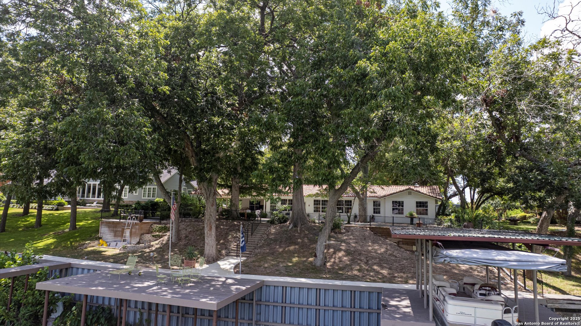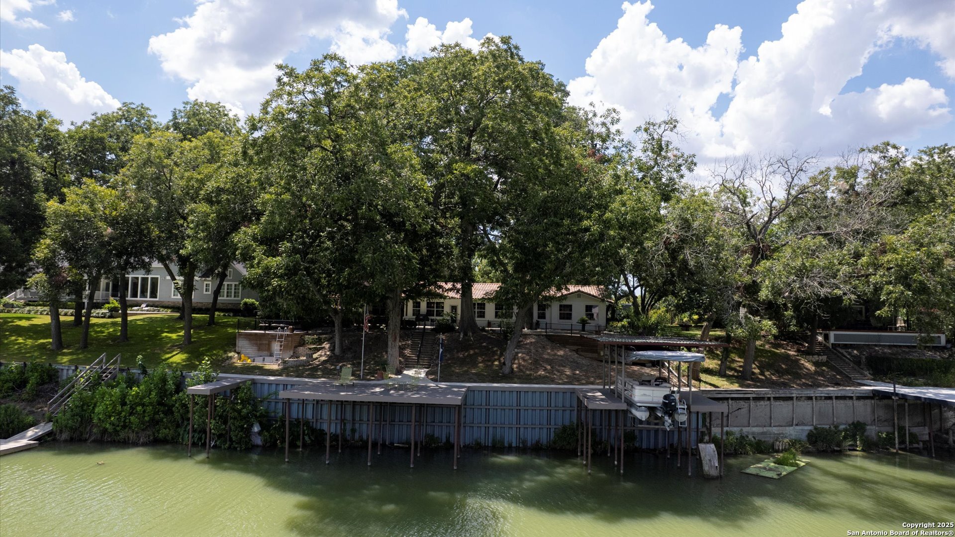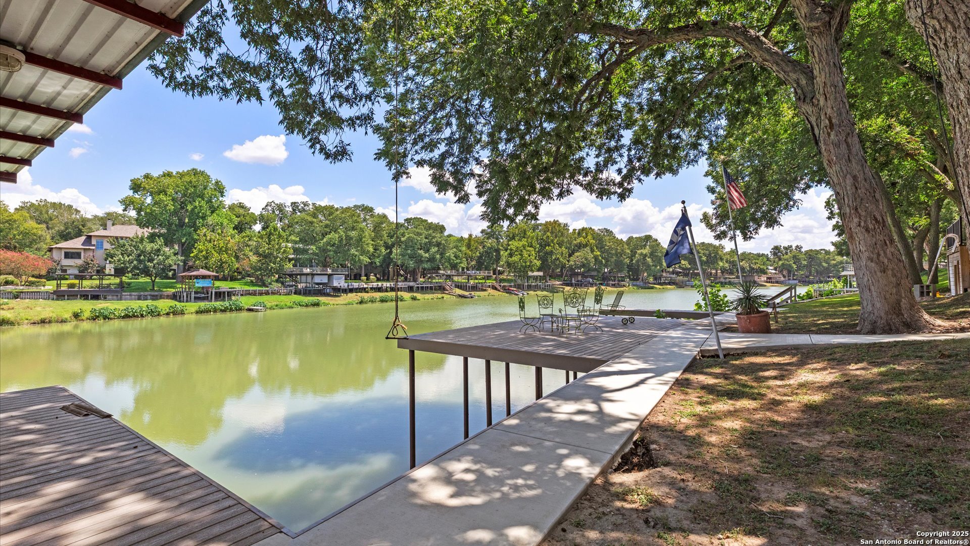 Lake McQueeney waterfront retreat with a spanish flair that encompasses luxury and comfort. Property sits on over half an acre with approx. 100' of prime Lake McQueeney waterfront. A private gated front entry welcomes you to abundant parking area, 2 car Garage, and Storage room. Inside, a split layout offers quiet and privacy with 4 Bedrooms including two true primary suites and 3 full Baths. Warm Saltillo tile flooring throughout. The Kitchen features a farmhouse sink, butcher-block countertops, tiled backsplash and plentiful cabinetry. Inviting Living room with a stone fireplace, built-ins, and antique double front doors. Additional features to include a wet bar, mudroom, and office/flex room. Enjoy water views from almost every room. The backyard is an entertainer's dream: a spacious covered patio and large extended concrete patio flow to the waterfront deck and boathouse, surrounded by lush vegetation. Tile roof. No HOA. Short term vacation rentals allowed.