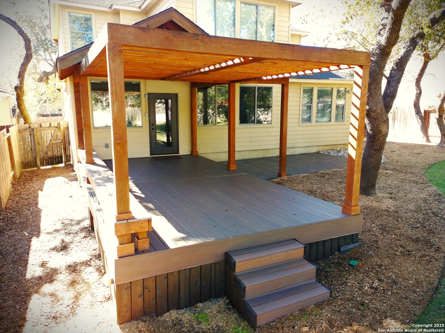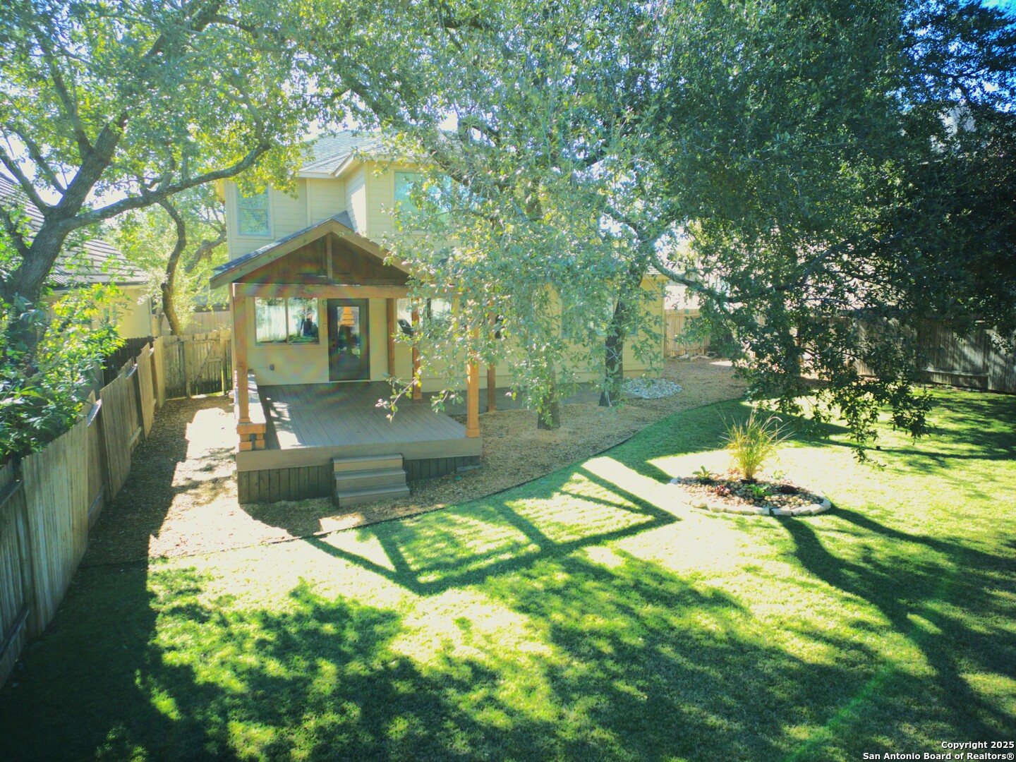 Nestled in the desirable Cliffs at Cibolo subdivision, this beautiful and luxurious home is truly move-in ready, offering an impressive blend of style, comfort, and space. Designed with high ceilings and an open floor plan, the layout creates an inviting atmosphere from the moment you walk in. Oversized tile flooring extends throughout the multiple living and dining areas on the main level, enhancing both durability and visual appeal. The custom island kitchen serves as the heart of the home, featuring stainless steel appliances, granite counters, and generous workspace that makes everyday cooking and entertaining effortless. An office on the main level provides the perfect setting for remote work or quiet reading, while the additional game room and media room give everyone the freedom to spread out and enjoy their own activities. The separate primary suite on the main level offers a peaceful retreat, complete with a spacious en-suite bathroom designed for comfort and relaxation. Upstairs, secondary bedrooms accompany full bathrooms, providing privacy and convenience for family or guests. Outdoor living is equally inviting with a patio and extended decking that overlook the large, lushly landscaped backyard, creating an ideal setting for gatherings or quiet evenings in a private, serene environment. This well-appointed home offers even more features throughout and is perfectly situated near local amenities, major highways, and schools, ensuring both convenience and a vibrant lifestyle. It stands as an exceptional opportunity to enjoy upscale living in a sought-after location.