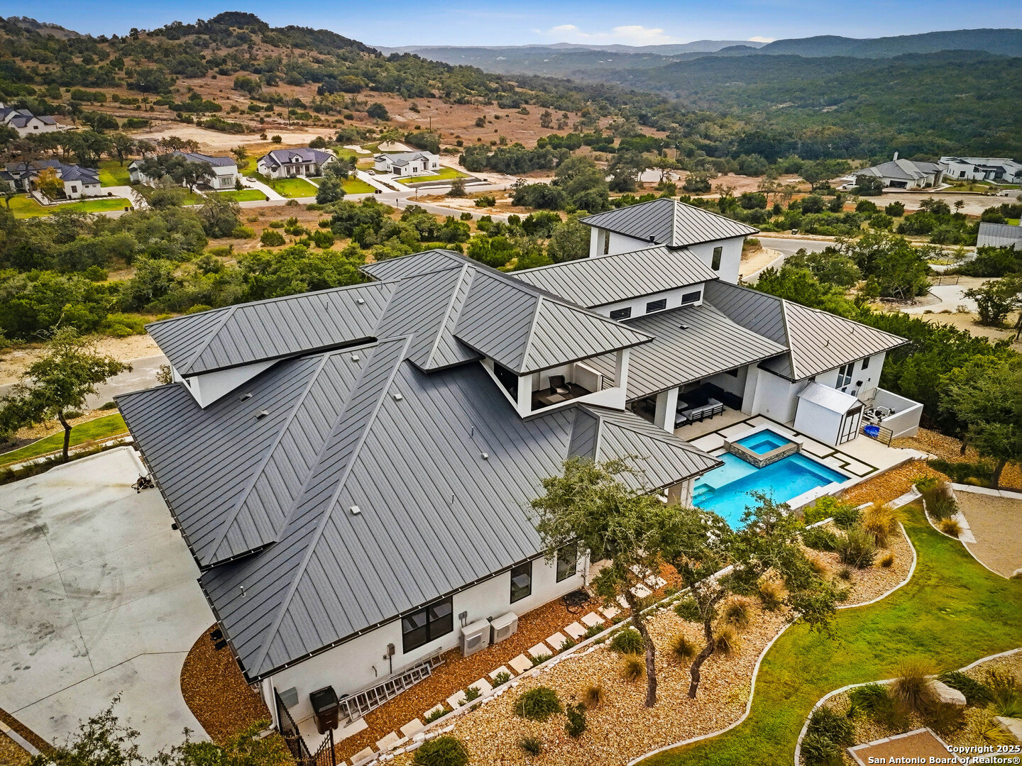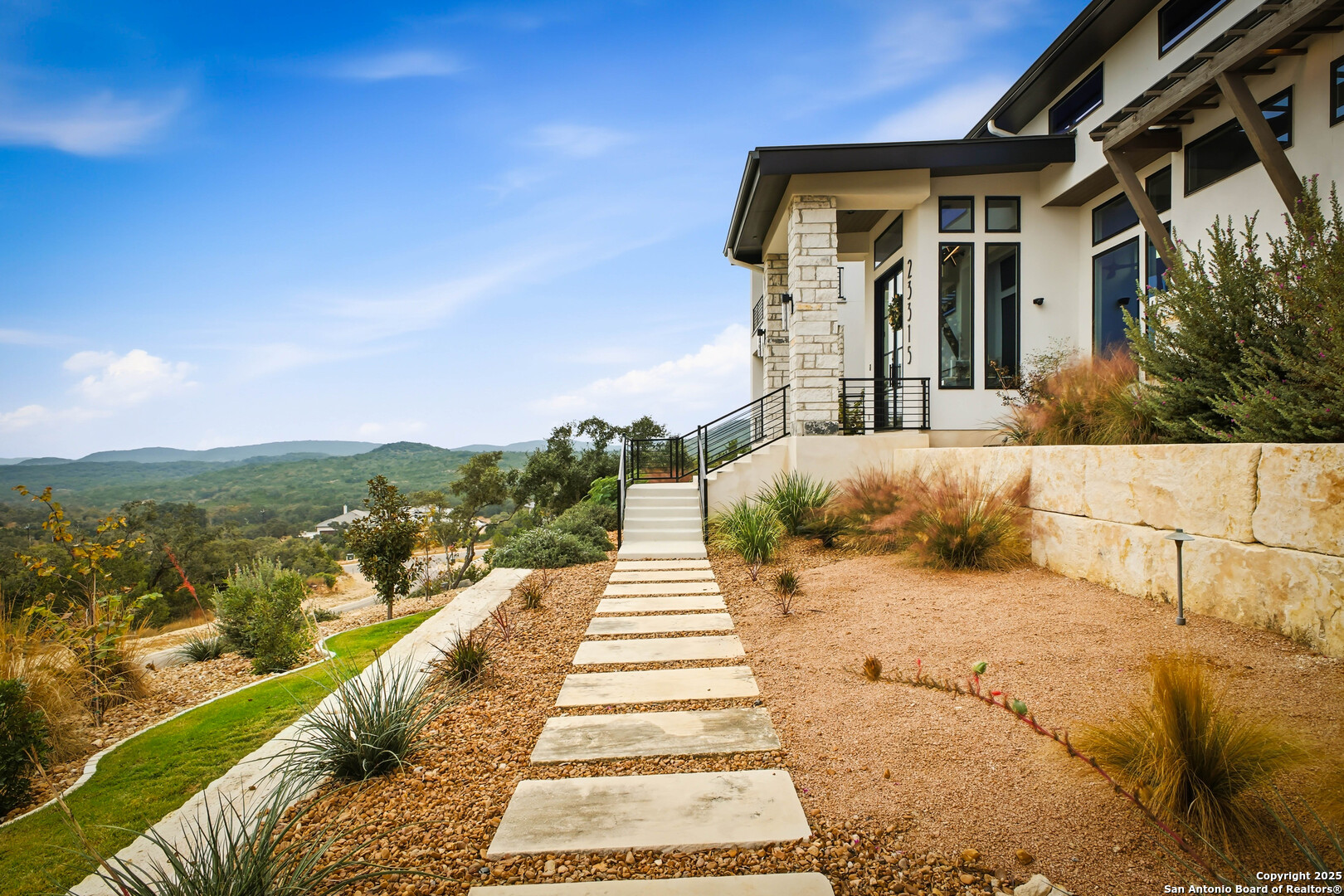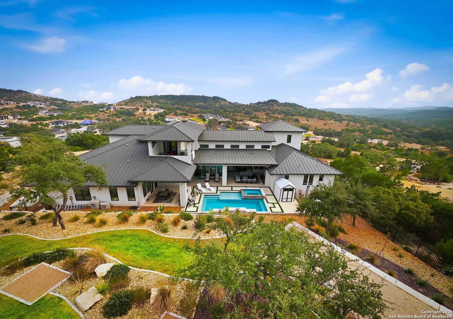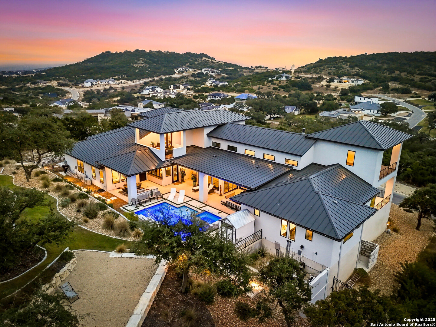 Welcome to 23315 Ebner Ridge, a commanding hilltop residence in the elite gated community of The Canyons at Scenic Loop. Set on a full acre with remarkable privacy, this architectural statement home pairs modern sophistication with the kind of Hill Country beauty that feels both expansive and intimate. A custom landscape and lighting design valued at one hundred seventy five thousand dollars guides you toward ten foot iron doors that open into a grand living space anchored by an eighteen foot tile accent wall and a sixty inch gas fireplace. The gourmet kitchen is a true showpiece with JennAir appliances, a one hundred fifteen bottle glass wine cellar, a six burner gas cooktop, double ovens, a ten foot double island, and Michael Edwards custom cabinetry with a paneled refrigerator that elevates the entire space. An attached casita offers comfort for guests, and a dedicated golf simulator room brings year round recreation to your doorstep. Accordion style bar windows allow you to serve refreshments indoors or out, creating a seamless gathering space that feels effortlessly luxurious. Sixteen foot sliding doors lead to a resort caliber backyard with a modern pool, heated spa, three expansive balconies with sweeping Hill Country views, a full outdoor kitchen, and designated spaces for a future putting green or playscape. Every detail invites relaxation, connection, and celebration. With five bedrooms, four baths, a spacious three car garage, and quick access to La Cantera, The Rim, the Medical Center, UTSA, and major employers, this home offers a lifestyle that is both refined and incredibly convenient. Homes of this caliber rarely become available. Schedule your private showing and experience a level of luxury that inspires your next chapter.