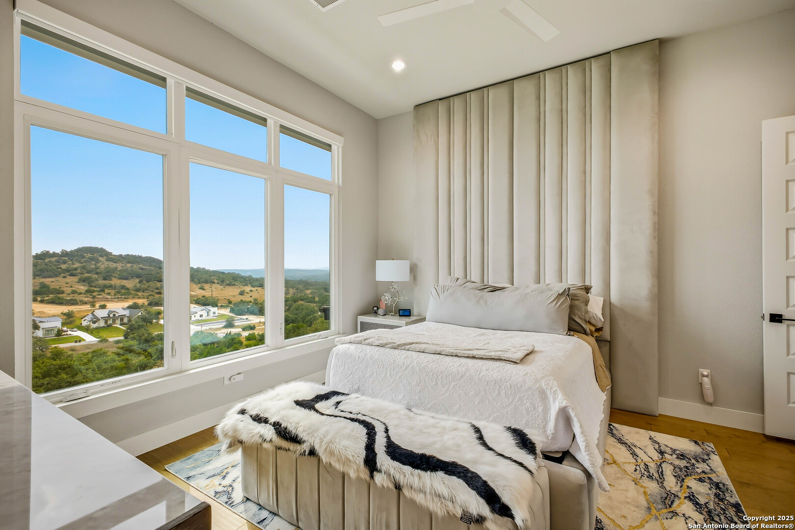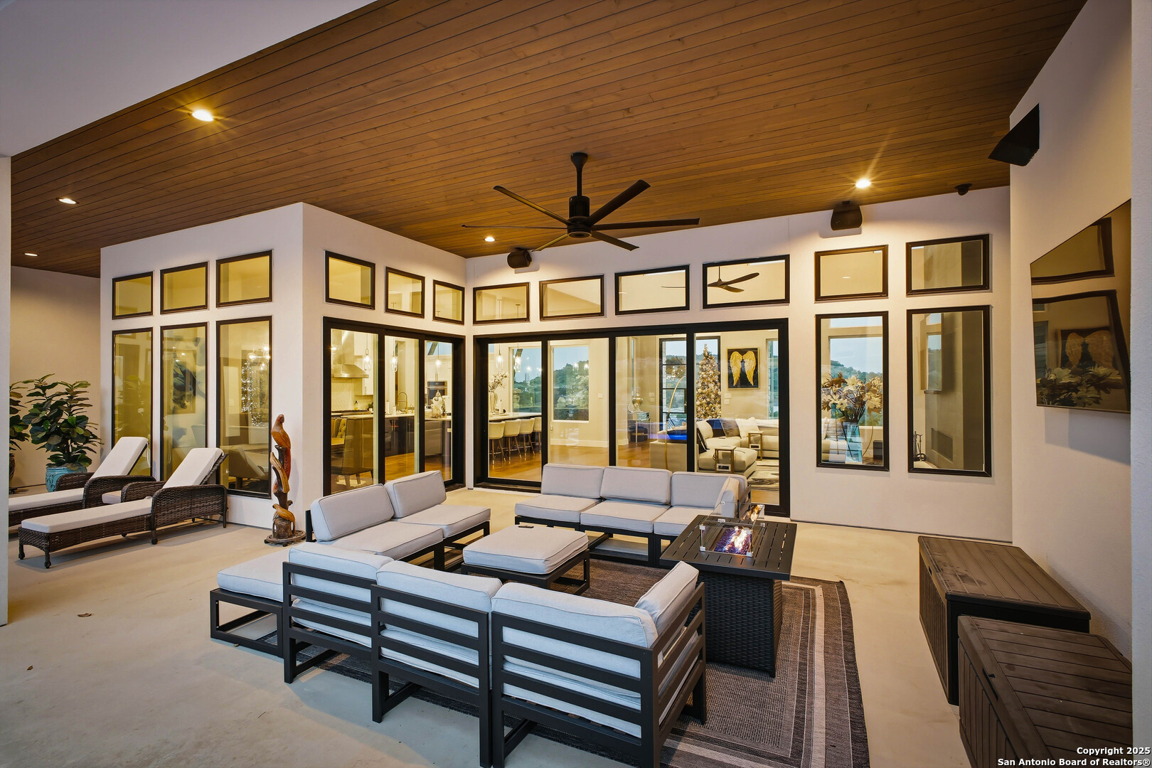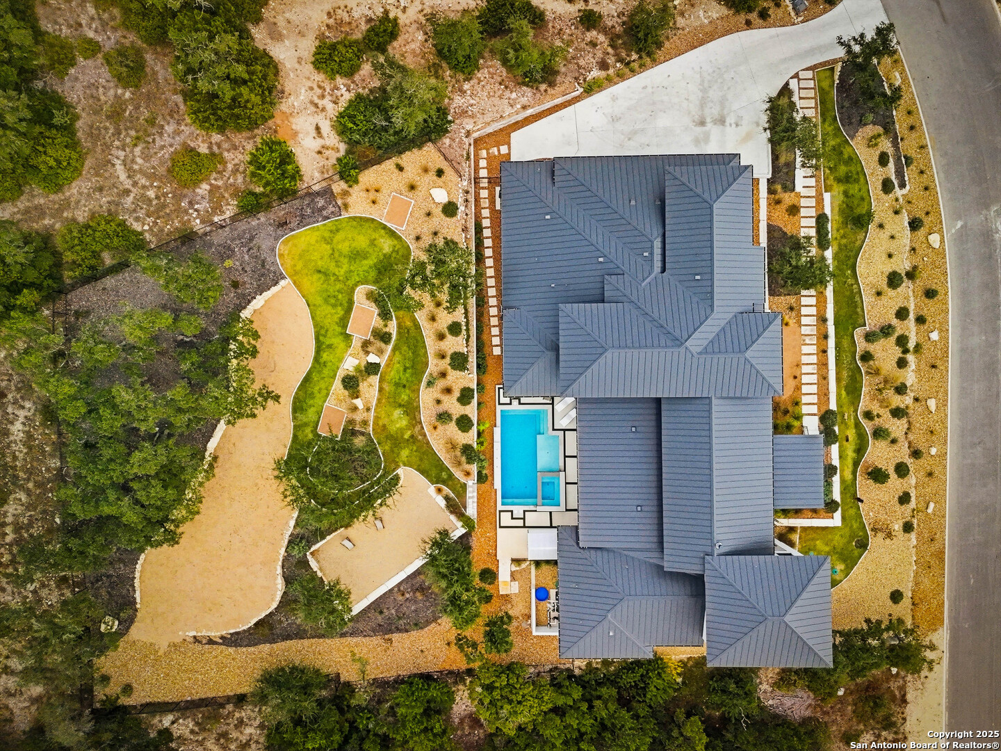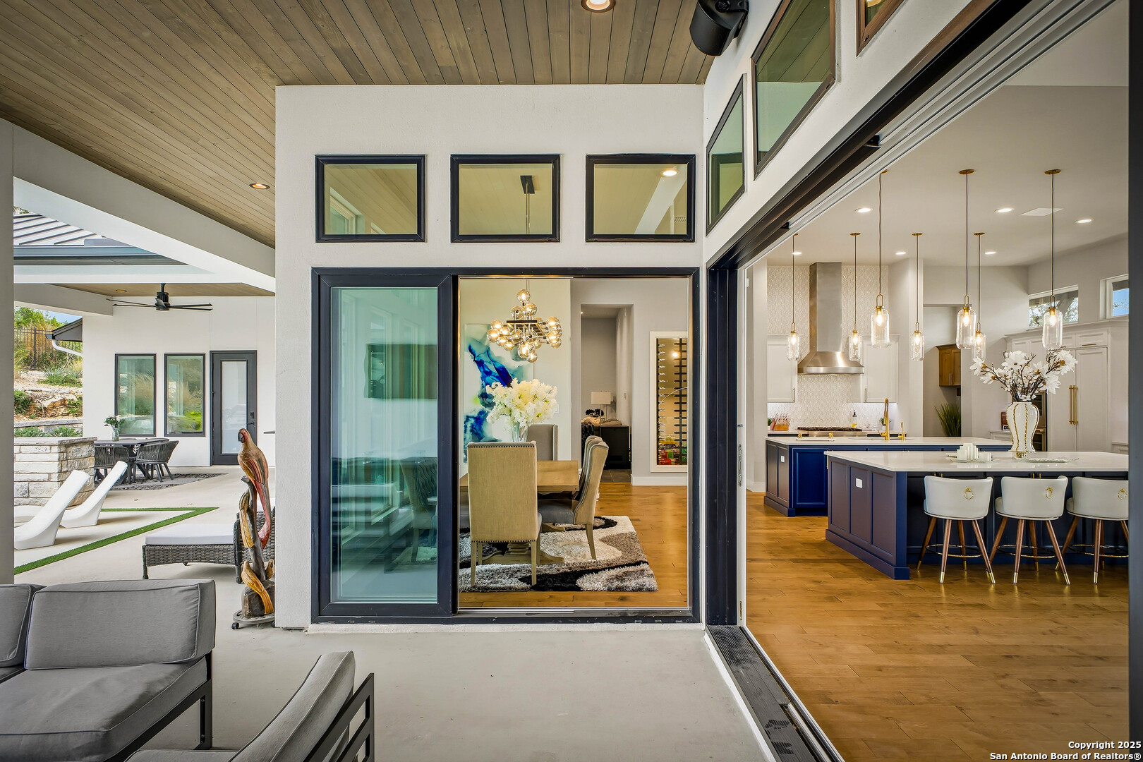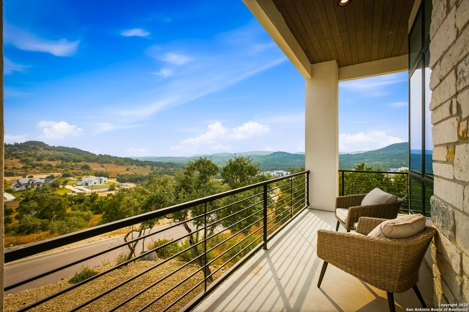 Welcome to 23315 Ebner Ridge, a commanding hilltop residence in the elite gated community of The Canyons at Scenic Loop. Set on a full acre with remarkable privacy, this architectural statement home pairs modern sophistication with the kind of Hill Country beauty that feels both expansive and intimate. A custom landscape and lighting design valued at one hundred seventy five thousand dollars guides you toward ten foot iron doors that open into a grand living space anchored by an eighteen foot tile accent wall and a sixty inch gas fireplace. The gourmet kitchen is a true showpiece with JennAir appliances, a one hundred fifteen bottle glass wine cellar, a six burner gas cooktop, double ovens, a ten foot double island, and Michael Edwards custom cabinetry with a paneled refrigerator that elevates the entire space. An attached casita offers comfort for guests, and a dedicated golf simulator room brings year round recreation to your doorstep. Accordion style bar windows allow you to serve refreshments indoors or out, creating a seamless gathering space that feels effortlessly luxurious. Sixteen foot sliding doors lead to a resort caliber backyard with a modern pool, heated spa, three expansive balconies with sweeping Hill Country views, a full outdoor kitchen, and designated spaces for a future putting green or playscape. Every detail invites relaxation, connection, and celebration. With five bedrooms, four baths, a spacious three car garage, and quick access to La Cantera, The Rim, the Medical Center, UTSA, and major employers, this home offers a lifestyle that is both refined and incredibly convenient. Homes of this caliber rarely become available. Schedule your private showing and experience a level of luxury that inspires your next chapter.