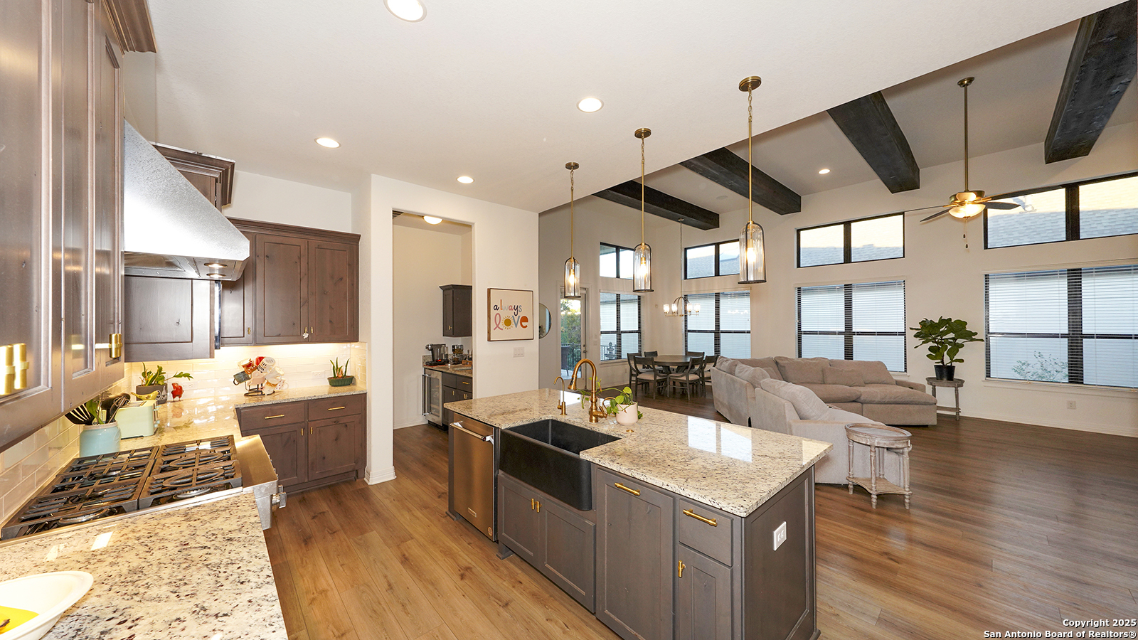 **Open House: Saturday, 11/22, 1-4p & Sunday, 11/23, 12-3p!** Beautiful 3-year-old Sitterle-built luxury home in the desirable Campanas at Cibolo Canyons Resort Community! This stunning 3-bedroom, 3-bath residence sits on a premium greenbelt lot and features a private pool and spa professionally installed by Blue Haven Pools, complete with a transferable warranty. The home also includes solar panels for energy efficiency and savings, and is covered under the builder's 10-year structural warranty for lasting peace of mind. Inside, you'll find elegant upgrades throughout: granite countertops, double ovens, a Blanco Silgranit sink in coal black, cedar-wrapped beams in the living room, brushed gold and nickel fixtures, a quartzite fireplace, wet bar with wine fridge, and a freestanding tub in the primary suite with dual walk-in closets. Built-in surround sound in the living room and back patio, plus a fully equipped outdoor kitchen, make this home perfect for entertaining year-round! The HOA fees cover yard lawn care and maintenance, as well as alarm system monitoring-offering a truly low-maintenance lifestyle with added peace of mind. With motivated sellers offering $10,000 in seller concessions, an assumable VA loan, and a prime location in one of San Antonio's premier gated communities, this home offers both comfort and value! Schedule your showing today and experience all this beautiful home has to offer!