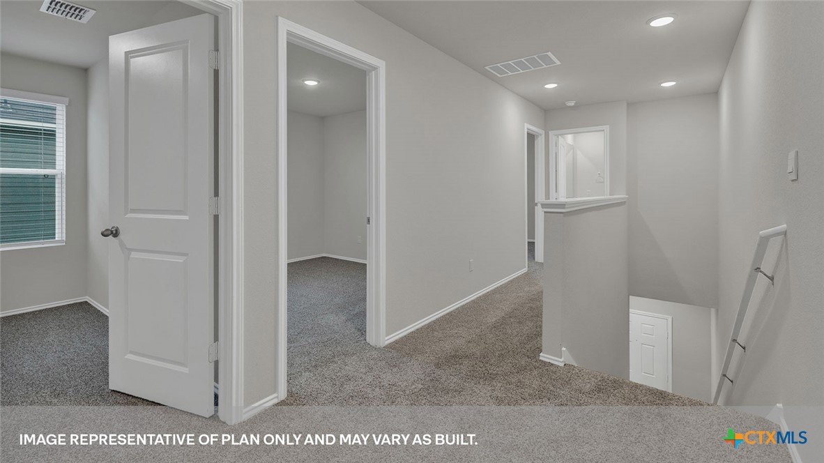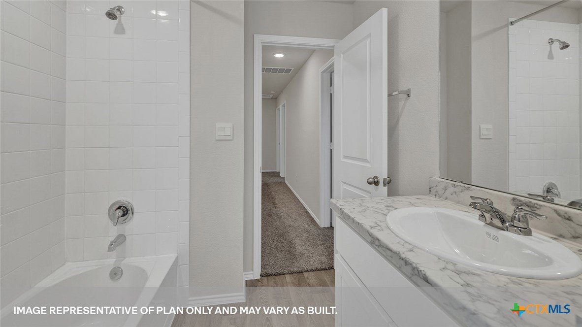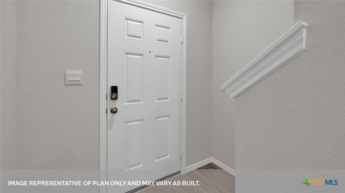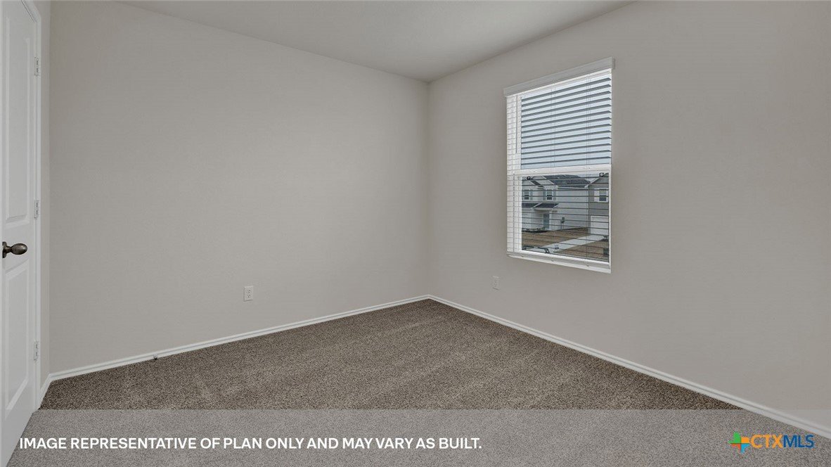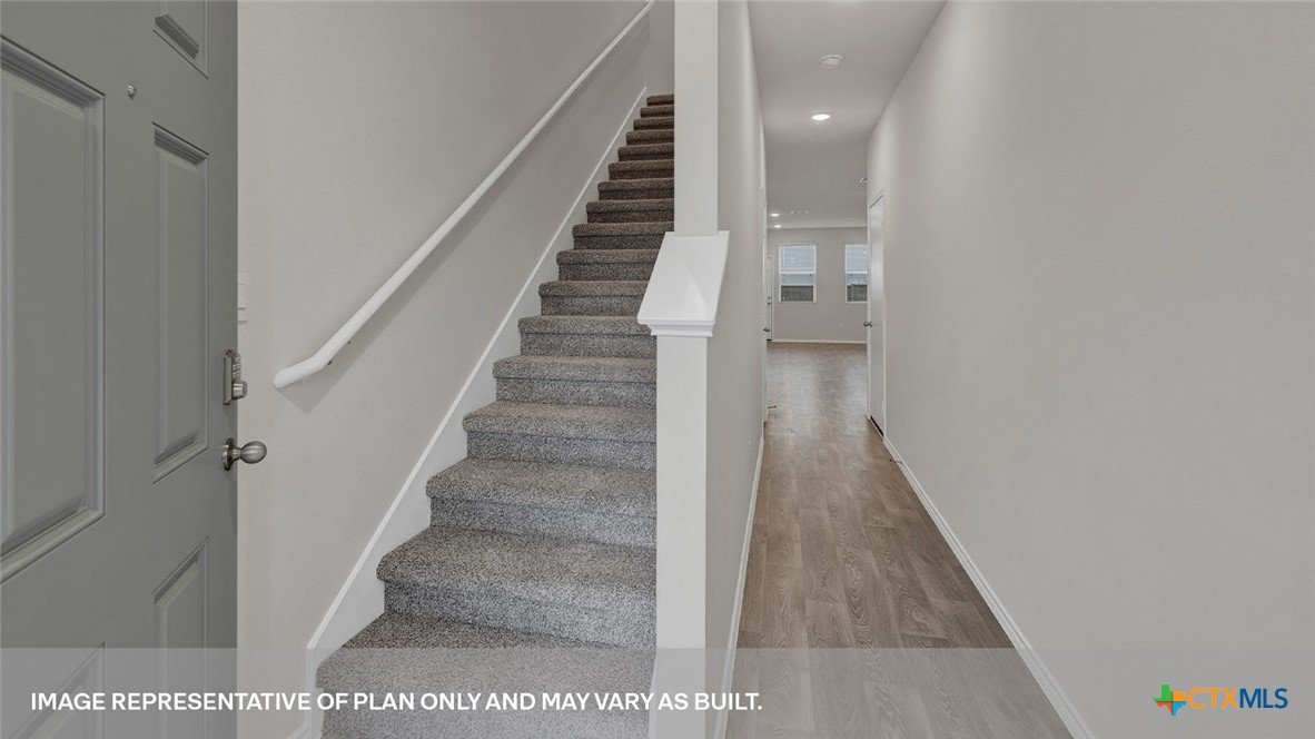 MOVE IN READY! The Altaria floorplan in Bollinger, is one of our communities in Maxwell, Texas. This two-story home has 4 bedrooms, 2.5 bathrooms and a 1 car garage across 1,543 square feet of living space. Our homes in Bollinger feature our modern farmhouse exterior. As you enter the home from the covered front porch, you’ll pass through the foyer and hallway to the large open living space. The kitchen faces out to the dining room and family room, allowing for conversations to flow easily across the space as you make dinner and unwind from your day. The kitchen features laminate countertops with 50/50 stainless steel drop-in bowl, 4” laminate backsplash, pantry closet, 36” upper cabinets and stainless-steel appliances, including a gas range. The powder room is off the front hallway to complete the downstairs space. Moving upstairs, you’ll find the 4 bedrooms and 2 full bathrooms. The primary bedroom is located at the rear of the second floor and includes an attached bathroom. Enjoy the walk-in shower, laminate countertop, and a walk-in closet inside the primary bathroom. The secondary bedrooms include closets with shelving and the hall bathroom includes a shower/tub combination. Whether you use these rooms as an office, child’s room or guest room, there is amble space for work, sleep, and play. The Altaria includes vinyl flooring throughout the common areas of the home, and carpet in the bedrooms. All our new homes feature Bermuda sod, an irrigation system in the front and back yard, and a 6’ privacy fence around the back yard. This home comes with our America’s Smart Home base package, which includes the Amazon Echo Pop, Front Doorbell, Front Door Deadbolt Lock, Home Hub, Thermostat, and Deako® Smart Switches.
