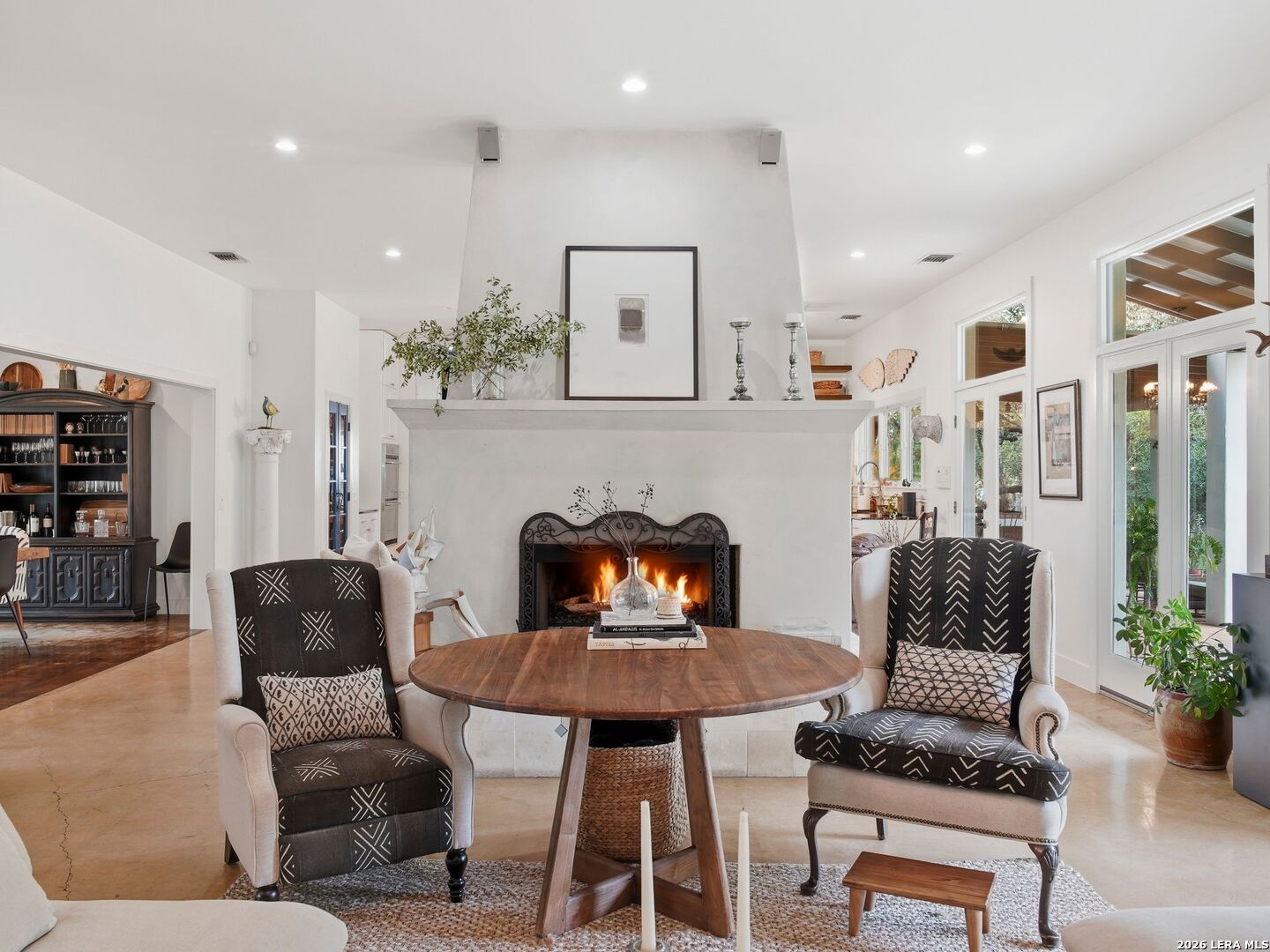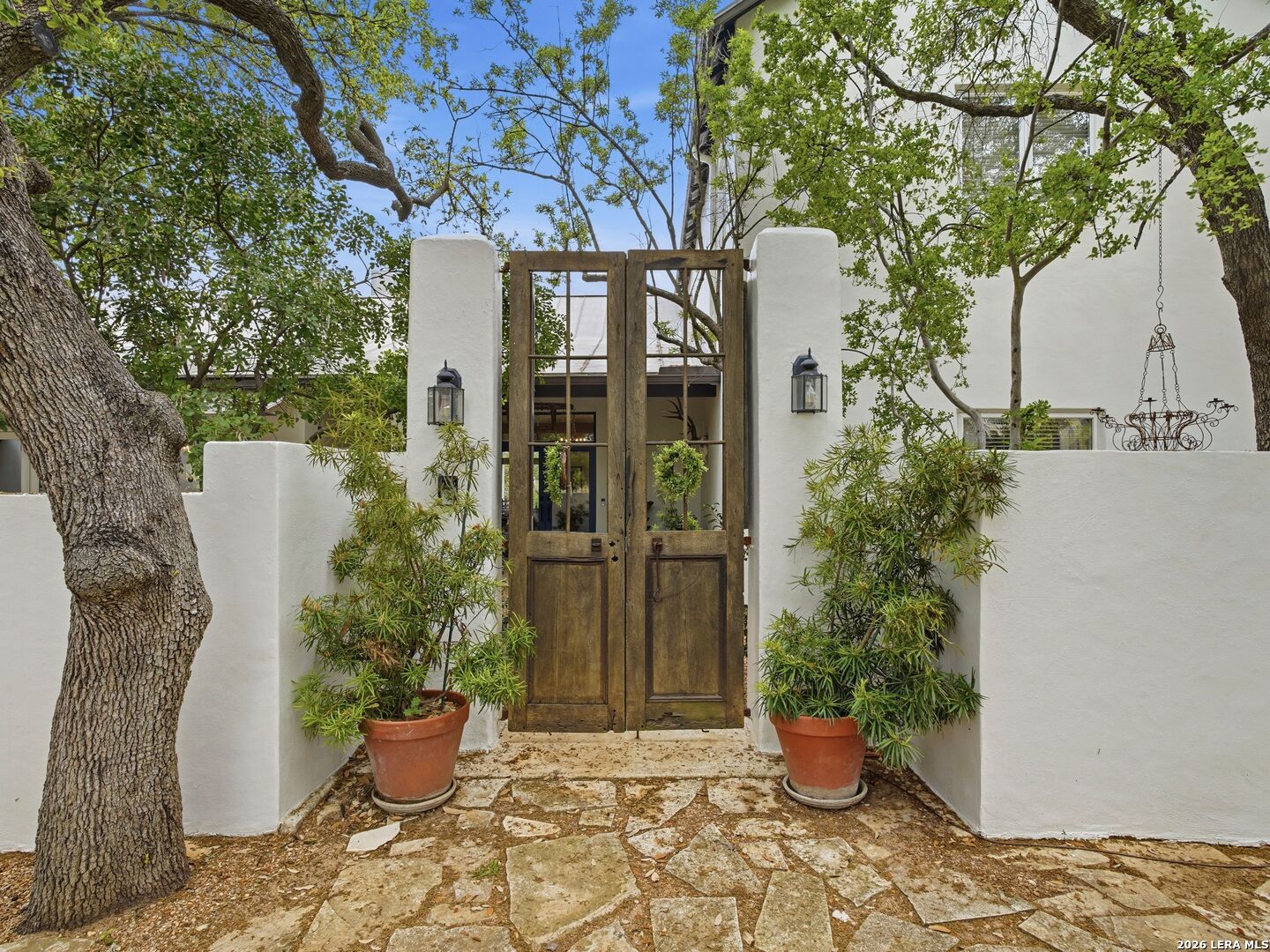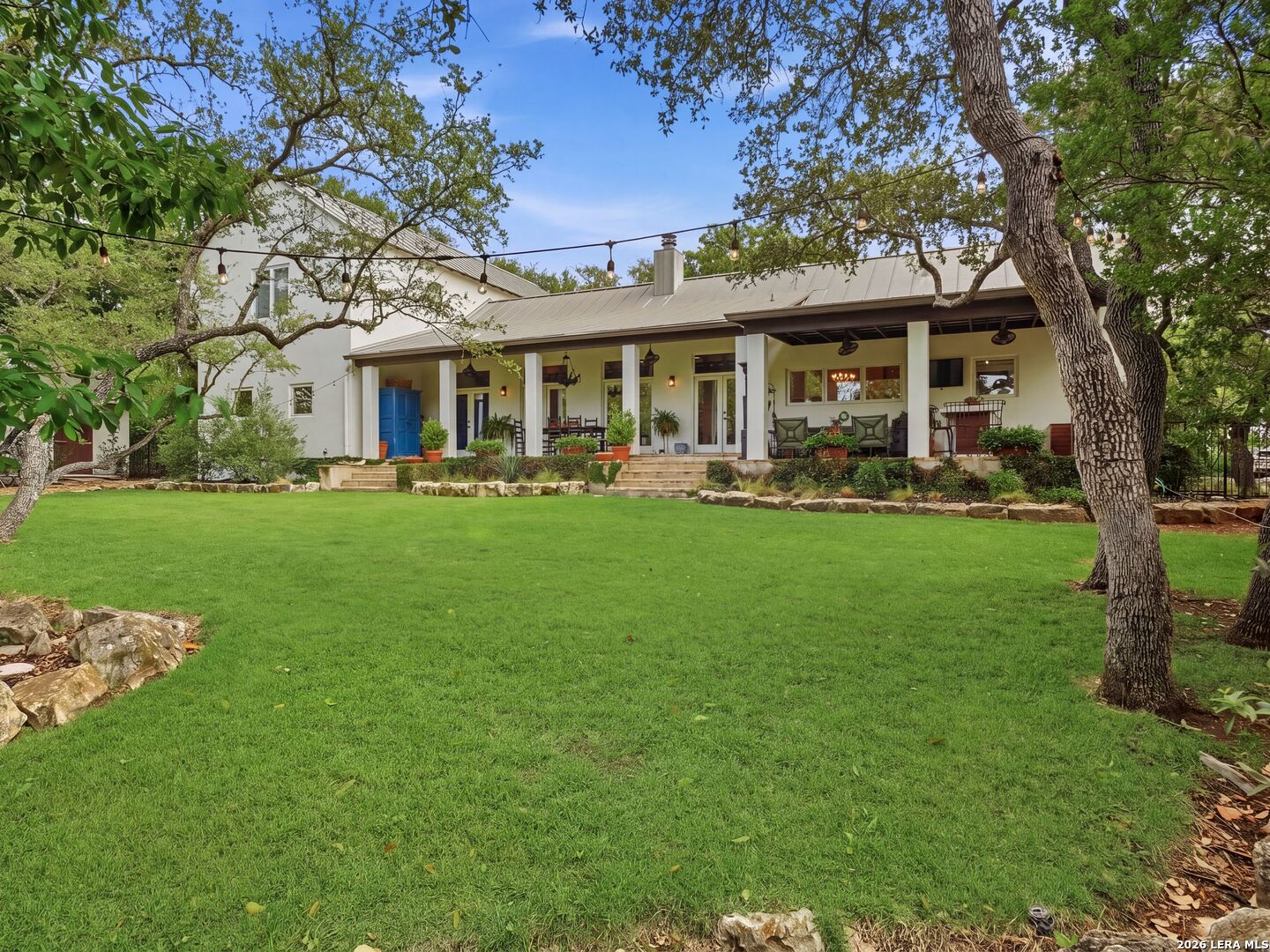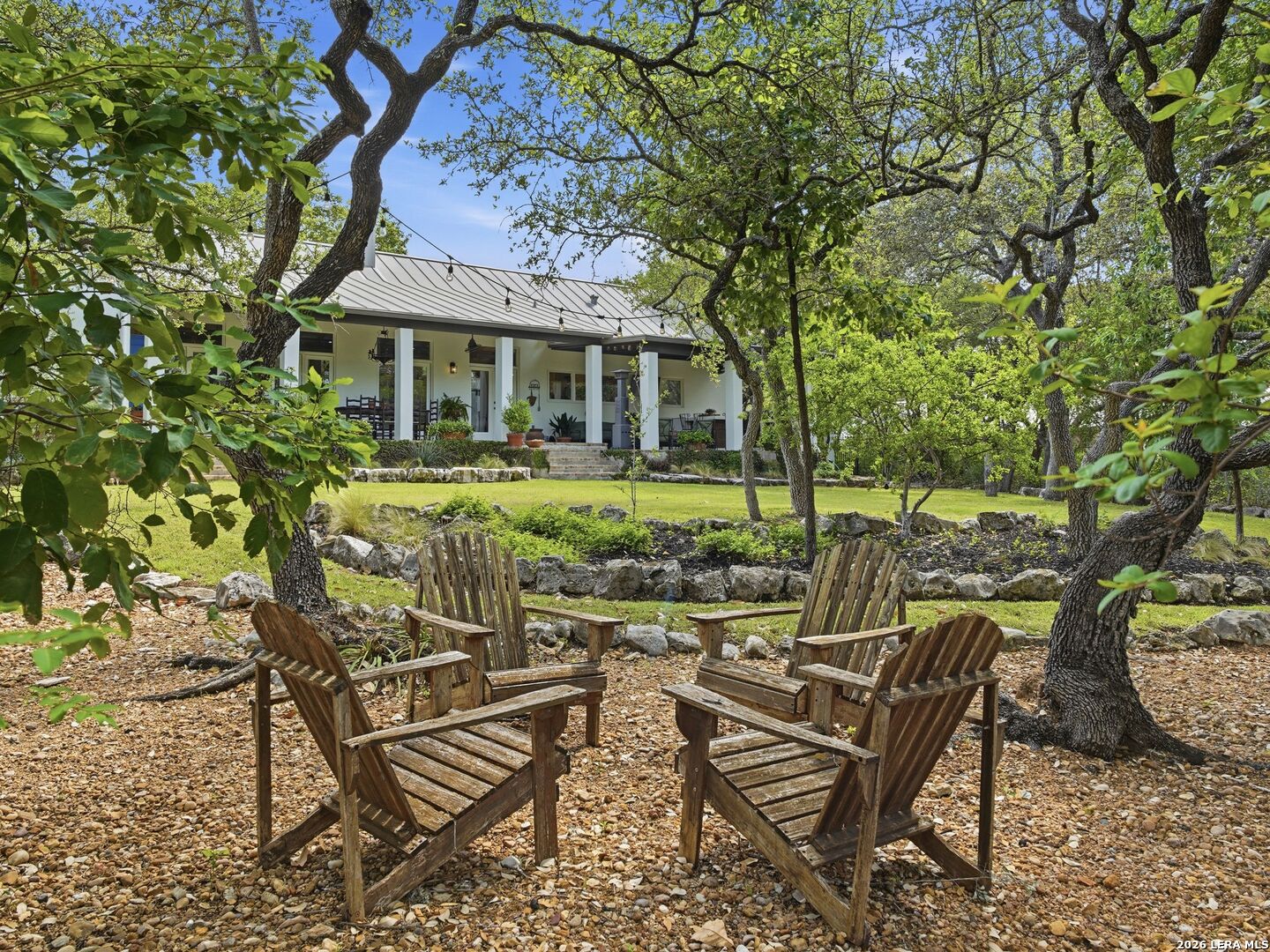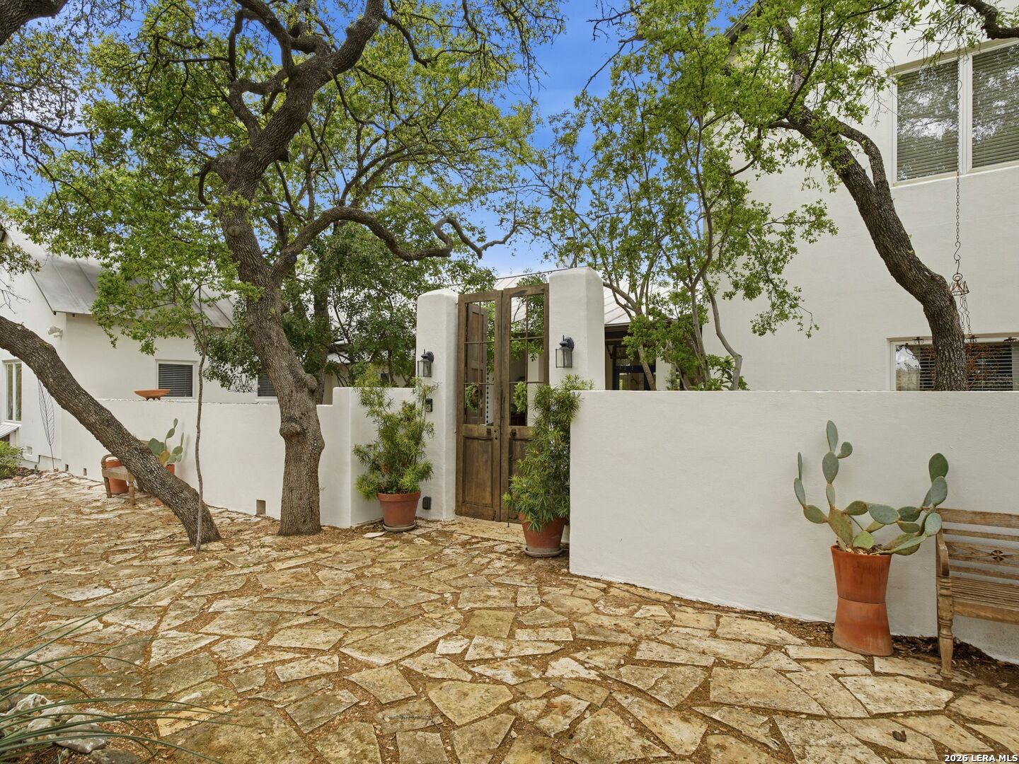 Custom-designed by recognized architect Isabel Mijangos, this exceptional Spanish-inspired estate blends timeless character with refined modern living, set on a rare 1.02-acre homesite shaded by mature oak trees. Encompassing 3,576 square feet, this 3-bedroom, 2 full and 1 half bath residence offers a thoughtful, flowing layout with a 3-car garage and an unmistakable sense of place. A graceful stucco exterior and striking metal roof set the tone, while antique wood doors welcome you into a private entry courtyard complete with a covered porch and outdoor fireplace, creating a warm and intimate first impression. Glass doors lead into an expansive living room where 10-foot ceilings, concrete floors, and a dramatic wall of windows frame serene backyard views. A two-sided fireplace anchors both the main living area and a secondary living space, seamlessly connecting to a generous dining room with doors that open back to the front courtyard perfect for effortless indoor-outdoor entertaining. The kitchen is both stylish and functional, featuring open wood shelving, granite countertops, a breakfast bar, stainless steel appliances, and a sink positioned beneath windows overlooking the grounds. Antique doors enclose the pantry, adding a layer of character and charm. A beautifully appointed office with a full wall of custom bookcases and cabinetry provides an inspiring workspace, while an elegant powder bath serves guests with ease. The downstairs primary suite is a true retreat, highlighted by wood-beamed ceilings, dual walk-in closets, and a spa-like bath with double vanities, quartz counters, a garden tub crowned by a chandelier, and a separate glass-enclosed tiled shower with dual heads. Upstairs, a spacious loft offers flexibility for living or study, alongside two generously sized bedrooms, each with walk-in closets, connected by a well-designed Jack-and-Jill bath. Outdoors, the property unfolds into an extraordinary backyard designed for both relaxation and entertaining. A large covered porch with brick flooring and a fully equipped outdoor kitchen overlooks the grounds, while a fire pit, workshop, rainwater catchment cistern, and raised garden beds complete this private, resort-style setting. A rare opportunity to own a one-of-a-kind architectural home that captures the essence of Texas living with Spanish elegance.