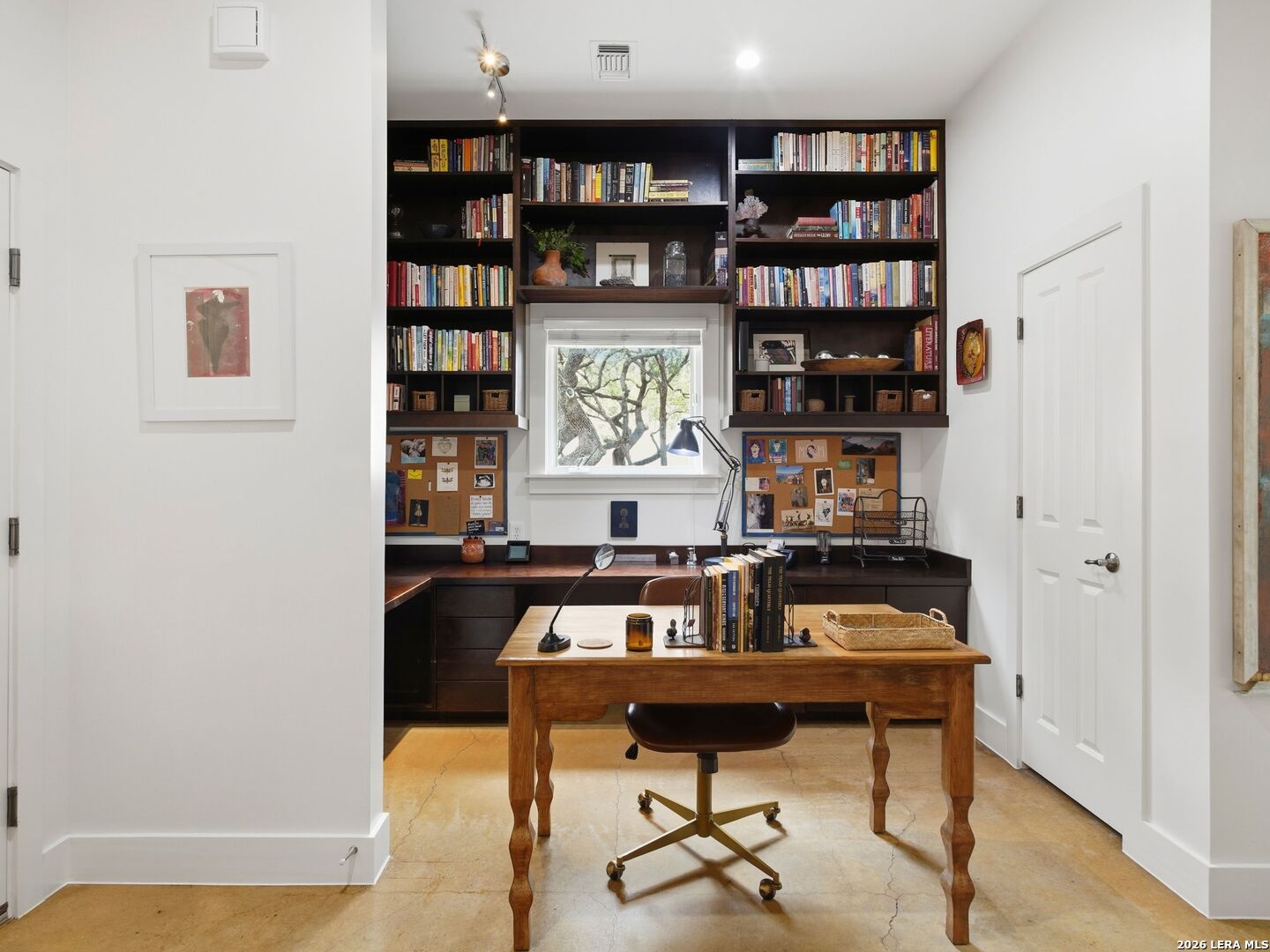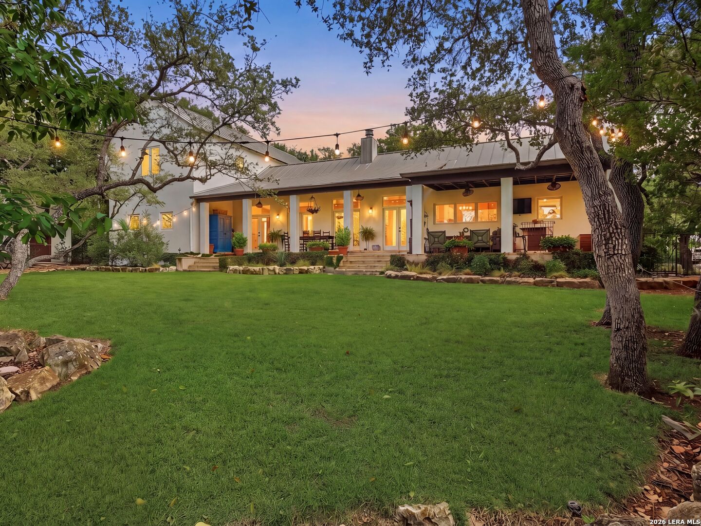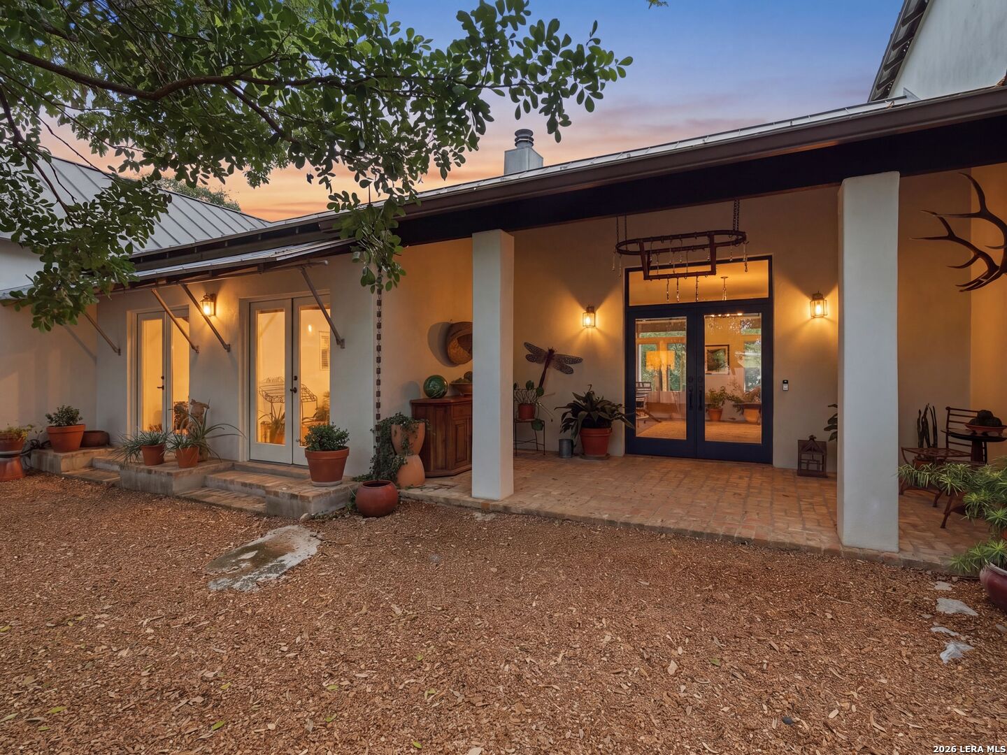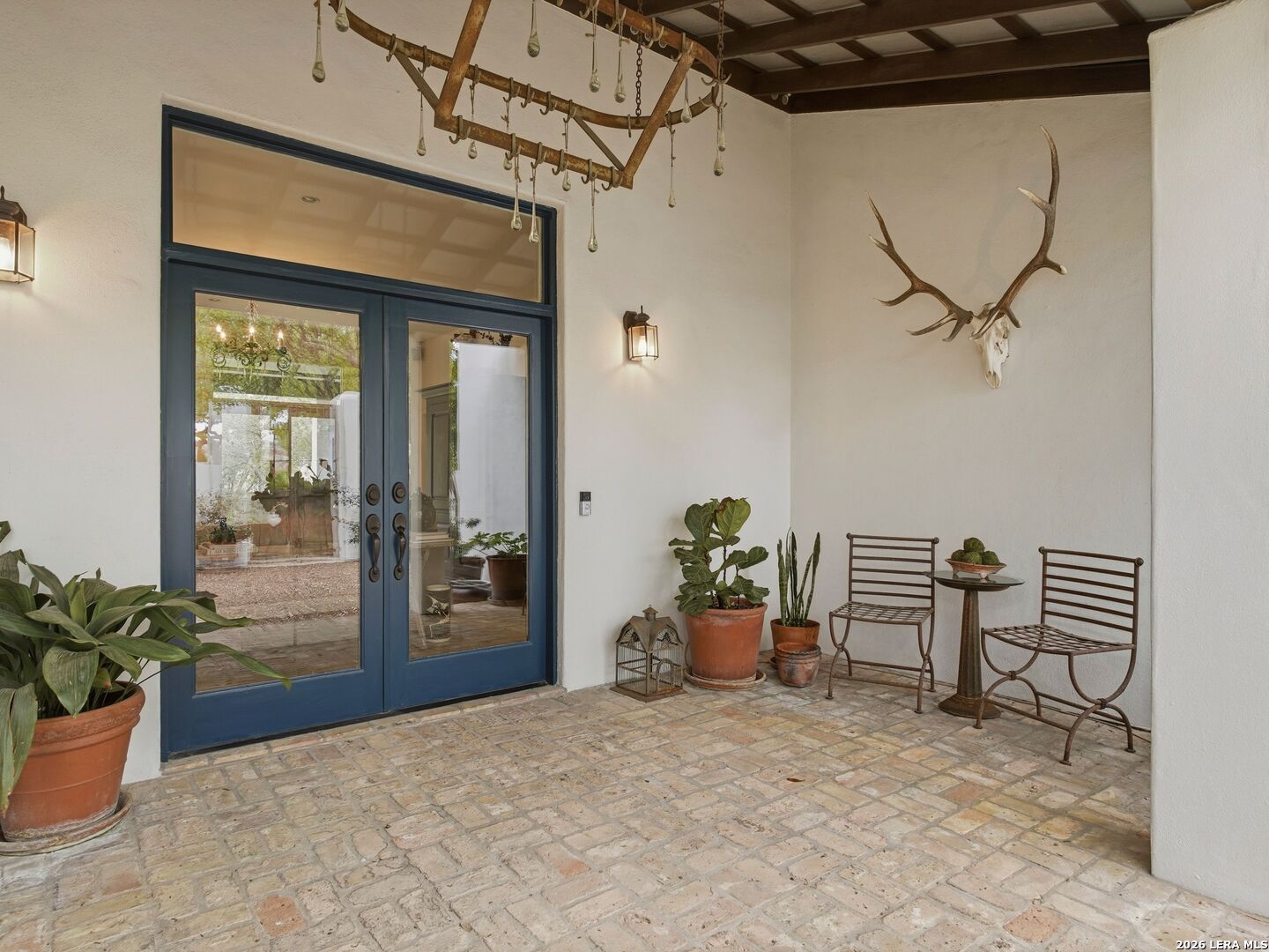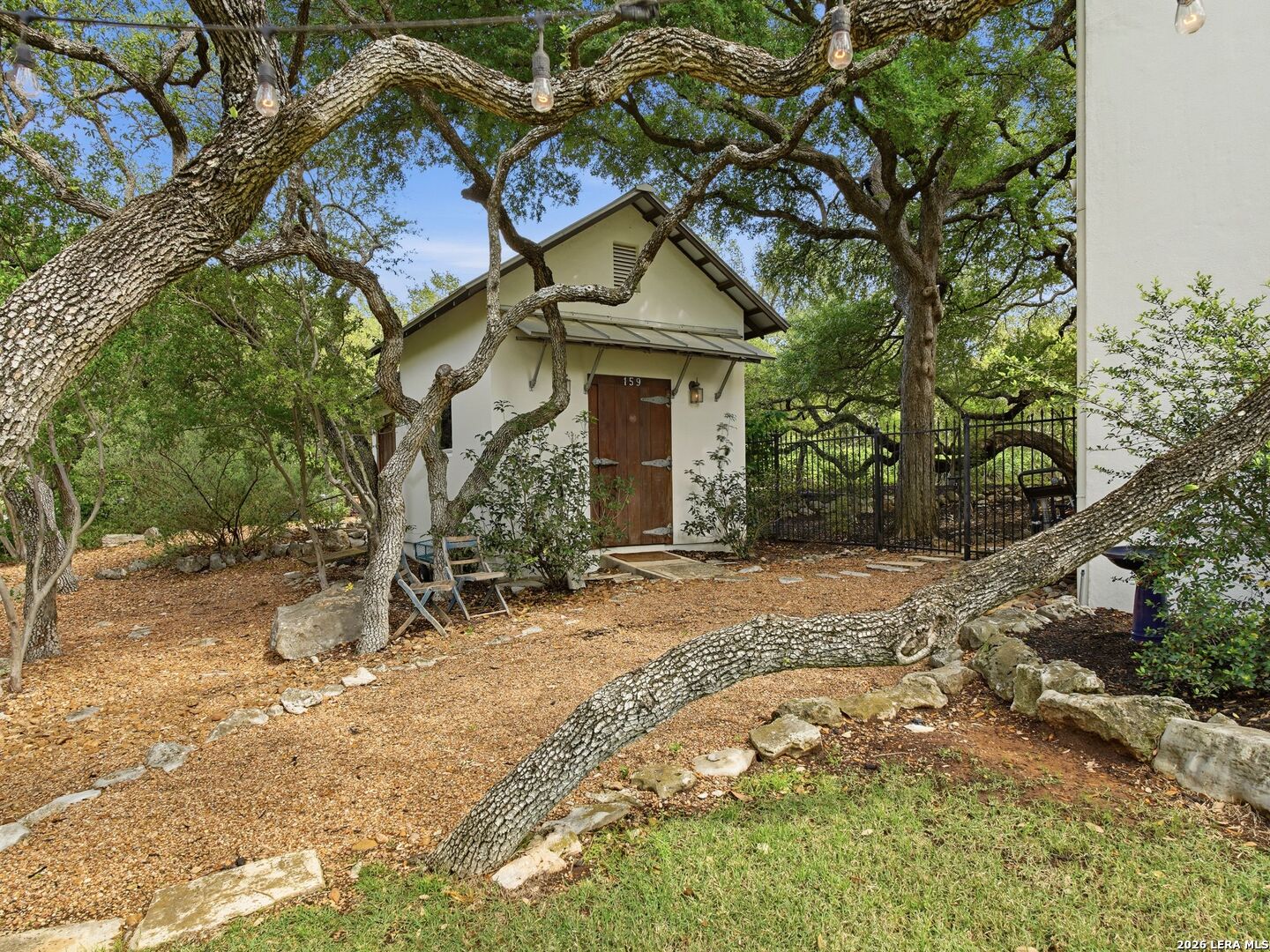 Custom-designed by recognized architect Isabel Mijangos, this exceptional Spanish-inspired estate blends timeless character with refined modern living, set on a rare 1.02-acre homesite shaded by mature oak trees. Encompassing 3,576 square feet, this 3-bedroom, 2 full and 1 half bath residence offers a thoughtful, flowing layout with a 3-car garage and an unmistakable sense of place. A graceful stucco exterior and striking metal roof set the tone, while antique wood doors welcome you into a private entry courtyard complete with a covered porch and outdoor fireplace, creating a warm and intimate first impression. Glass doors lead into an expansive living room where 10-foot ceilings, concrete floors, and a dramatic wall of windows frame serene backyard views. A two-sided fireplace anchors both the main living area and a secondary living space, seamlessly connecting to a generous dining room with doors that open back to the front courtyard perfect for effortless indoor-outdoor entertaining. The kitchen is both stylish and functional, featuring open wood shelving, granite countertops, a breakfast bar, stainless steel appliances, and a sink positioned beneath windows overlooking the grounds. Antique doors enclose the pantry, adding a layer of character and charm. A beautifully appointed office with a full wall of custom bookcases and cabinetry provides an inspiring workspace, while an elegant powder bath serves guests with ease. The downstairs primary suite is a true retreat, highlighted by wood-beamed ceilings, dual walk-in closets, and a spa-like bath with double vanities, quartz counters, a garden tub crowned by a chandelier, and a separate glass-enclosed tiled shower with dual heads. Upstairs, a spacious loft offers flexibility for living or study, alongside two generously sized bedrooms, each with walk-in closets, connected by a well-designed Jack-and-Jill bath. Outdoors, the property unfolds into an extraordinary backyard designed for both relaxation and entertaining. A large covered porch with brick flooring and a fully equipped outdoor kitchen overlooks the grounds, while a fire pit, workshop, rainwater catchment cistern, and raised garden beds complete this private, resort-style setting. A rare opportunity to own a one-of-a-kind architectural home that captures the essence of Texas living with Spanish elegance.