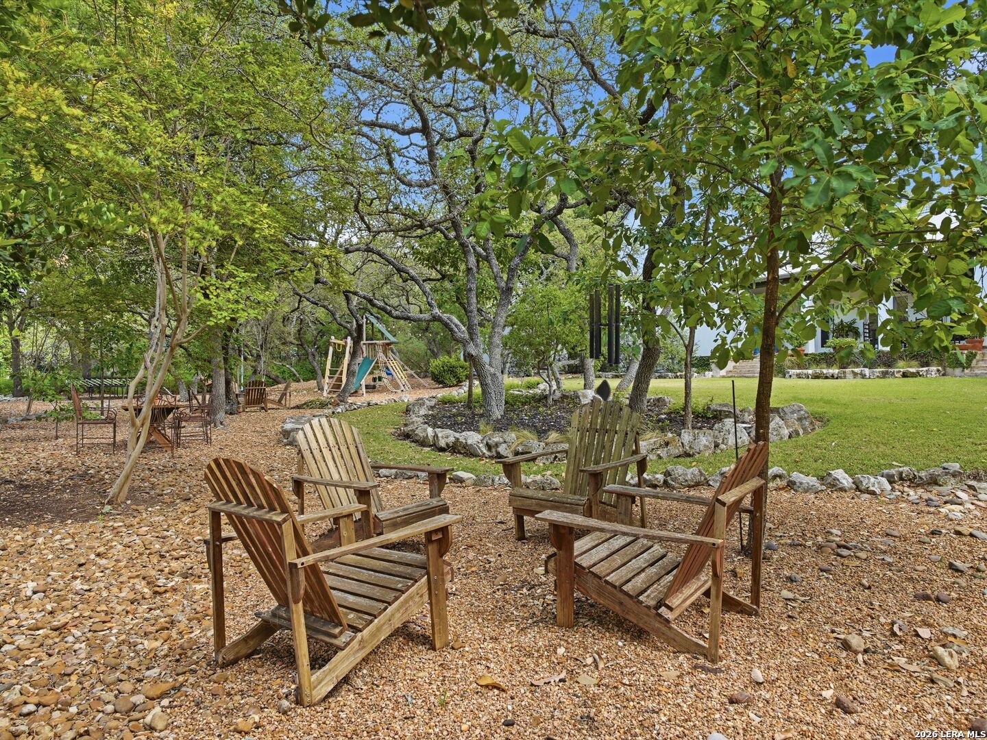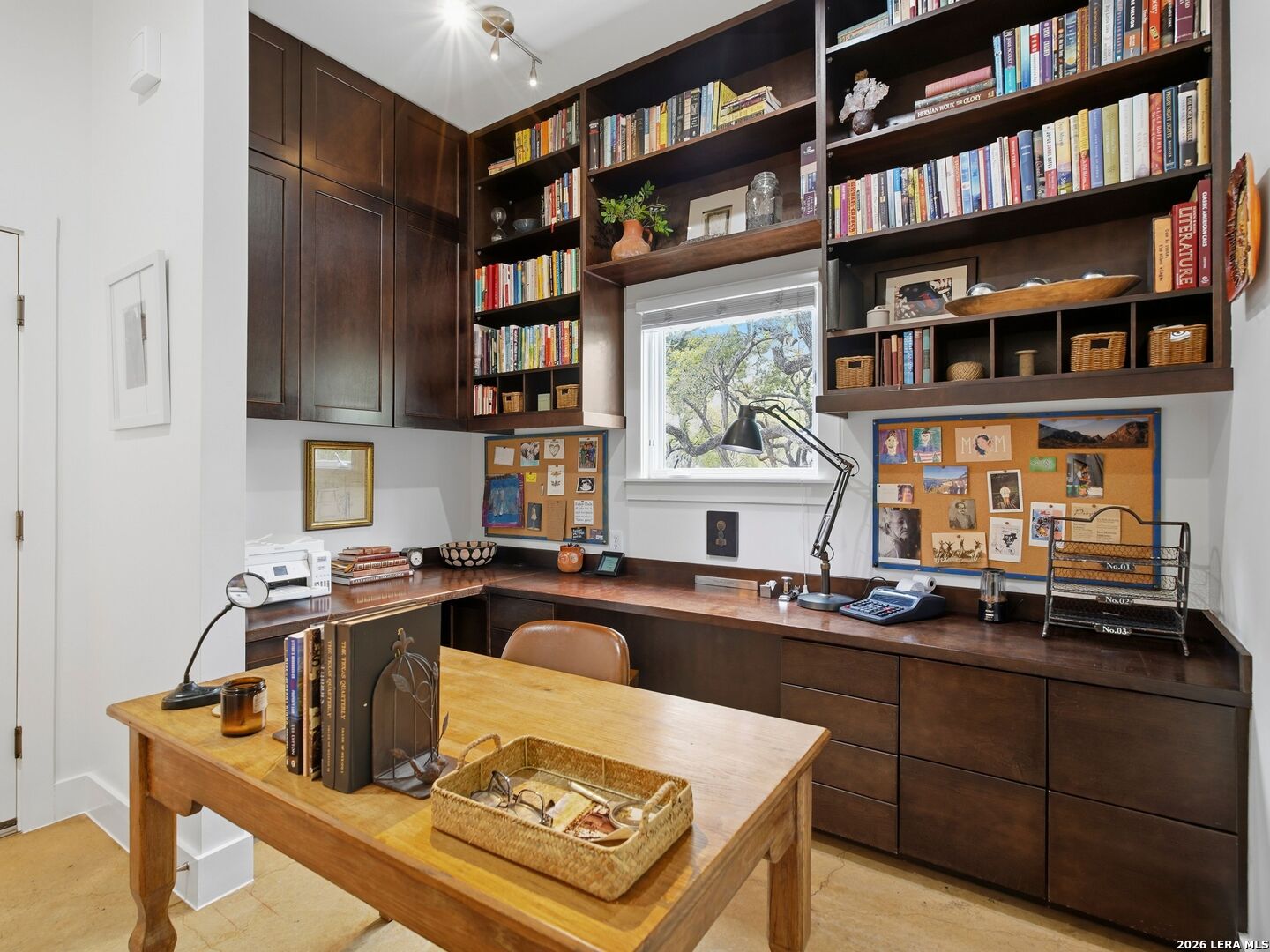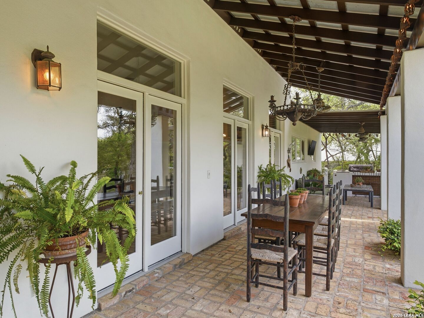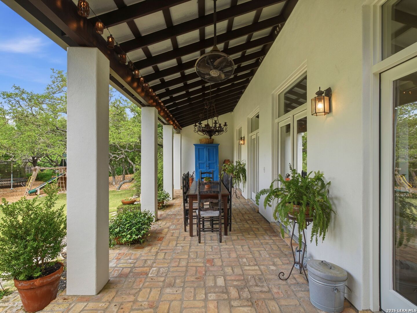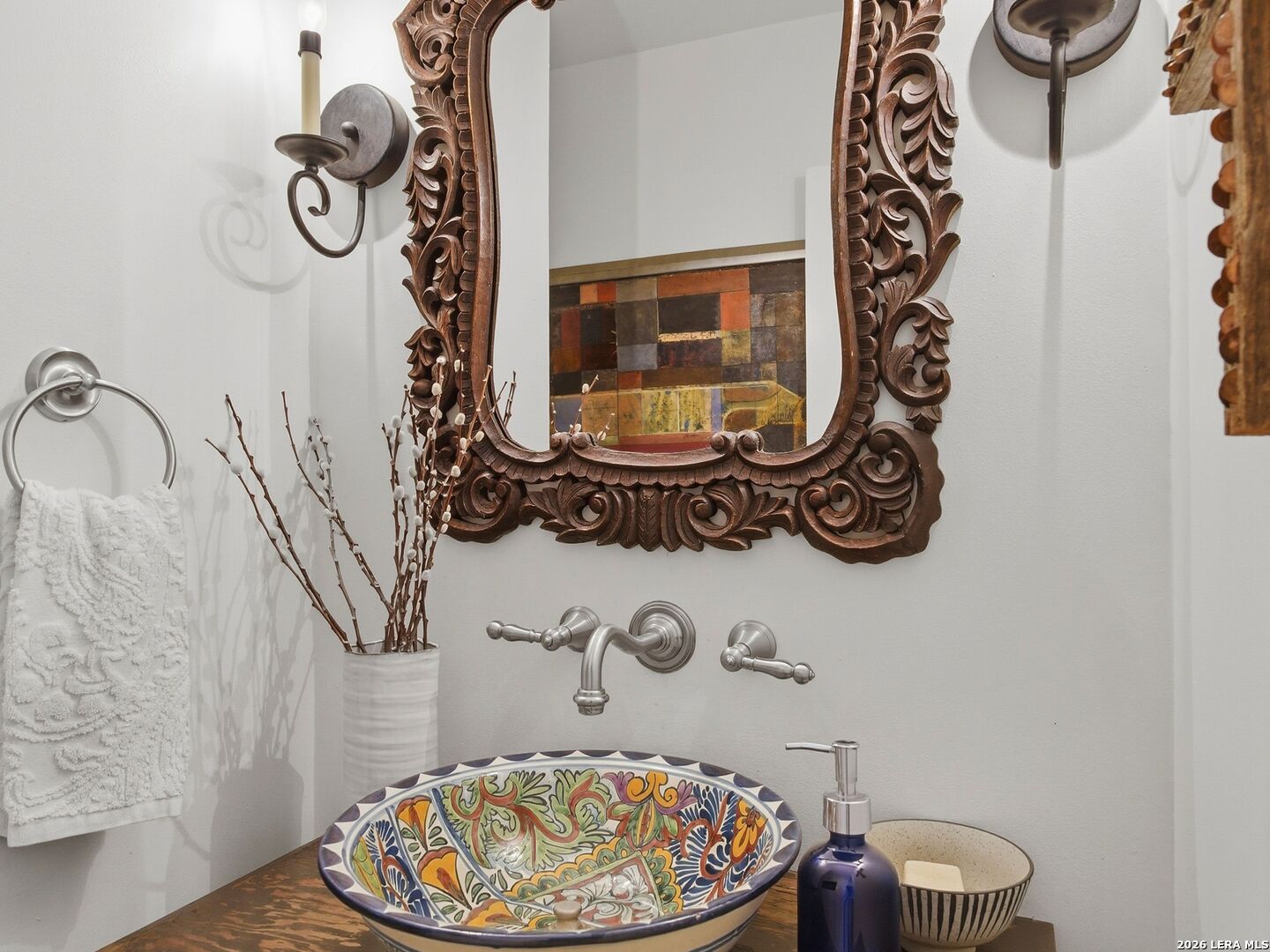 Custom-designed by recognized architect Isabel Mijangos, this exceptional Spanish-inspired estate blends timeless character with refined modern living, set on a rare 1.02-acre homesite shaded by mature oak trees. Encompassing 3,576 square feet, this 3-bedroom, 2 full and 1 half bath residence offers a thoughtful, flowing layout with a 3-car garage and an unmistakable sense of place. A graceful stucco exterior and striking metal roof set the tone, while antique wood doors welcome you into a private entry courtyard complete with a covered porch and outdoor fireplace, creating a warm and intimate first impression. Glass doors lead into an expansive living room where 10-foot ceilings, concrete floors, and a dramatic wall of windows frame serene backyard views. A two-sided fireplace anchors both the main living area and a secondary living space, seamlessly connecting to a generous dining room with doors that open back to the front courtyard perfect for effortless indoor-outdoor entertaining. The kitchen is both stylish and functional, featuring open wood shelving, granite countertops, a breakfast bar, stainless steel appliances, and a sink positioned beneath windows overlooking the grounds. Antique doors enclose the pantry, adding a layer of character and charm. A beautifully appointed office with a full wall of custom bookcases and cabinetry provides an inspiring workspace, while an elegant powder bath serves guests with ease. The downstairs primary suite is a true retreat, highlighted by wood-beamed ceilings, dual walk-in closets, and a spa-like bath with double vanities, quartz counters, a garden tub crowned by a chandelier, and a separate glass-enclosed tiled shower with dual heads. Upstairs, a spacious loft offers flexibility for living or study, alongside two generously sized bedrooms, each with walk-in closets, connected by a well-designed Jack-and-Jill bath. Outdoors, the property unfolds into an extraordinary backyard designed for both relaxation and entertaining. A large covered porch with brick flooring and a fully equipped outdoor kitchen overlooks the grounds, while a fire pit, workshop, rainwater catchment cistern, and raised garden beds complete this private, resort-style setting. A rare opportunity to own a one-of-a-kind architectural home that captures the essence of Texas living with Spanish elegance.