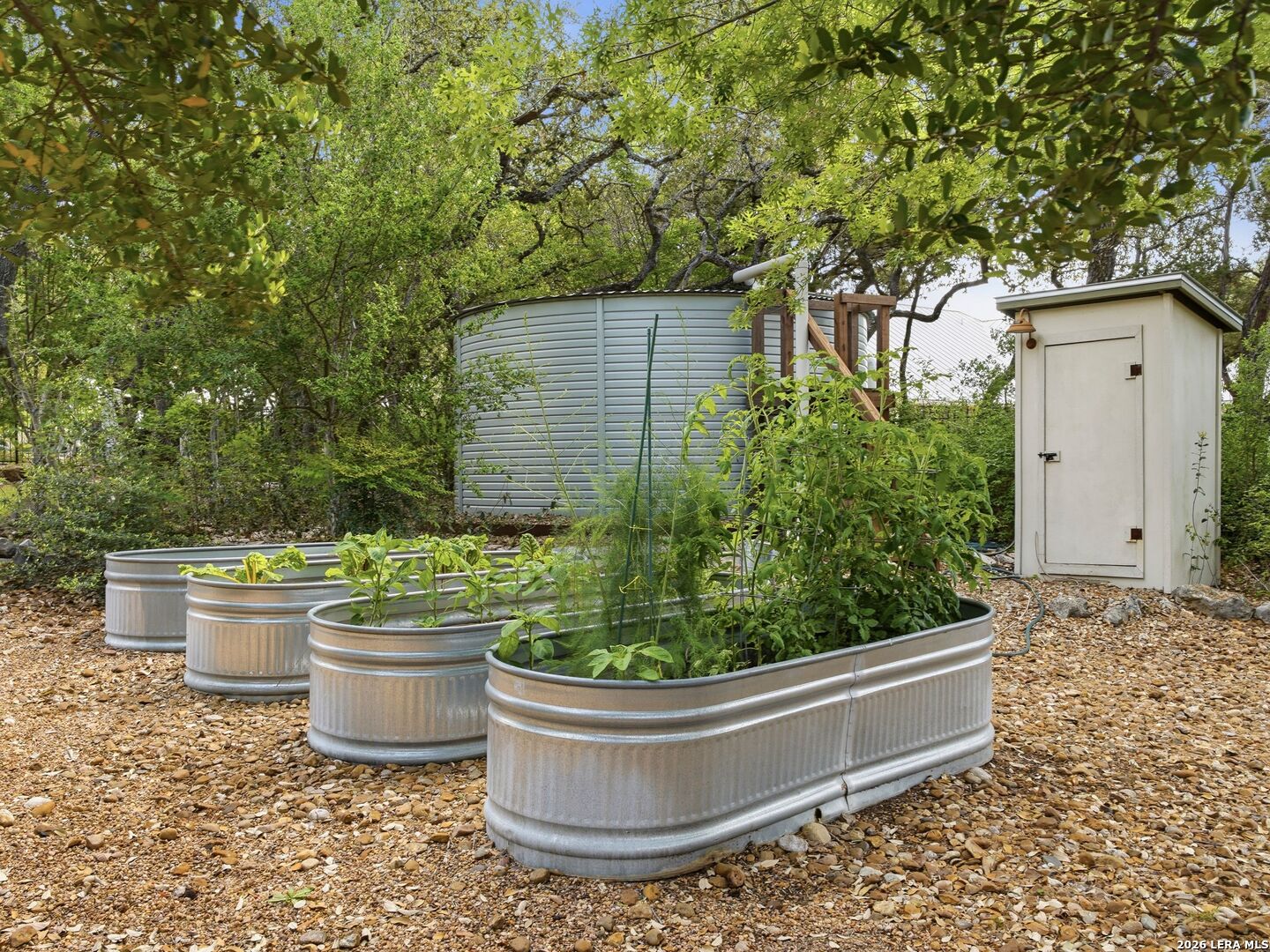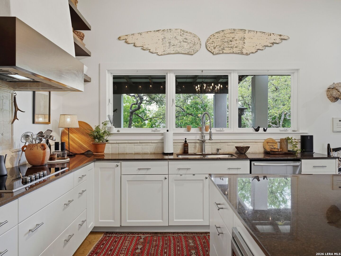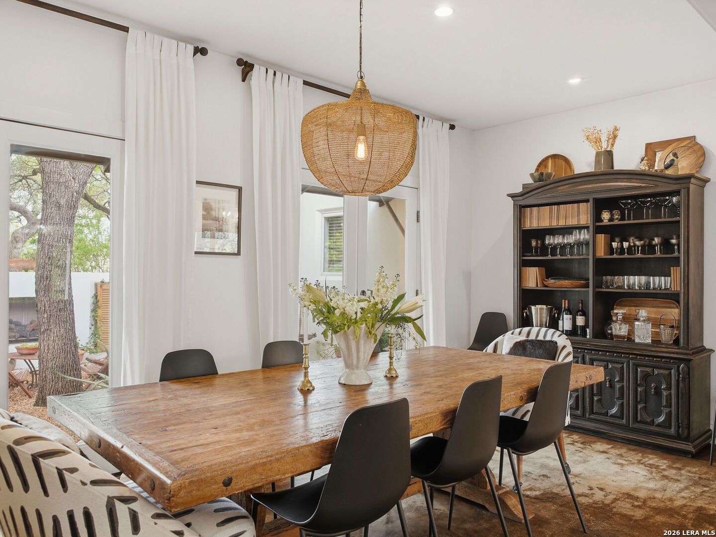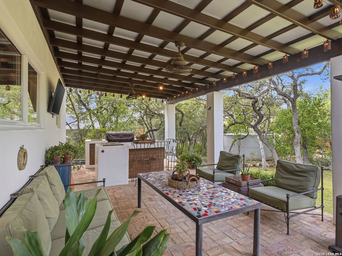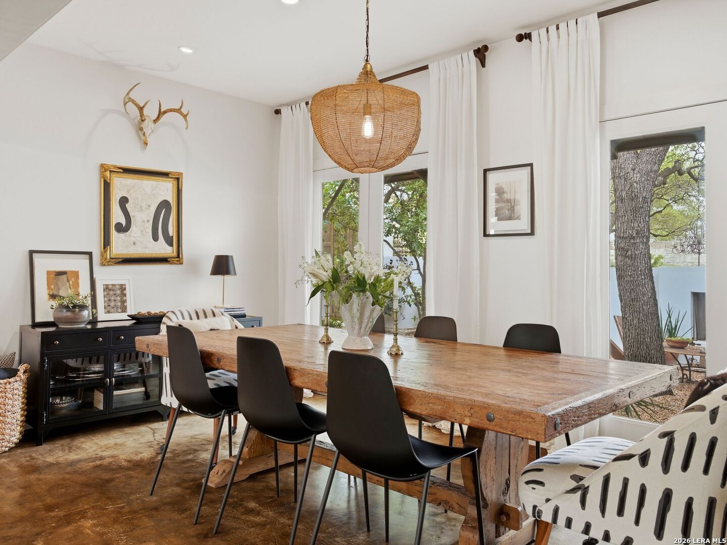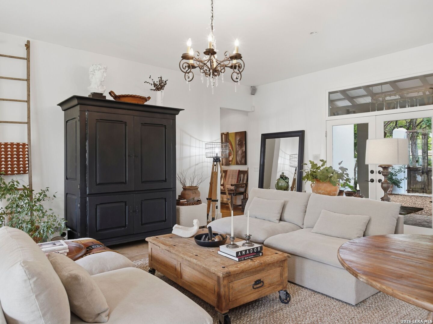 Custom-designed by recognized architect Isabel Mijangos, this exceptional Spanish-inspired estate blends timeless character with refined modern living, set on a rare 1.02-acre homesite shaded by mature oak trees. Encompassing 3,576 square feet, this 3-bedroom, 2 full and 1 half bath residence offers a thoughtful, flowing layout with a 3-car garage and an unmistakable sense of place. A graceful stucco exterior and striking metal roof set the tone, while antique wood doors welcome you into a private entry courtyard complete with a covered porch and outdoor fireplace, creating a warm and intimate first impression. Glass doors lead into an expansive living room where 10-foot ceilings, concrete floors, and a dramatic wall of windows frame serene backyard views. A two-sided fireplace anchors both the main living area and a secondary living space, seamlessly connecting to a generous dining room with doors that open back to the front courtyard perfect for effortless indoor-outdoor entertaining. The kitchen is both stylish and functional, featuring open wood shelving, granite countertops, a breakfast bar, stainless steel appliances, and a sink positioned beneath windows overlooking the grounds. Antique doors enclose the pantry, adding a layer of character and charm. A beautifully appointed office with a full wall of custom bookcases and cabinetry provides an inspiring workspace, while an elegant powder bath serves guests with ease. The downstairs primary suite is a true retreat, highlighted by wood-beamed ceilings, dual walk-in closets, and a spa-like bath with double vanities, quartz counters, a garden tub crowned by a chandelier, and a separate glass-enclosed tiled shower with dual heads. Upstairs, a spacious loft offers flexibility for living or study, alongside two generously sized bedrooms, each with walk-in closets, connected by a well-designed Jack-and-Jill bath. Outdoors, the property unfolds into an extraordinary backyard designed for both relaxation and entertaining. A large covered porch with brick flooring and a fully equipped outdoor kitchen overlooks the grounds, while a fire pit, workshop, rainwater catchment cistern, and raised garden beds complete this private, resort-style setting. A rare opportunity to own a one-of-a-kind architectural home that captures the essence of Texas living with Spanish elegance.