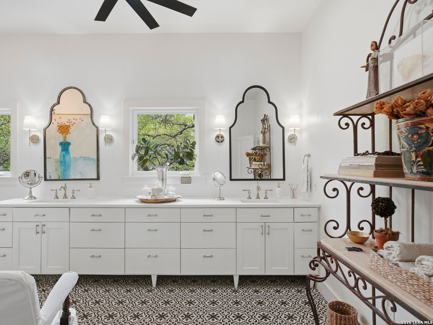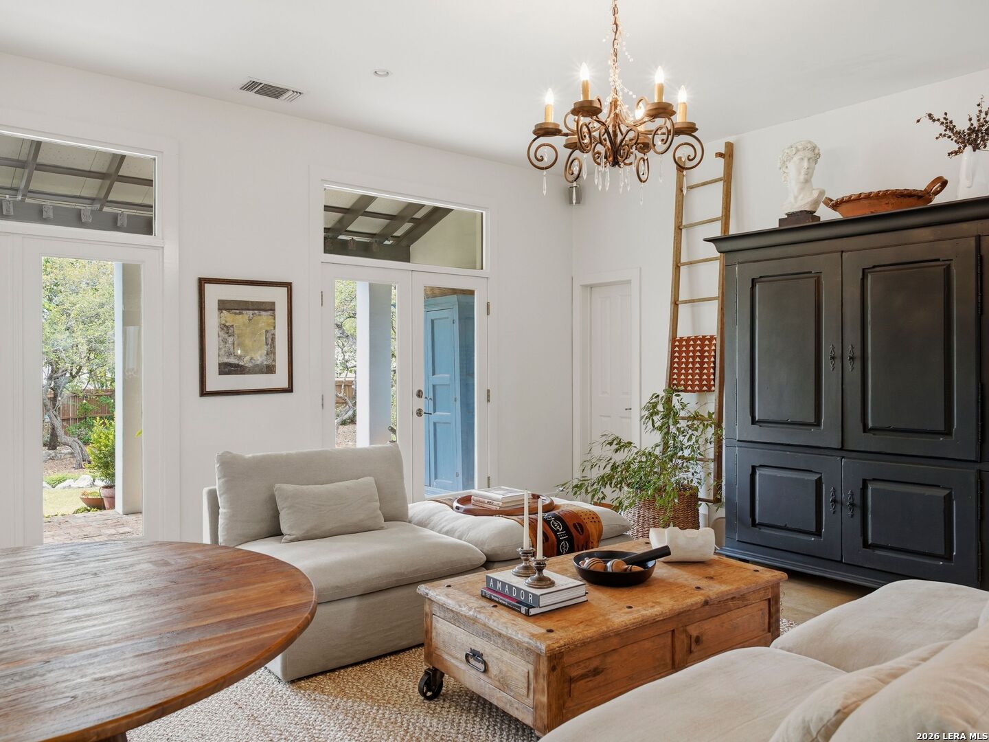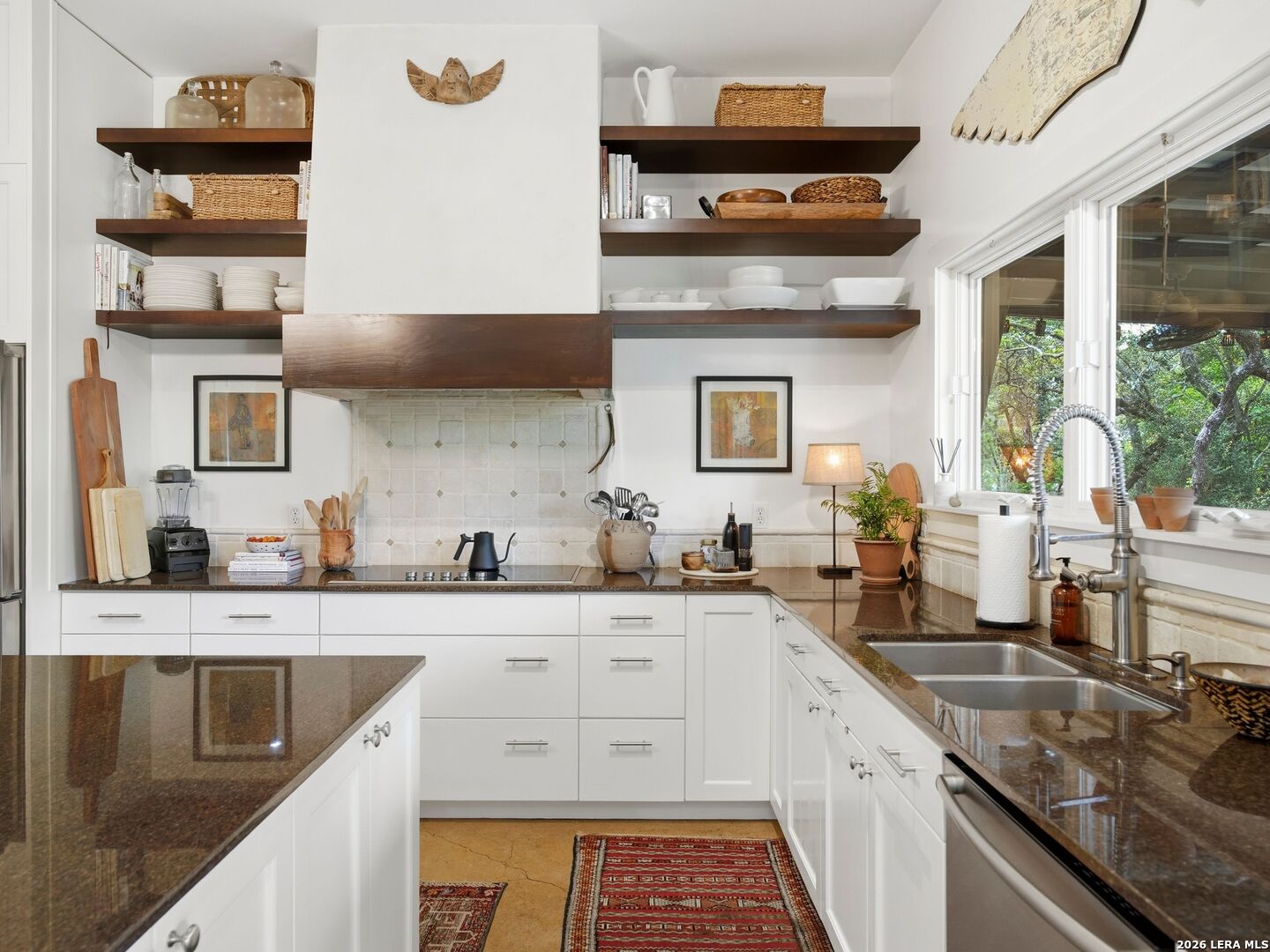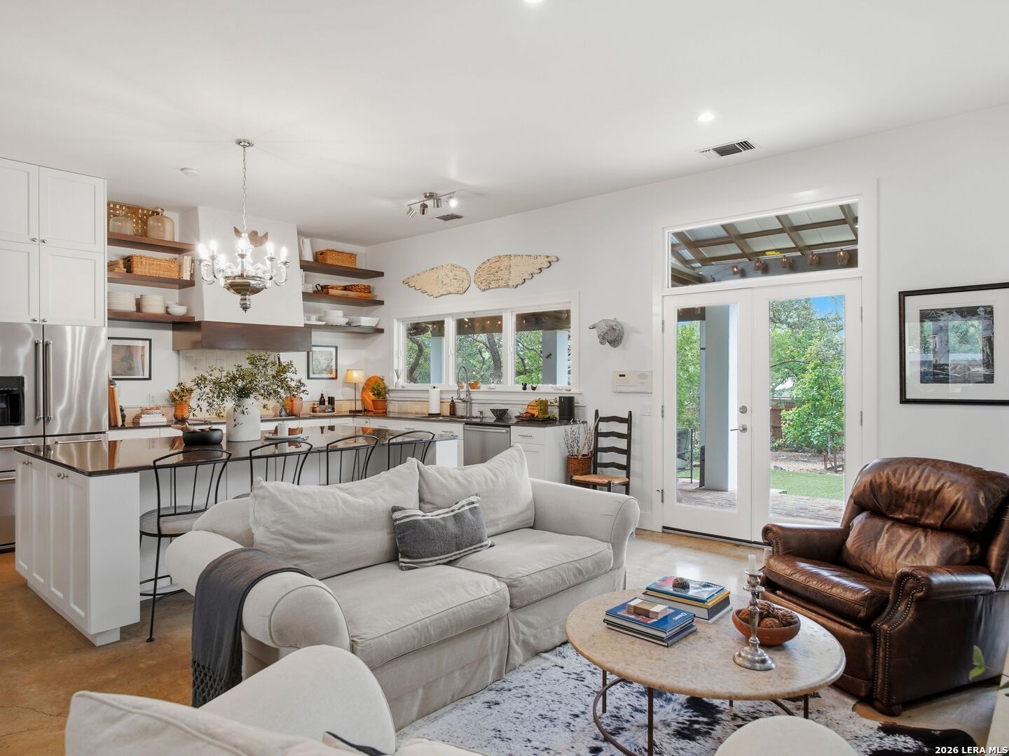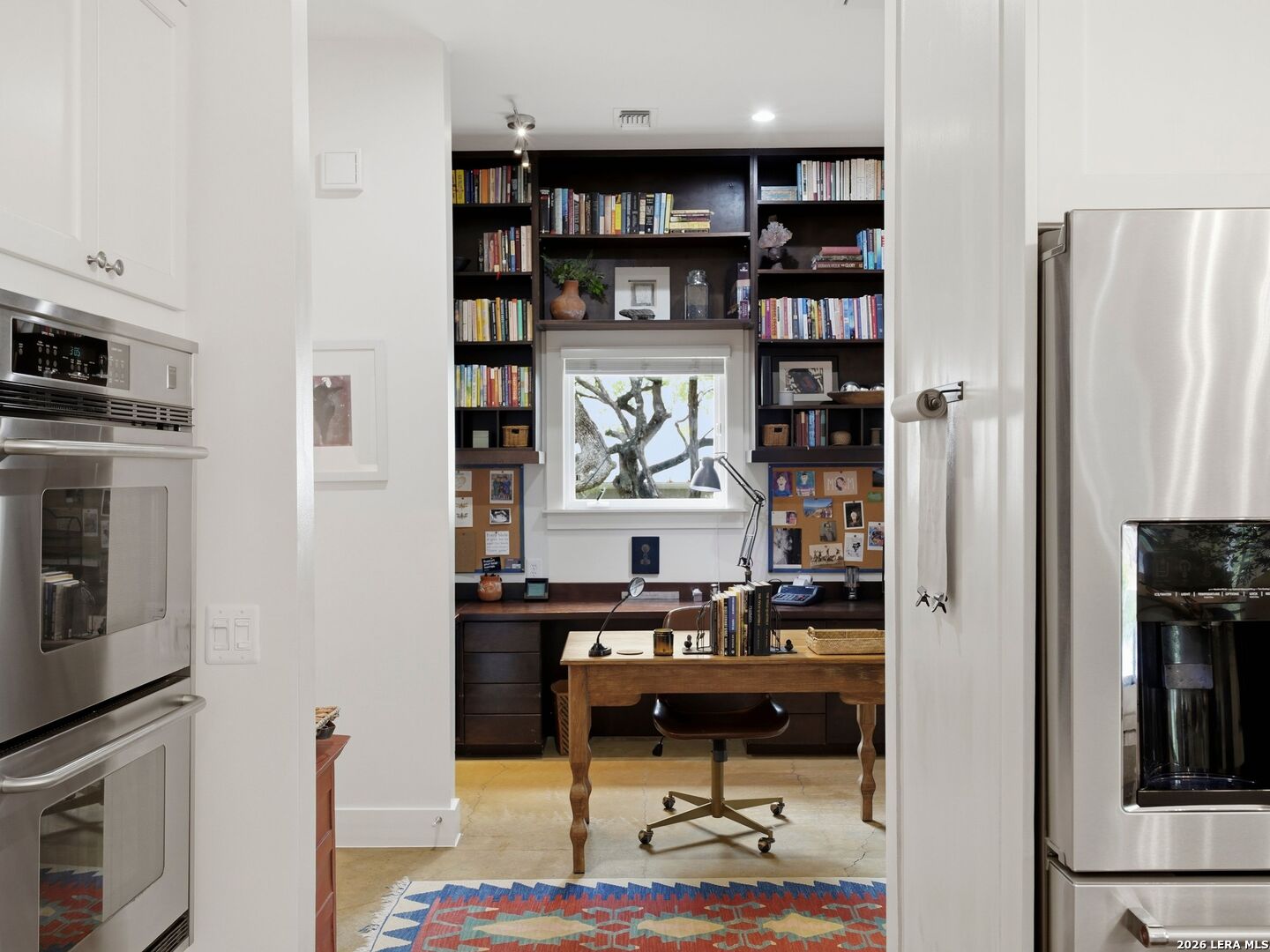 Custom-designed by recognized architect Isabel Mijangos, this exceptional Spanish-inspired estate blends timeless character with refined modern living, set on a rare 1.02-acre homesite shaded by mature oak trees. Encompassing 3,576 square feet, this 3-bedroom, 2 full and 1 half bath residence offers a thoughtful, flowing layout with a 3-car garage and an unmistakable sense of place. A graceful stucco exterior and striking metal roof set the tone, while antique wood doors welcome you into a private entry courtyard complete with a covered porch and outdoor fireplace, creating a warm and intimate first impression. Glass doors lead into an expansive living room where 10-foot ceilings, concrete floors, and a dramatic wall of windows frame serene backyard views. A two-sided fireplace anchors both the main living area and a secondary living space, seamlessly connecting to a generous dining room with doors that open back to the front courtyard perfect for effortless indoor-outdoor entertaining. The kitchen is both stylish and functional, featuring open wood shelving, granite countertops, a breakfast bar, stainless steel appliances, and a sink positioned beneath windows overlooking the grounds. Antique doors enclose the pantry, adding a layer of character and charm. A beautifully appointed office with a full wall of custom bookcases and cabinetry provides an inspiring workspace, while an elegant powder bath serves guests with ease. The downstairs primary suite is a true retreat, highlighted by wood-beamed ceilings, dual walk-in closets, and a spa-like bath with double vanities, quartz counters, a garden tub crowned by a chandelier, and a separate glass-enclosed tiled shower with dual heads. Upstairs, a spacious loft offers flexibility for living or study, alongside two generously sized bedrooms, each with walk-in closets, connected by a well-designed Jack-and-Jill bath. Outdoors, the property unfolds into an extraordinary backyard designed for both relaxation and entertaining. A large covered porch with brick flooring and a fully equipped outdoor kitchen overlooks the grounds, while a fire pit, workshop, rainwater catchment cistern, and raised garden beds complete this private, resort-style setting. A rare opportunity to own a one-of-a-kind architectural home that captures the essence of Texas living with Spanish elegance.