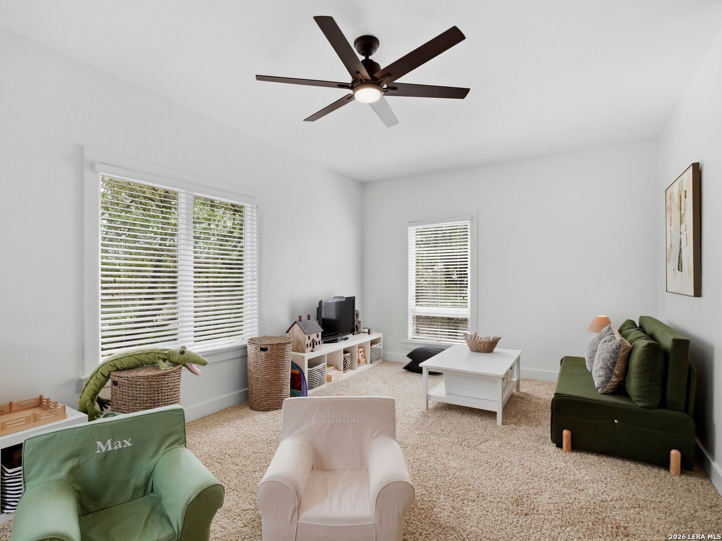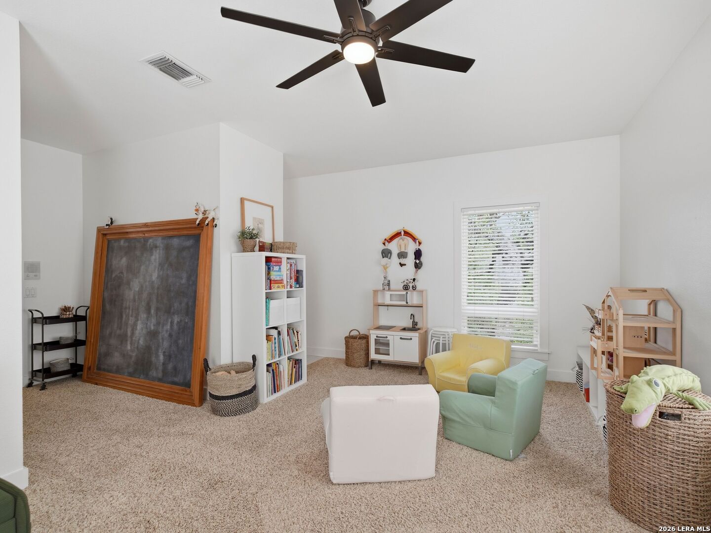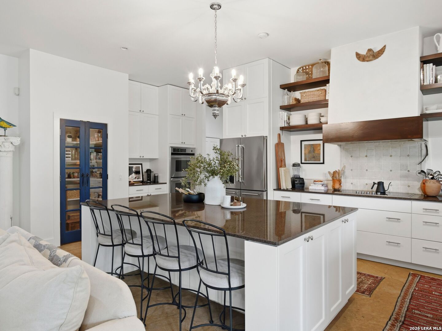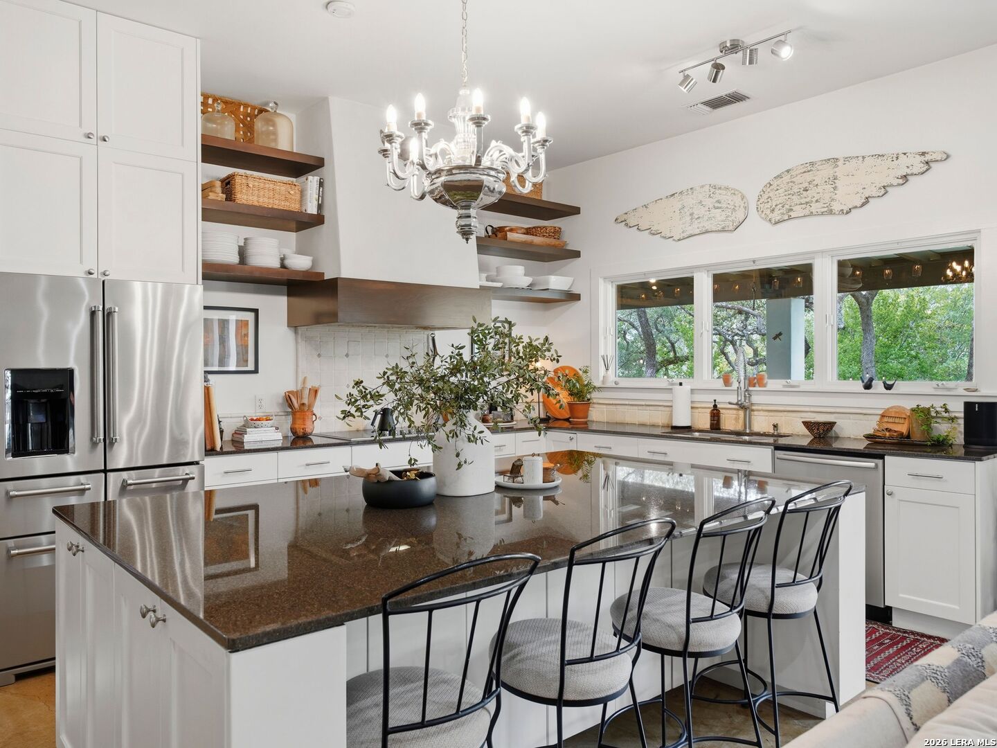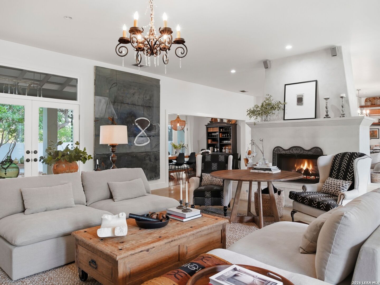 Custom-designed by recognized architect Isabel Mijangos, this exceptional Spanish-inspired estate blends timeless character with refined modern living, set on a rare 1.02-acre homesite shaded by mature oak trees. Encompassing 3,576 square feet, this 3-bedroom, 2 full and 1 half bath residence offers a thoughtful, flowing layout with a 3-car garage and an unmistakable sense of place. A graceful stucco exterior and striking metal roof set the tone, while antique wood doors welcome you into a private entry courtyard complete with a covered porch and outdoor fireplace, creating a warm and intimate first impression. Glass doors lead into an expansive living room where 10-foot ceilings, concrete floors, and a dramatic wall of windows frame serene backyard views. A two-sided fireplace anchors both the main living area and a secondary living space, seamlessly connecting to a generous dining room with doors that open back to the front courtyard perfect for effortless indoor-outdoor entertaining. The kitchen is both stylish and functional, featuring open wood shelving, granite countertops, a breakfast bar, stainless steel appliances, and a sink positioned beneath windows overlooking the grounds. Antique doors enclose the pantry, adding a layer of character and charm. A beautifully appointed office with a full wall of custom bookcases and cabinetry provides an inspiring workspace, while an elegant powder bath serves guests with ease. The downstairs primary suite is a true retreat, highlighted by wood-beamed ceilings, dual walk-in closets, and a spa-like bath with double vanities, quartz counters, a garden tub crowned by a chandelier, and a separate glass-enclosed tiled shower with dual heads. Upstairs, a spacious loft offers flexibility for living or study, alongside two generously sized bedrooms, each with walk-in closets, connected by a well-designed Jack-and-Jill bath. Outdoors, the property unfolds into an extraordinary backyard designed for both relaxation and entertaining. A large covered porch with brick flooring and a fully equipped outdoor kitchen overlooks the grounds, while a fire pit, workshop, rainwater catchment cistern, and raised garden beds complete this private, resort-style setting. A rare opportunity to own a one-of-a-kind architectural home that captures the essence of Texas living with Spanish elegance.