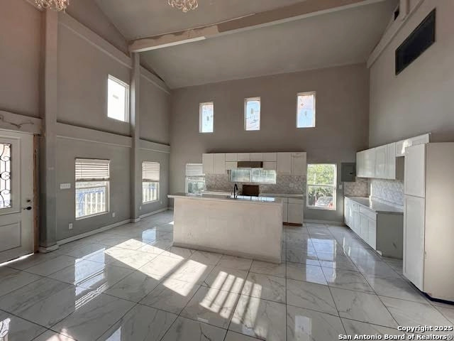 Lake Medina Shores, Check out this 5 bedroom, 2 bath approx. 2,400 square feet on half an acre, Open kitchen with Island and breakfast bar overlooking large living room with 20 foot high vaulted ceilings, Ceramic tile flooring, 2 bedrooms and a full bath downstairs, plus a dining area and additional living area. Upstairs offers, good sized Primary bedroom with walk in closet and full bath, two additional rooms that can be used as bedrooms with no closets, full bathroom in hallway adjacent to utility room, vinyl flooring, Home is lacking Septic tank and CHA Units (Duct work and vents are installed) Home is almost complete and would need to go Conventional or cash.