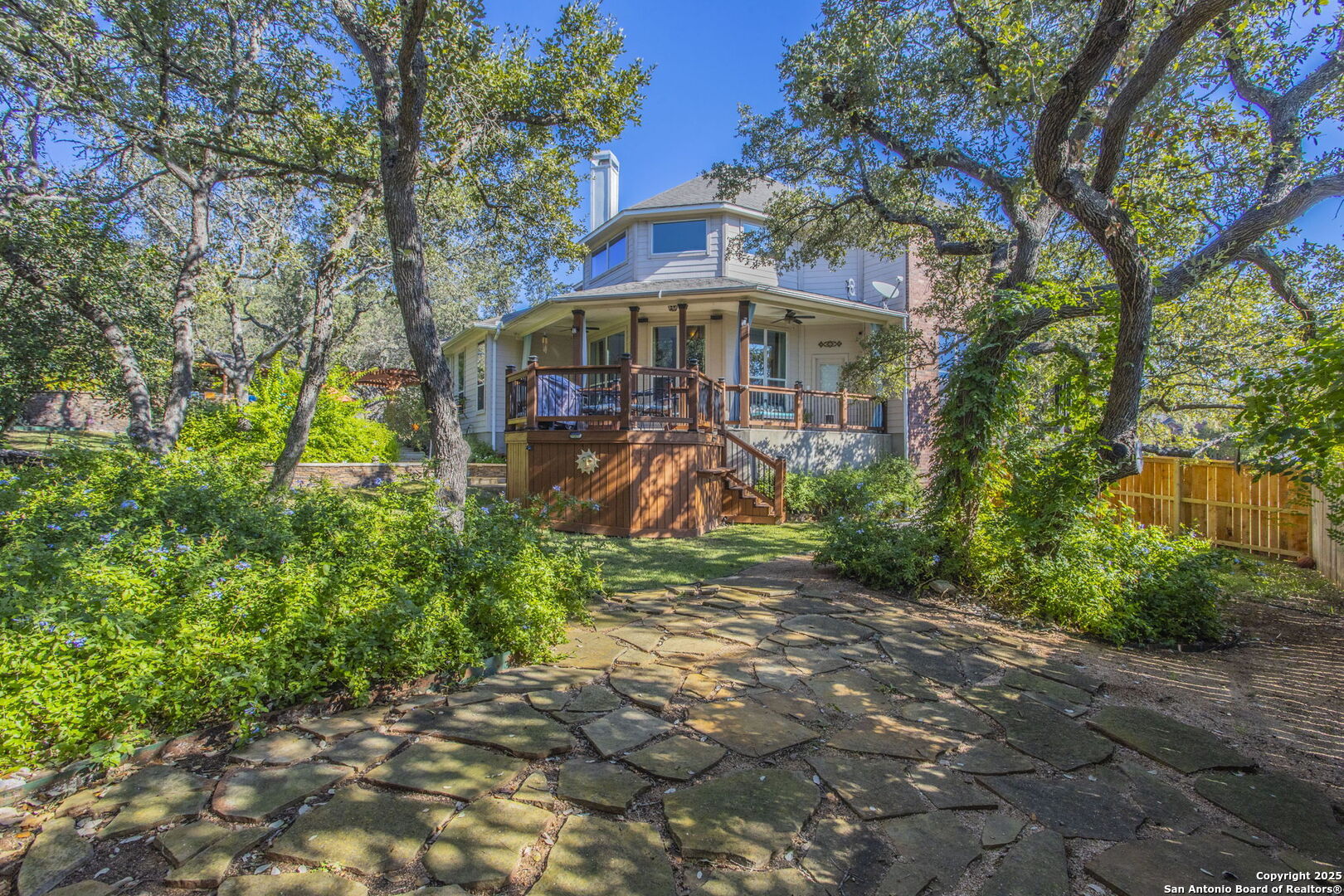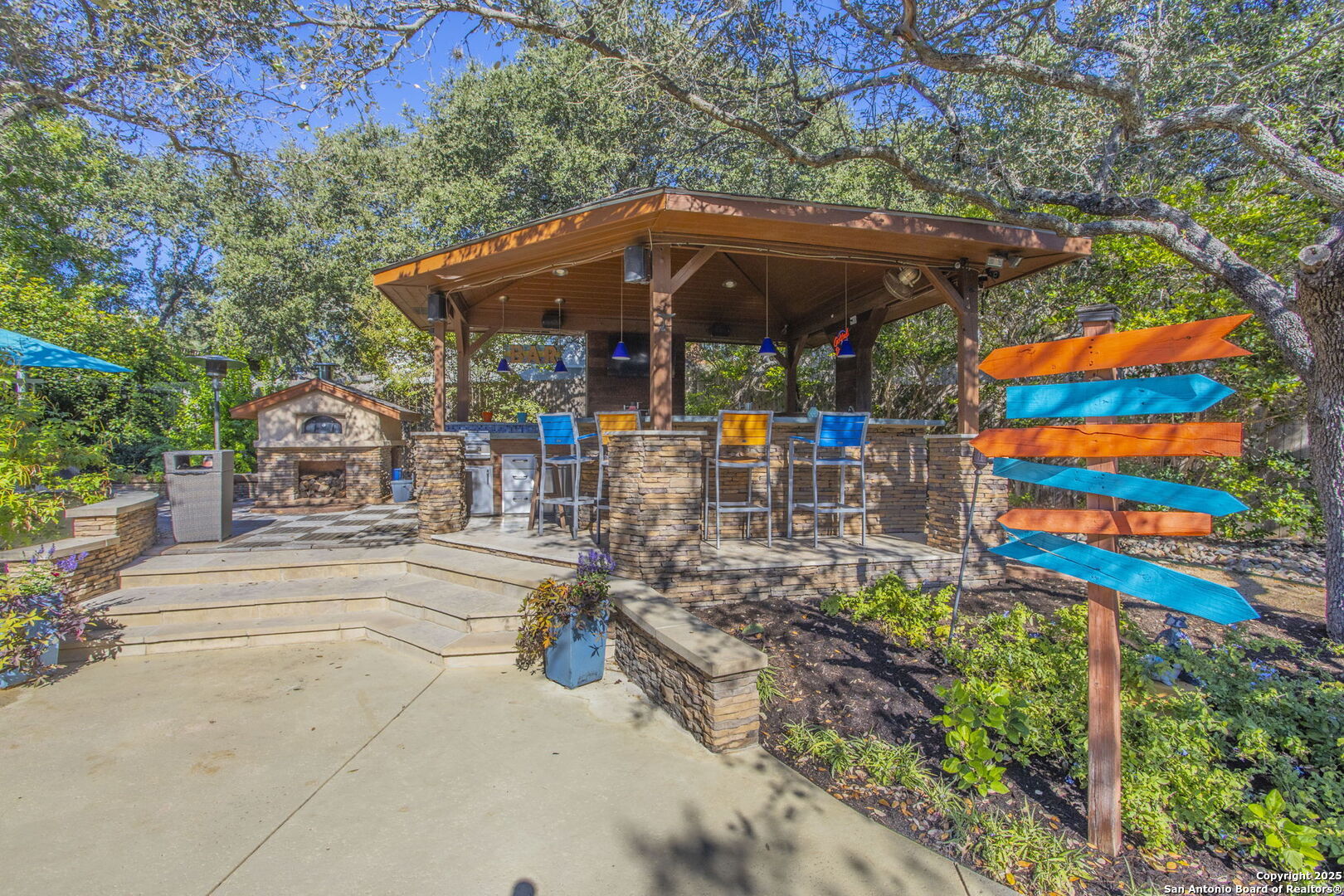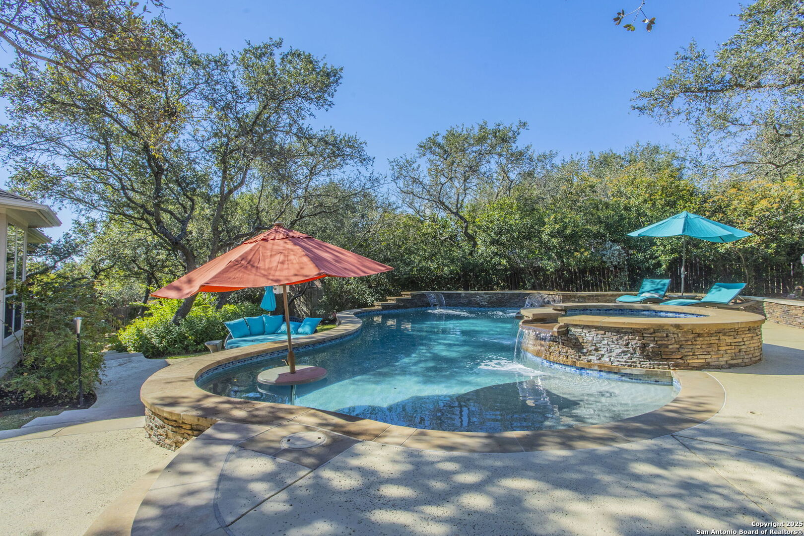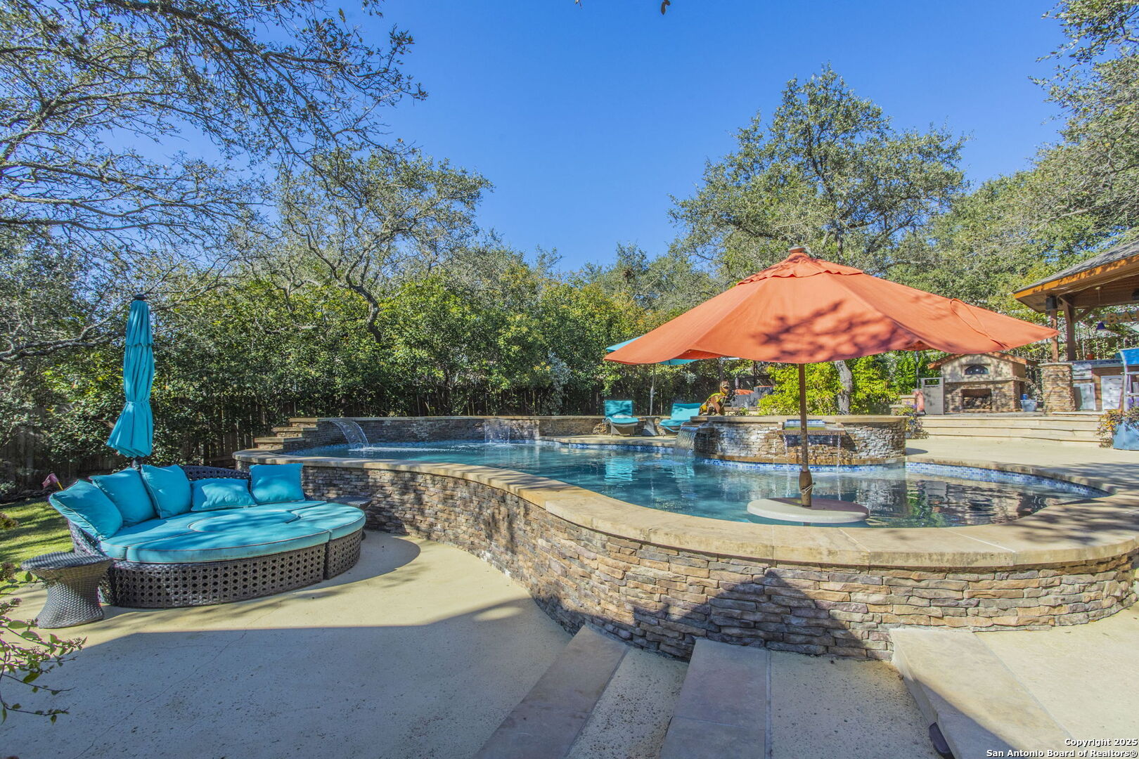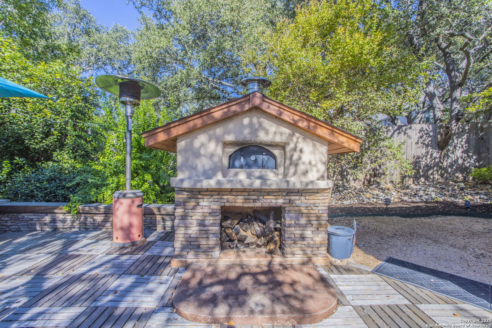 A lovely two-story home tucked away on a quiet cul-de-sac offers the perfect blend of comfort and natural beauty. It features 4 spacious bedrooms, 3.5 bathrooms, a dedicated office, and a large upstairs game room. The property offers a welcoming kitchen complete with a breakfast area, generous cabinet storage, and ample countertop space connected to a formal dining room. Additional highlights include tall ceilings, a double-sided fireplace, and a charming built-in home for your four-legged family members. Enjoy a covered patio with two ceiling fans and an attached wood deck that also provides for under-deck storage. The scenic backyard is an oasis for family and friends, with a pool, outdoor kitchen with wood-burning pizza oven, and multiple entertaining areas on a 0.4 acre lot featuring mature oak trees. The outdoor kitchen is equipped with a built-in Lion gas grill, Marvel refrigerator and kegerator, FireMagic double-sided burners, and power burner. Located in the Mountain Lodge community, residents enjoy access to top-rated schools, two pools, a playground, basketball courts, and the added benefit of no city taxes!