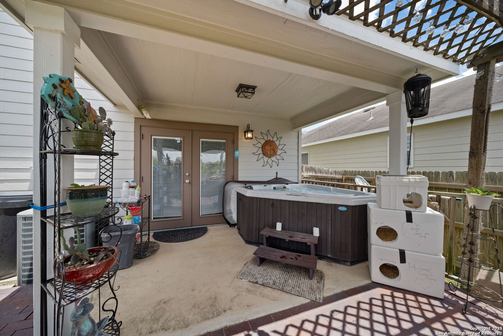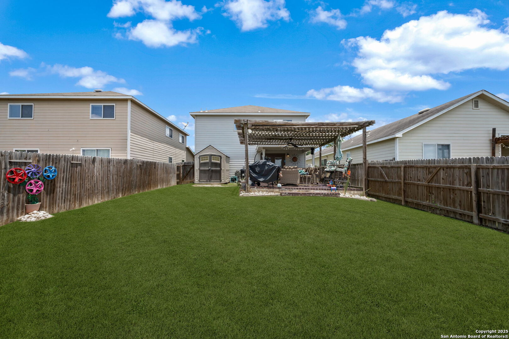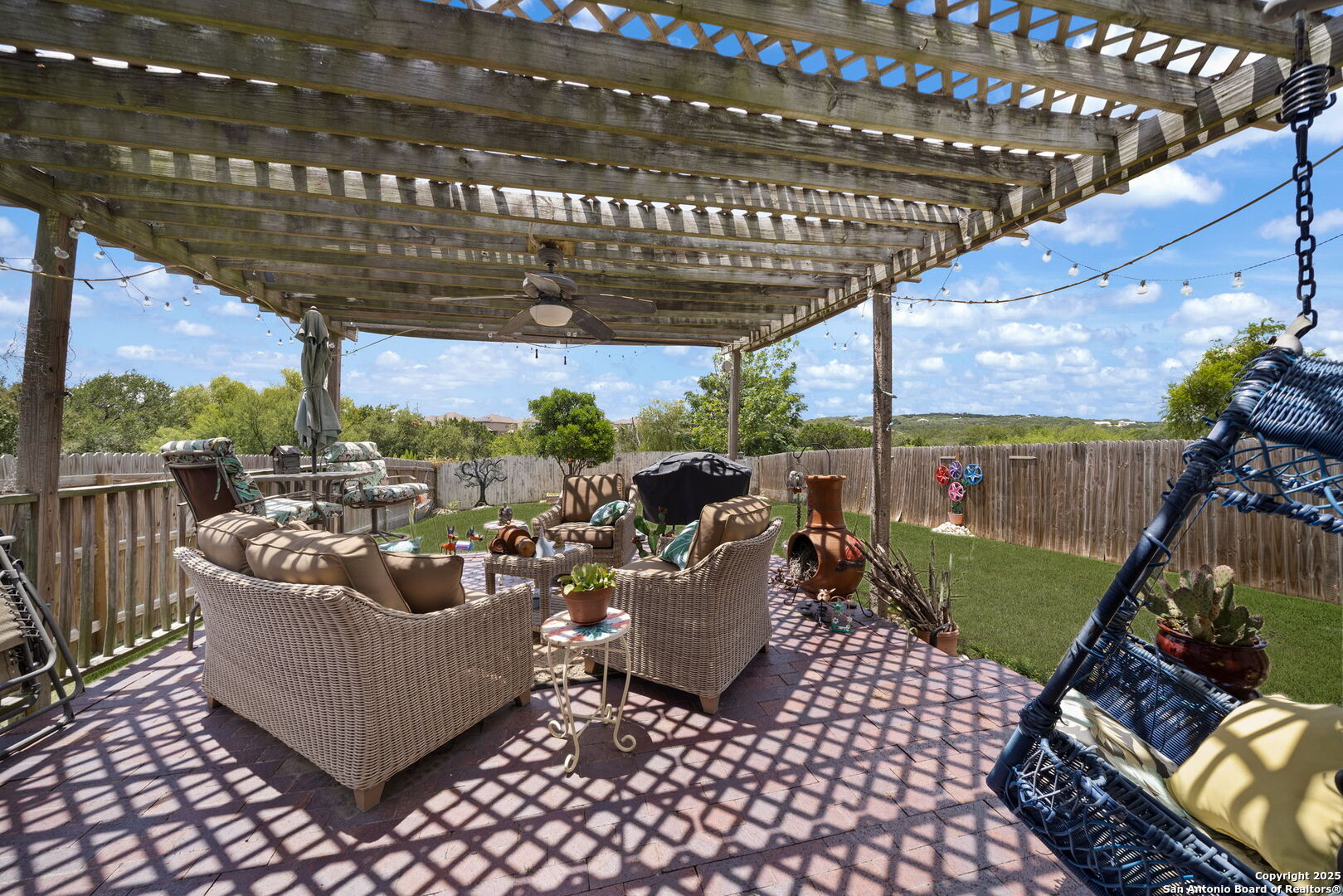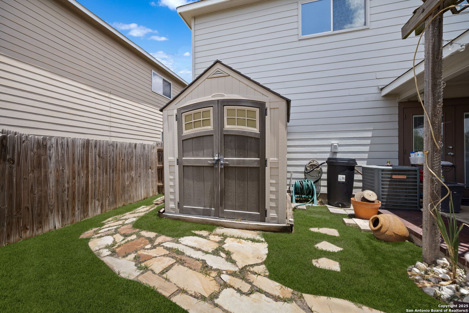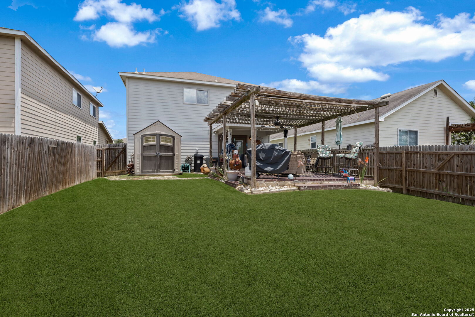 Welcome to this stunning 3-bedroom, 2.5-bathroom home nestled in the highly desirable Bulverde Village community. With a spacious upstairs loft and NO carpet throughout, this home offers both comfort and style. The entire downstairs showcases elegant crown molding and hard surface flooring, creating a clean and polished look. The upgraded kitchen features bright white cabinetry, sleek granite countertops, and modern finishes-perfect for any home chef. The generous upstairs master suite boasts a large walk-in closet, while the backyard is ideal for entertaining with a shaded pergola, 220V hookups, and a separate storage shed. Backing to a peaceful greenbelt, you'll enjoy added privacy and nature views. Freshly painted inside and out, this home is move-in ready. Additional recent updates include a rebuilt HVAC system (2023), Hot Water Heater (2023), and tint on windows. Enjoy a short commute to Highway 281, top-rated NEISD schools, shopping, and restaurants. Fantastic amenities including a park, volleyball court, walking trails, and more! Don't miss this incredible opportunity-schedule your showing today!
