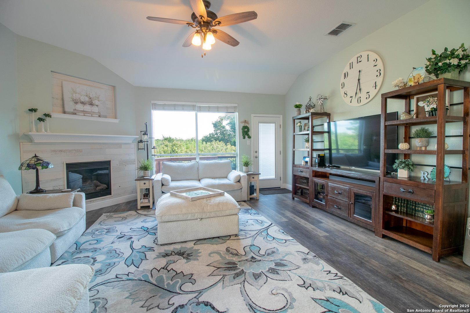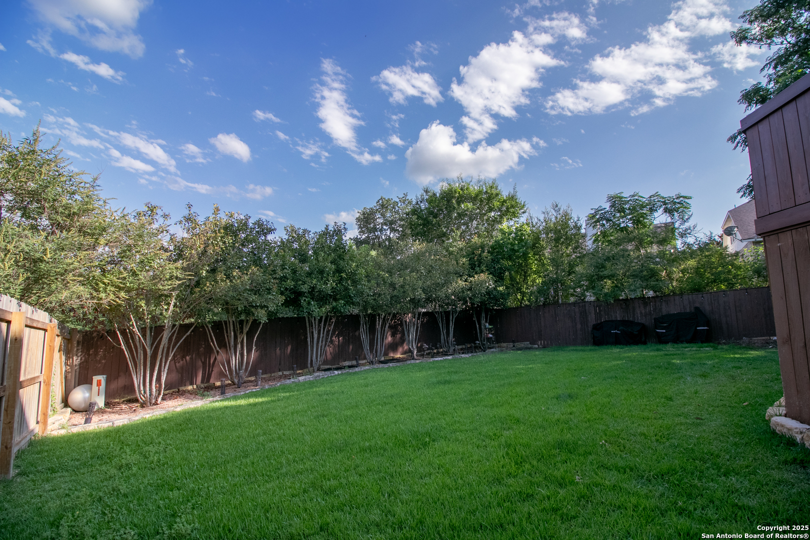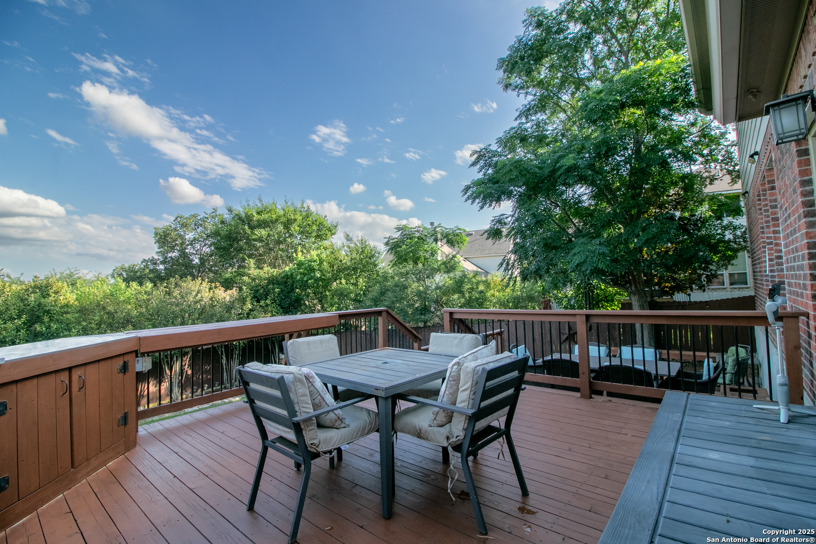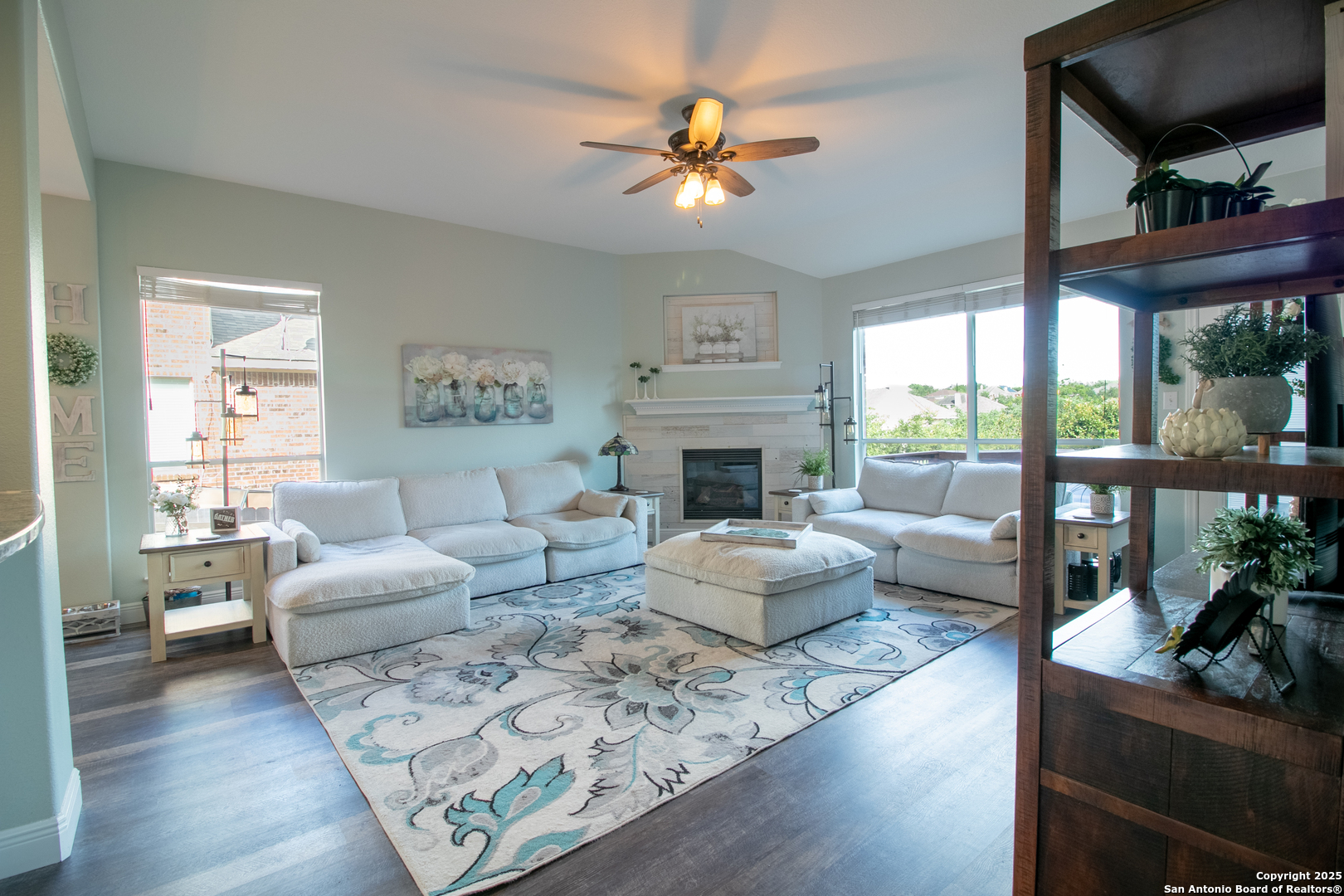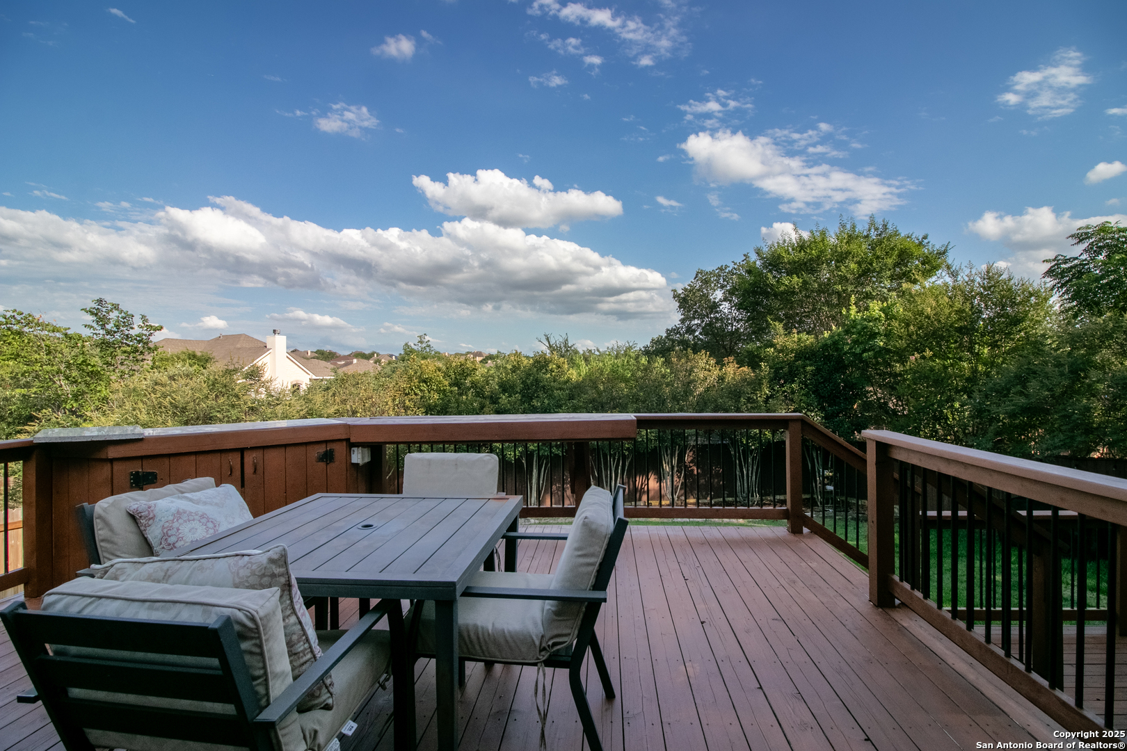 Priced 75K under 2025 BCAD assessment! Beautifully maintained move in ready 4 bed 2.5 bath brick home in the desirable Ventanas subdivision in the Cibolo Canyons development! One of the best priced per square foot home in the subdivision! This 2 story brick home boasts one of the largest lots at .216 acres in the neighborhood w/maintained & mature landscaping! You are greeted by two story ceilings in the entry & luxury vinyl plank flooring. The formal living & dining have crown molding and plenty of natural lighting. Recent interior painting throughout! The family room features a corner set gas fire place, wonderful views of the backyard & opens to the kitchen. The kitchen features granite countertops, white cabinetry, subway backsplash, built-in oven & microwave and coastal wood trim! Pantry has custom mahogany banded pantry shelving with solid milled mahogany supports. The first floor primary suite has great views of the backyard, walk-in shower, garden tub, granite countertops, walk-in closet & separate vanities. Upgraded carpeting (2023) in primary & upstairs w/Tempur-Pedic base padding & sound dampening features! The second level features a huge third living space, 3 great sized secondary bedrooms, jack-n-jill bathroom w/granite countertops and 2 attic storage spaces. All walk-in closets, linen & coat closet have custom mahogany banded poplar shelving! Impressive 5" baseboards! The backyard is a dream: 800 square feet multi-level cedar deck (sanded & stained June 2025) w/stunning views, manicured lawn & landscaping, tons of privacy and tuned-up sprinkler system! 238 square feet of impervious cover available! Additional updates include: Roof (May 2025), water heater (2024), HVAC (2023), powder room updated (2023), bathroom sinks, faucets & towel racks, matching lighting w/dimmable switches. One of a kind subdivision with TWO clubhouses, TWO pools, lazy river, playground, trails, two gyms! Highly rated schools in NEISD! Easy access to 281!