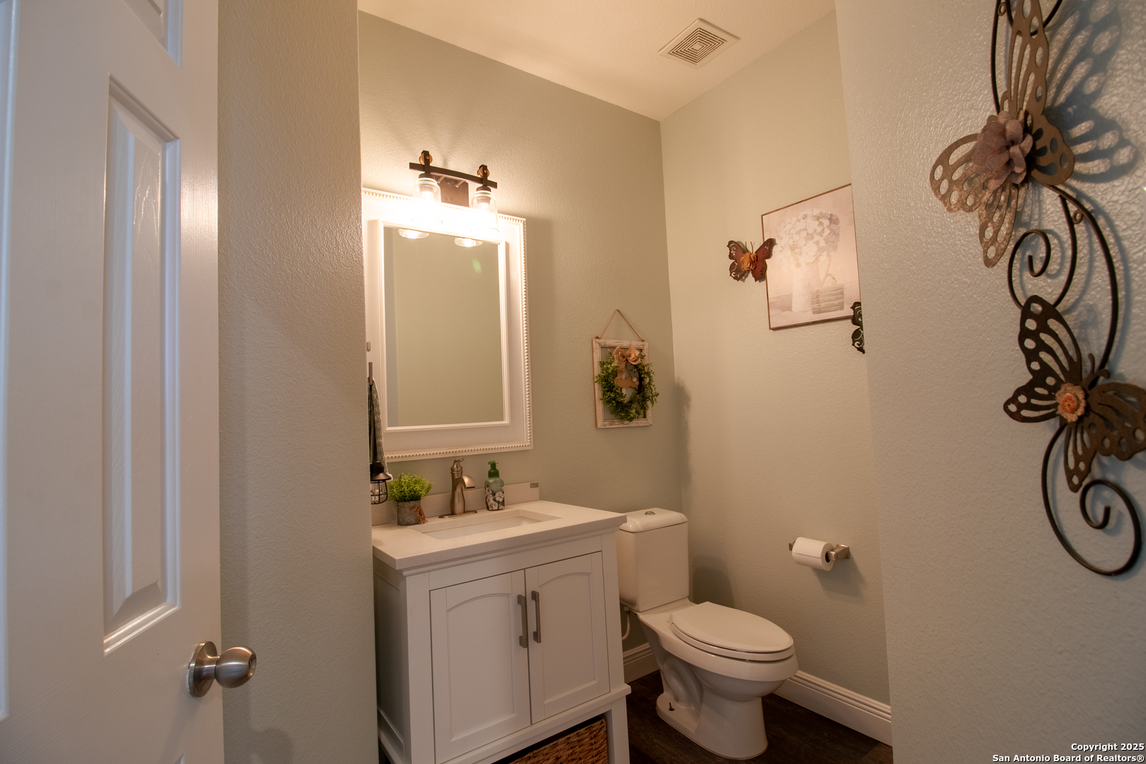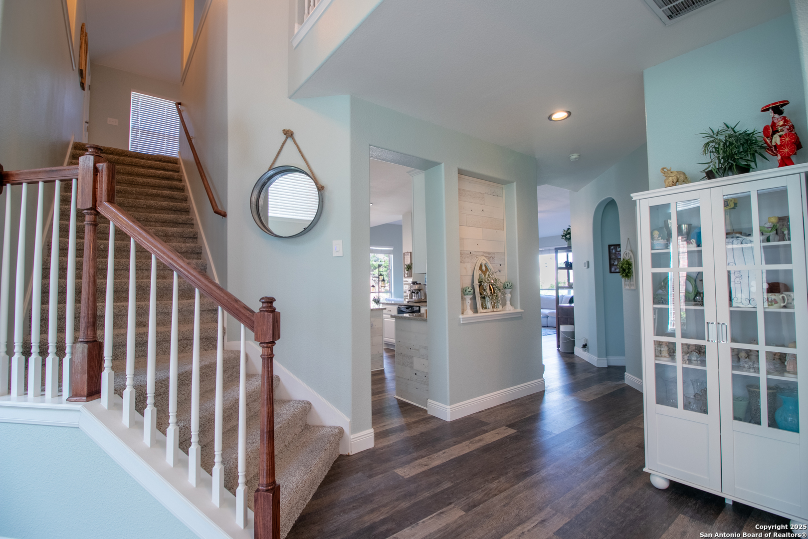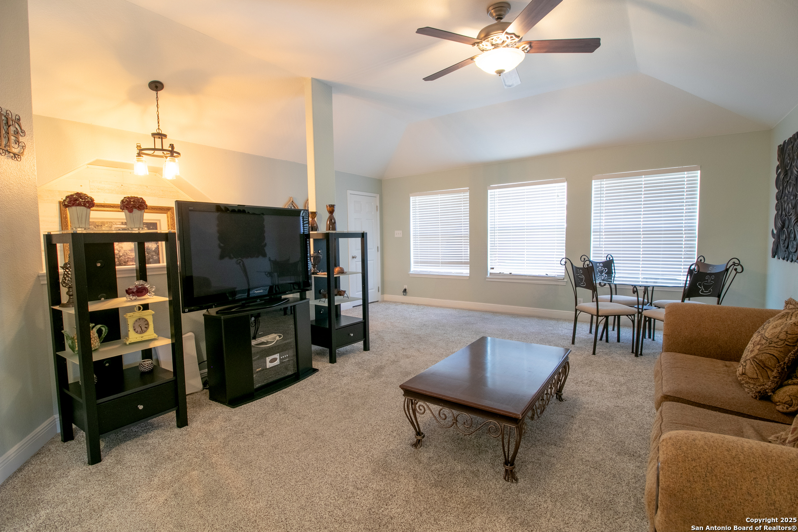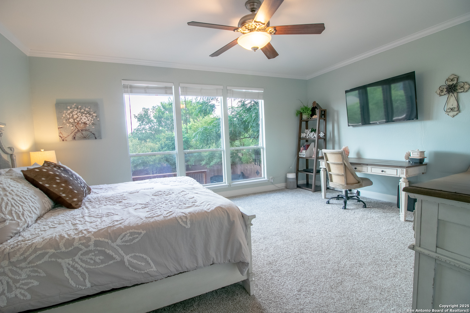 Priced 75K under 2025 BCAD assessment! Beautifully maintained move in ready 4 bed 2.5 bath brick home in the desirable Ventanas subdivision in the Cibolo Canyons development! One of the best priced per square foot home in the subdivision! This 2 story brick home boasts one of the largest lots at .216 acres in the neighborhood w/maintained & mature landscaping! You are greeted by two story ceilings in the entry & luxury vinyl plank flooring. The formal living & dining have crown molding and plenty of natural lighting. Recent interior painting throughout! The family room features a corner set gas fire place, wonderful views of the backyard & opens to the kitchen. The kitchen features granite countertops, white cabinetry, subway backsplash, built-in oven & microwave and coastal wood trim! Pantry has custom mahogany banded pantry shelving with solid milled mahogany supports. The first floor primary suite has great views of the backyard, walk-in shower, garden tub, granite countertops, walk-in closet & separate vanities. Upgraded carpeting (2023) in primary & upstairs w/Tempur-Pedic base padding & sound dampening features! The second level features a huge third living space, 3 great sized secondary bedrooms, jack-n-jill bathroom w/granite countertops and 2 attic storage spaces. All walk-in closets, linen & coat closet have custom mahogany banded poplar shelving! Impressive 5" baseboards! The backyard is a dream: 800 square feet multi-level cedar deck (sanded & stained June 2025) w/stunning views, manicured lawn & landscaping, tons of privacy and tuned-up sprinkler system! 238 square feet of impervious cover available! Additional updates include: Roof (May 2025), water heater (2024), HVAC (2023), powder room updated (2023), bathroom sinks, faucets & towel racks, matching lighting w/dimmable switches. One of a kind subdivision with TWO clubhouses, TWO pools, lazy river, playground, trails, two gyms! Highly rated schools in NEISD! Easy access to 281!