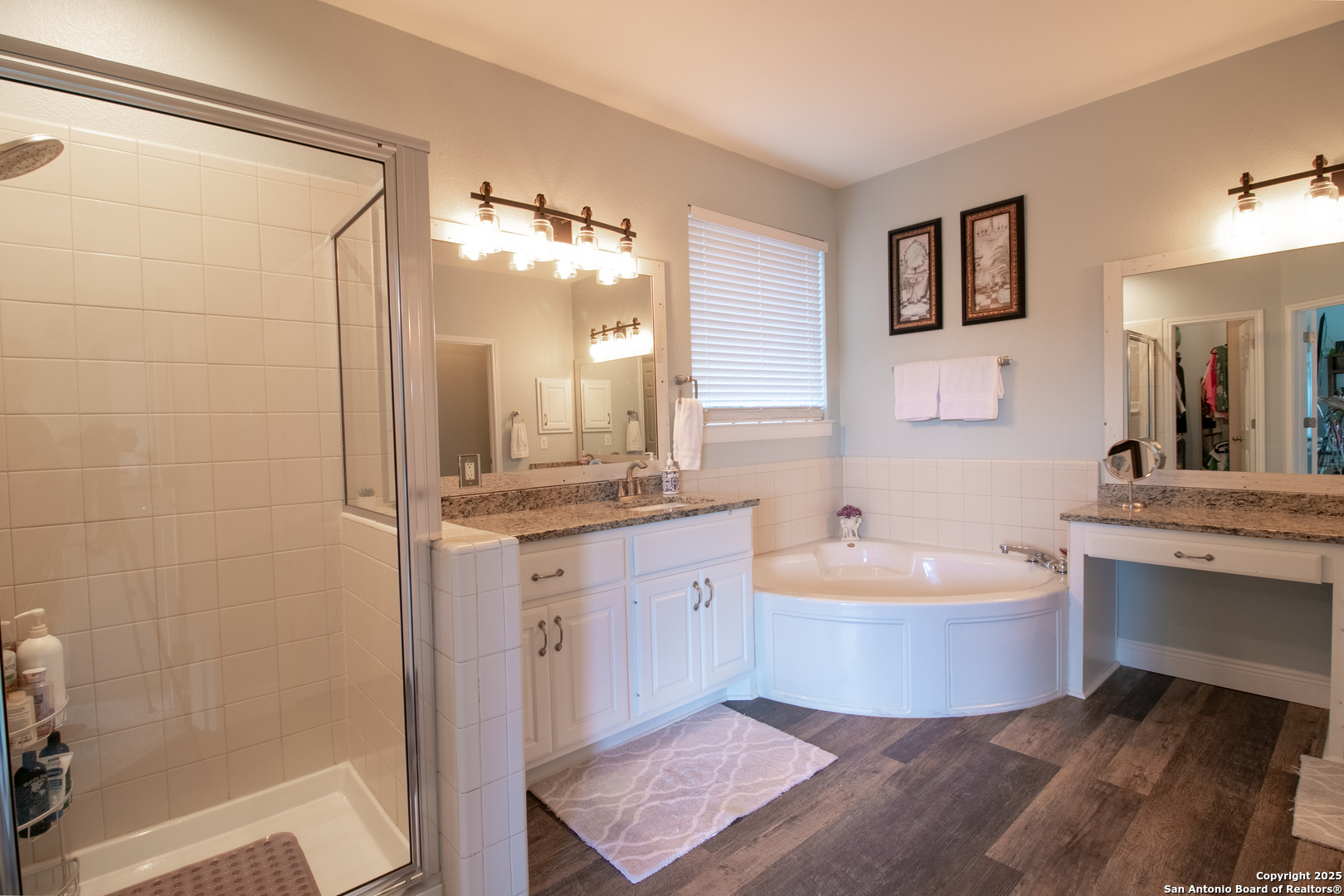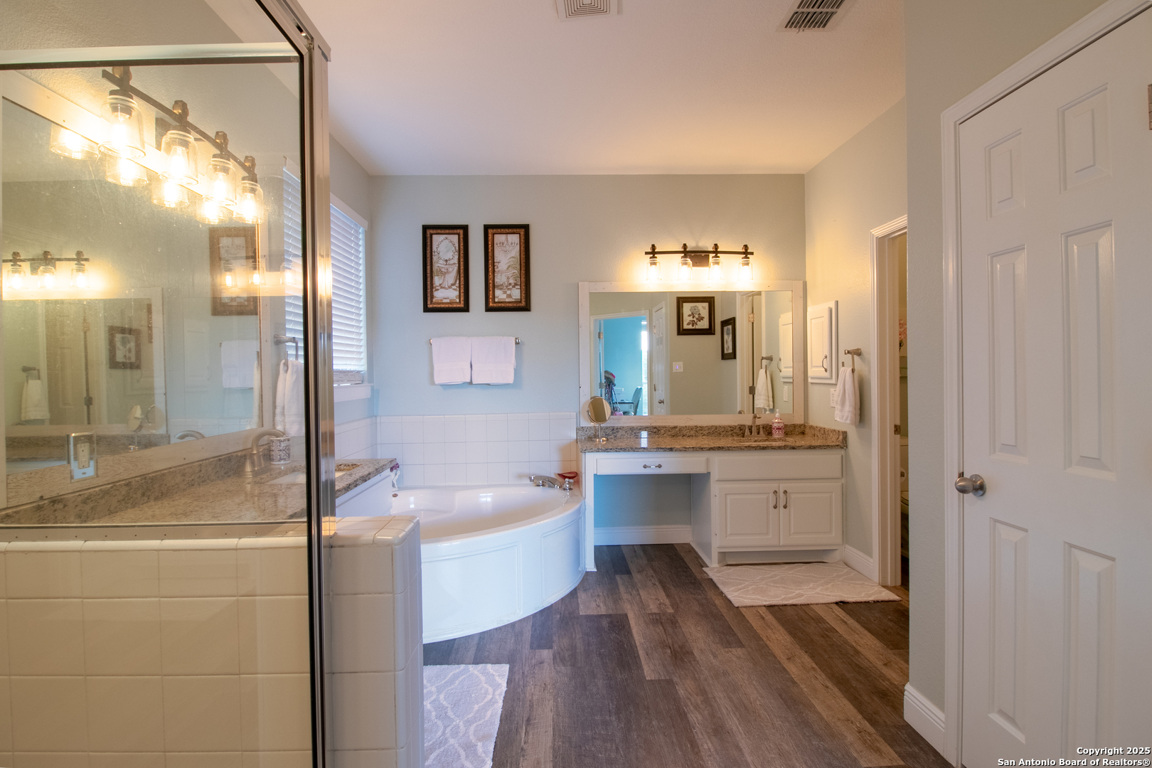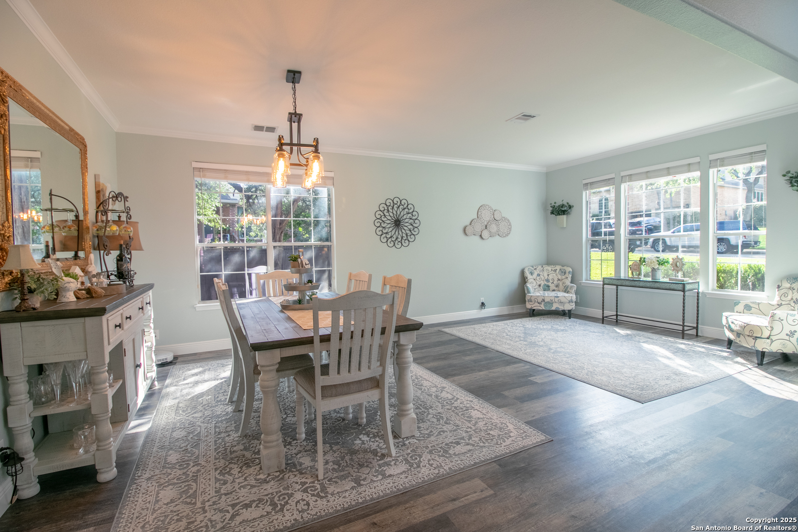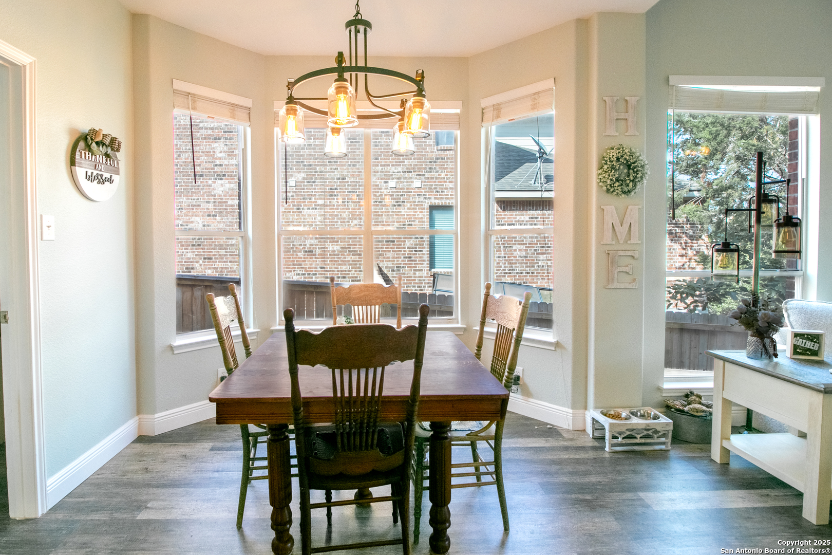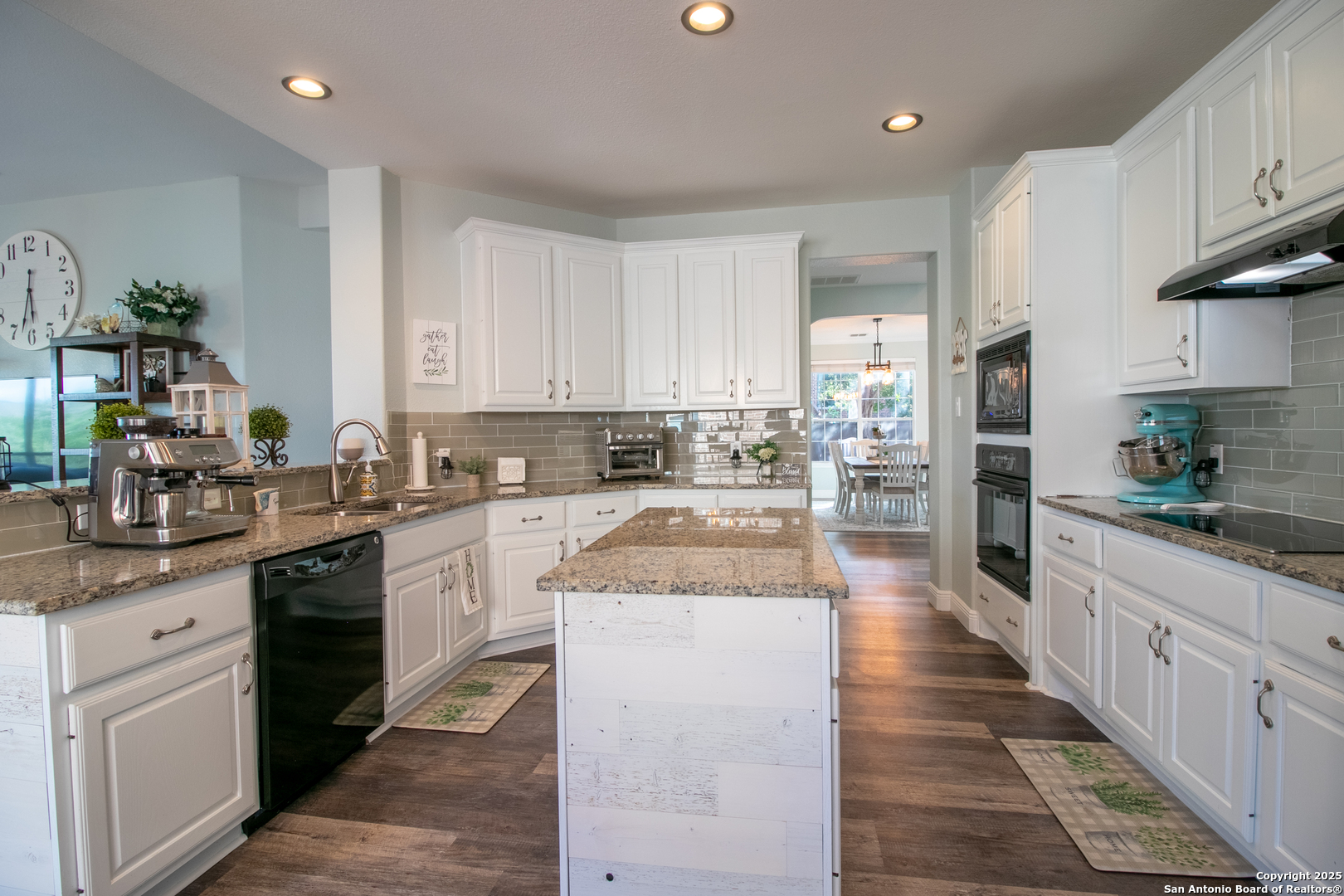Priced 75K under 2025 BCAD assessment! Beautifully maintained move in ready 4 bed 2.5 bath brick home in the desirable Ventanas subdivision in the Cibolo Canyons development! One of the best priced per square foot home in the subdivision! This 2 story brick home boasts one of the largest lots at .216 acres in the neighborhood w/maintained & mature landscaping! You are greeted by two story ceilings in the entry & luxury vinyl plank flooring. The formal living & dining have crown molding and plenty of natural lighting. Recent interior painting throughout! The family room features a corner set gas fire place, wonderful views of the backyard & opens to the kitchen. The kitchen features granite countertops, white cabinetry, subway backsplash, built-in oven & microwave and coastal wood trim! Pantry has custom mahogany banded pantry shelving with solid milled mahogany supports. The first floor primary suite has great views of the backyard, walk-in shower, garden tub, granite countertops, walk-in closet & separate vanities. Upgraded carpeting (2023) in primary & upstairs w/Tempur-Pedic base padding & sound dampening features! The second level features a huge third living space, 3 great sized secondary bedrooms, jack-n-jill bathroom w/granite countertops and 2 attic storage spaces. All walk-in closets, linen & coat closet have custom mahogany banded poplar shelving! Impressive 5" baseboards! The backyard is a dream: 800 square feet multi-level cedar deck (sanded & stained June 2025) w/stunning views, manicured lawn & landscaping, tons of privacy and tuned-up sprinkler system! 238 square feet of impervious cover available! Additional updates include: Roof (May 2025), water heater (2024), HVAC (2023), powder room updated (2023), bathroom sinks, faucets & towel racks, matching lighting w/dimmable switches. One of a kind subdivision with TWO clubhouses, TWO pools, lazy river, playground, trails, two gyms! Highly rated schools in NEISD! Easy access to 281!