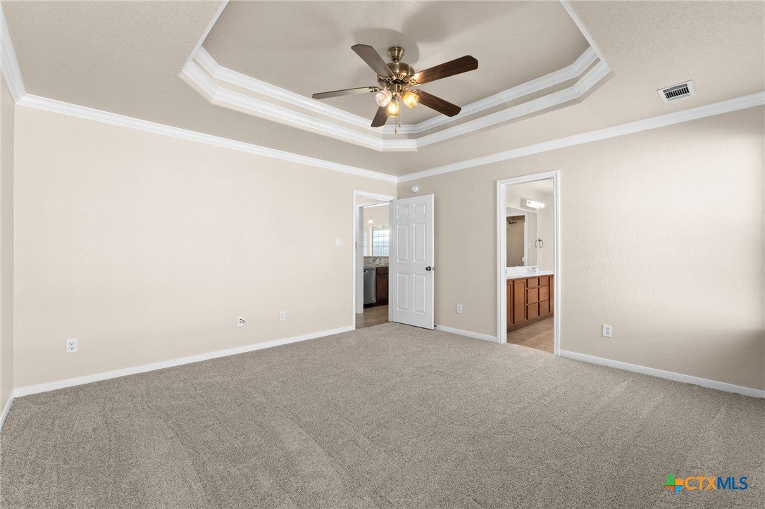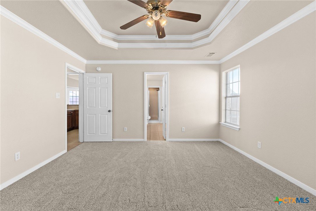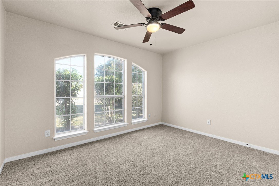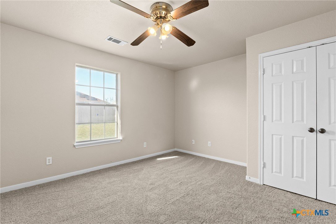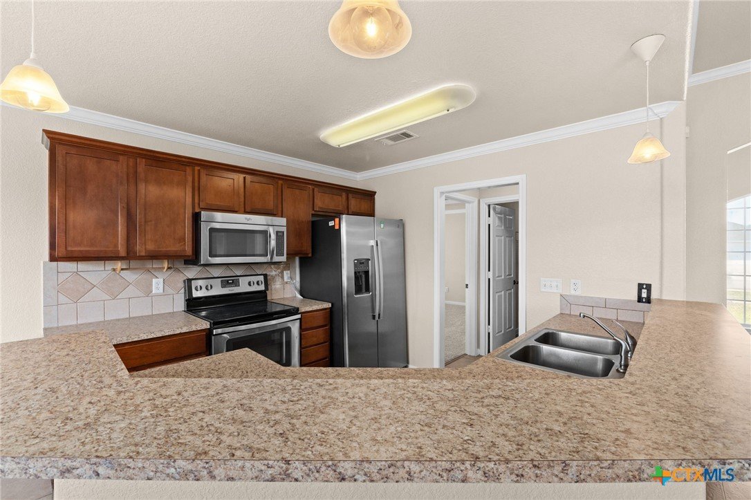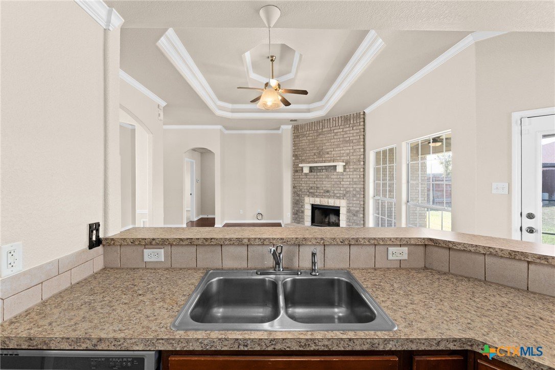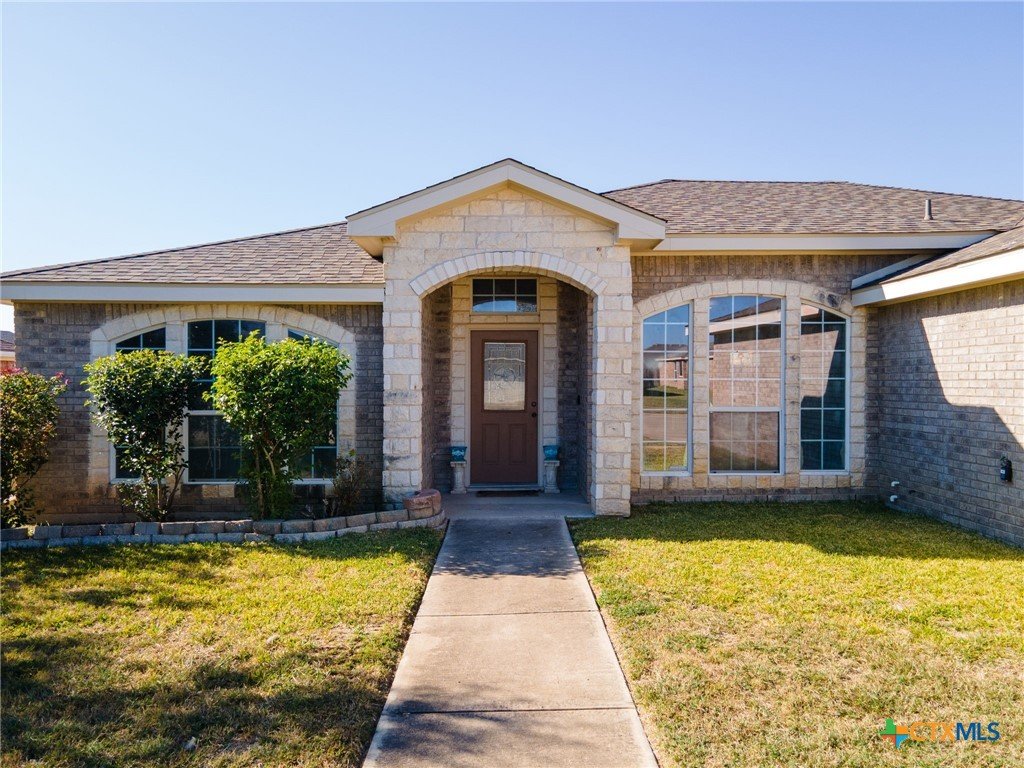 Beautiful brick home with stone accents tucked inside the House Creek North subdivision. Freshly painted with brand-new carpet and several windows being replaced, this home feels bright, clean, and move-in ready. The open floor plan is perfect for hosting, with a spacious living room featuring 10-foot ceilings, a double pop-up with crown molding, and a stunning brick-and-rock fireplace that reaches all the way to the ceiling. The open kitchen provides a welcoming breakfast bar and abundant cabinet space for all your cooking needs. The primary suite is thoughtfully separated from the secondary bedrooms, offering peaceful privacy from the rest of the home. Additional highlights include bull-nosed corners, a large soaking tub with separate in the primary bath, a laundry room sink, a privacy-fenced backyard, and more. Conveniently located just north of Copperas Cove within walking distance to House Creek North Elementary and easy access to the west side gate of Fort Hood.